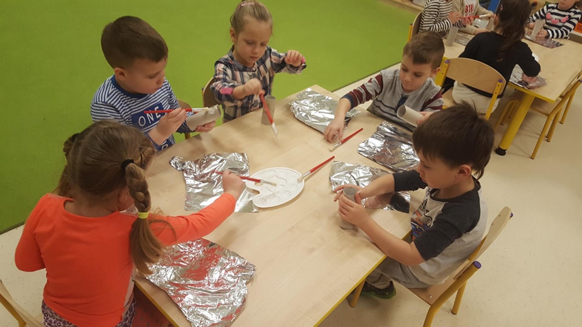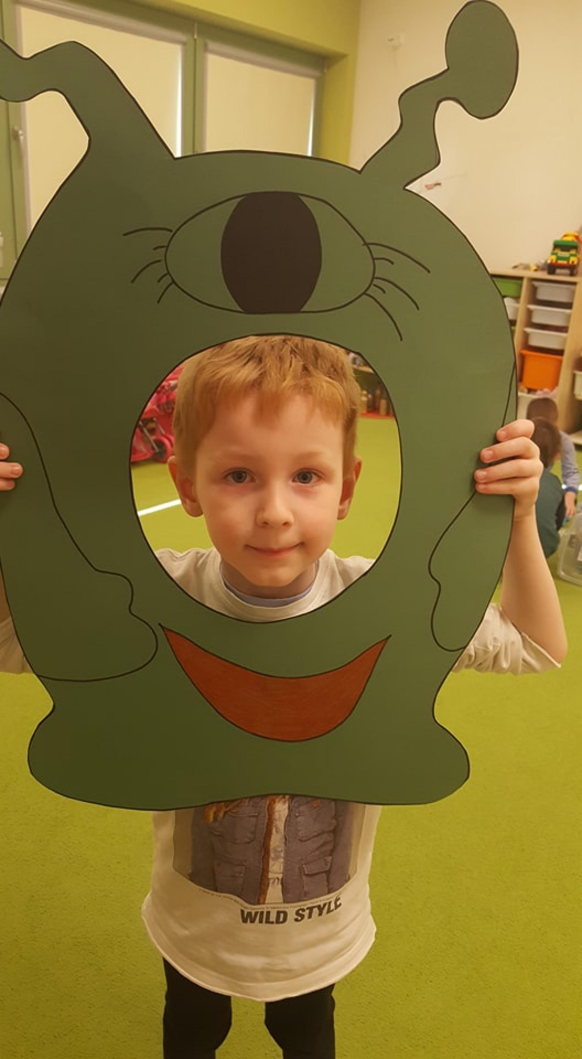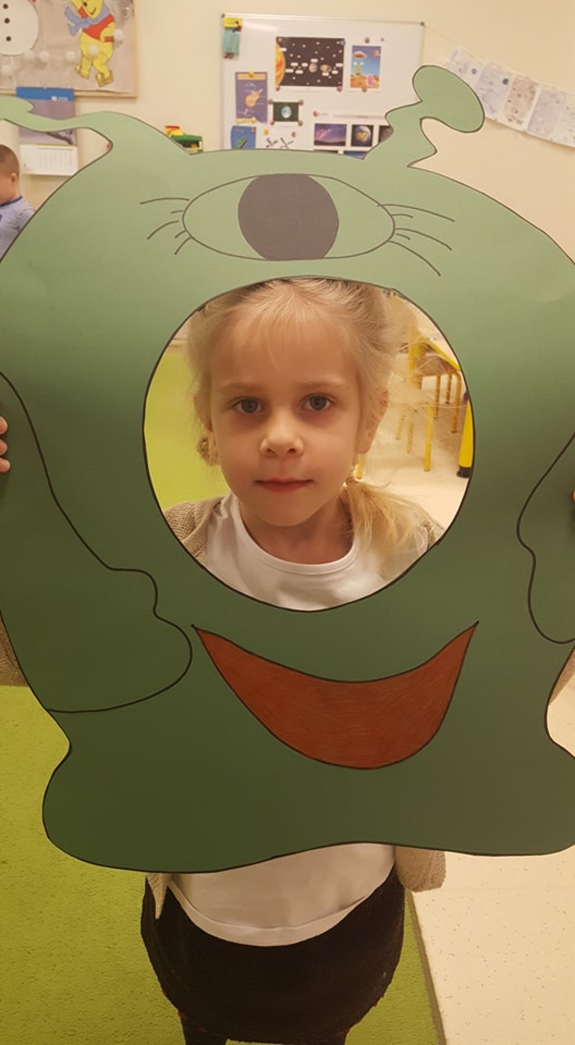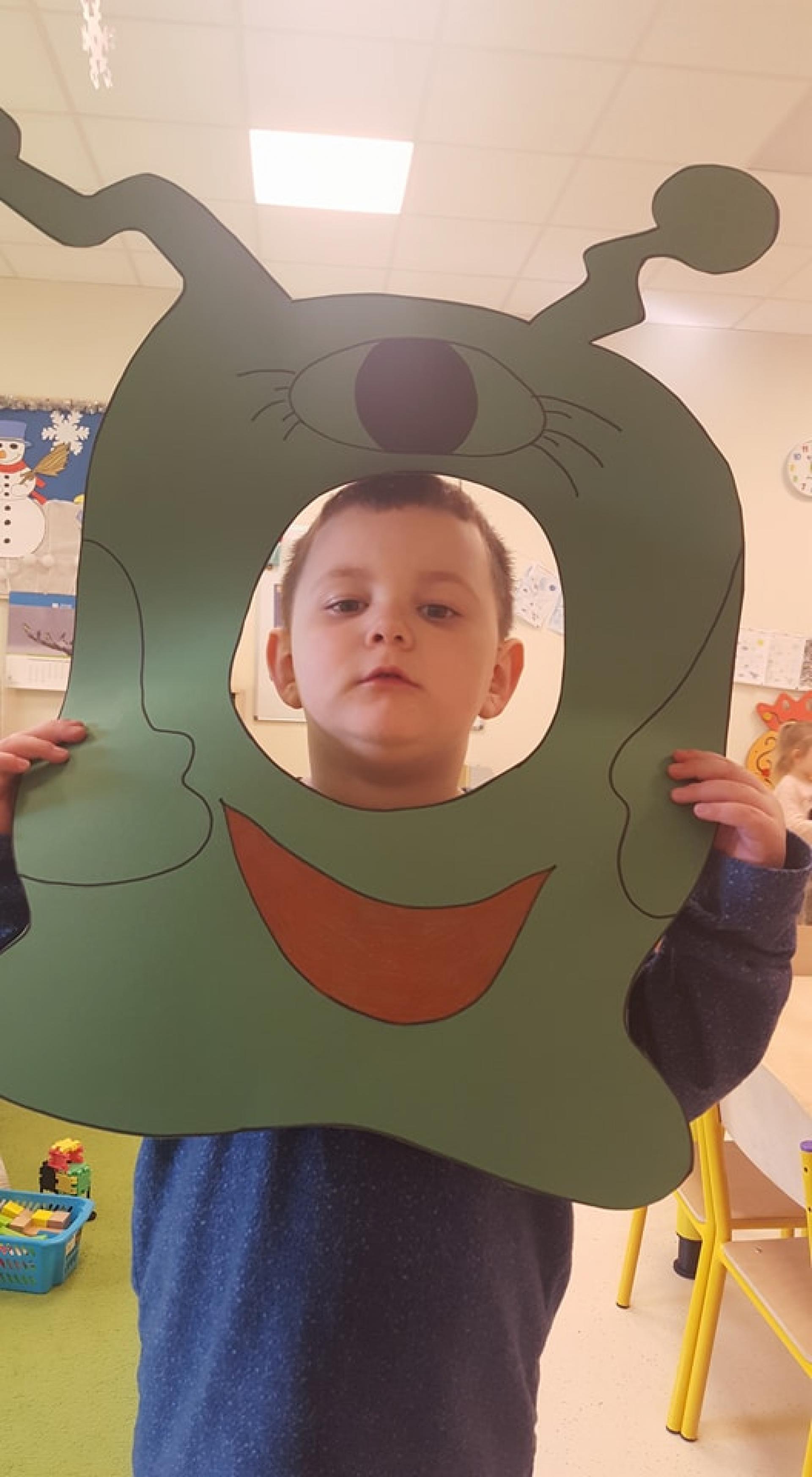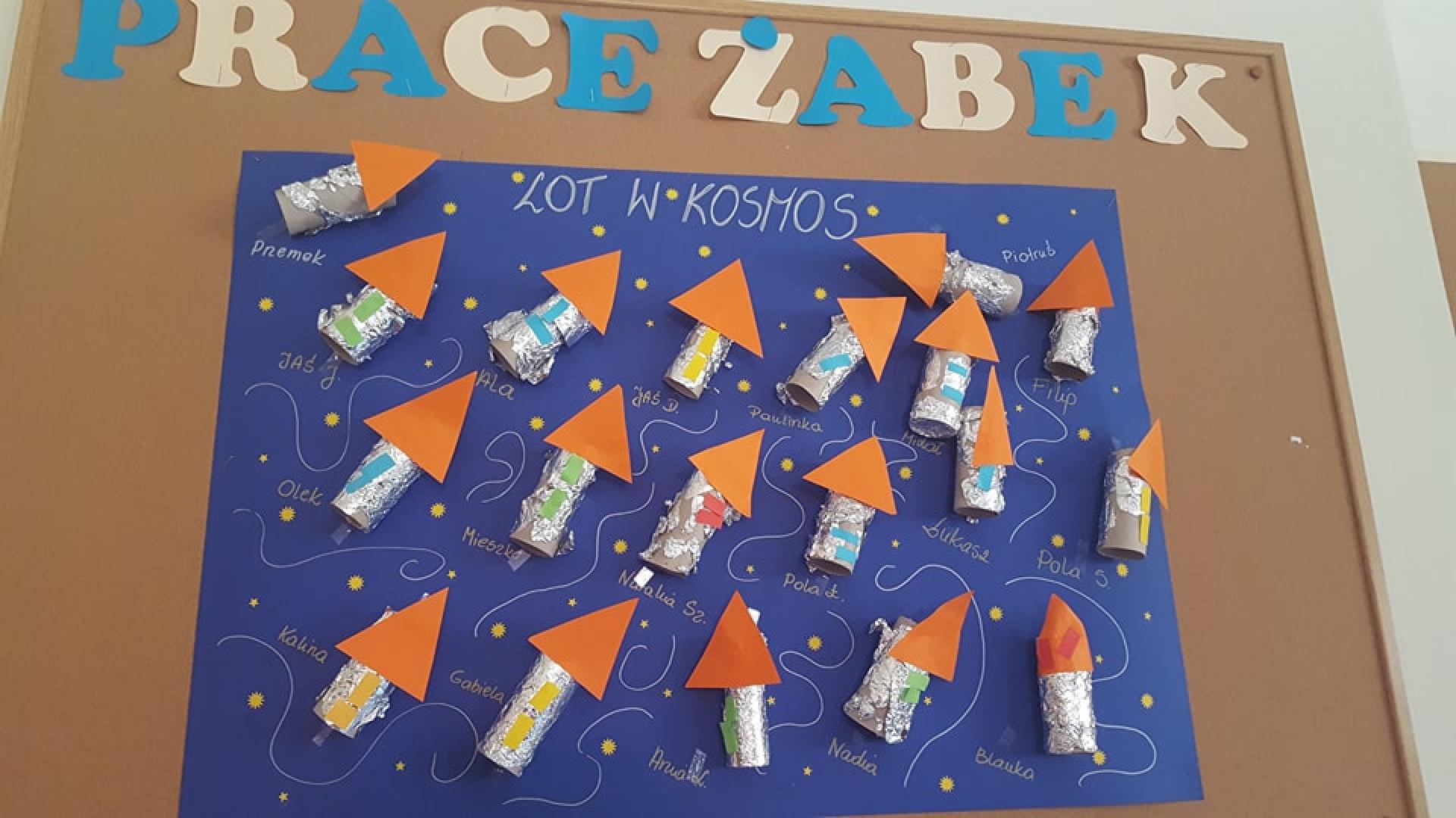 Dzisiejszy dzień upłynął Żabkom pod hasłem „Poznajemy kosmos”. Zajęcia miały na celu rozbudzenie zainteresowań dzieci otaczającym nas wszechświatem. Dzieci oglądały filmy, zdjęcia i prezentacje multimedialne o podróżach kosmicznych, lądowaniu człowieka na Księżycu, a także o planecie Mars, zastanawiając się, czy życie na innych planetach jest możliwe i czy UFO istnieje. W trakcie różnego rodzaju zabaw i zajęć poznały planety układu słonecznego, dowiedziały się, że Ziemia cały czas krąży nie tylko wokół Słońca, ale także wokół własnej osi. Każdy miał okazję zbudować swój własny pojazd kosmiczny, także obejrzeć niezwykły teatr cienia. To był dzień wspaniałych wrażeń i mnóstwa nowych doświadczeń…