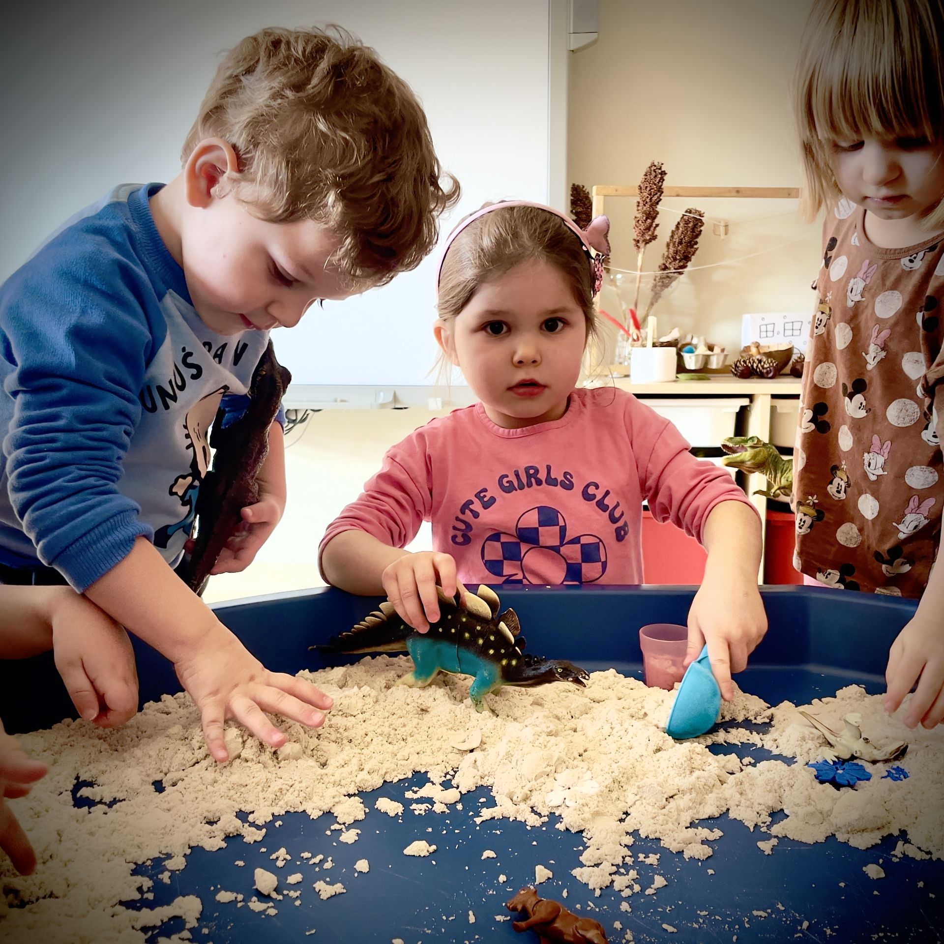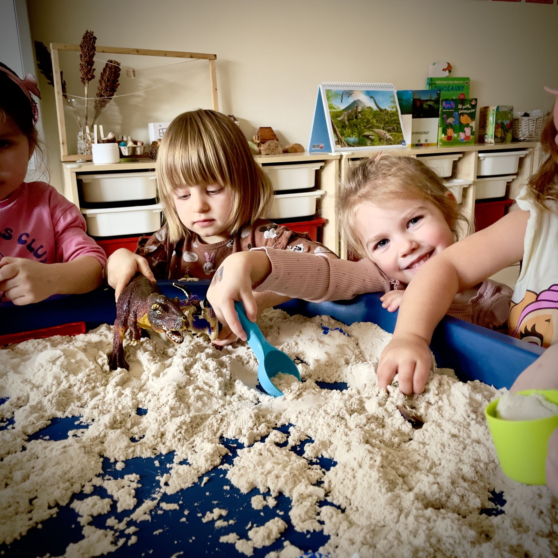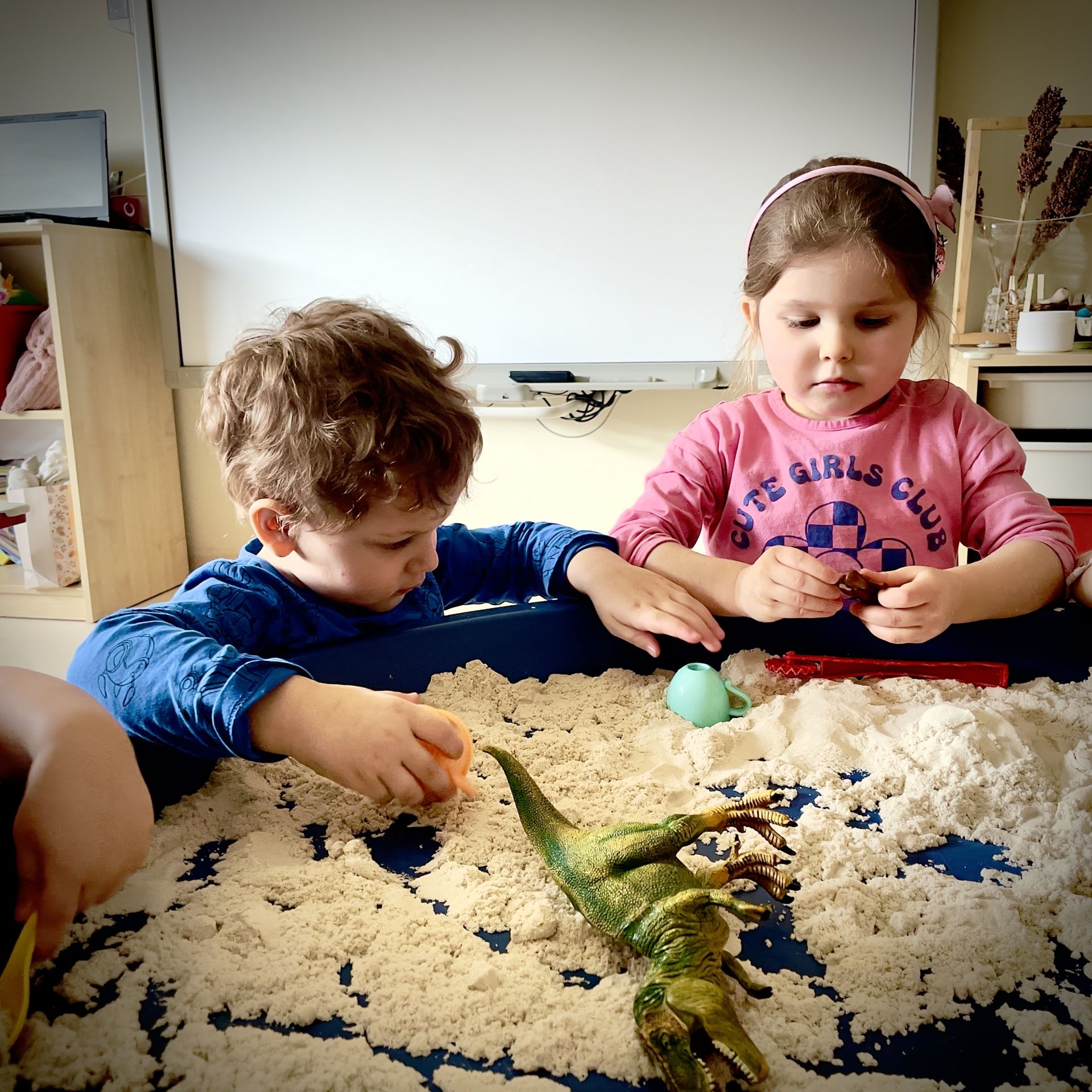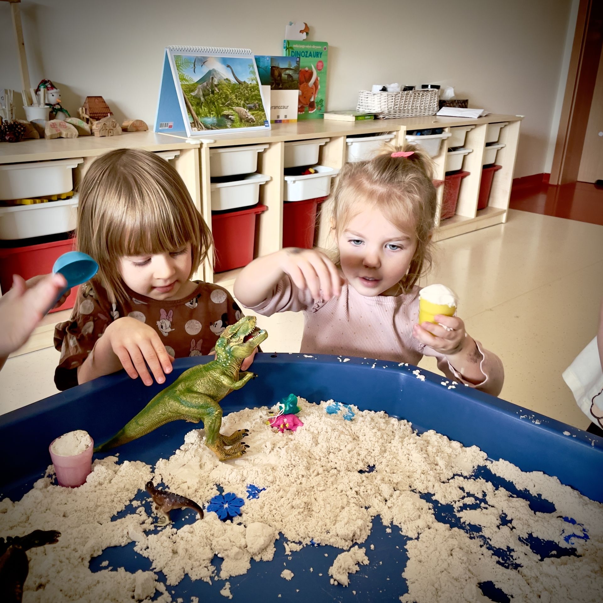 Dnia 25 lutego 2026 r. z wielką radością przystąpiliśmy do mini wykopalisk w naszym przedszkolu. Naszym zadaniem było odszukanie ukrytych w piasku kinetycznym dinozaurów oraz tropienie ich śladów na piasku.