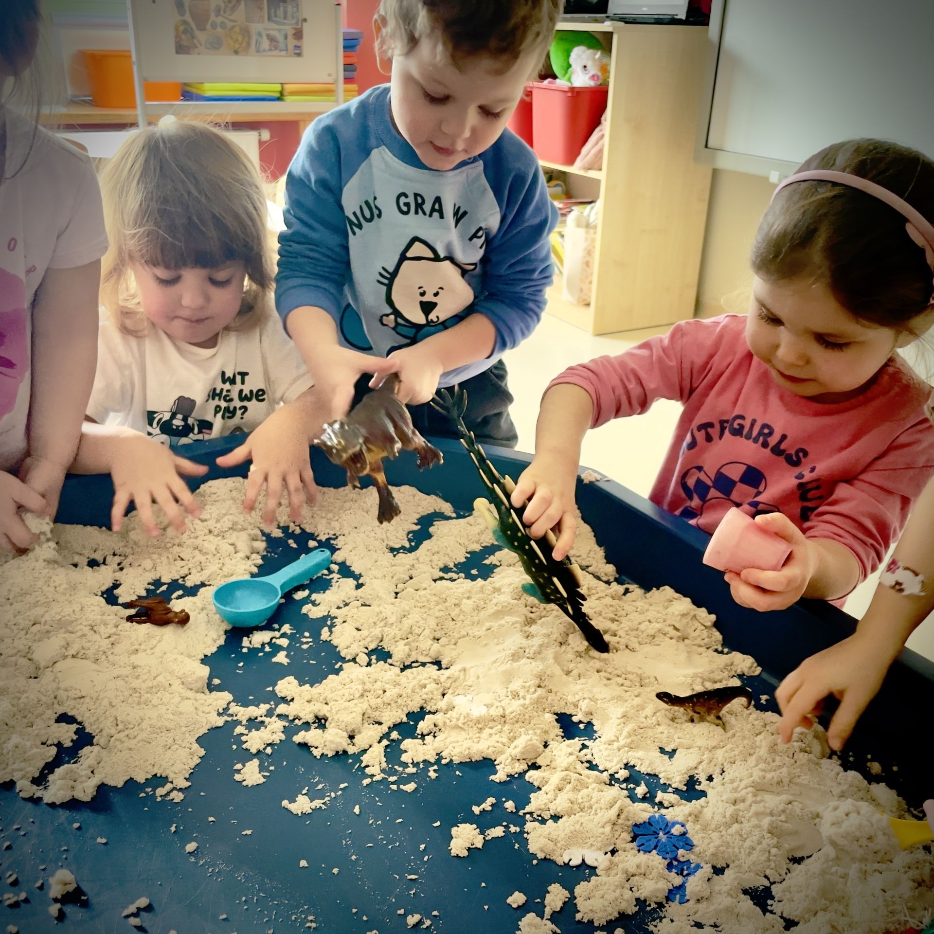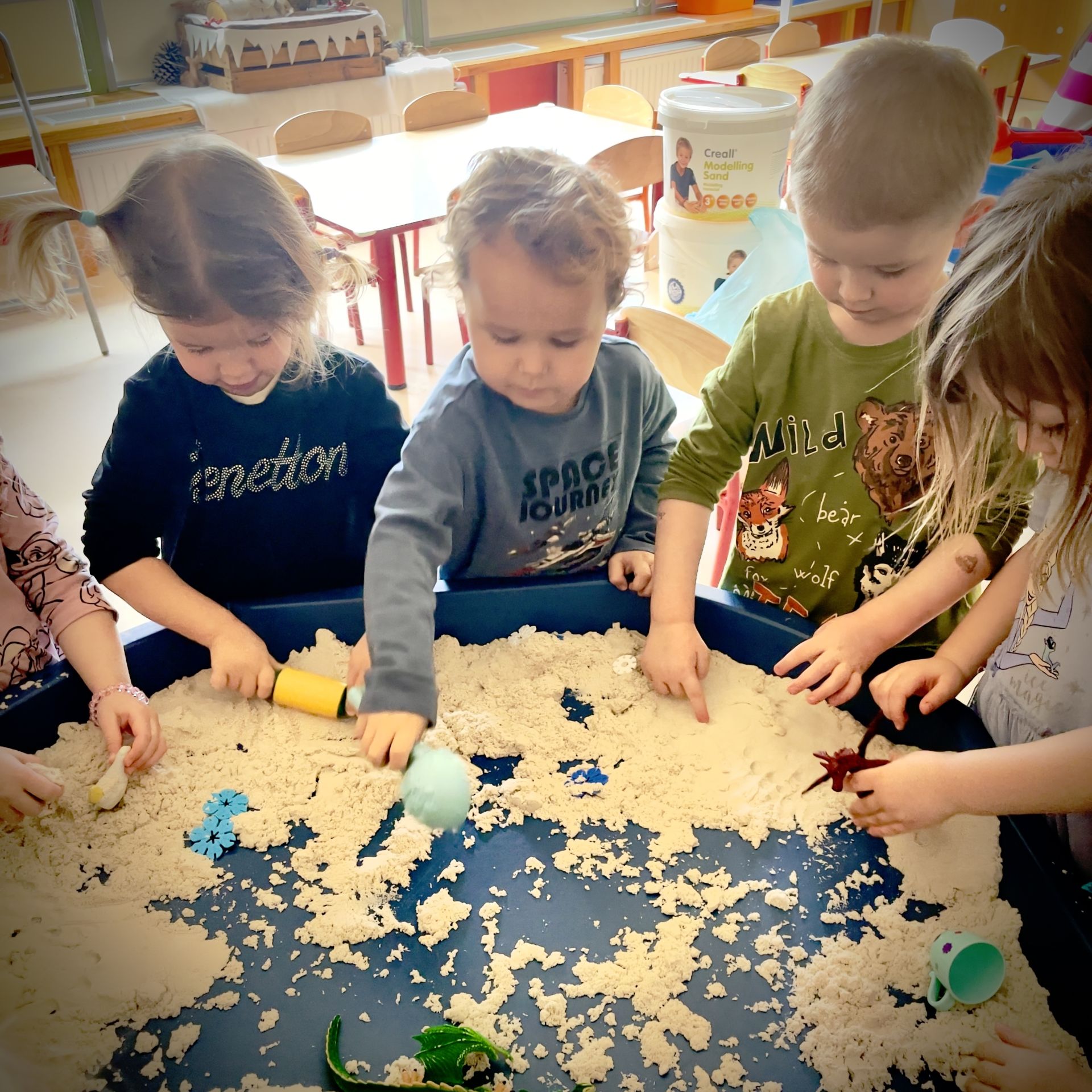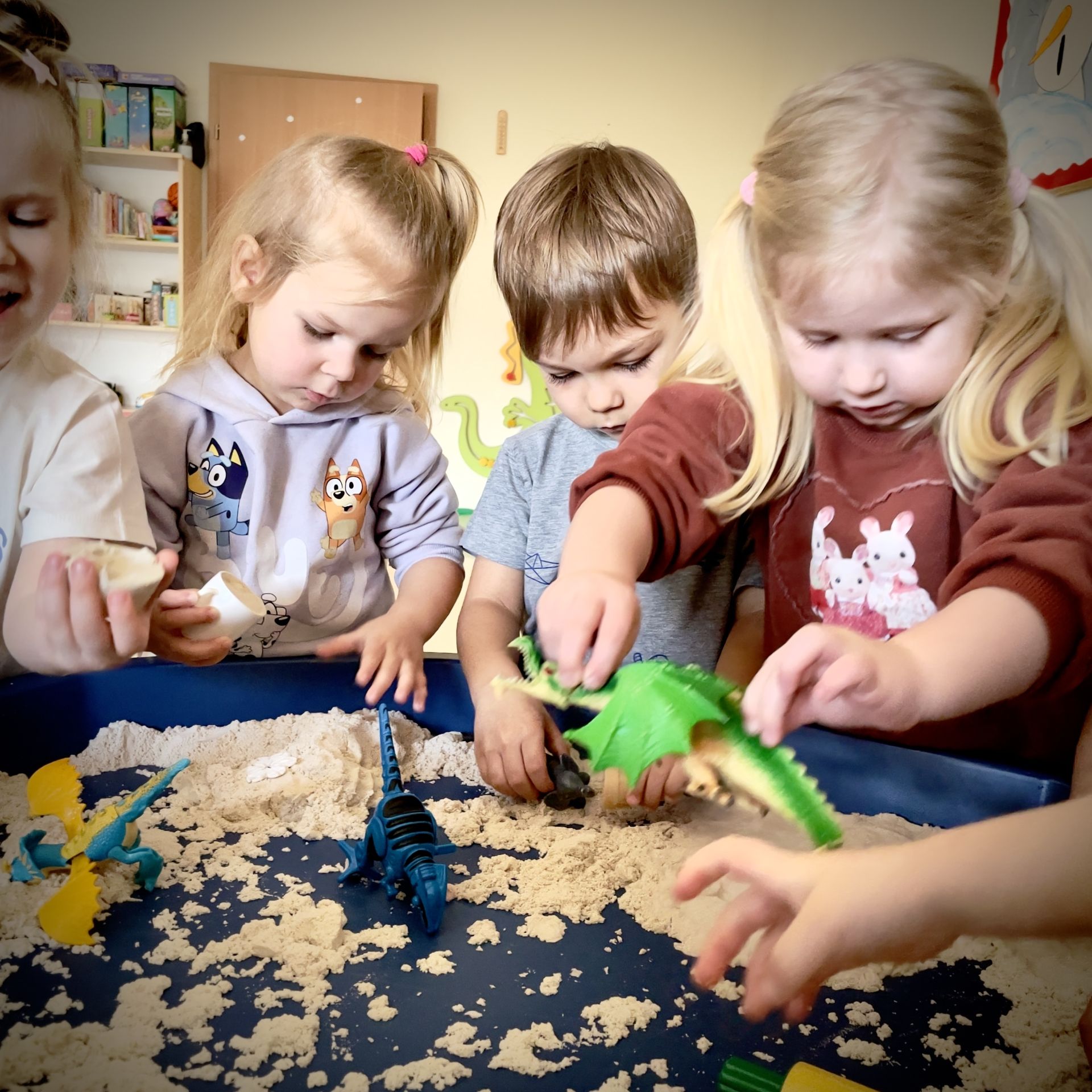 Dnia 25 lutego 2026 r. z wielką radością przystąpiliśmy do mini wykopalisk w naszym przedszkolu. Naszym zadaniem było odszukanie ukrytych w piasku kinetycznym dinozaurów oraz tropienie ich śladów na piasku.