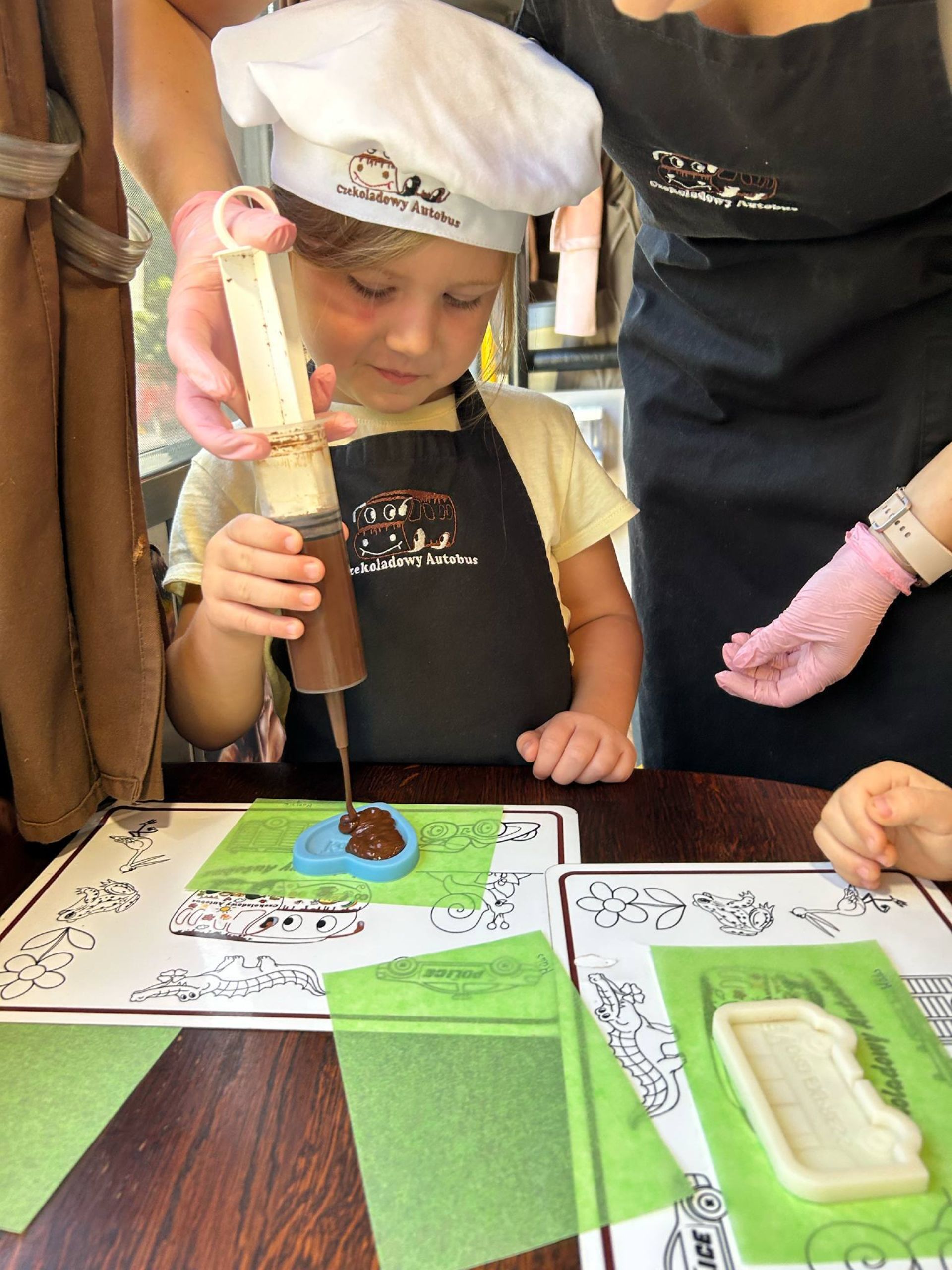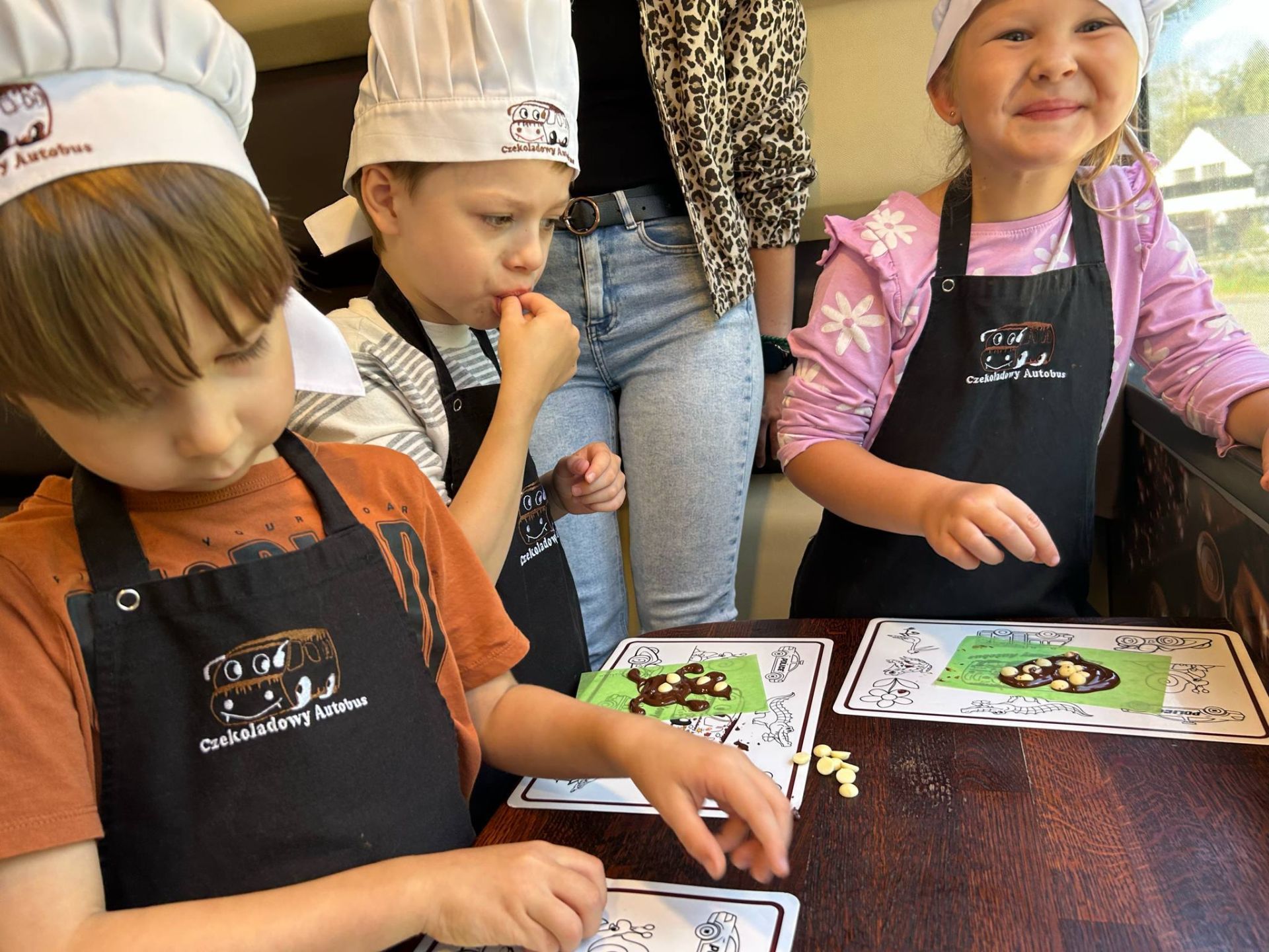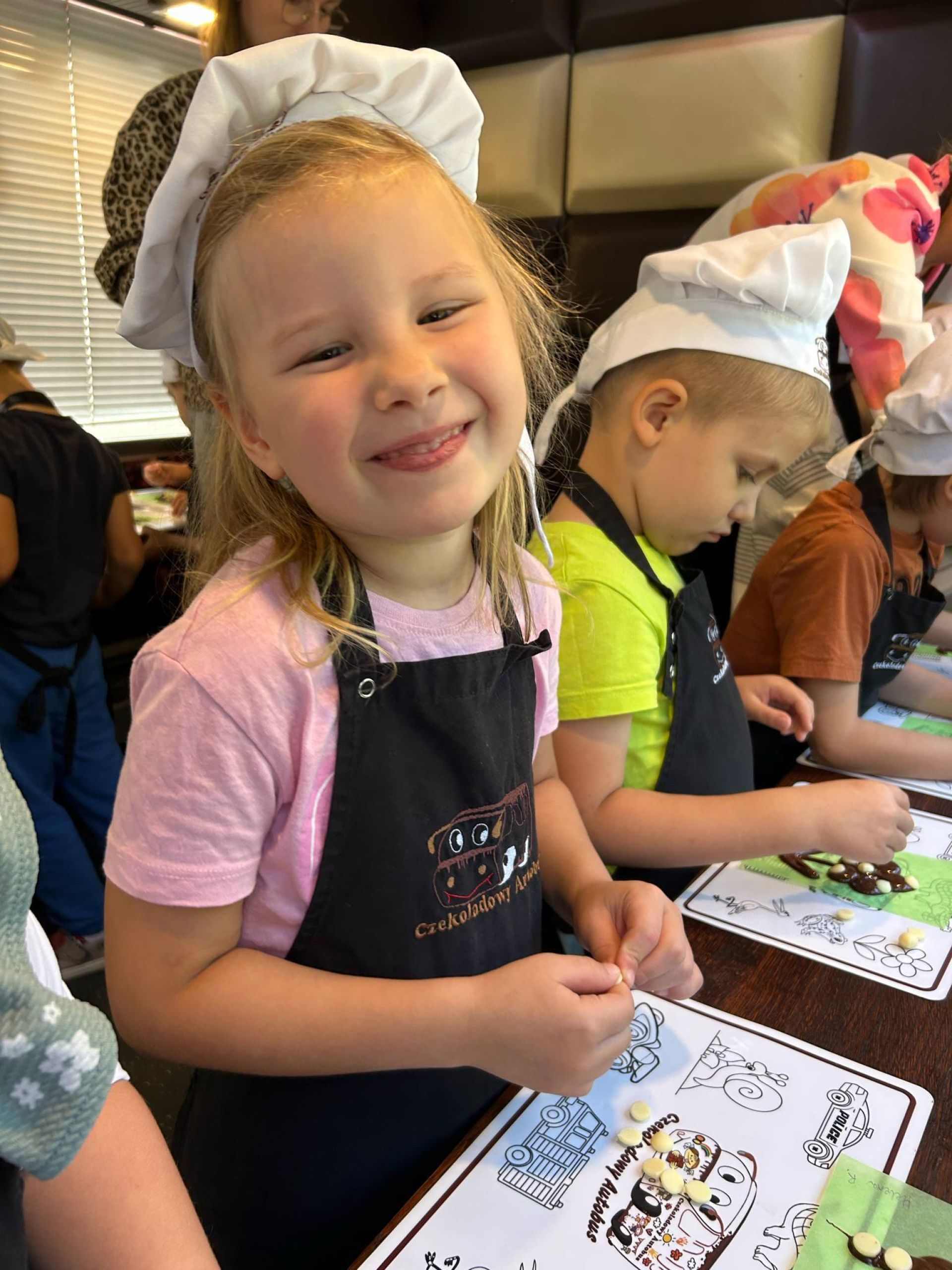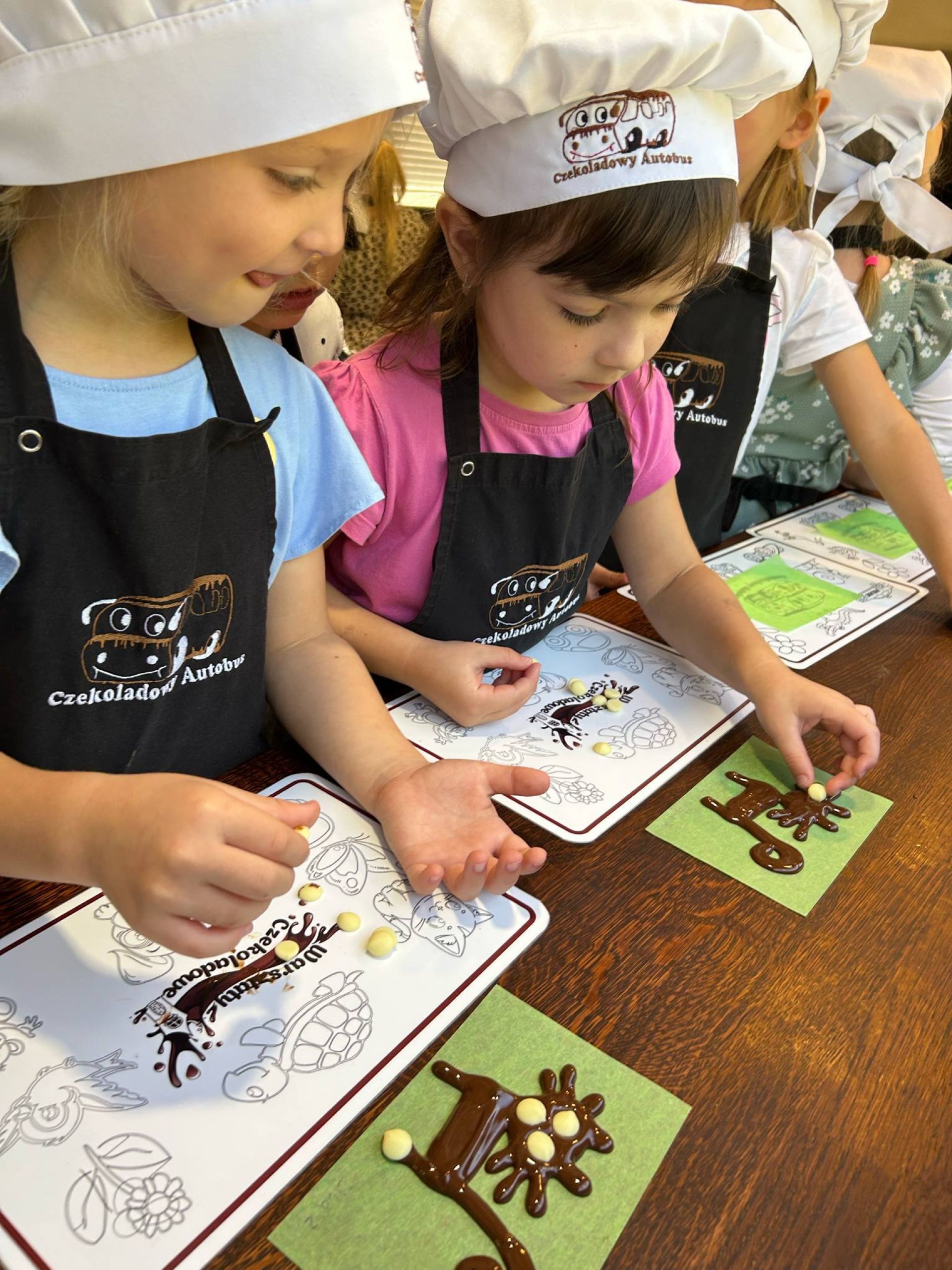 Dzieci miały dziś okazję wziąć udział w wyjątkowej podróży po czekoladowym świecie. Zapoznały się z historią czekolady, dowiedziały się skąd się wzięła, miały okazję spróbować pachnącej czekolady oraz wykonać swoją własną czekoladkę. Wszystkie były ubrane w specjalne czapki i fartuszki. To była wyjątkowo smakowita zabawa.