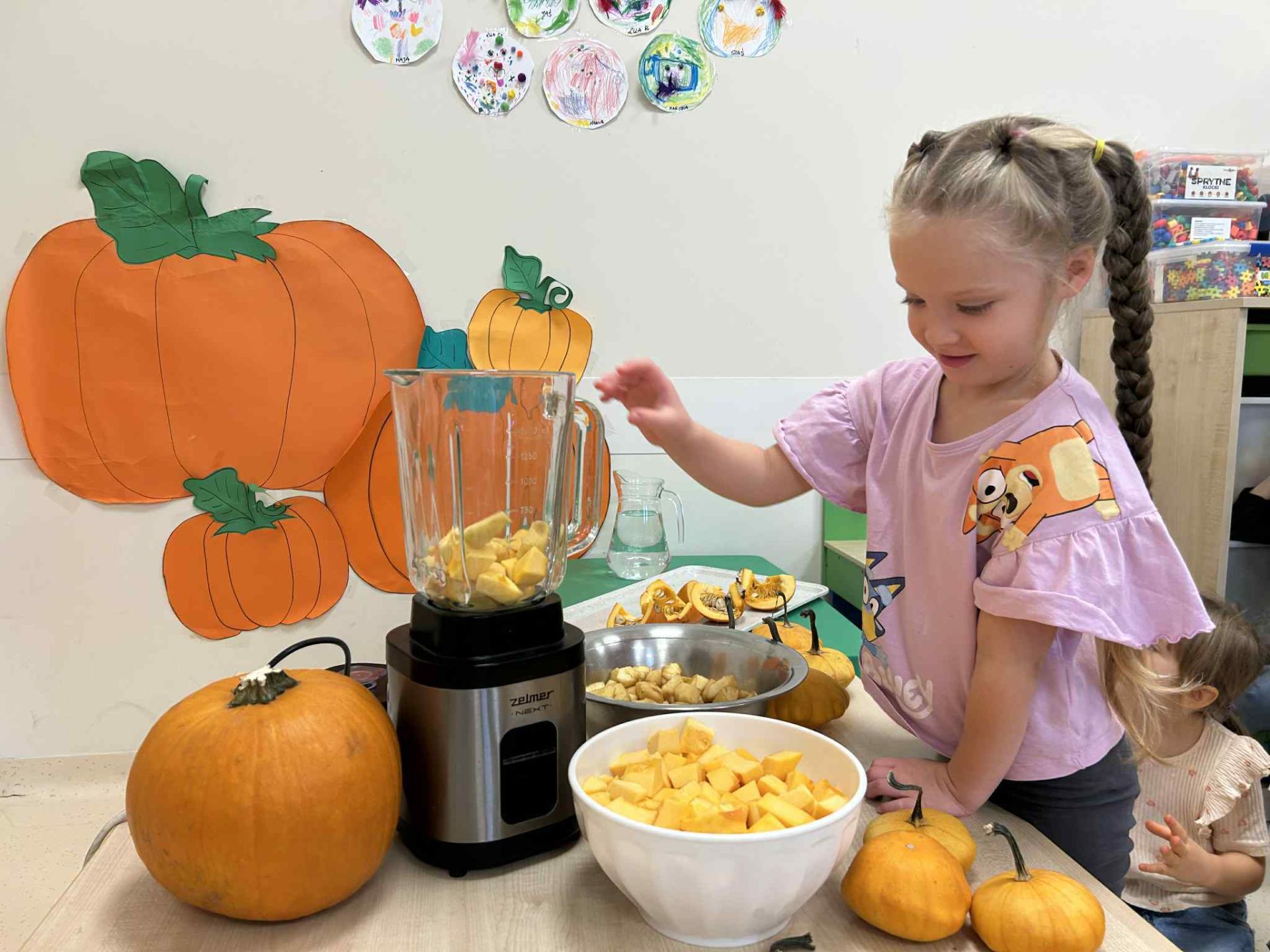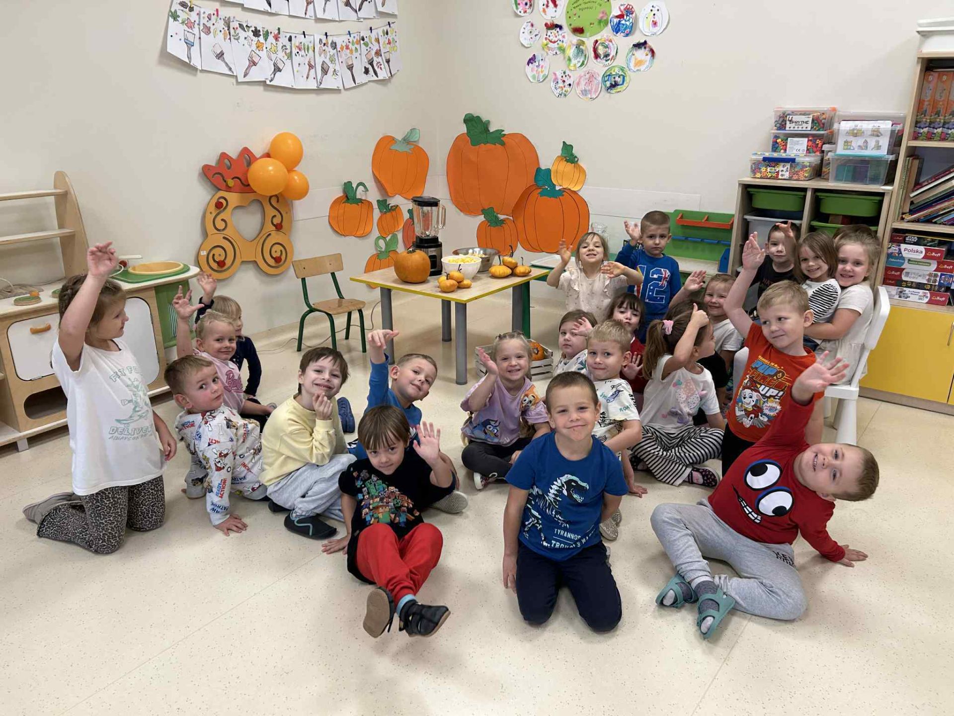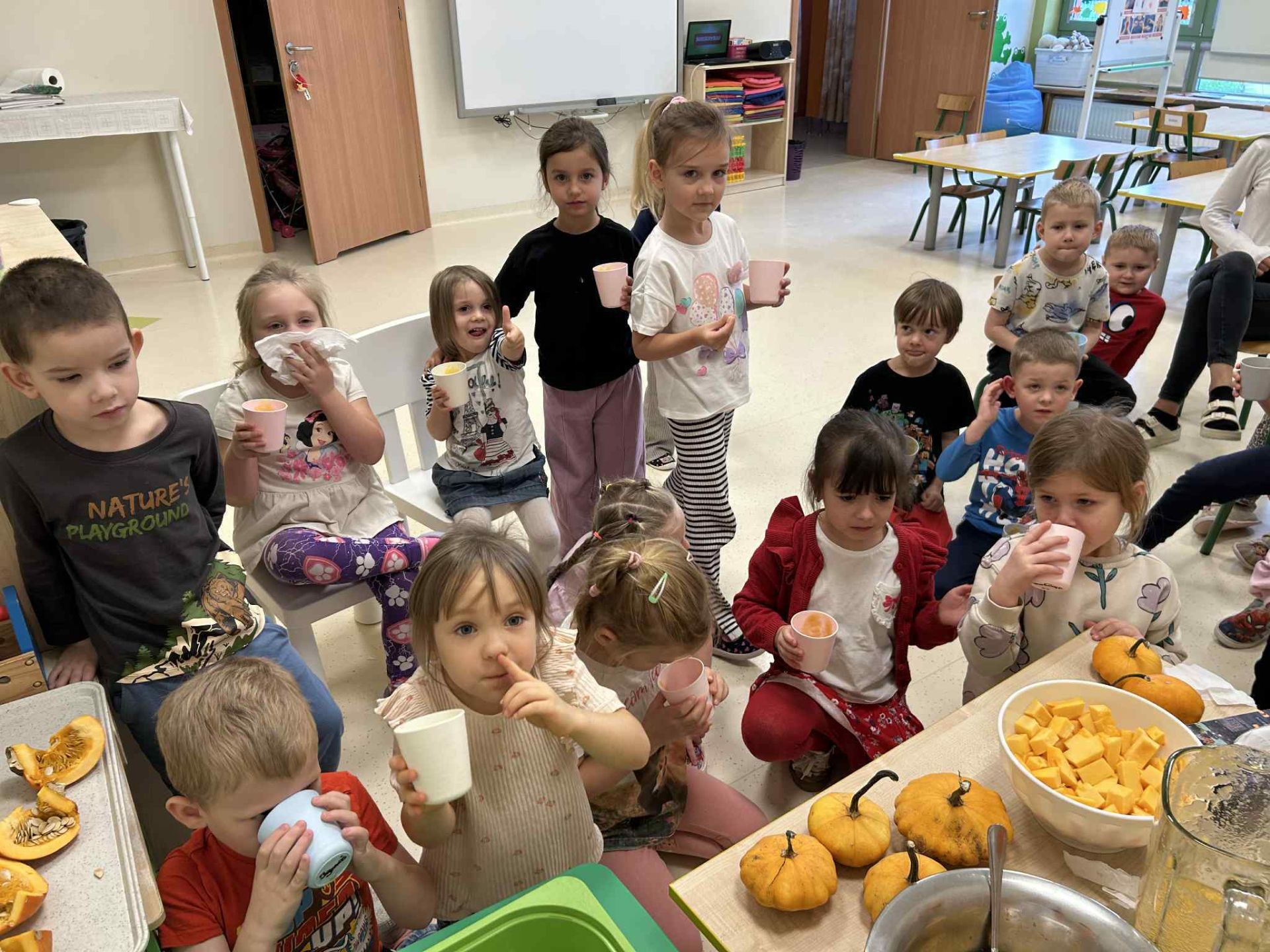 W tym dniu dzieciaczki wzięły udział w kolejnych warsztatach kulinarnych z dynią w roli głównej! Przedszkolaki poznały również różnorodność dyń i wzbogaciły wiedzę na ich temat. Zobaczyły co kryje w środku i pod jaką postacią można ja spożywać. Na koniec wspólnie przygotowaliśmy witaminowy sok.