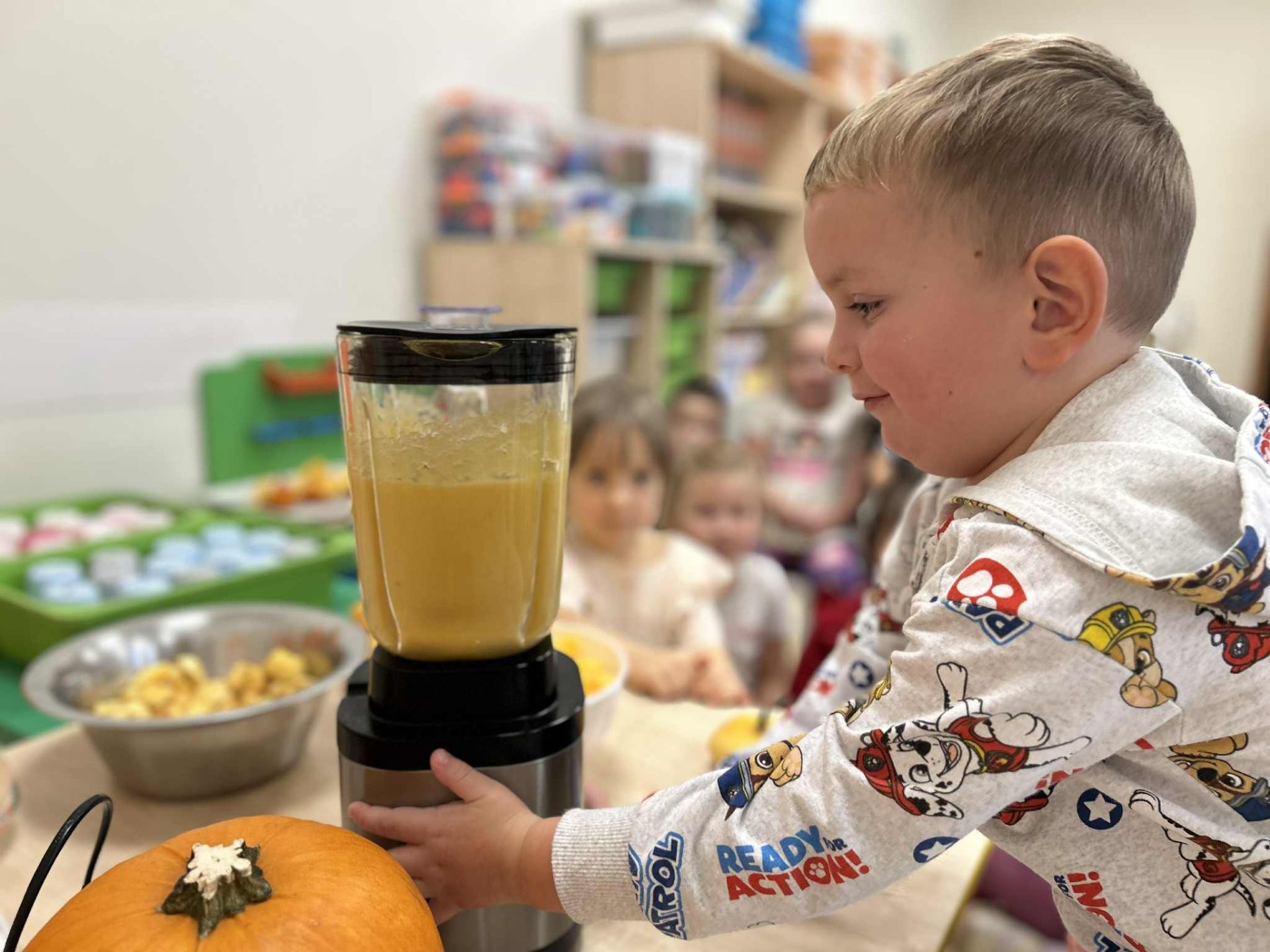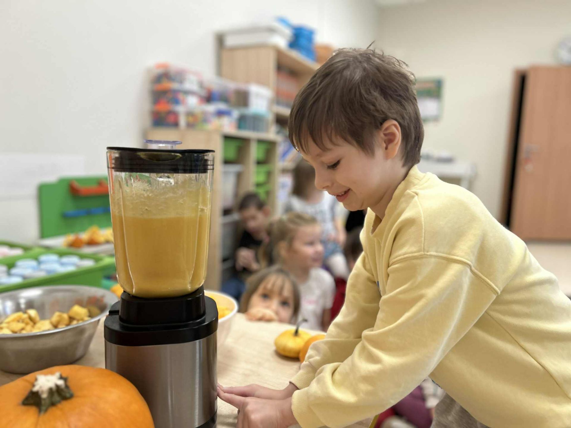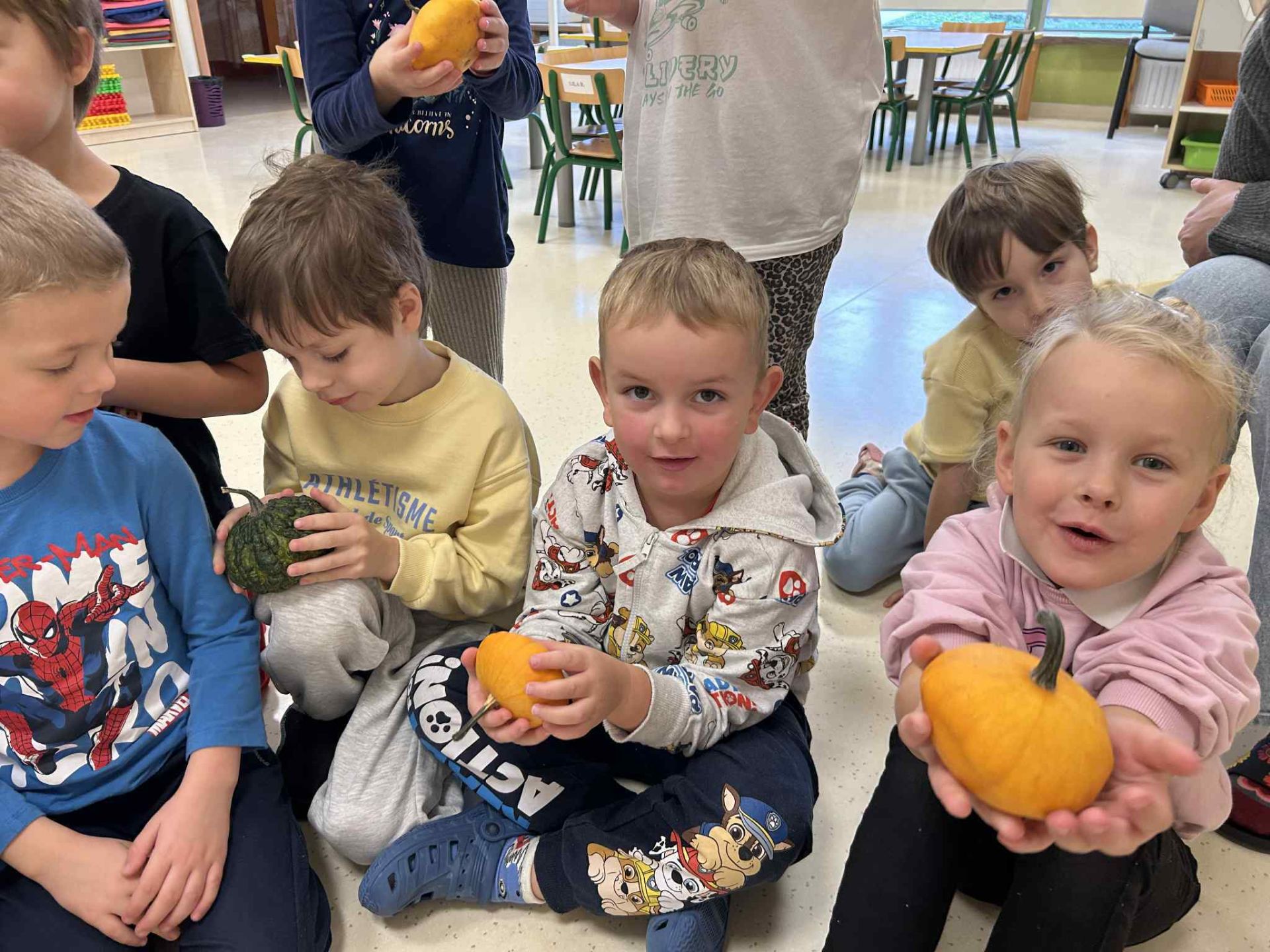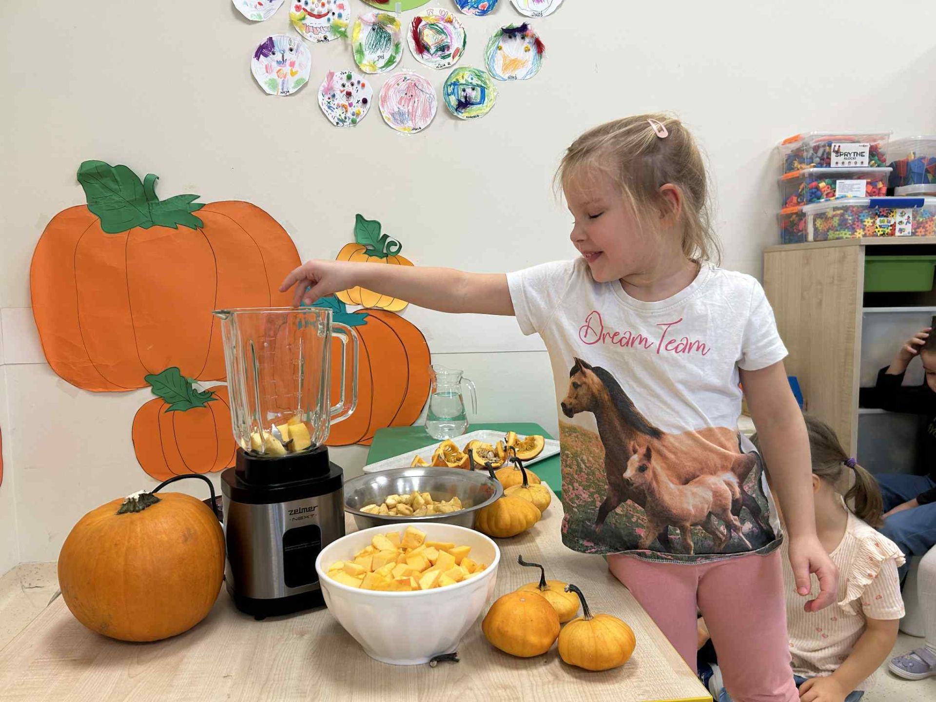 W tym dniu dzieciaczki wzięły udział w kolejnych warsztatach kulinarnych z dynią w roli głównej! Przedszkolaki poznały również różnorodność dyń i wzbogaciły wiedzę na ich temat. Zobaczyły co kryje w środku i pod jaką postacią można ja spożywać. Na koniec wspólnie przygotowaliśmy witaminowy sok.