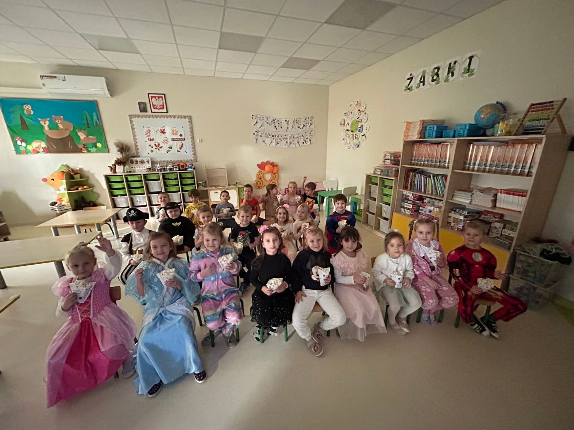Dziś nasze przedszkolaki były przebrane za rozmaitych bohaterów bajek, a to za sprawą Dnia Postaci z Bajek, które obchodziliśmy w naszym przedszkolu. Po śniadaniu odbyła się dyskoteka. Były ciekawe zagadki i ogrom zabawy przy muzyce. Na koniec w salach odbyło się wspólne oglądanie bajki - oczywiście z popcornem.
