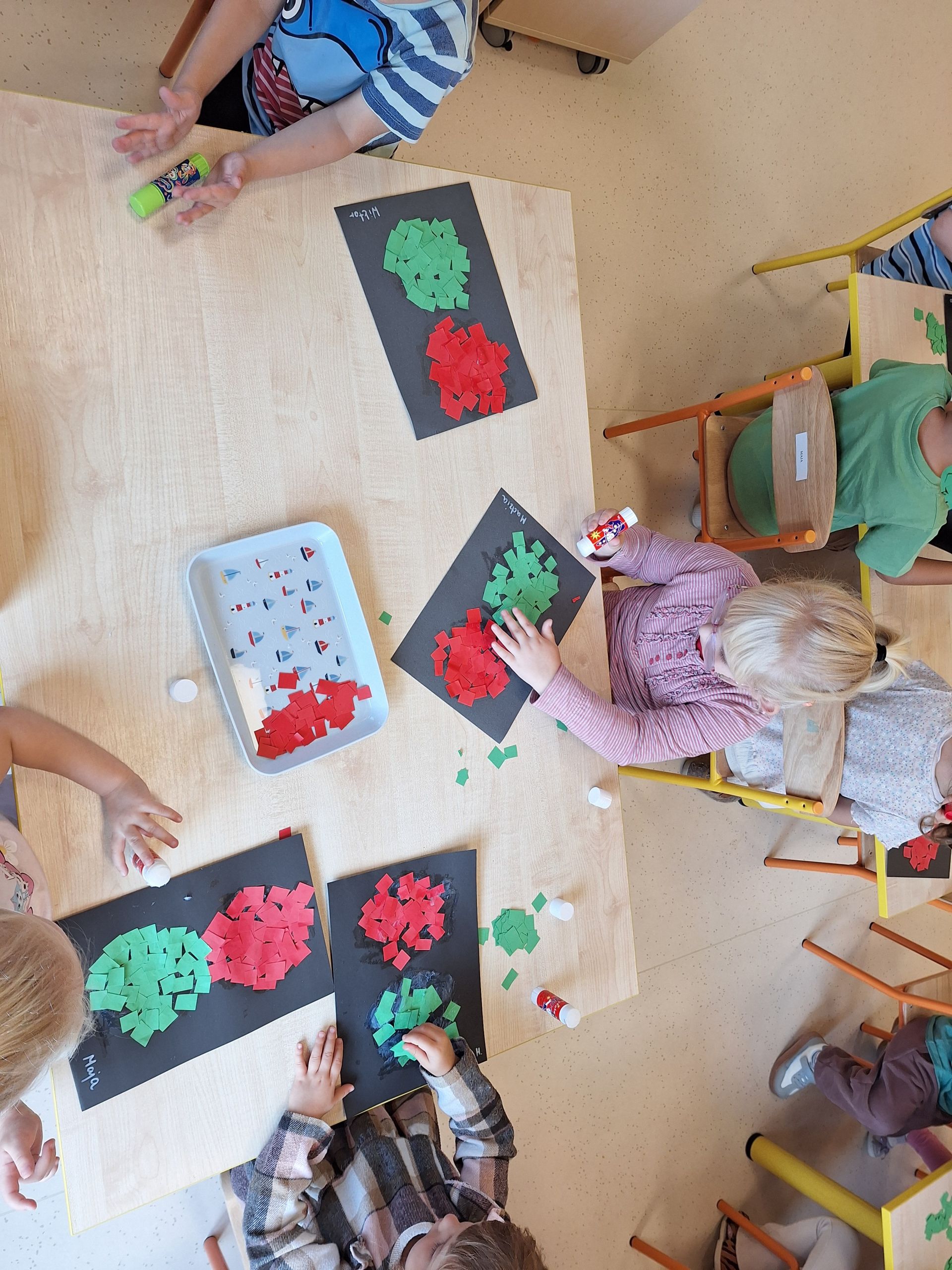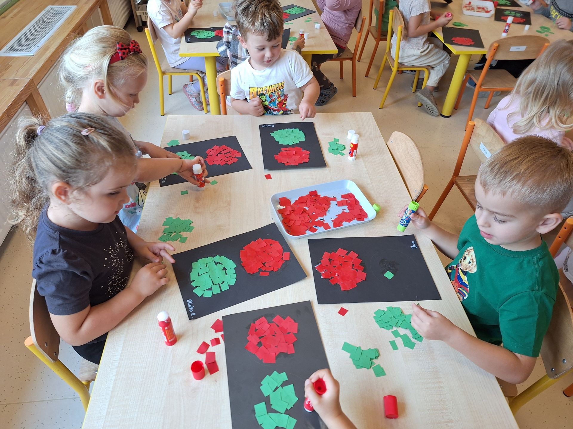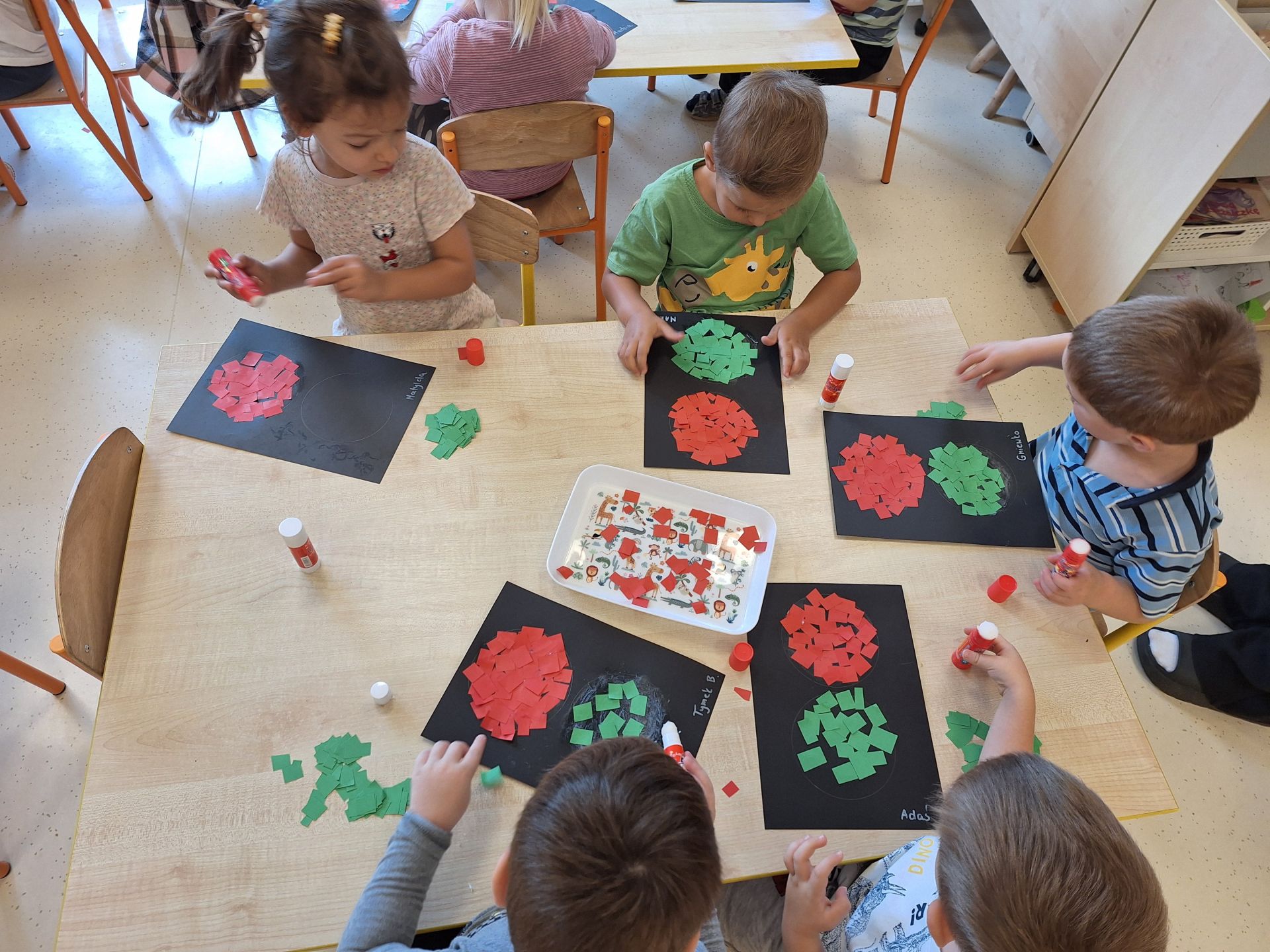 Dziś poznaliśmy zasady bezpiecznego przejścia przez ulicę. Każdy przedszkolak wie, że bezpiecznie przechodzimy na świetle zielonym. Wykonaliśmy pracę plastyczną, wydzierankę "Sygnalizator"
