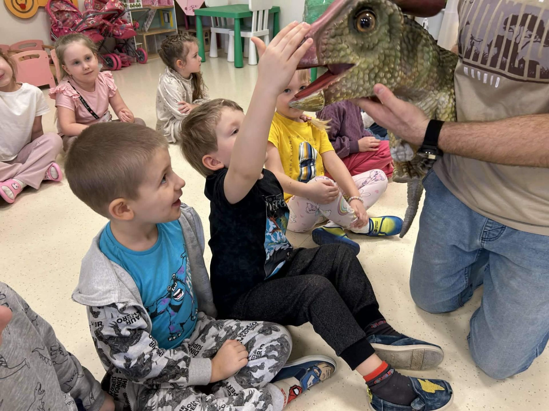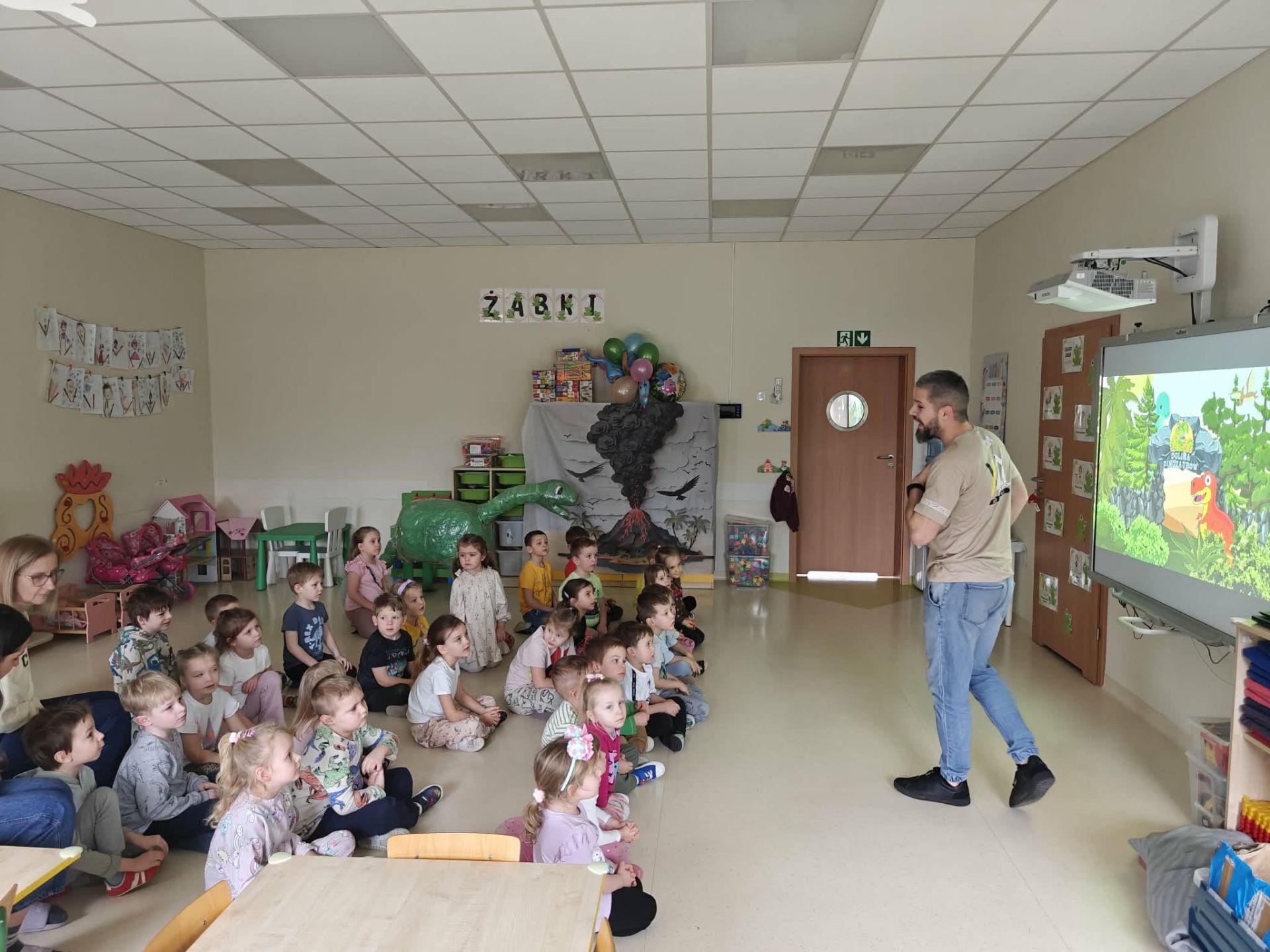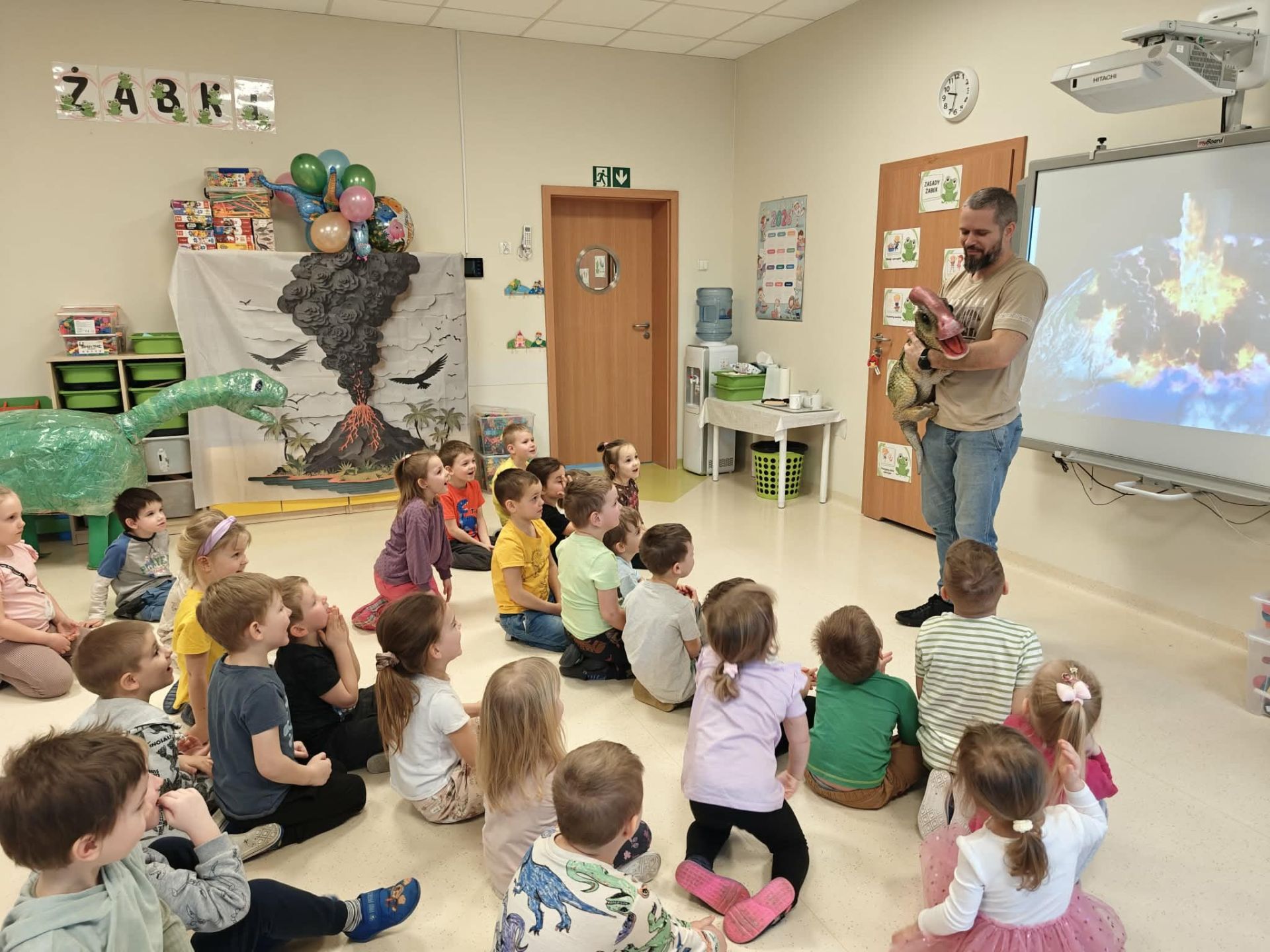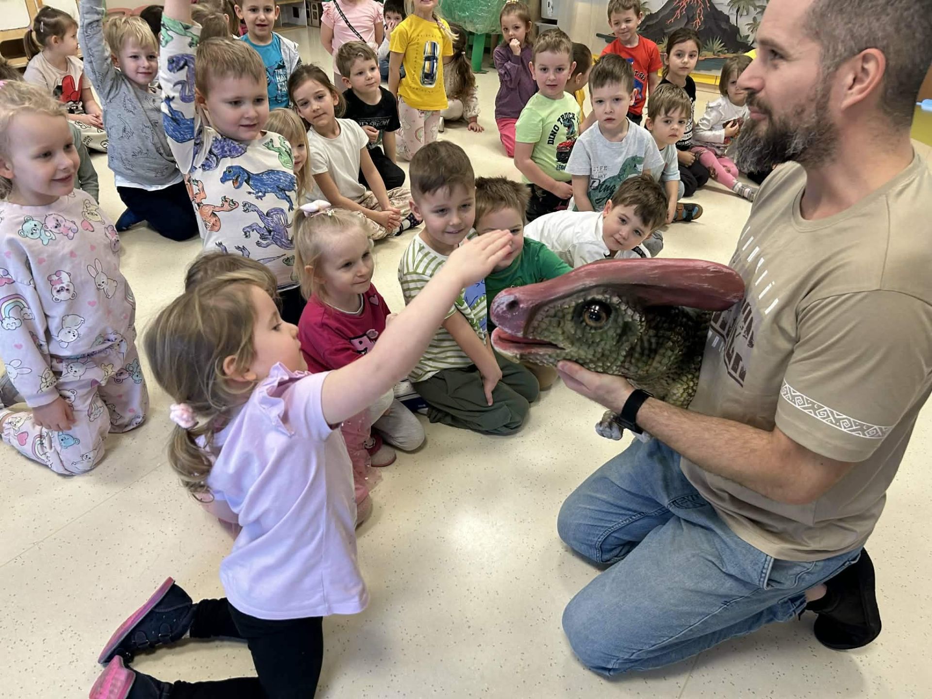 Dzieci podczas warsztatów poznały zagadnienia paleontologii i dowiedziały się jak nazywały się zwierzęta z tamtego okresu ,jak wyglądały, co jadły, jak się poruszały. Warsztaty wsparte tablicą multimedialną, spotkaniem z dinozaurem, oglądaniem skamieniałości oraz wspólnym tworzeniem wybuchów- aktywnych wulkanów. Na koniec każde dziecko otrzymało breloczek z dinozaurem.