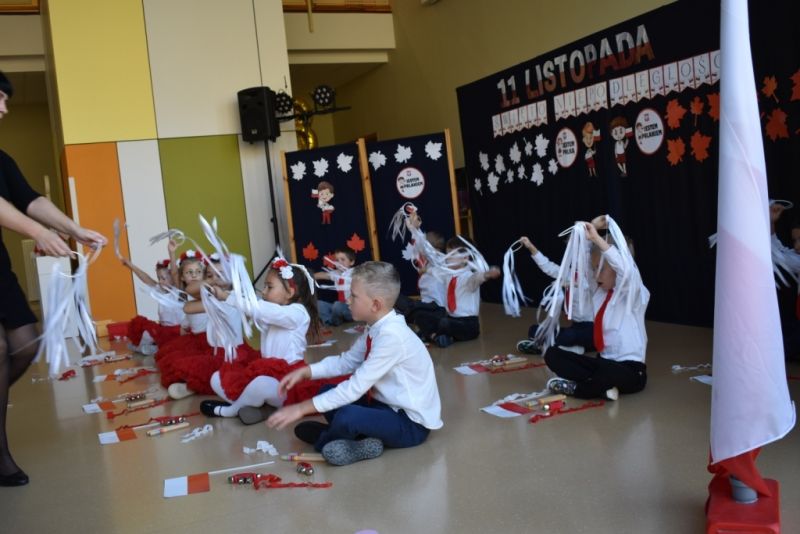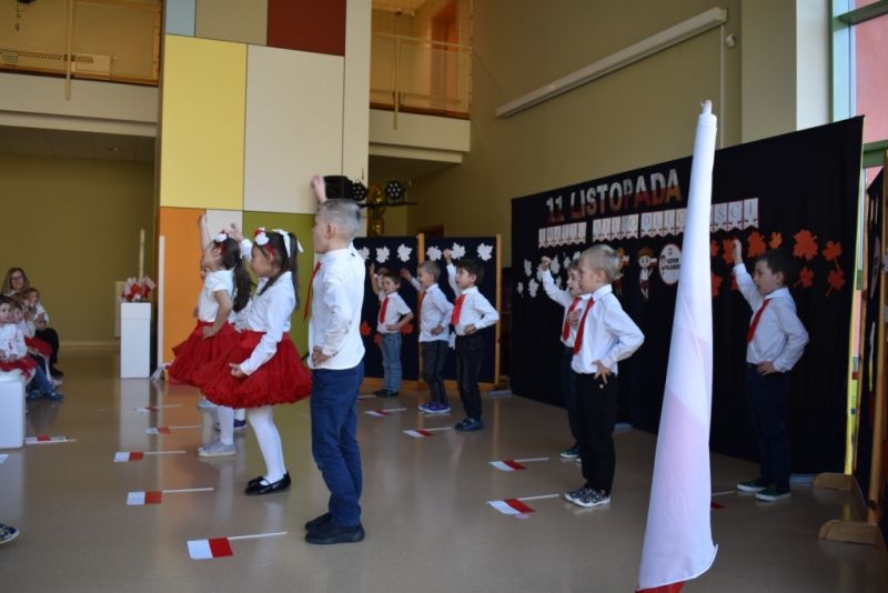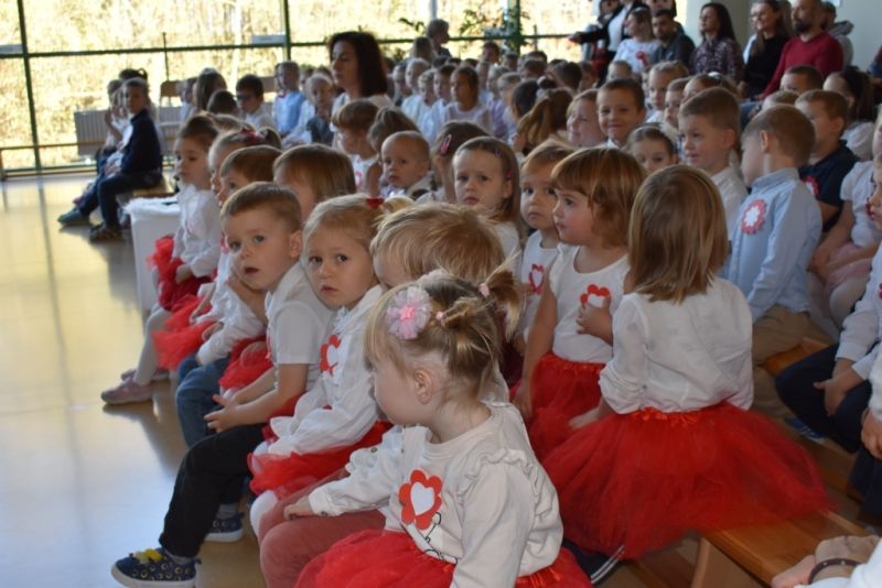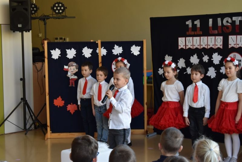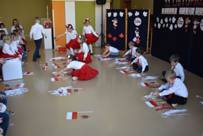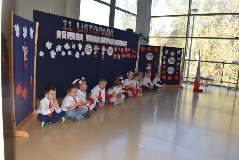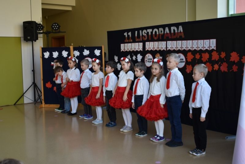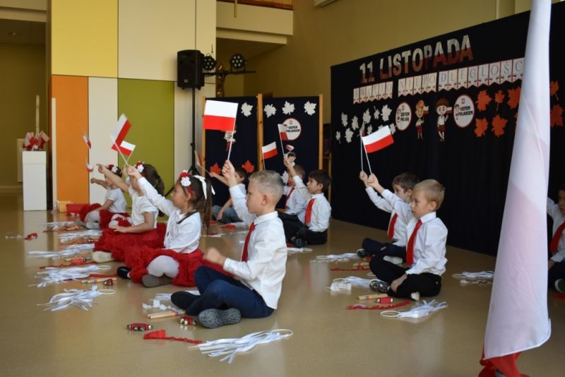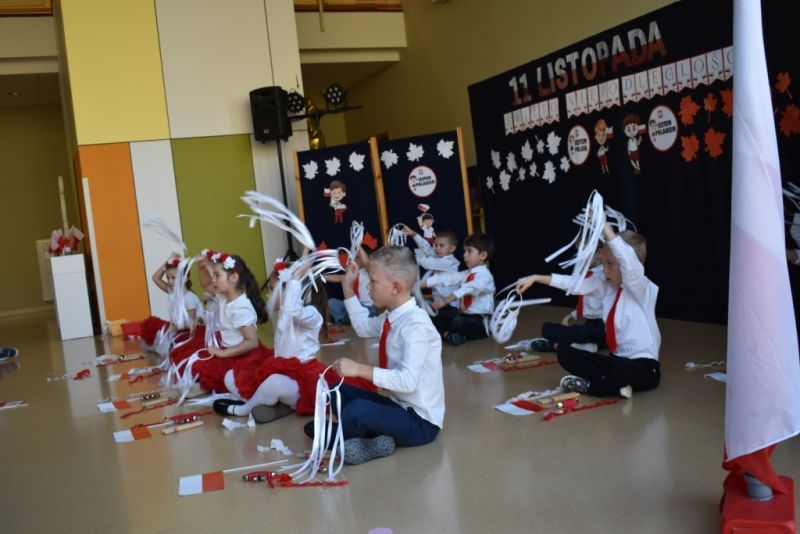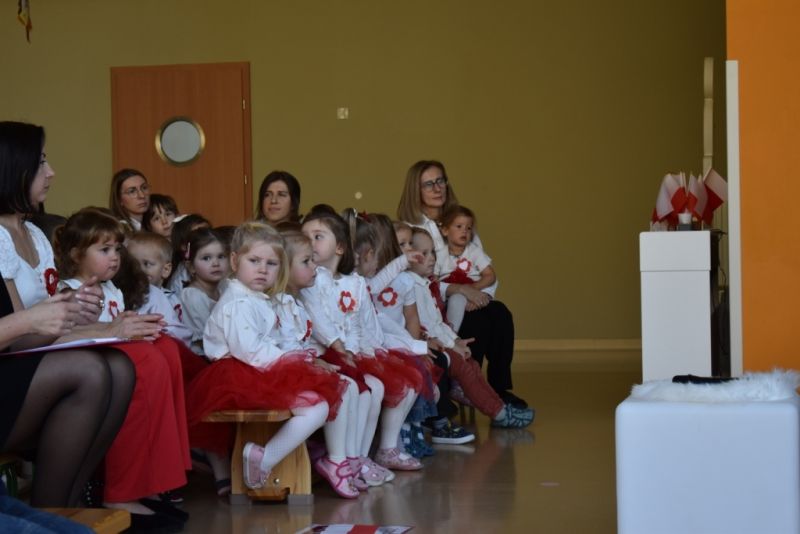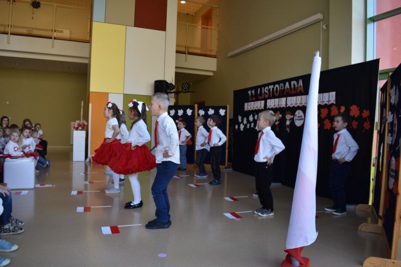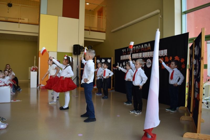 Dzisiaj w naszym przedszkolu odbyła się uroczystość z okazji Święta Niepodległości."Wiewiórki" zaprezentowały swym rodzicom, zaproszonym gościom oraz całej społeczności przedszkolnej montaż słowno- muzyczny z okazji Święta Niepodległości. Po powitaniu przybyłych gości oraz odśpiewaniu Hymnu Polski przedszkolaki z ogromnym zapałem słowem, tańcem i piosenką inscenizując dzieje naszego kraju oddały szacunek symbolom narodowym, symbolom walki o wolność i zwycięstwo oraz miłosć do Ojczyzny. Już u tak małych dzieci z wielką dumą zabrzmiały słowa tak bardzo wymowne: "Kto ty jestes? Polak mały", dobrze znana wszystkim pieśń patriotyczna "Ułani, ułani" - i lubiana przez wszystkie dzieci piosenka "Od morza, aż do Tatr", którą "Wiewiórki" zaśpiewały z flagą na koniec występu. Recytatorskie i wokalne umiejętności przedszkolaków zostały nagrodzone gromkimi brawami nie tylko przez rodziców, gości ale przede wszystkim przez nasze przedszkolaki i pracowników przedszkola. Gratulujemy dzieciom dumnej, patriotycznej postawy przy uczczeniu tego pięknego święta.Dziękujemy za miłe słowa, gromkie brawa i Państwa obecność w tych ważnych dla naszej społeczności chwilach. Wszystkim za dużą pomoc i zaangażowanie bardzo dziękujemy. Ta uroczystość to nasz wspólny sukces.