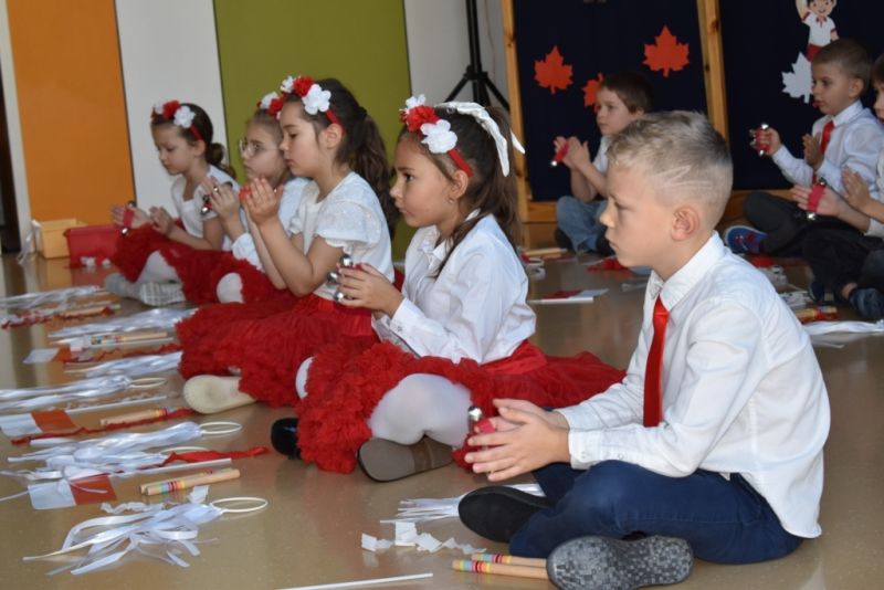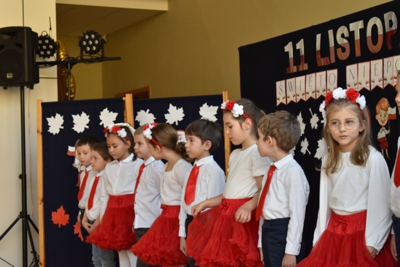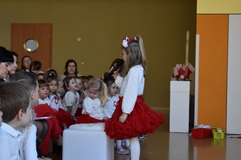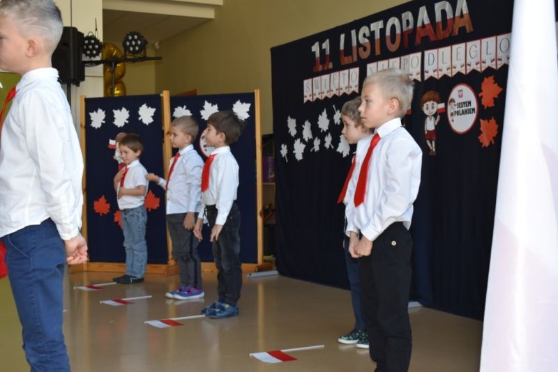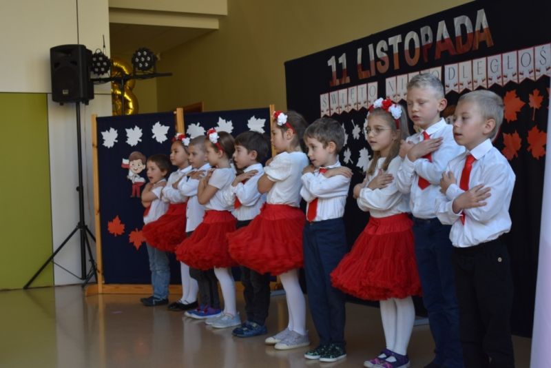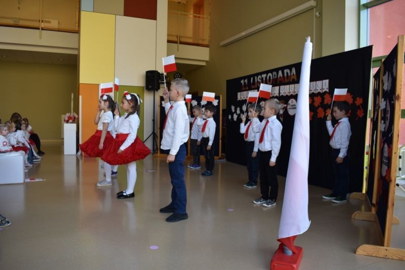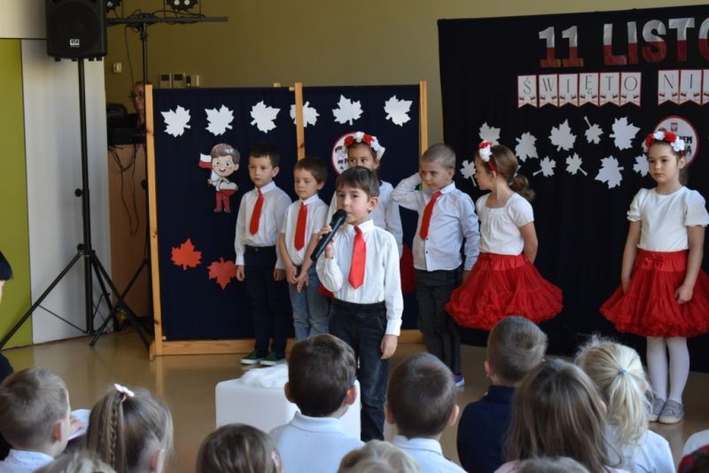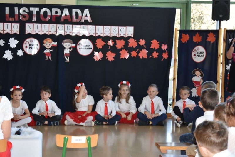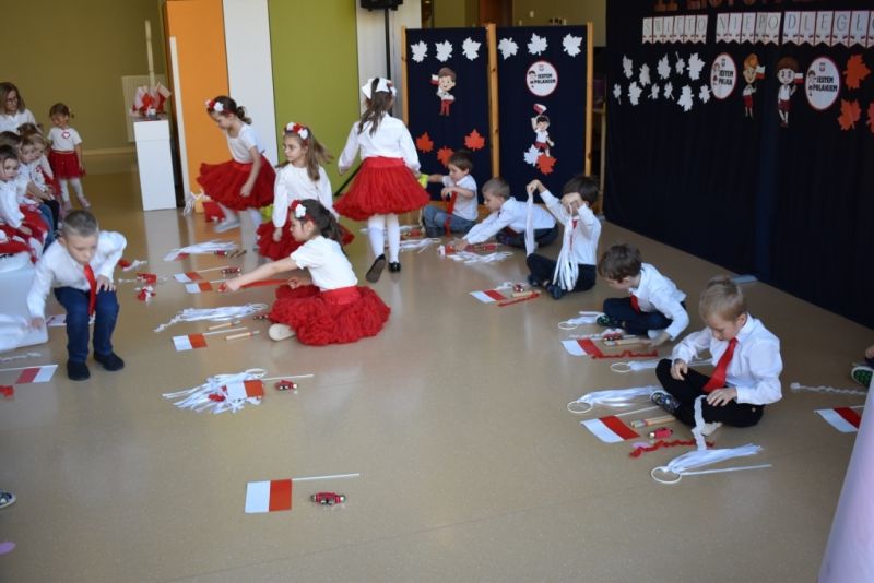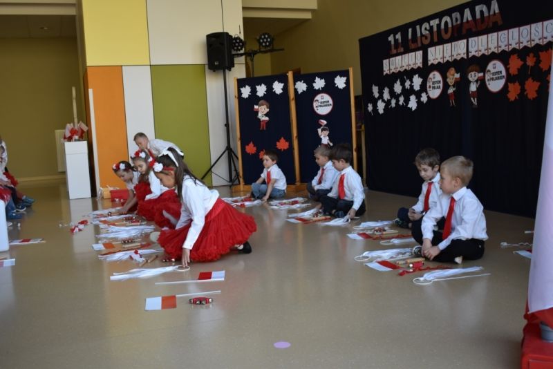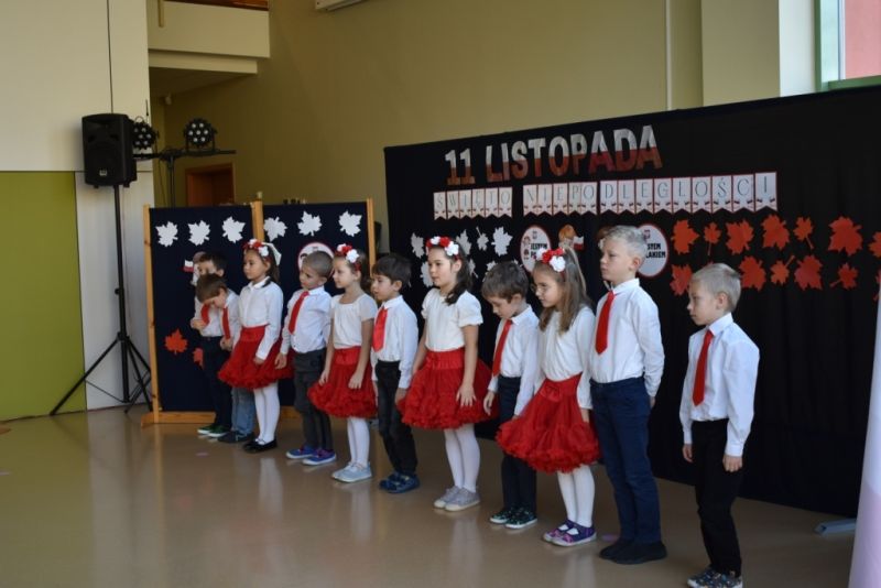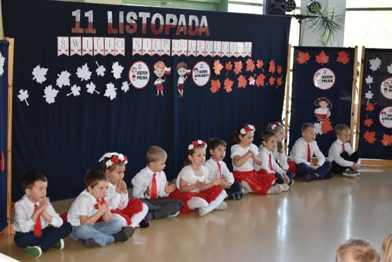 Dzisiaj w naszym przedszkolu odbyła się uroczystość z okazji Święta Niepodległości."Wiewiórki" zaprezentowały swym rodzicom, zaproszonym gościom oraz całej społeczności przedszkolnej montaż słowno- muzyczny z okazji Święta Niepodległości. Po powitaniu przybyłych gości oraz odśpiewaniu Hymnu Polski przedszkolaki z ogromnym zapałem słowem, tańcem i piosenką inscenizując dzieje naszego kraju oddały szacunek symbolom narodowym, symbolom walki o wolność i zwycięstwo oraz miłosć do Ojczyzny. Już u tak małych dzieci z wielką dumą zabrzmiały słowa tak bardzo wymowne: "Kto ty jestes? Polak mały", dobrze znana wszystkim pieśń patriotyczna "Ułani, ułani" - i lubiana przez wszystkie dzieci piosenka "Od morza, aż do Tatr", którą "Wiewiórki" zaśpiewały z flagą na koniec występu. Recytatorskie i wokalne umiejętności przedszkolaków zostały nagrodzone gromkimi brawami nie tylko przez rodziców, gości ale przede wszystkim przez nasze przedszkolaki i pracowników przedszkola. Gratulujemy dzieciom dumnej, patriotycznej postawy przy uczczeniu tego pięknego święta.Dziękujemy za miłe słowa, gromkie brawa i Państwa obecność w tych ważnych dla naszej społeczności chwilach. Wszystkim za dużą pomoc i zaangażowanie bardzo dziękujemy. Ta uroczystość to nasz wspólny sukces.