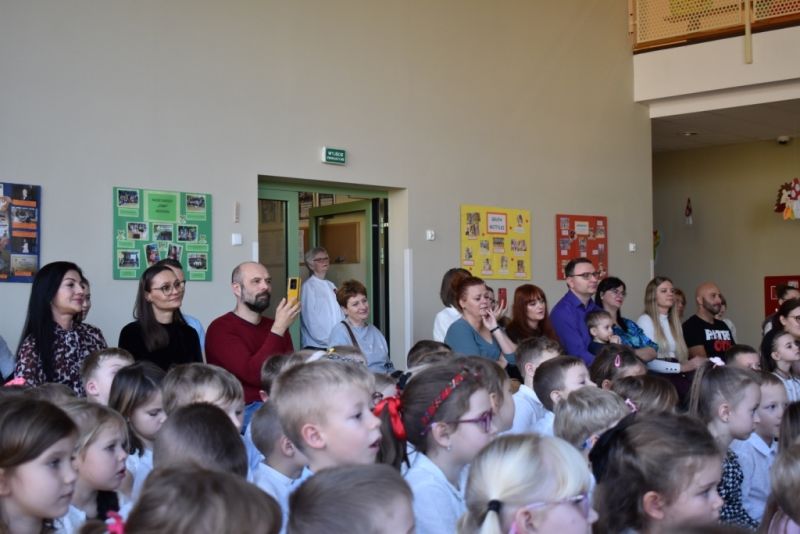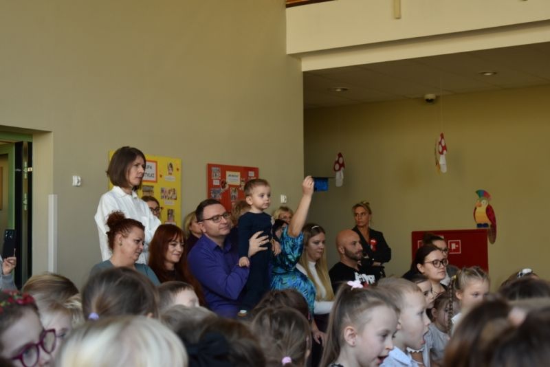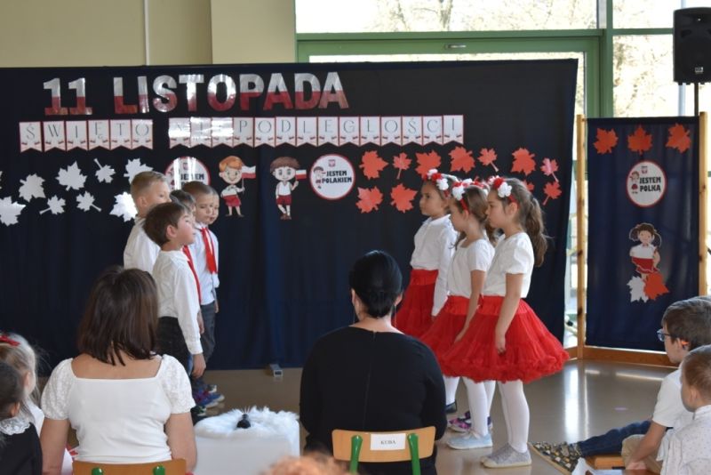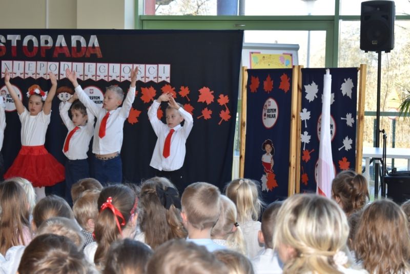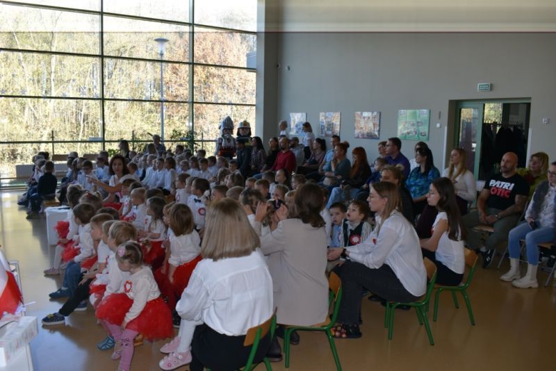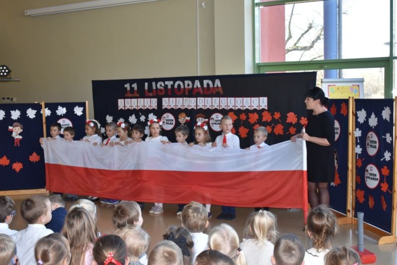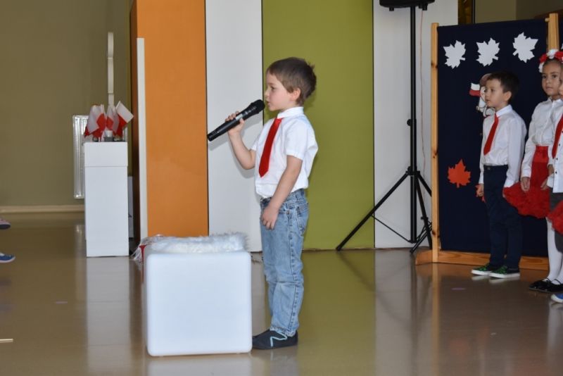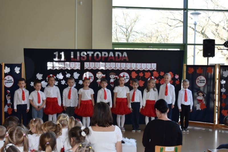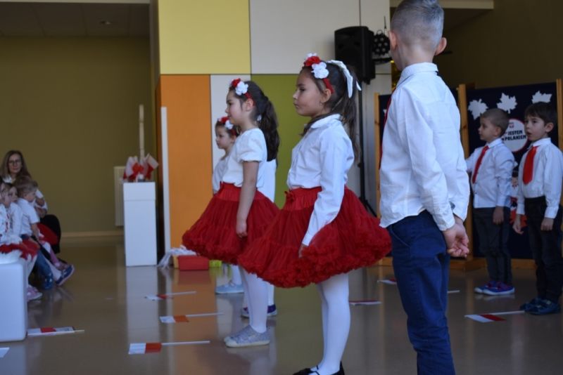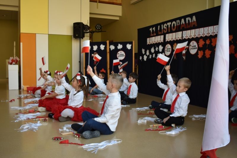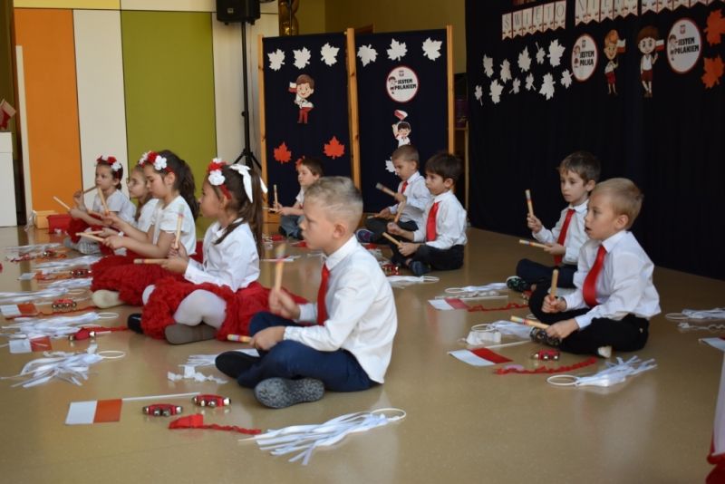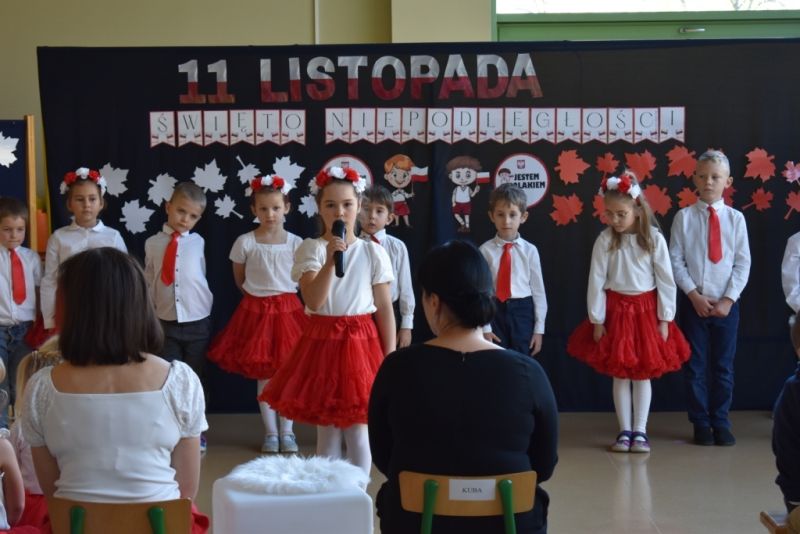 Dzisiaj w naszym przedszkolu odbyła się uroczystość z okazji Święta Niepodległości."Wiewiórki" zaprezentowały swym rodzicom, zaproszonym gościom oraz całej społeczności przedszkolnej montaż słowno- muzyczny z okazji Święta Niepodległości. Po powitaniu przybyłych gości oraz odśpiewaniu Hymnu Polski przedszkolaki z ogromnym zapałem słowem, tańcem i piosenką inscenizując dzieje naszego kraju oddały szacunek symbolom narodowym, symbolom walki o wolność i zwycięstwo oraz miłosć do Ojczyzny. Już u tak małych dzieci z wielką dumą zabrzmiały słowa tak bardzo wymowne: "Kto ty jestes? Polak mały", dobrze znana wszystkim pieśń patriotyczna "Ułani, ułani" - i lubiana przez wszystkie dzieci piosenka "Od morza, aż do Tatr", którą "Wiewiórki" zaśpiewały z flagą na koniec występu. Recytatorskie i wokalne umiejętności przedszkolaków zostały nagrodzone gromkimi brawami nie tylko przez rodziców, gości ale przede wszystkim przez nasze przedszkolaki i pracowników przedszkola. Gratulujemy dzieciom dumnej, patriotycznej postawy przy uczczeniu tego pięknego święta.Dziękujemy za miłe słowa, gromkie brawa i Państwa obecność w tych ważnych dla naszej społeczności chwilach. Wszystkim za dużą pomoc i zaangażowanie bardzo dziękujemy. Ta uroczystość to nasz wspólny sukces.
