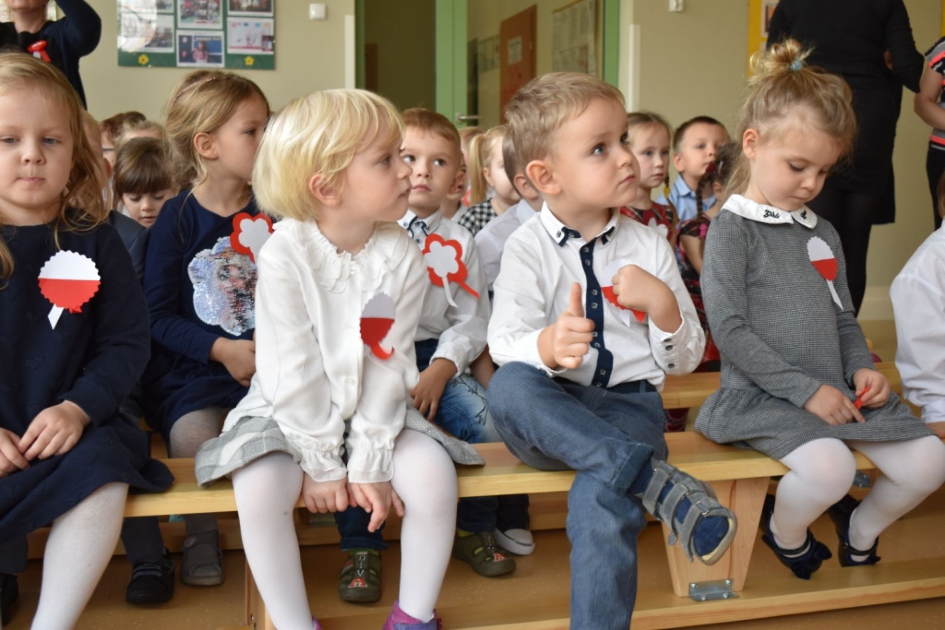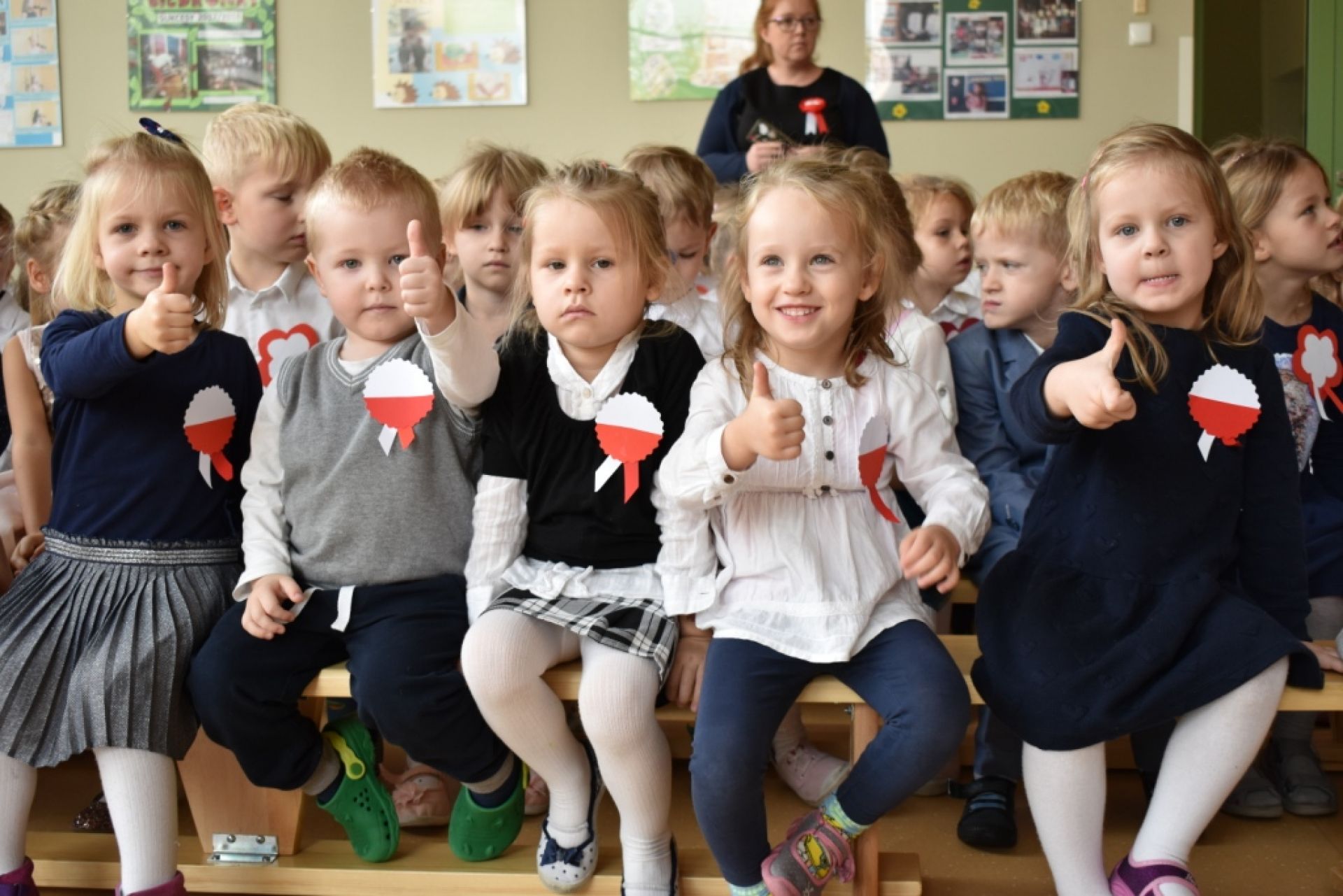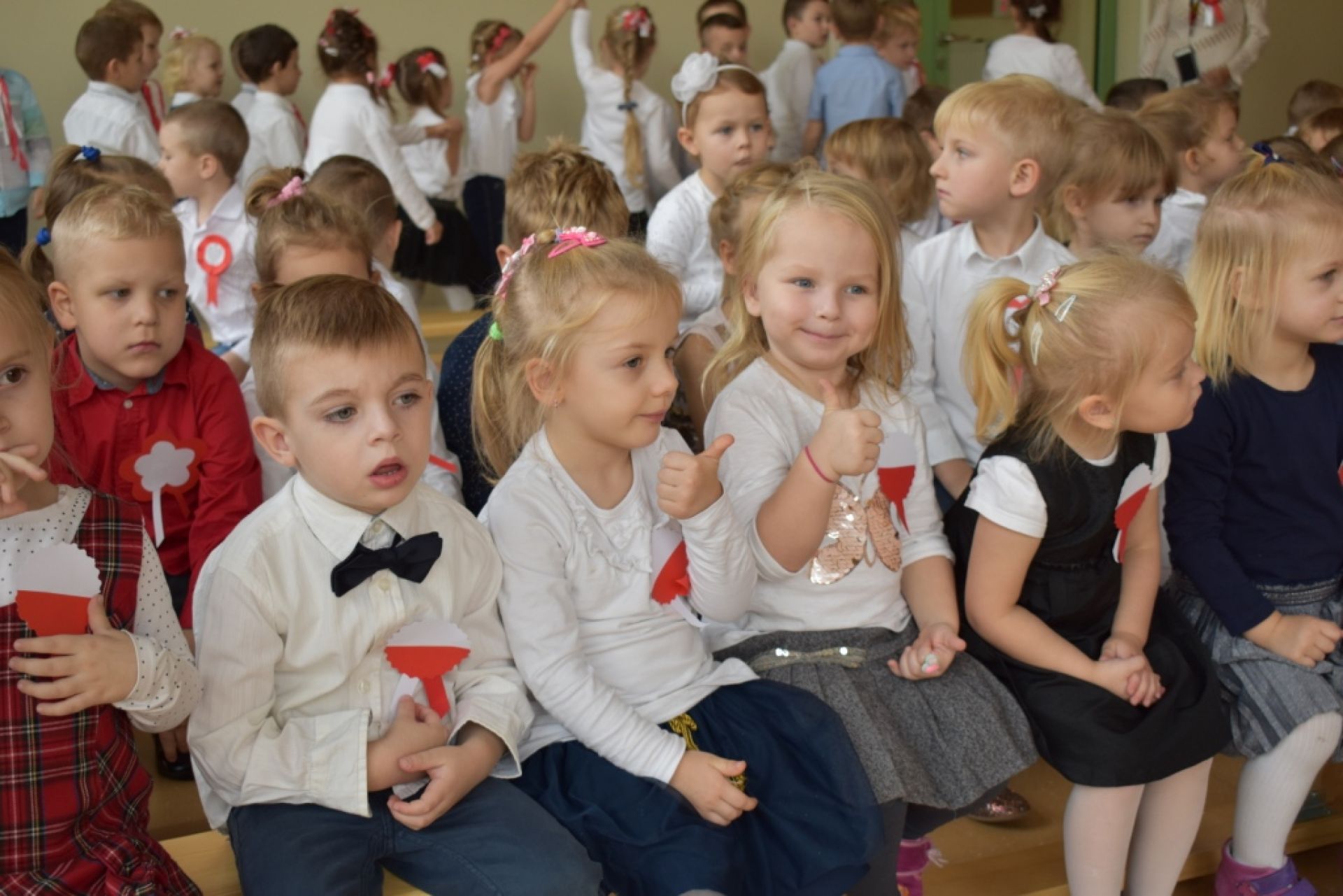 Dzisiaj w naszym przedszkolu obchodziliśmy Święto Niepodległości. O godzinie 11:11 odśpiewaliśmy wspólnie Hymn Polski. Póżniej obejrzeliśmy program artystyczny przygotowany przez "Delfinki". Następnie wysłuchaliśmy audycji muzycznej "Polska moja Ojczyzna".