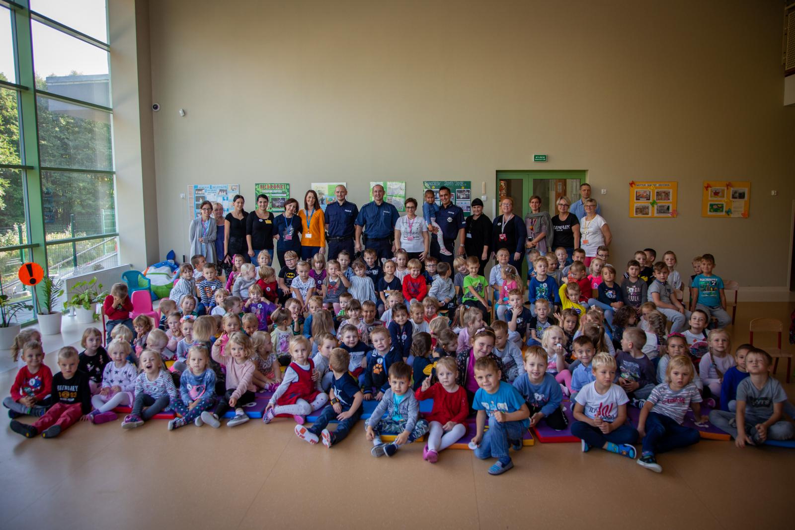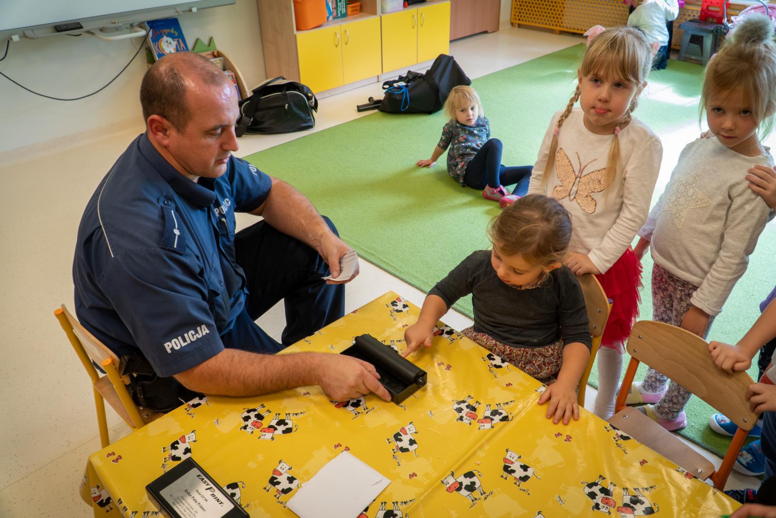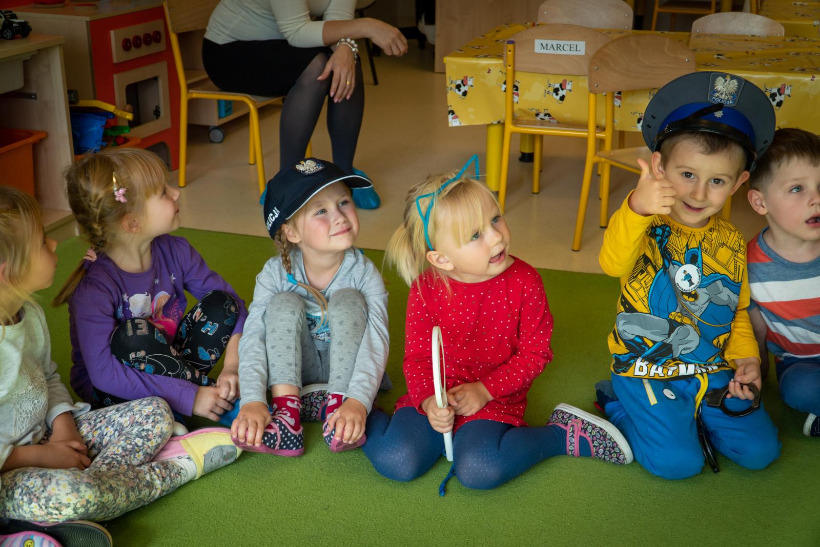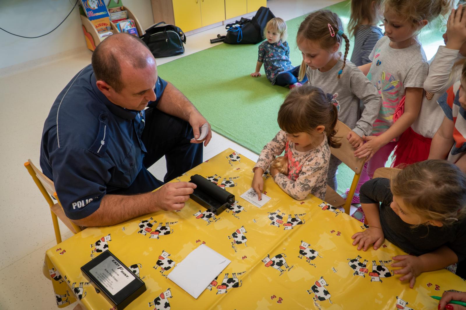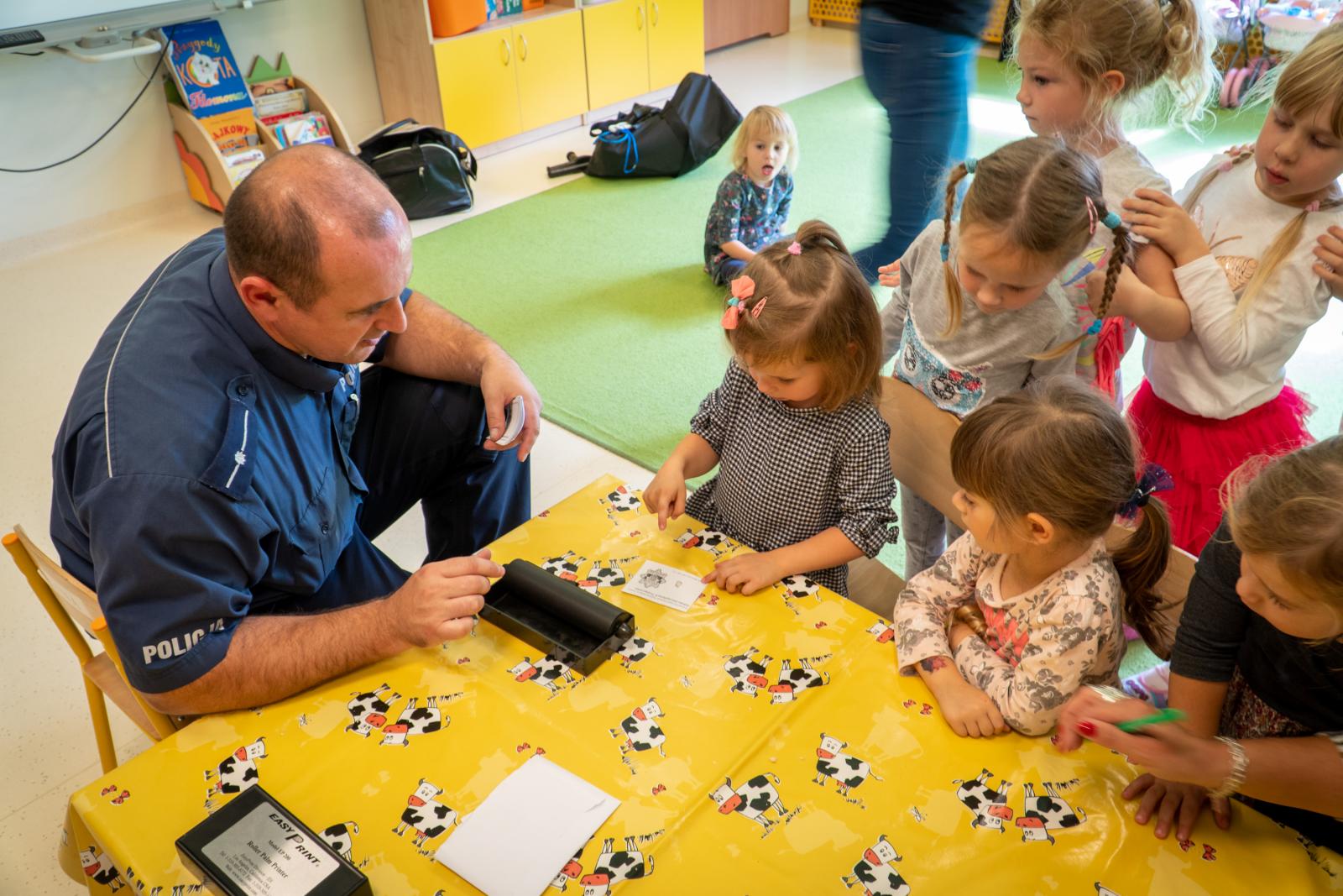Dnia 20.09.2019r. "Motylki" wraz z innymi grupami obchodziły Dzień Przedszkolaka pod hasłem: "Bezpieczny Przedszkolak". Wzięliśmy udział w zabawach integracyjnych w auli naszego przedszkola, gdzie obecni byli również zaproszeni goście: Panowie policjanci z pobliskiej Komendy Miejskiej Policji "Toruń-Podgórz". Pani Alina zaprosiła dzieci do wspólnej zabawy przy muzyce, rozwiązywaliśmy zagadki dotyczące bezpieczeństwa w ruchu drogowym oraz mieliśmy okazję wysłuchać "lekcji bezpieczeństwa", której udzielili nam policjanci. Dalsza część zajęć z gośćmi odbyła się w sali "Motylków", gdzie poznaliśmy atrybuty każdego policjanta, jego umundurowanie oraz obowiązki służbowe. Każdy z nas odcisnął swoje linie papilarne w "kartotece policyjnej" :) Mamy nadzieję, że Panowie policjanci odwiedzą nas również w przyszłym roku :)