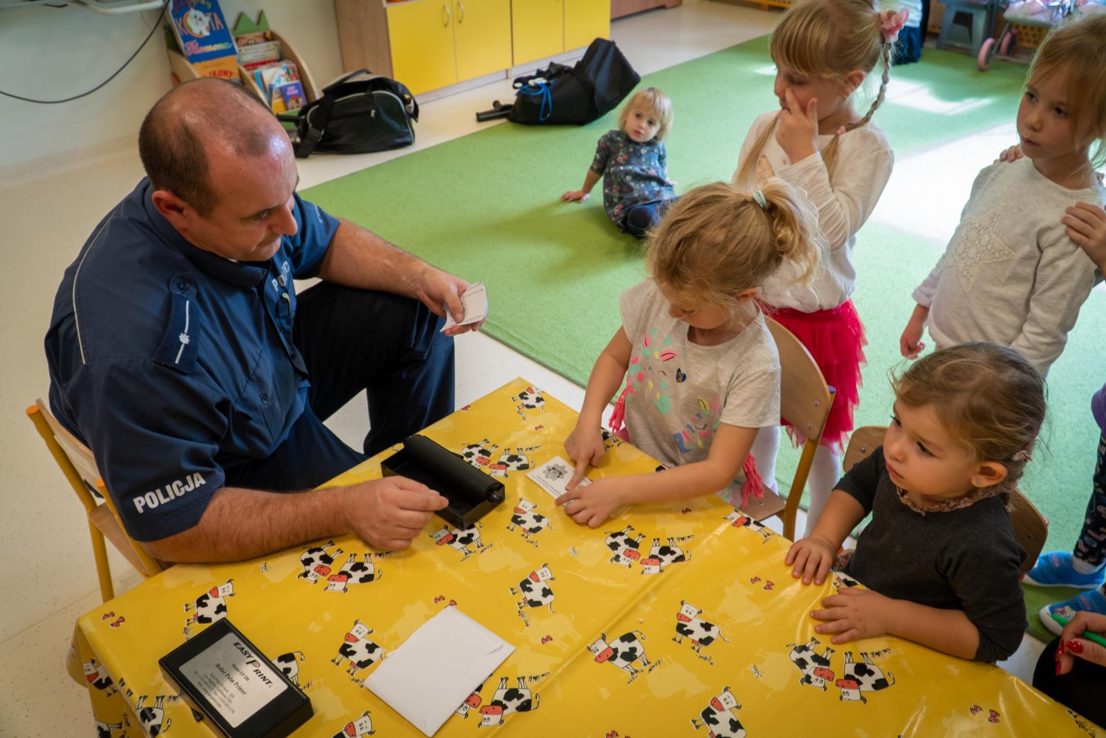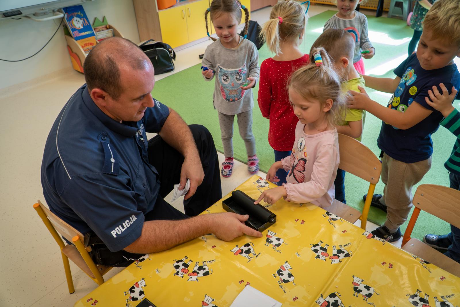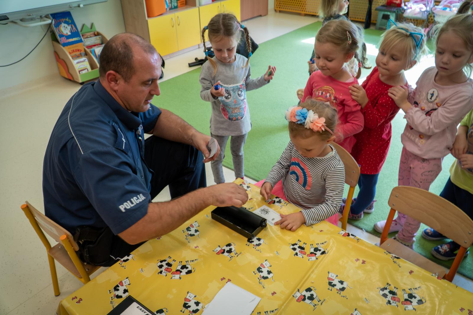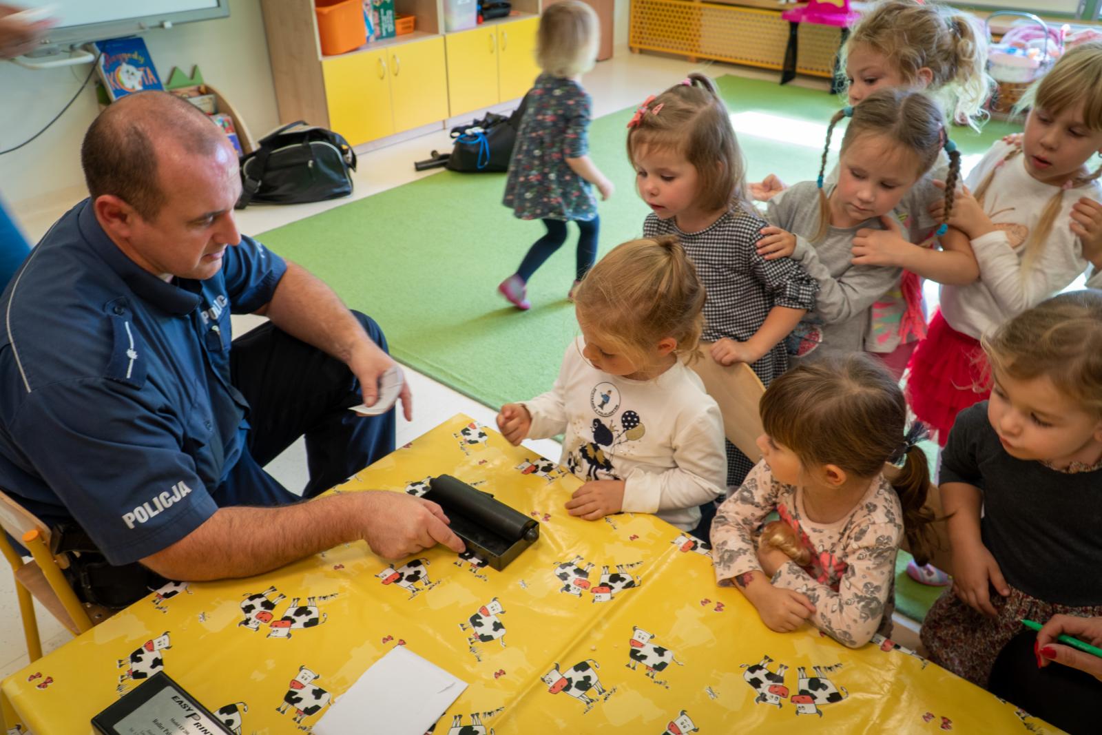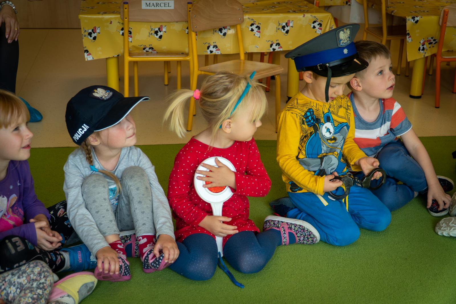 Dnia 20.09.2019r. "Motylki" wraz z innymi grupami obchodziły Dzień Przedszkolaka pod hasłem: "Bezpieczny Przedszkolak". Wzięliśmy udział w zabawach integracyjnych w auli naszego przedszkola, gdzie obecni byli również zaproszeni goście: Panowie policjanci z pobliskiej Komendy Miejskiej Policji "Toruń-Podgórz". Pani Alina zaprosiła dzieci do wspólnej zabawy przy muzyce, rozwiązywaliśmy zagadki dotyczące bezpieczeństwa w ruchu drogowym oraz mieliśmy okazję wysłuchać "lekcji bezpieczeństwa", której udzielili nam policjanci. Dalsza część zajęć z gośćmi odbyła się w sali "Motylków", gdzie poznaliśmy atrybuty każdego policjanta, jego umundurowanie oraz obowiązki służbowe. Każdy z nas odcisnął swoje linie papilarne w "kartotece policyjnej" :) Mamy nadzieję, że Panowie policjanci odwiedzą nas również w przyszłym roku :)