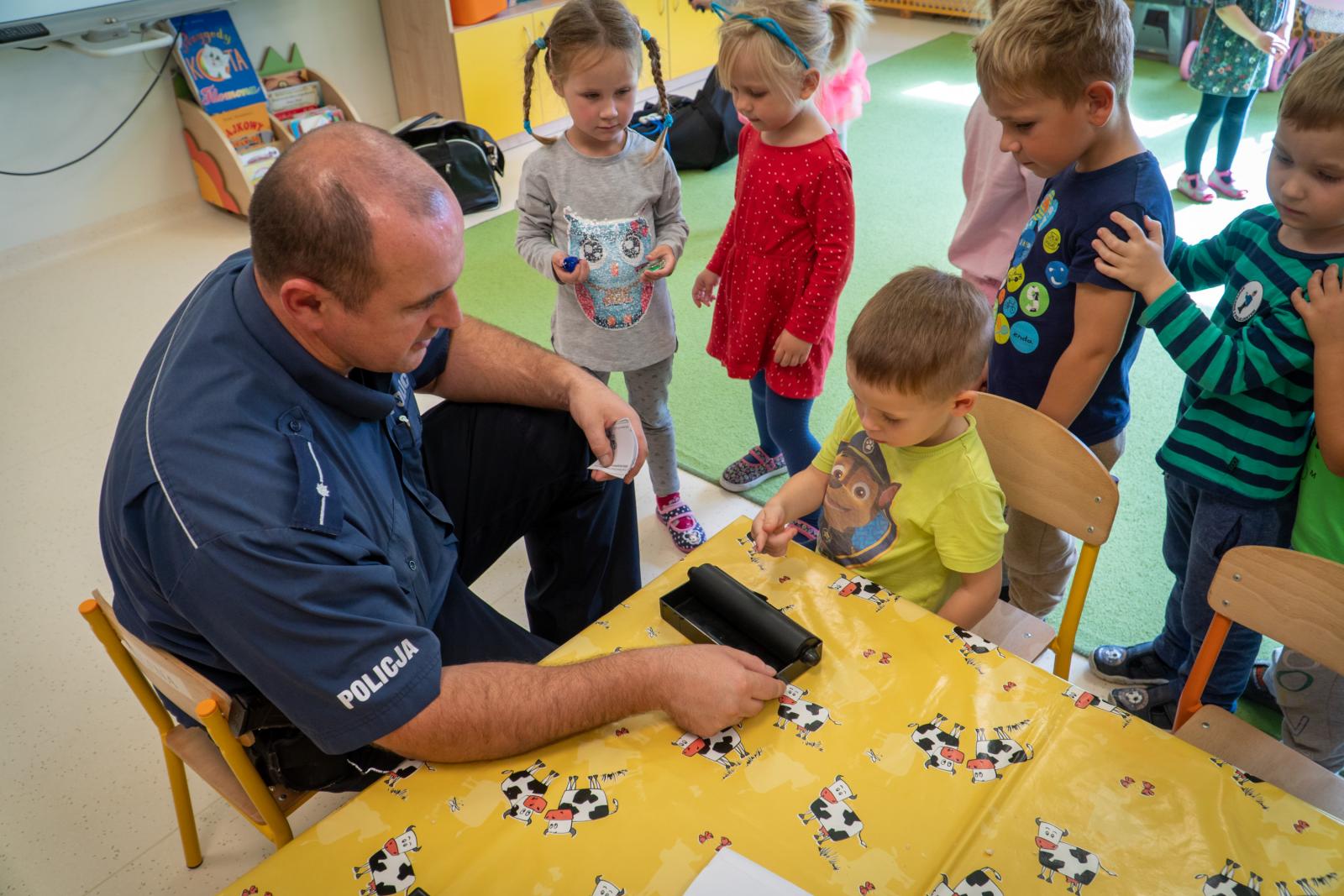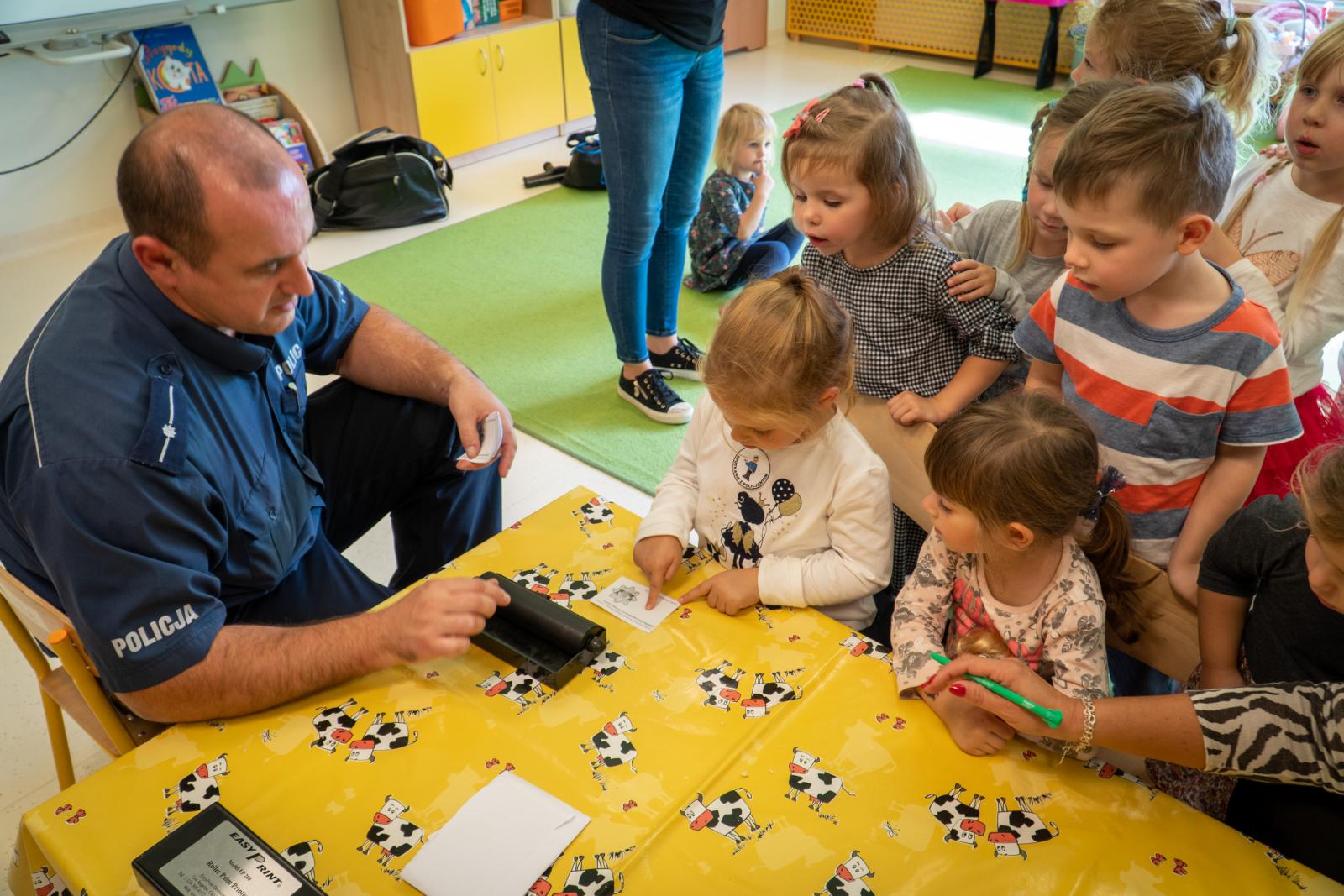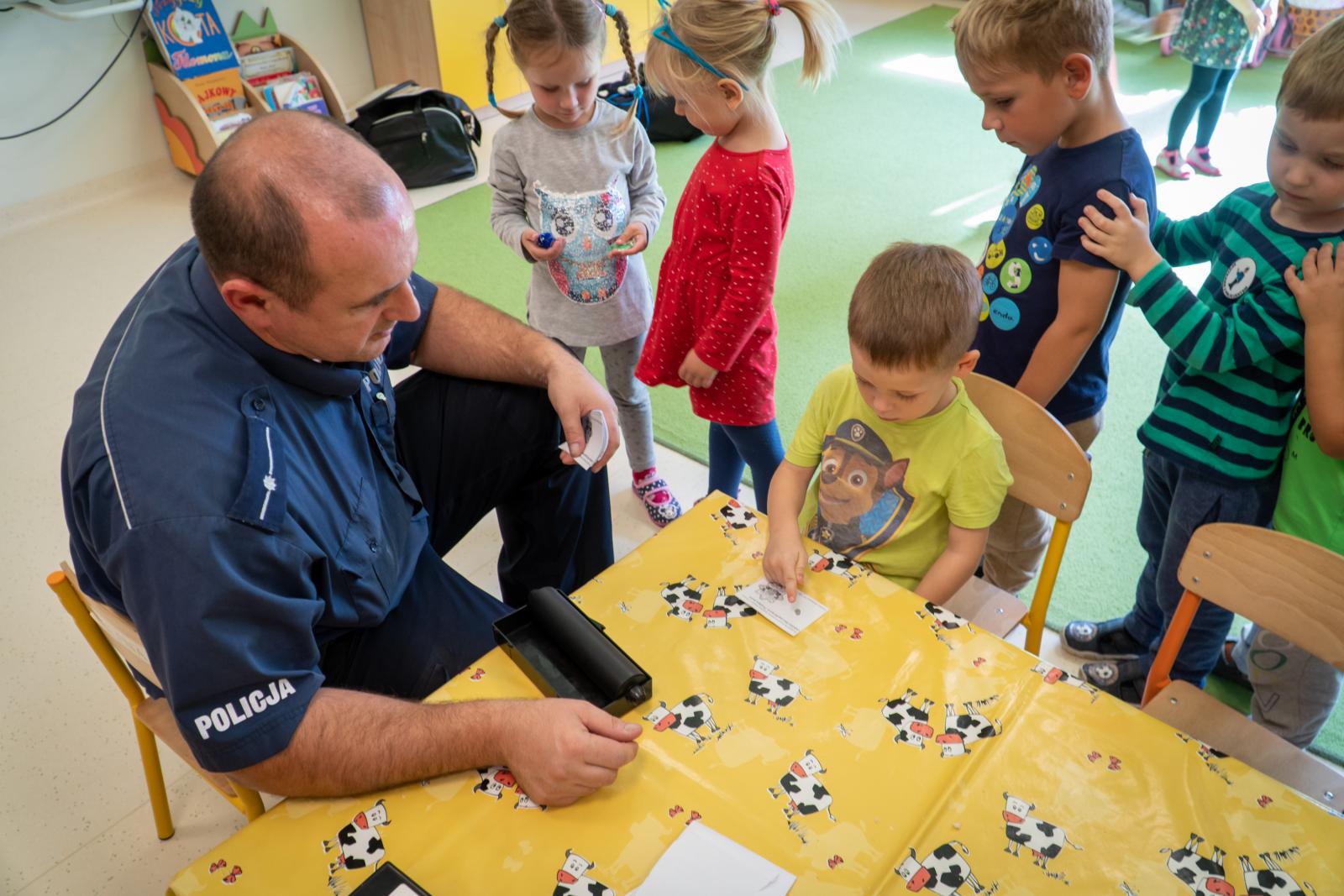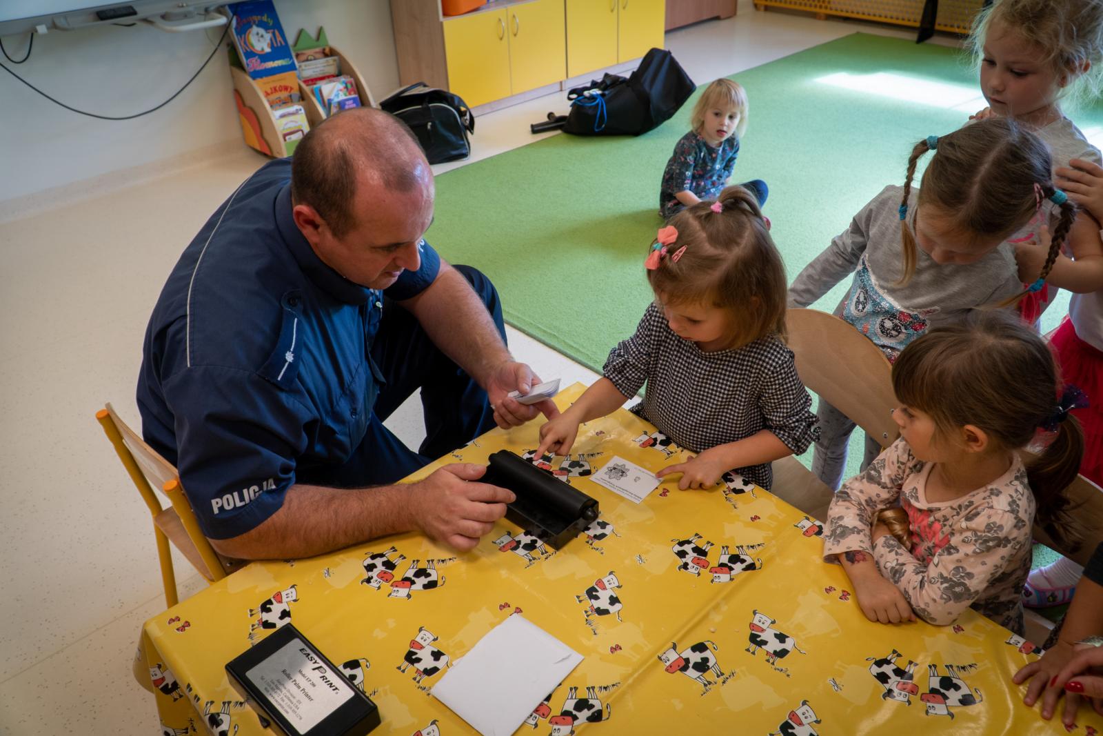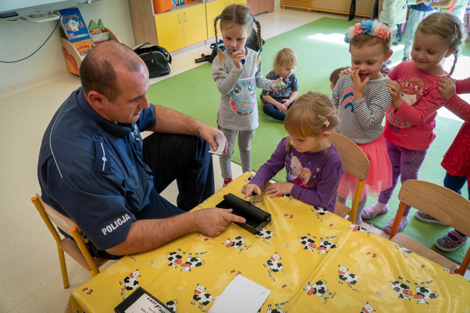 Dnia 20.09.2019r. "Motylki" wraz z innymi grupami obchodziły Dzień Przedszkolaka pod hasłem: "Bezpieczny Przedszkolak". Wzięliśmy udział w zabawach integracyjnych w auli naszego przedszkola, gdzie obecni byli również zaproszeni goście: Panowie policjanci z pobliskiej Komendy Miejskiej Policji "Toruń-Podgórz". Pani Alina zaprosiła dzieci do wspólnej zabawy przy muzyce, rozwiązywaliśmy zagadki dotyczące bezpieczeństwa w ruchu drogowym oraz mieliśmy okazję wysłuchać "lekcji bezpieczeństwa", której udzielili nam policjanci. Dalsza część zajęć z gośćmi odbyła się w sali "Motylków", gdzie poznaliśmy atrybuty każdego policjanta, jego umundurowanie oraz obowiązki służbowe. Każdy z nas odcisnął swoje linie papilarne w "kartotece policyjnej" :) Mamy nadzieję, że Panowie policjanci odwiedzą nas również w przyszłym roku :)
