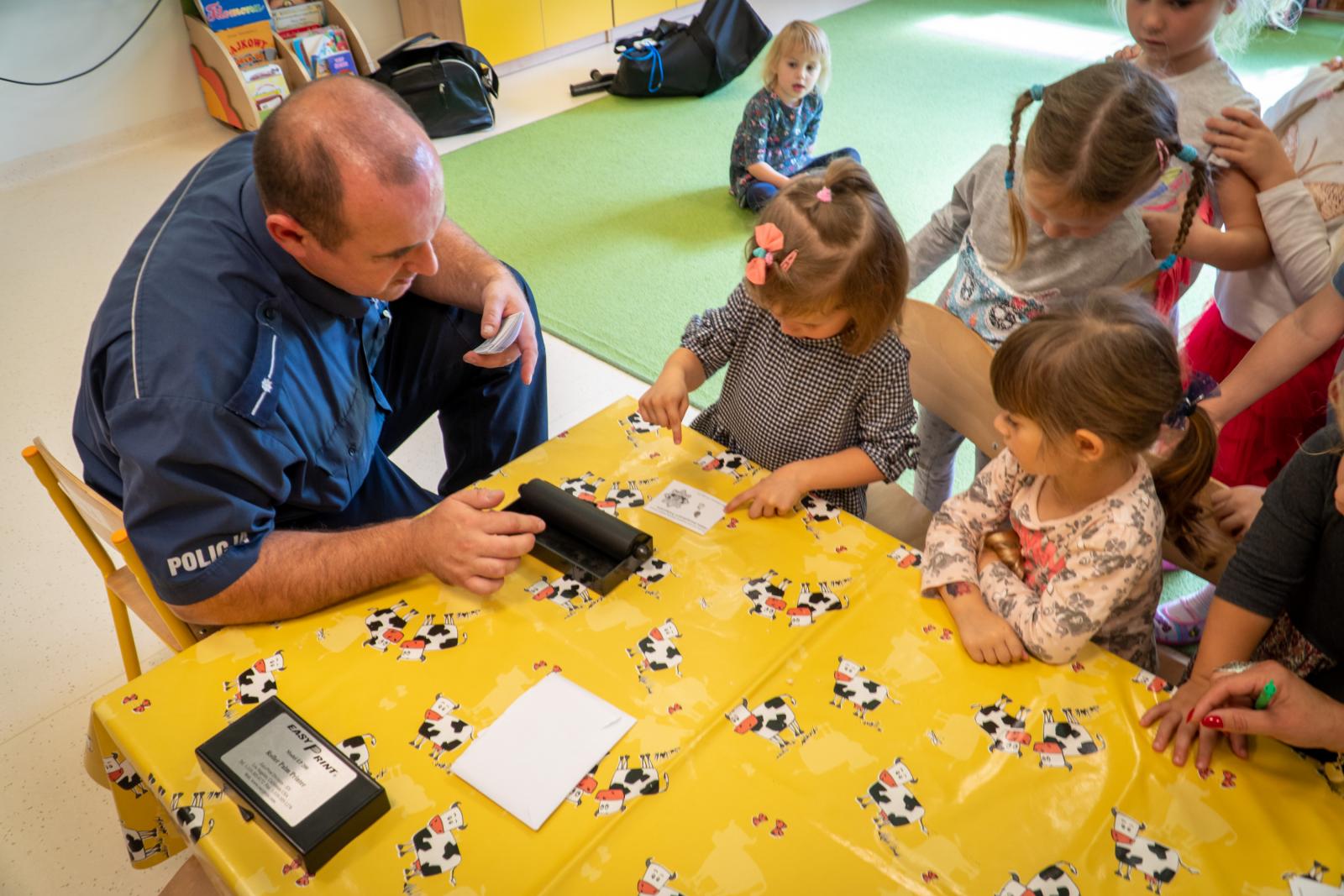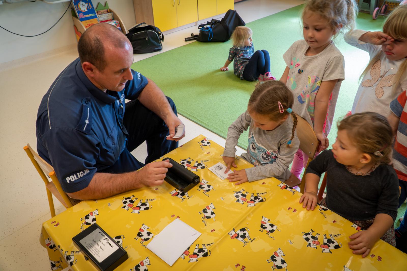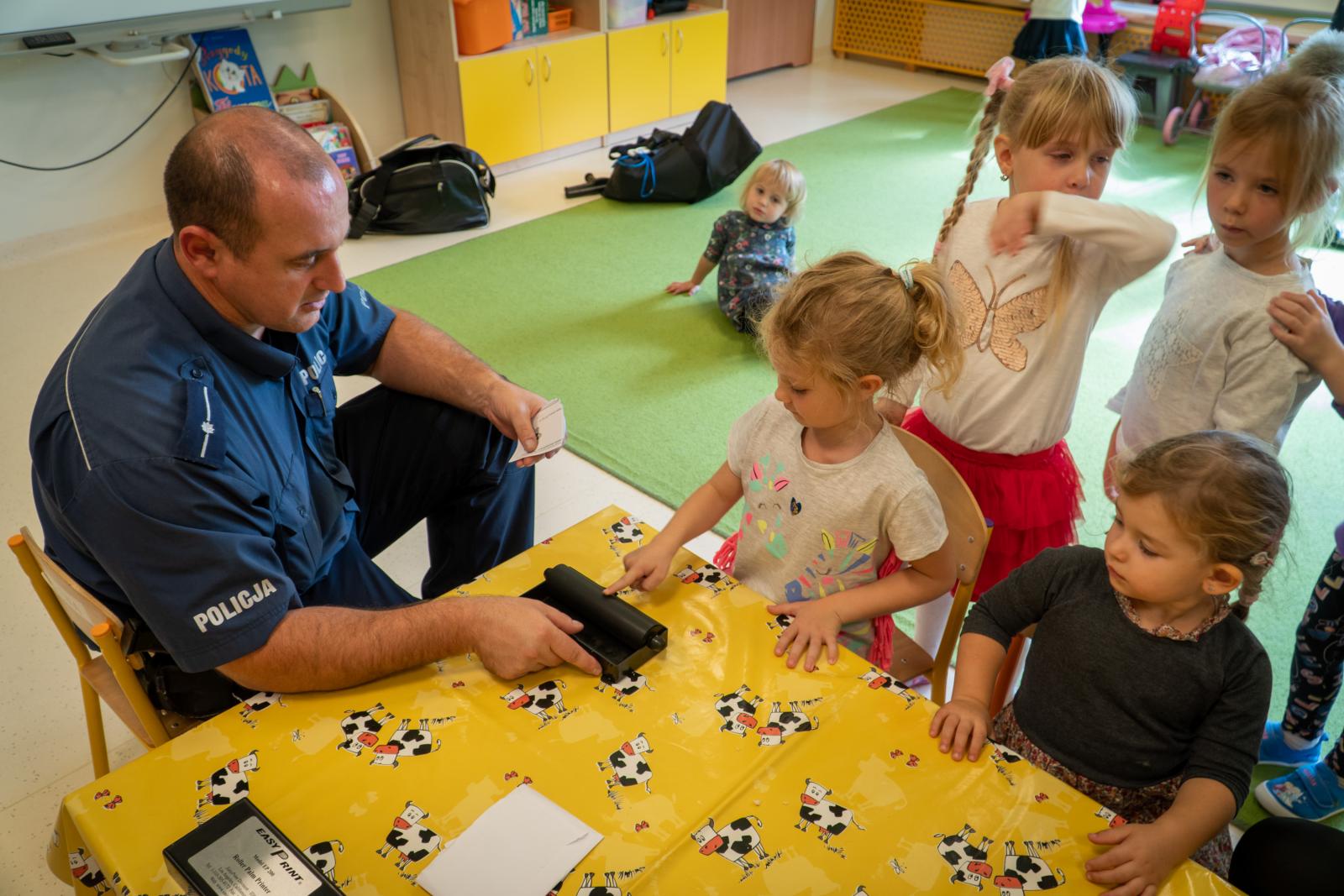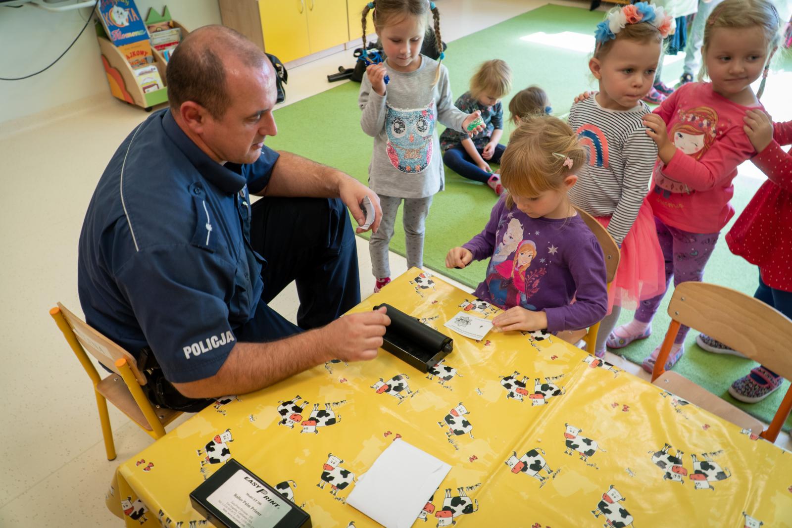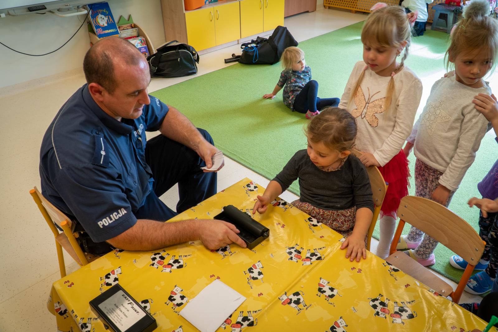 Dnia 20.09.2019r. "Motylki" wraz z innymi grupami obchodziły Dzień Przedszkolaka pod hasłem: "Bezpieczny Przedszkolak". Wzięliśmy udział w zabawach integracyjnych w auli naszego przedszkola, gdzie obecni byli również zaproszeni goście: Panowie policjanci z pobliskiej Komendy Miejskiej Policji "Toruń-Podgórz". Pani Alina zaprosiła dzieci do wspólnej zabawy przy muzyce, rozwiązywaliśmy zagadki dotyczące bezpieczeństwa w ruchu drogowym oraz mieliśmy okazję wysłuchać "lekcji bezpieczeństwa", której udzielili nam policjanci. Dalsza część zajęć z gośćmi odbyła się w sali "Motylków", gdzie poznaliśmy atrybuty każdego policjanta, jego umundurowanie oraz obowiązki służbowe. Każdy z nas odcisnął swoje linie papilarne w "kartotece policyjnej" :) Mamy nadzieję, że Panowie policjanci odwiedzą nas również w przyszłym roku :)