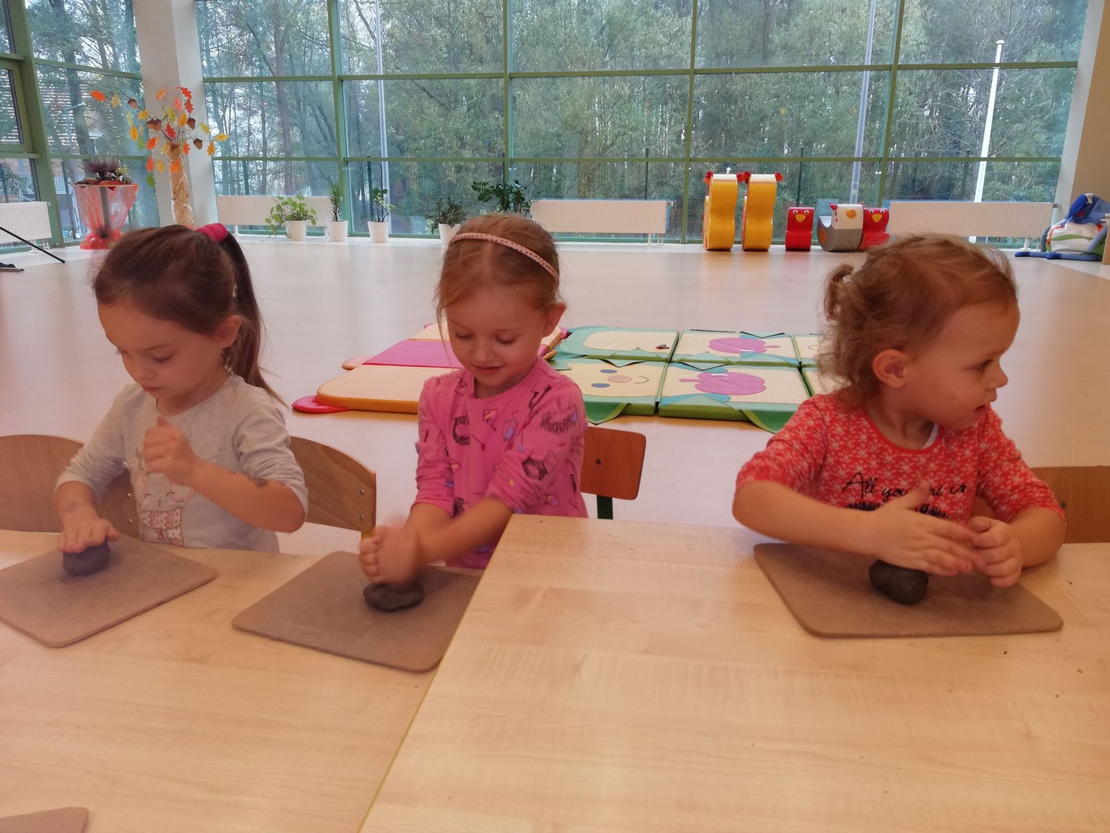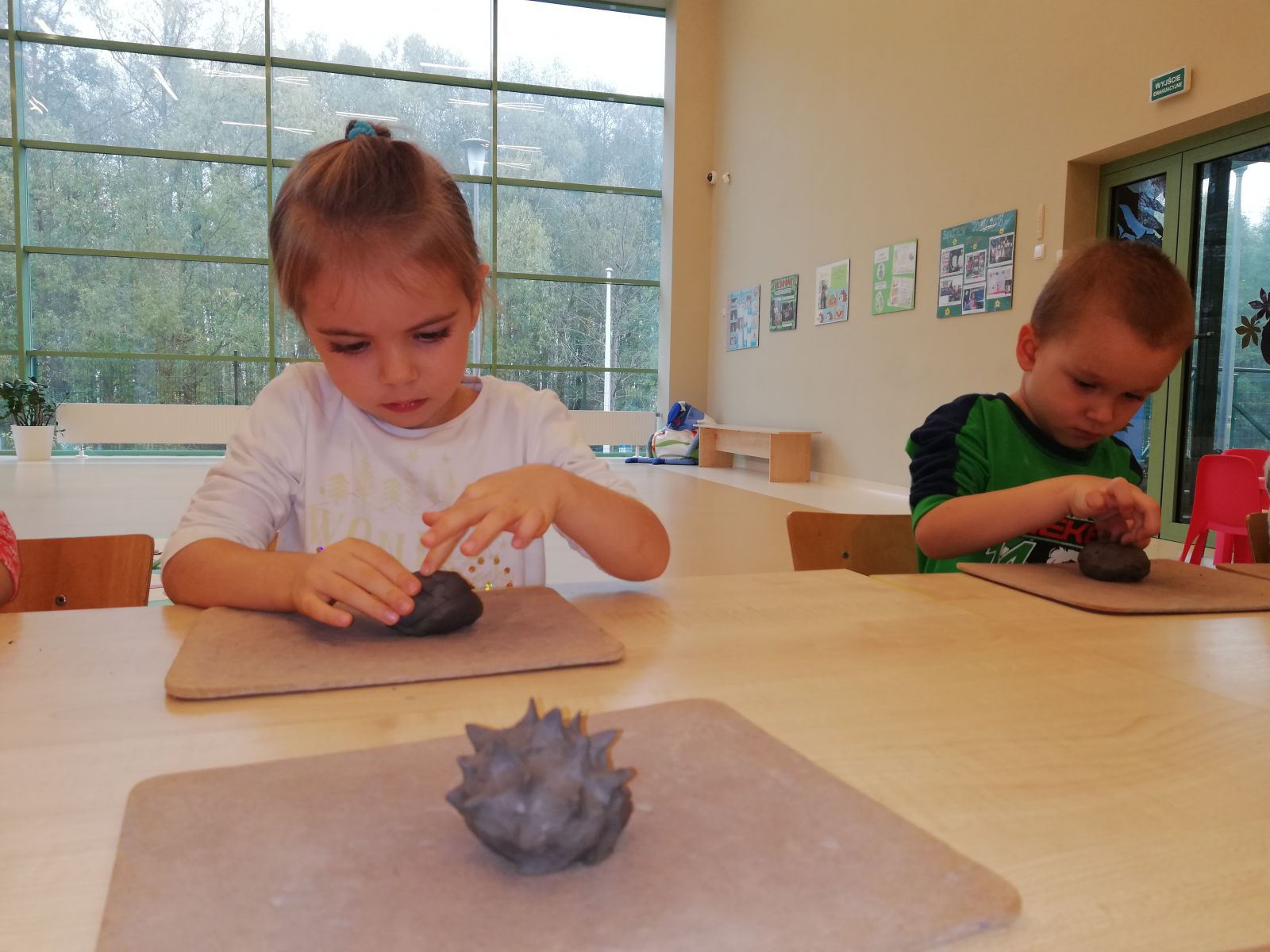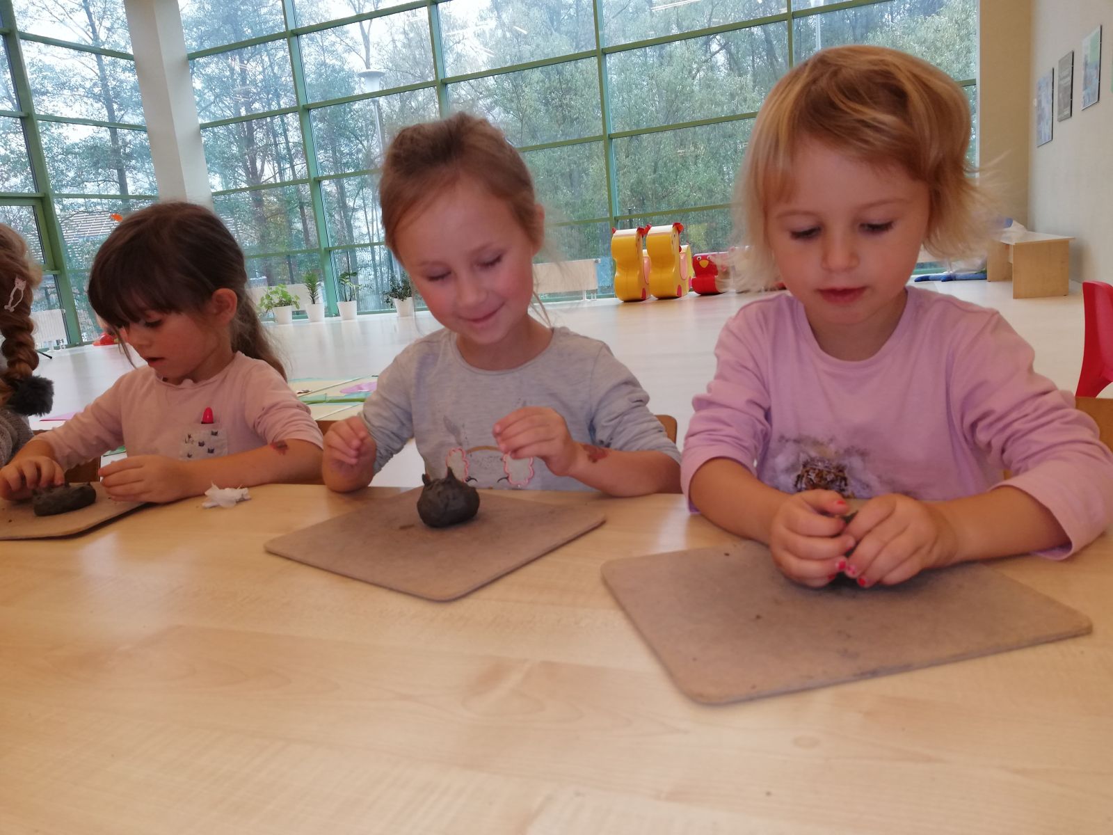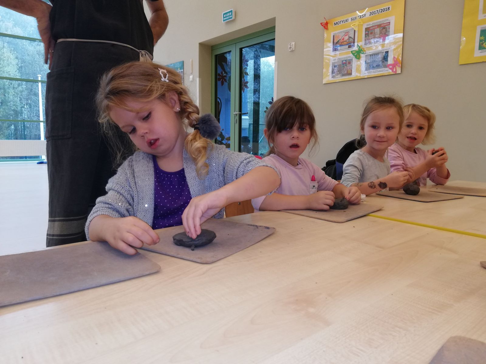 Dnia 24.10.2019r. Motylki wzięły udział w kolejnych z cyklu warsztatach lepienia z gliny. Tym razem Pan prowadzący nawiązał do tematyki jesiennej i zachęcił dzieci do wyrzeźbienia według wzoru jesiennego jeżyka. Wszyscy z zapałem zabrali się do pracy i usprawniali swoje rączki ugniatając i formując glinę, tak, aby jak najwierniej odtworzyć rzeźbę zaprezentowaną przez prowadzącego. Lepienie z gliny, to wcale nie jest taka łatwa sprawa, a jednak poradziliśmy sobie wspaniale :)