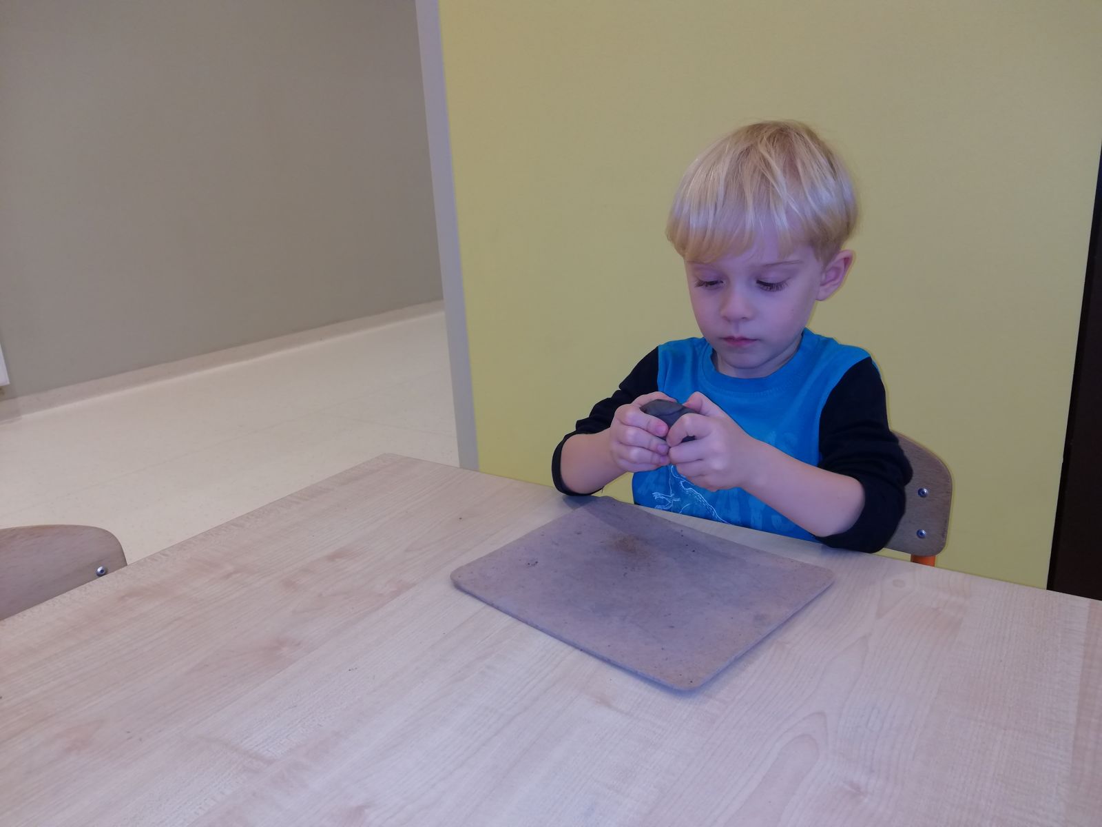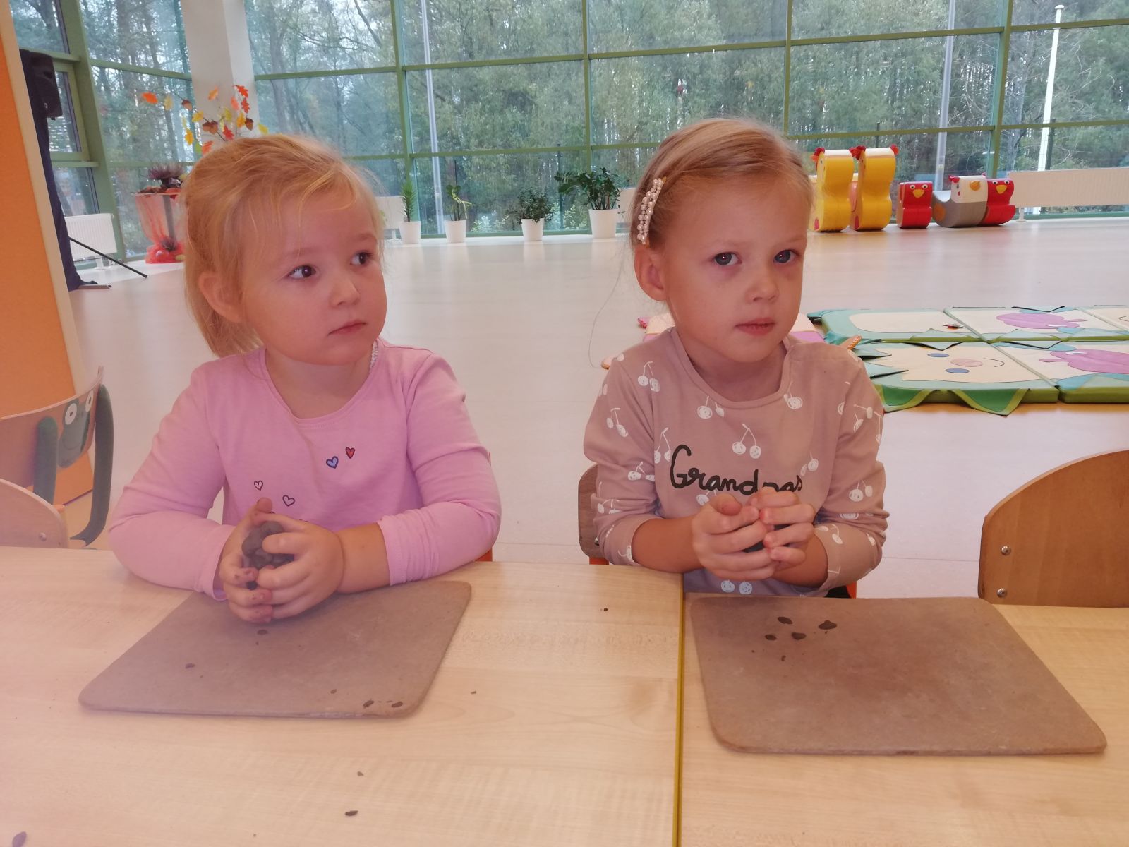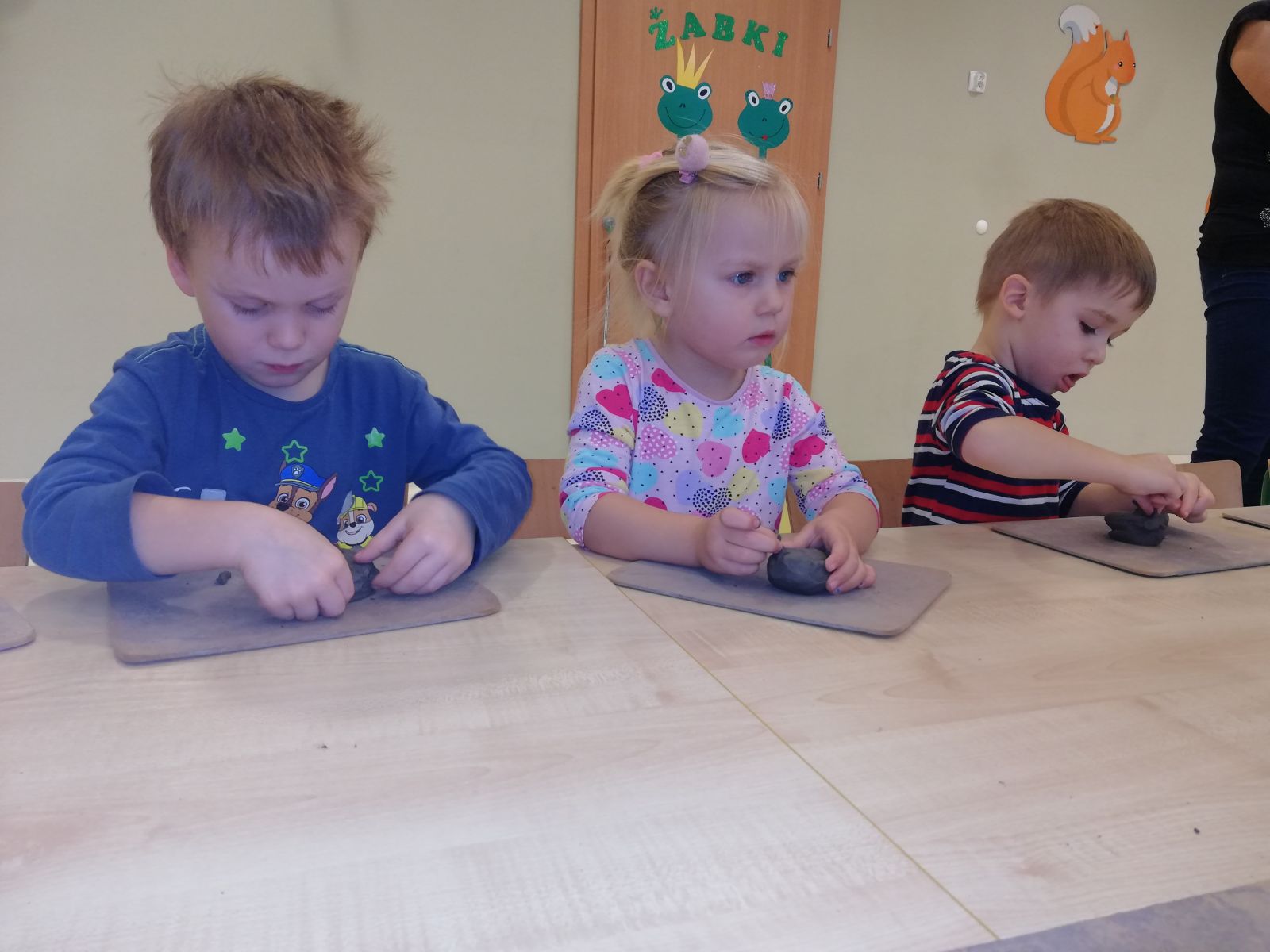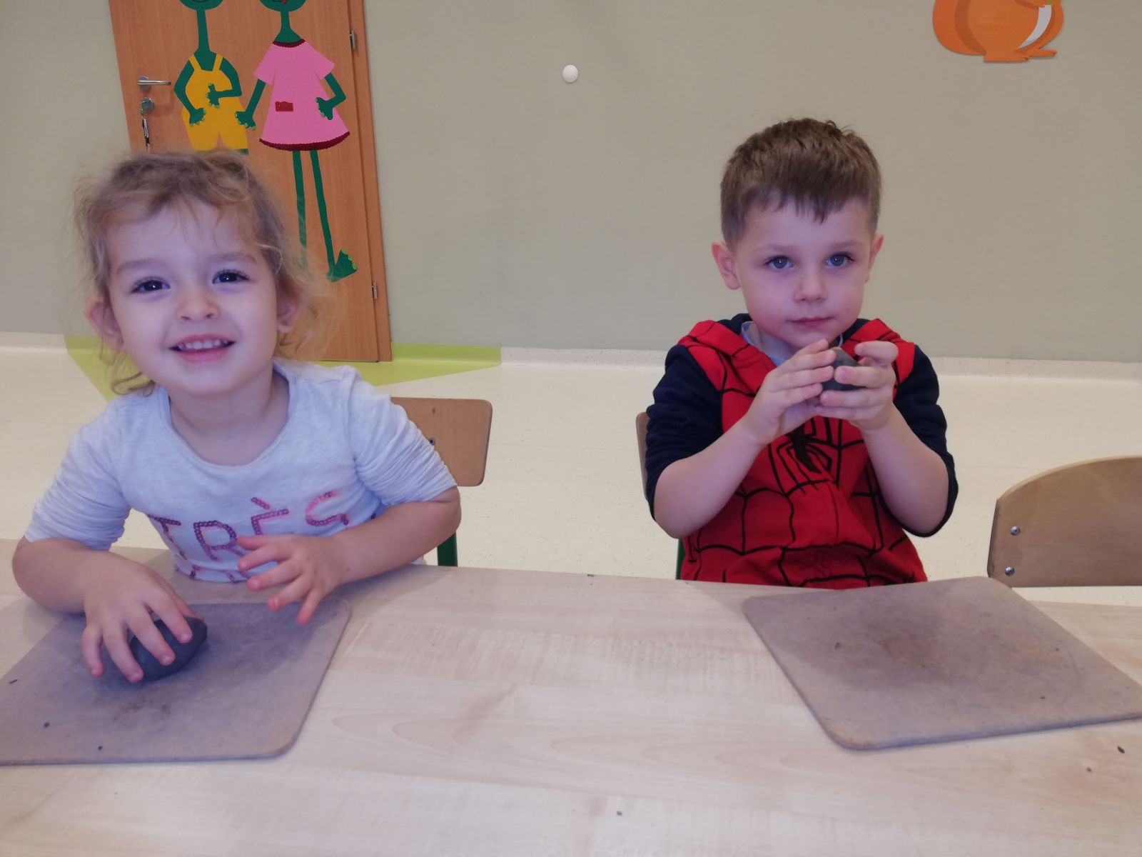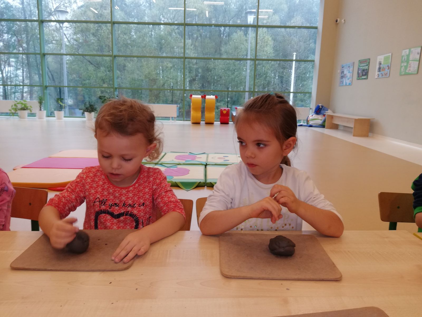 Dnia 24.10.2019r. Motylki wzięły udział w kolejnych z cyklu warsztatach lepienia z gliny. Tym razem Pan prowadzący nawiązał do tematyki jesiennej i zachęcił dzieci do wyrzeźbienia według wzoru jesiennego jeżyka. Wszyscy z zapałem zabrali się do pracy i usprawniali swoje rączki ugniatając i formując glinę, tak, aby jak najwierniej odtworzyć rzeźbę zaprezentowaną przez prowadzącego. Lepienie z gliny, to wcale nie jest taka łatwa sprawa, a jednak poradziliśmy sobie wspaniale :)