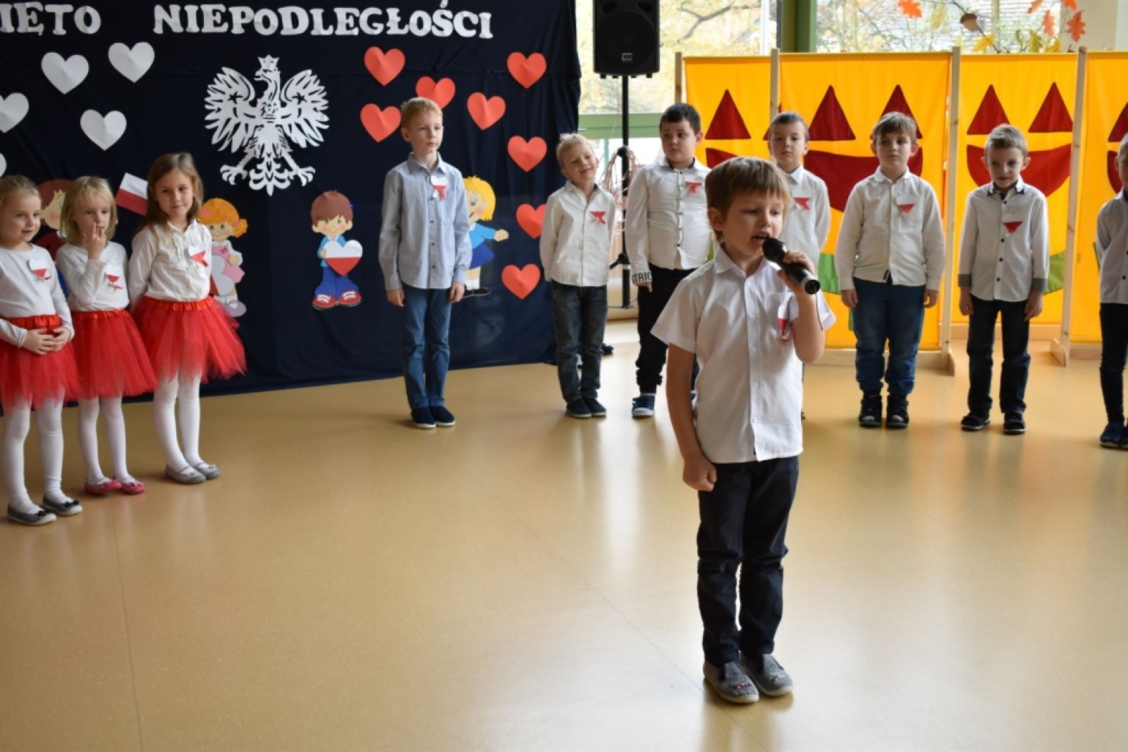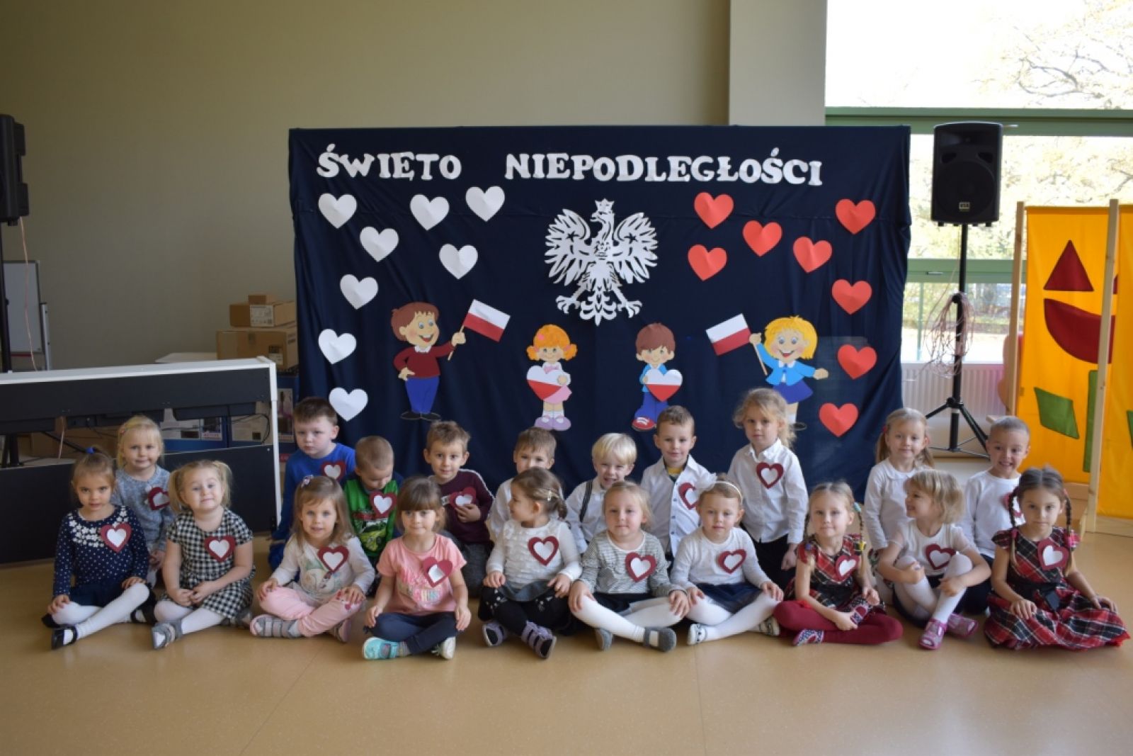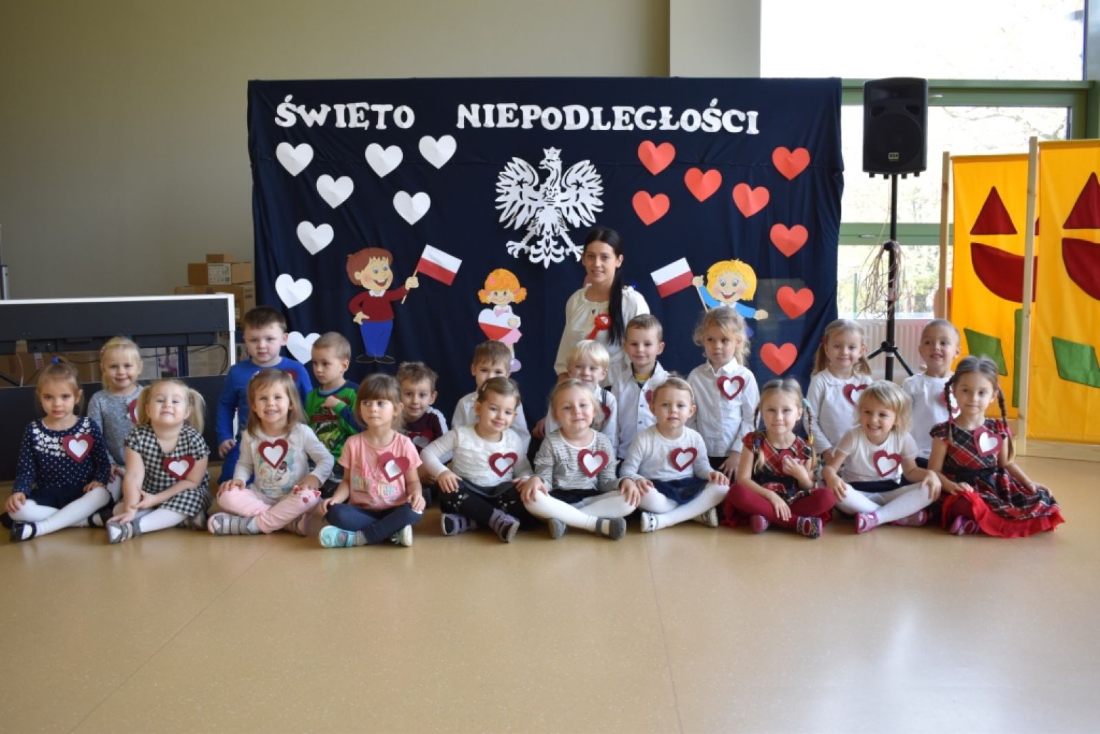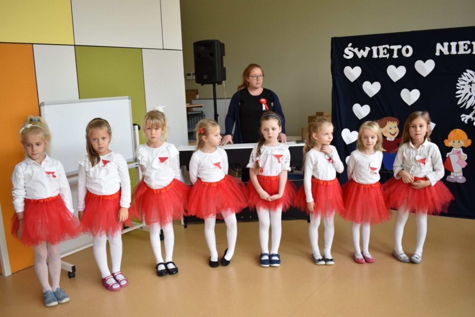 Dnia 08.11.2019r. obchodziliśmy w przedszkolu Narodowe Święto Odzyskania Niepodległości. To już 101 rocznica wolności naszego kraju i z tej okazji najstarsza grupa przedszkolna "Delfinki" pod kierownictwem Pani Eli, przygotowała piękny, uroczysty apel patriotyczny. Uroczystość była niezwykle wzruszająca, ponieważ przypomniała nam o tych wszystkich, którzy zginęli walcząc w obronie naszej ojczyzny. Apel pozwolił nam utrwalić znaczenie naszych symboli narodowych. Wspólnie odśpiewaliśmy hymn narodowy, który mimo tego, że jest trudny, to pięknie wybrzmiał w ust i serc naszych małych patriotów.