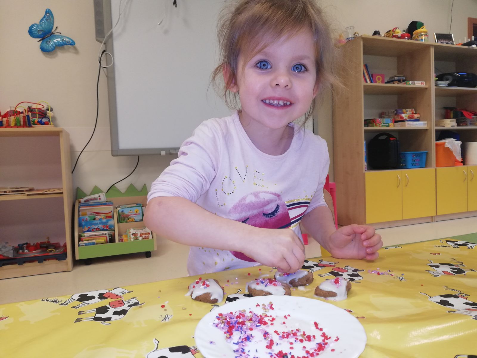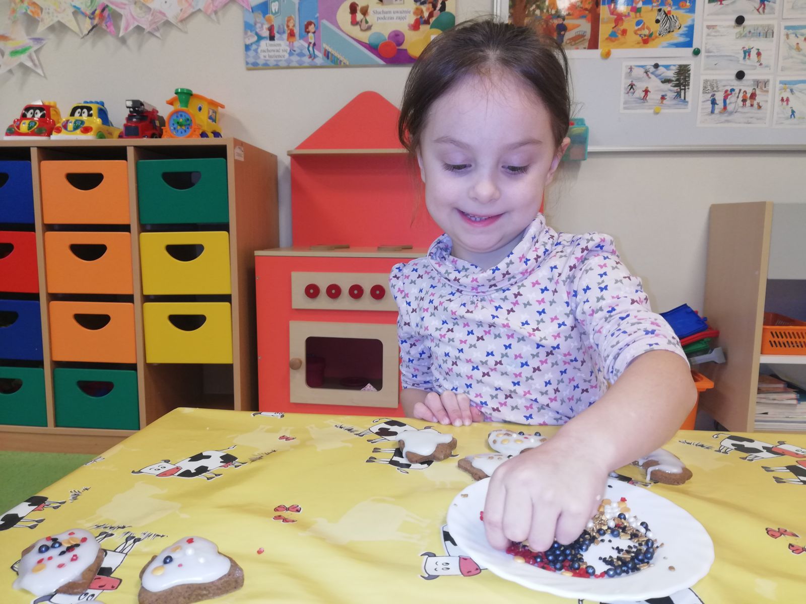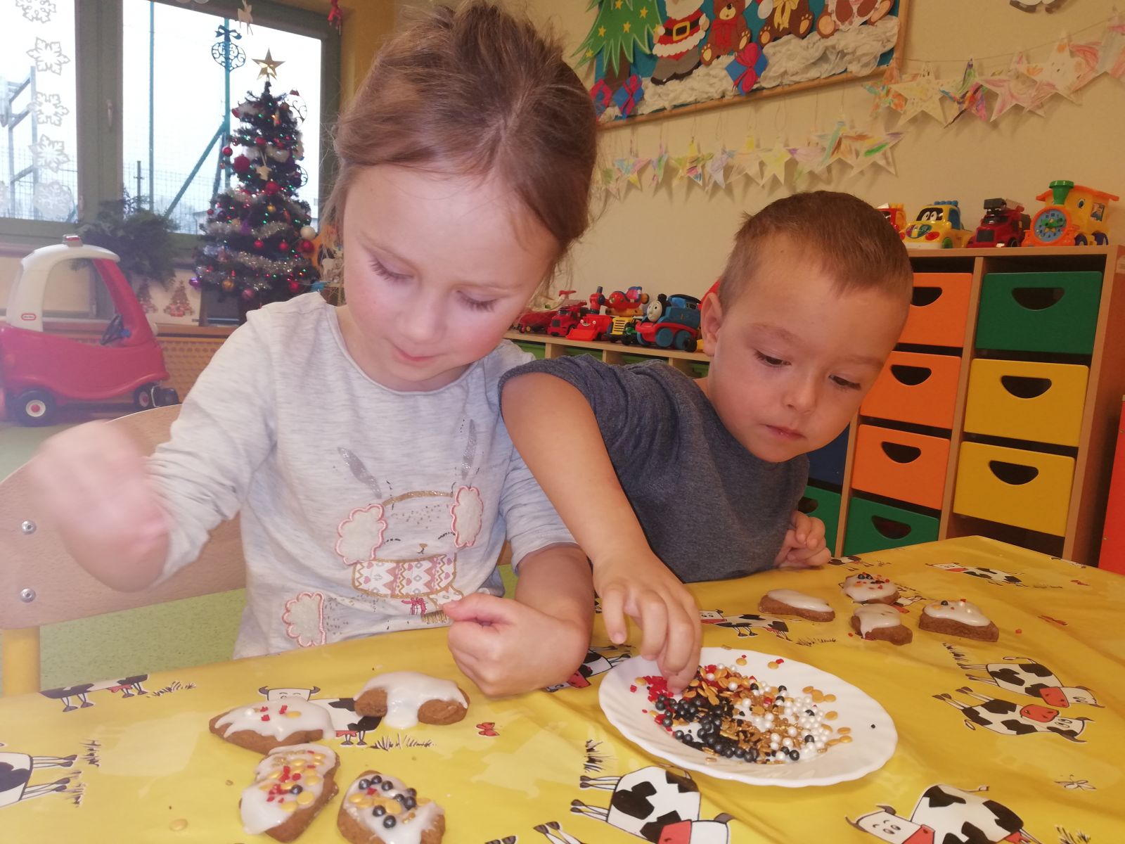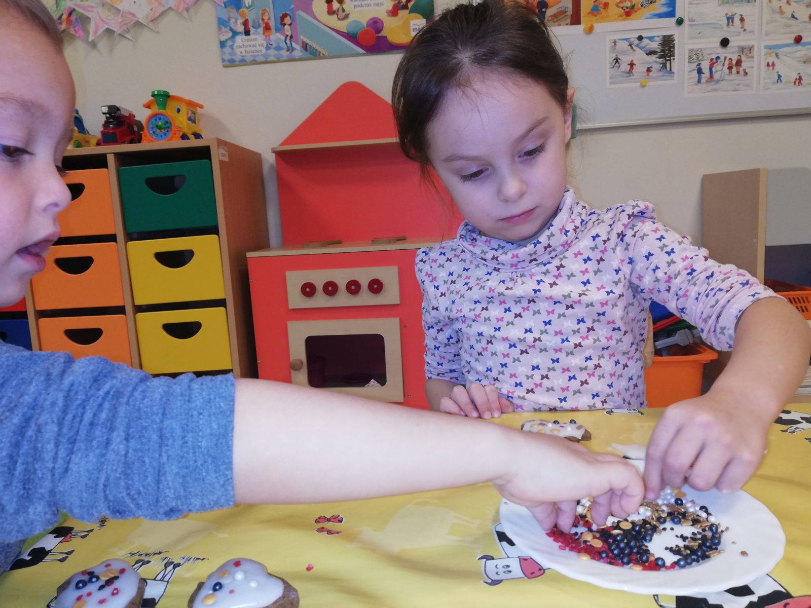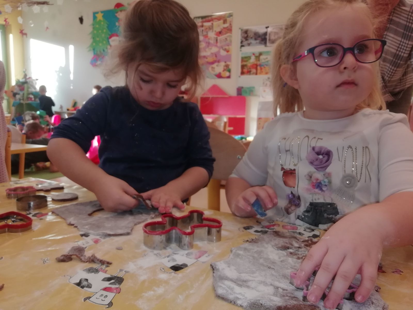 Dnia 11.12.2019r. Motylki ochoczo zabrały się do pieczenia świątecznych pierników. Wyrabiały ciasto, wałkowały i wycinały pierniczki za pomocą foremek. Kolejnego dnia, gdy pierniczki wypiekły się i wystygły zabraliśmy się za ich dekorowanie. To była wspaniała zabawa :) Efekty naszych prac już niebawem ocenią rodzice, którzy na spotkaniu wigilijnym w naszej grupie będą mogli skosztować świątecznych smakołyków.