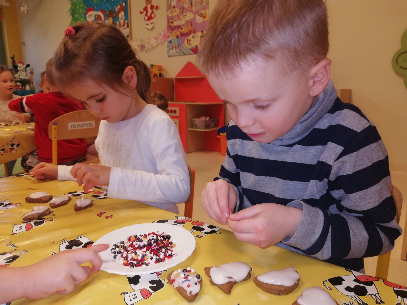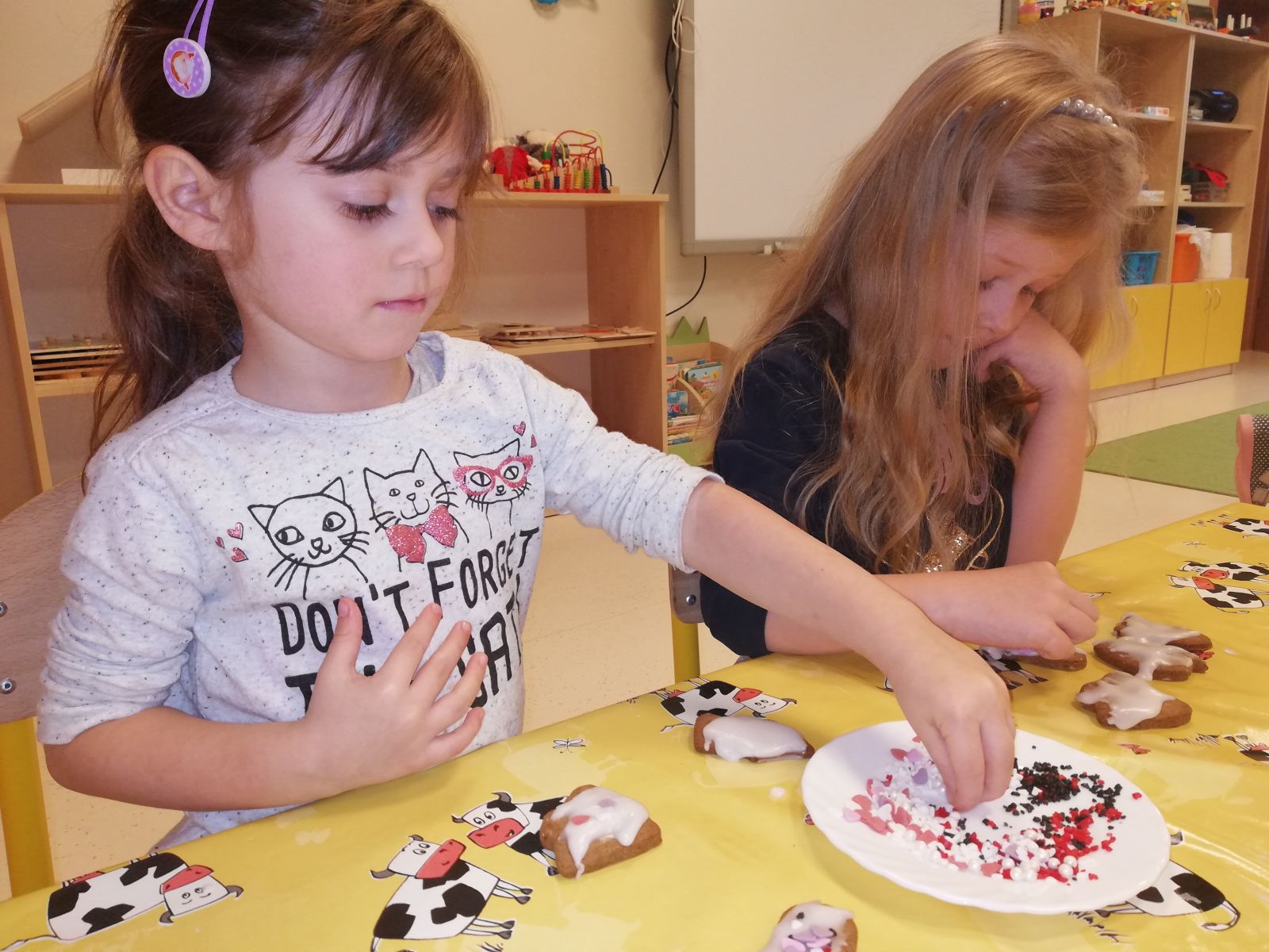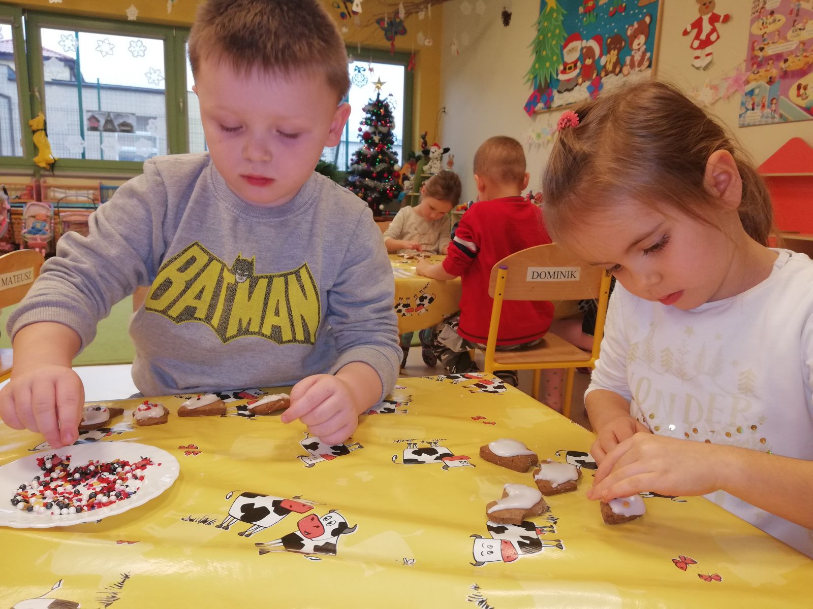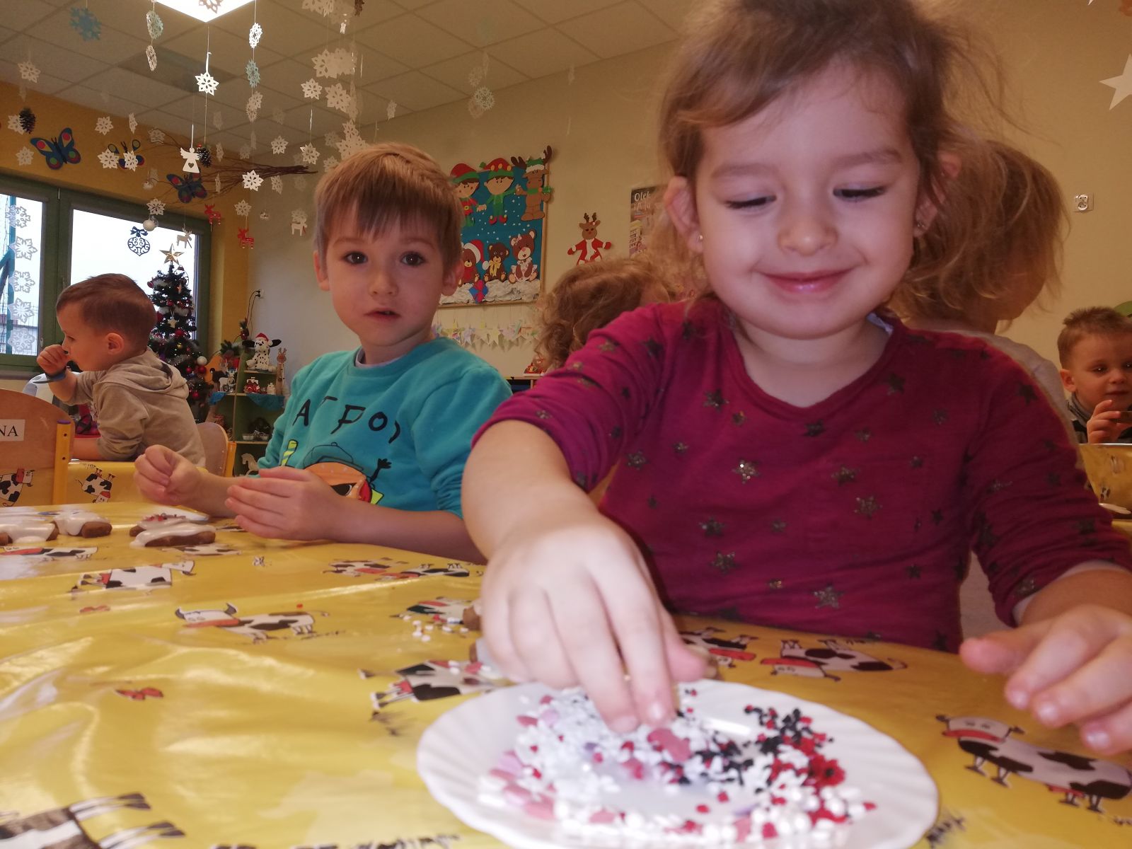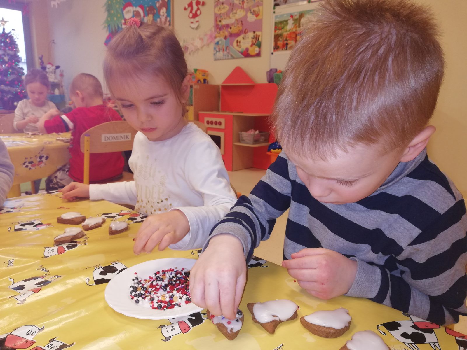 Dnia 11.12.2019r. Motylki ochoczo zabrały się do pieczenia świątecznych pierników. Wyrabiały ciasto, wałkowały i wycinały pierniczki za pomocą foremek. Kolejnego dnia, gdy pierniczki wypiekły się i wystygły zabraliśmy się za ich dekorowanie. To była wspaniała zabawa :) Efekty naszych prac już niebawem ocenią rodzice, którzy na spotkaniu wigilijnym w naszej grupie będą mogli skosztować świątecznych smakołyków.
