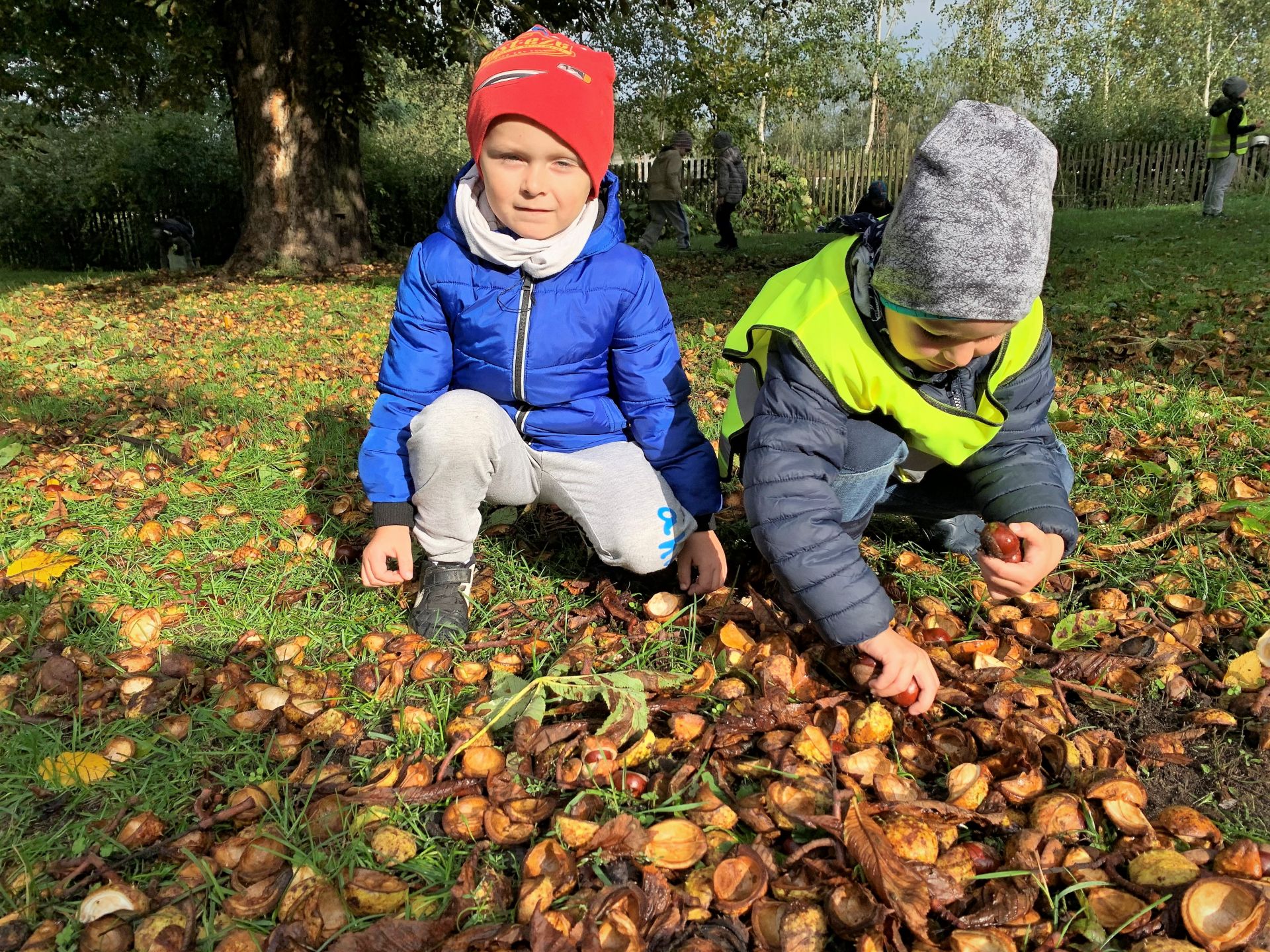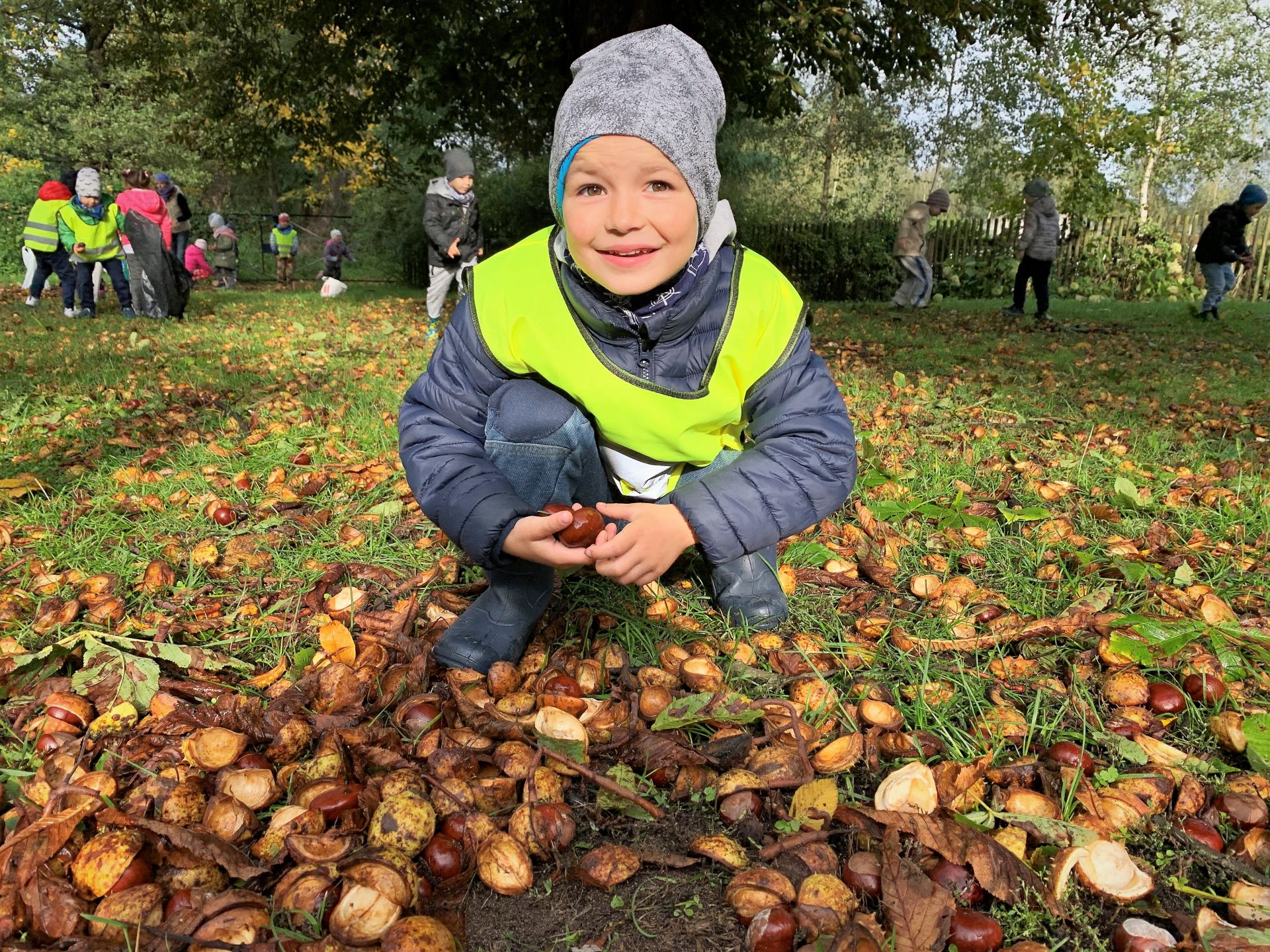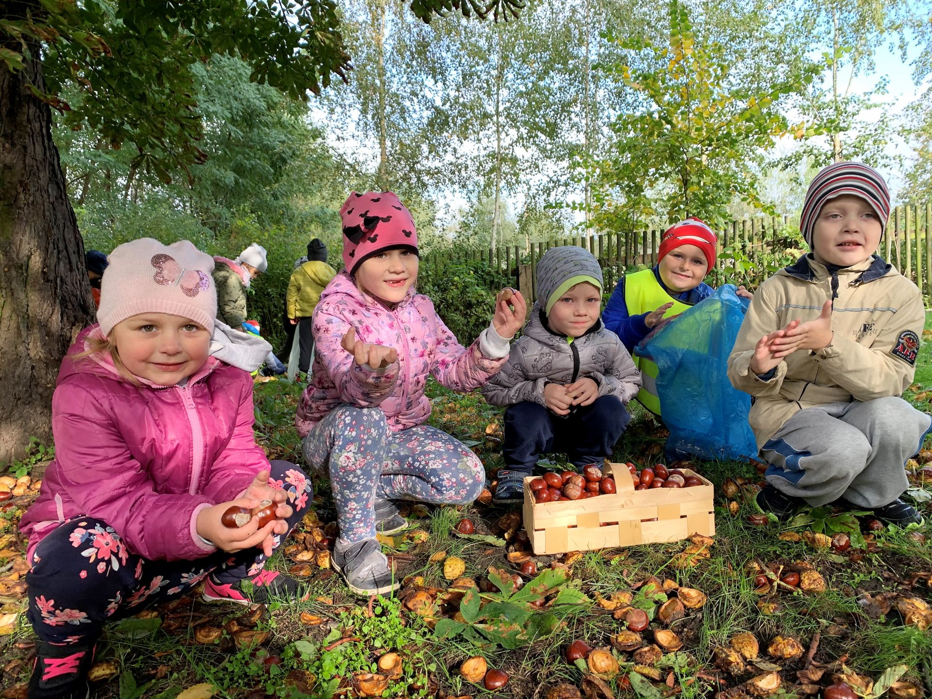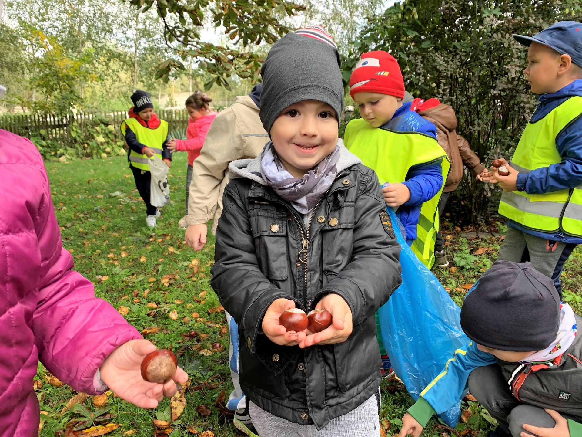 3 października 2019 r. wybraliśmy się na jesienne zbieranie kasztanów. Naszym ulubionym miejscem kasztanobrania jest ogród na terenie stadniny koni "Stajnia" w Małej Nieszawce. Tam, każdego roku zbieramy największe na świecie, błyszczące w słońcu kasztany. Nasza praca okazała się bardzo owocna. Razem z grupą Wiewiórki zebraliśmy 250 kg kasztanów gigantów!