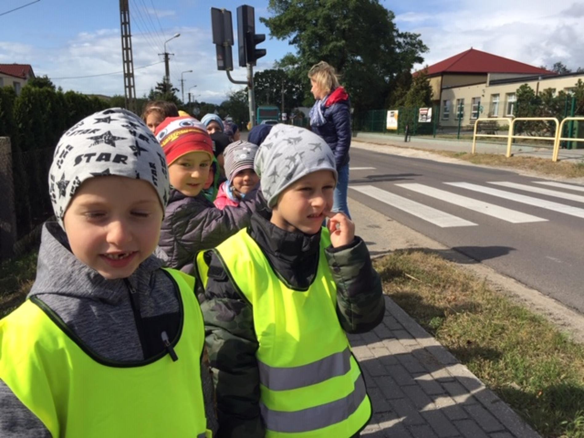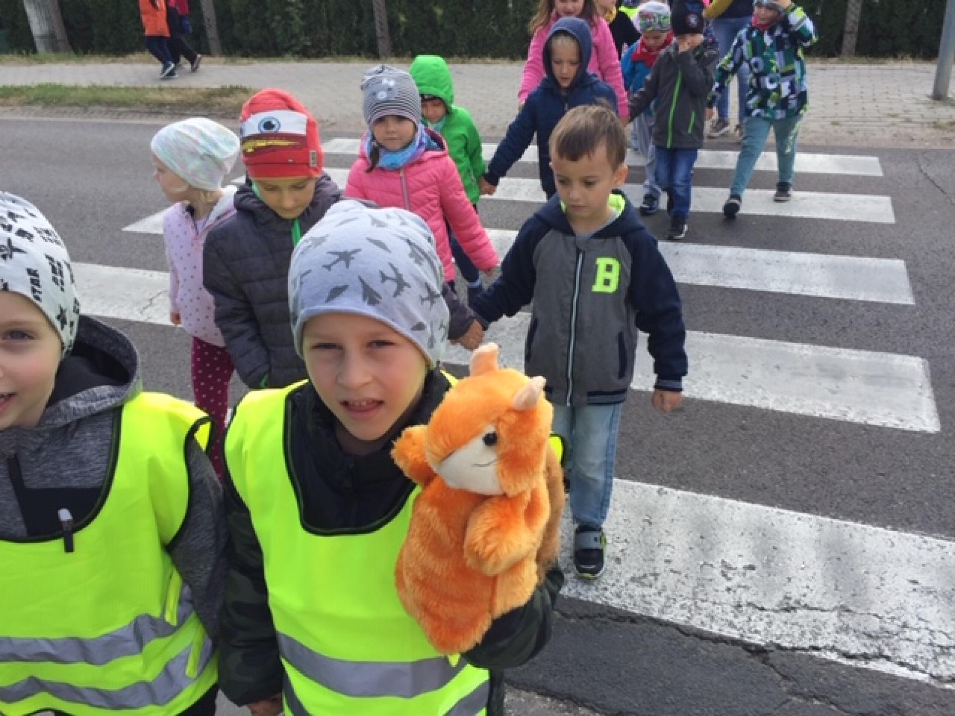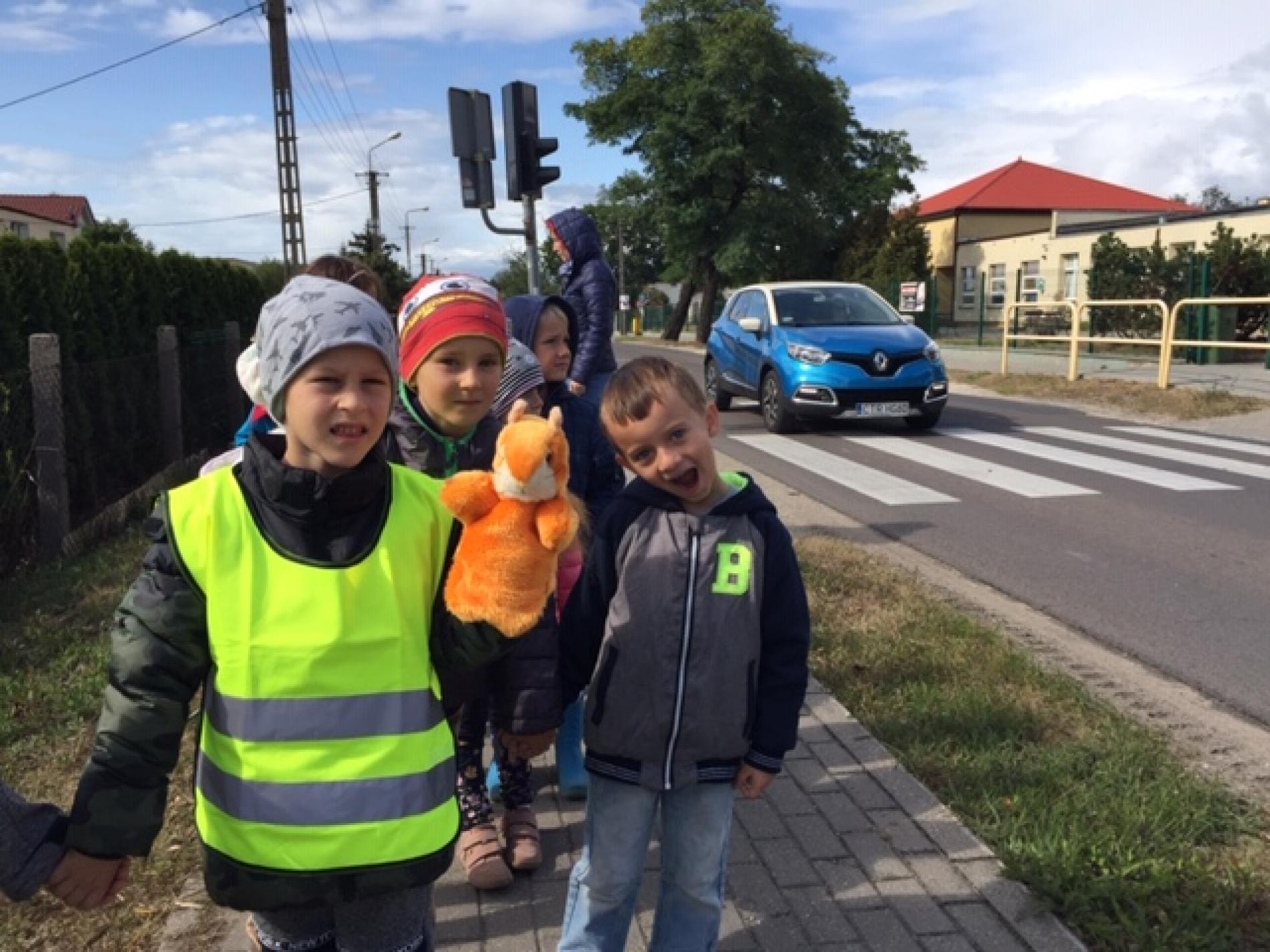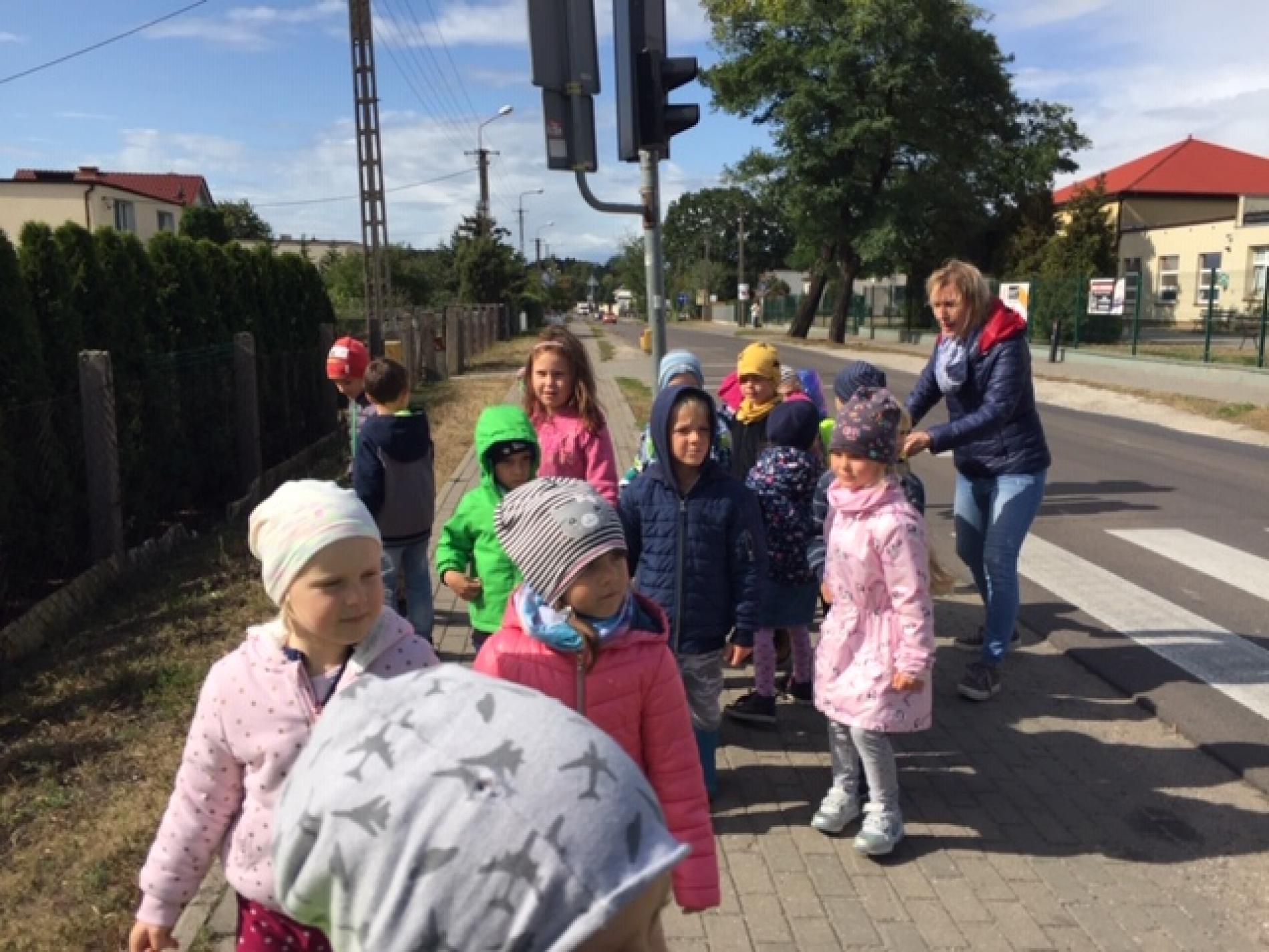 Na pierwszy spacer na przejście dla pieszych zabraliśmy ze sobą Pelagię. Dzieci sprawdzały w praktyce wiedzę zdobytą na zajęciach o ruchu drogowym.