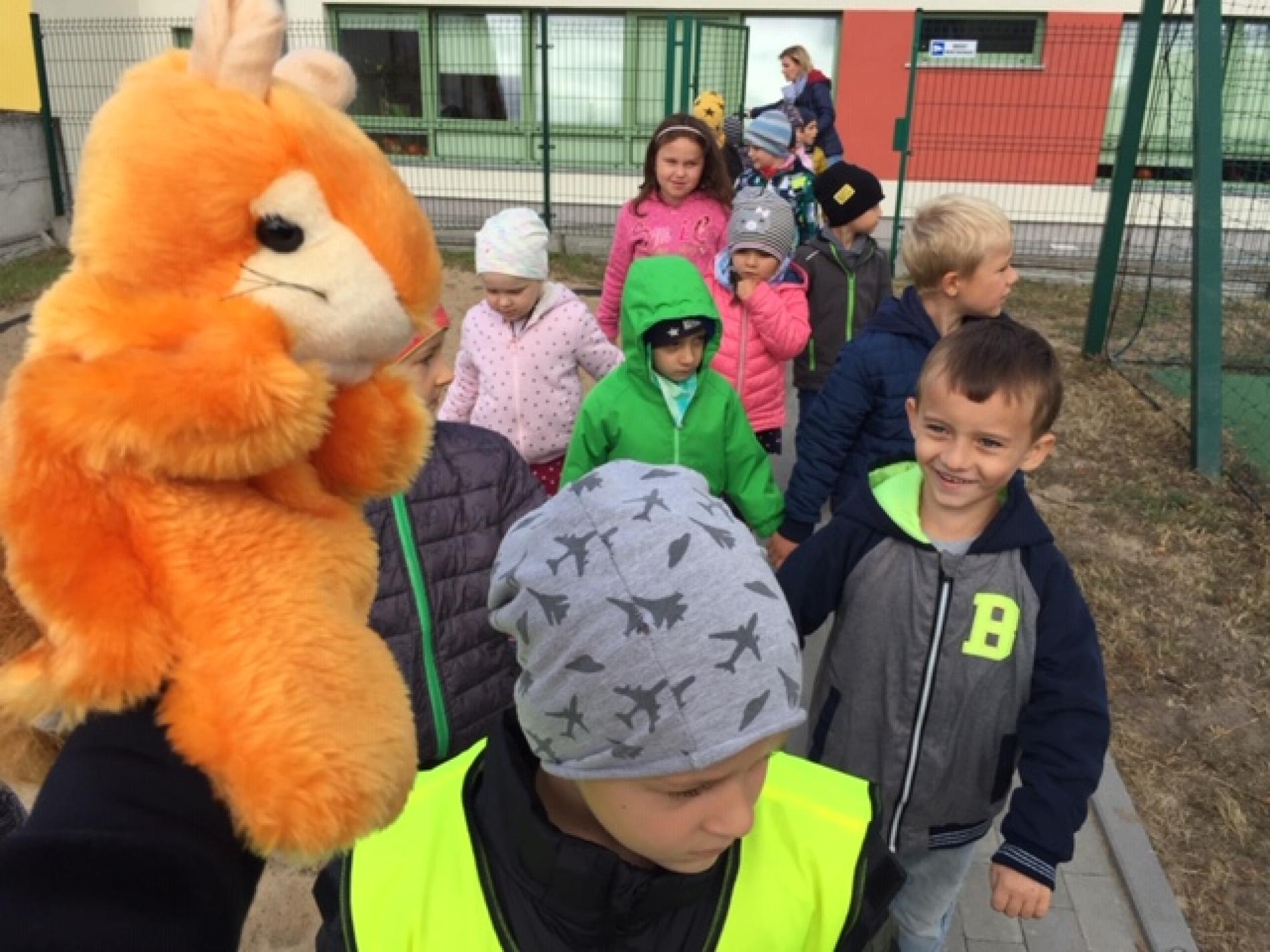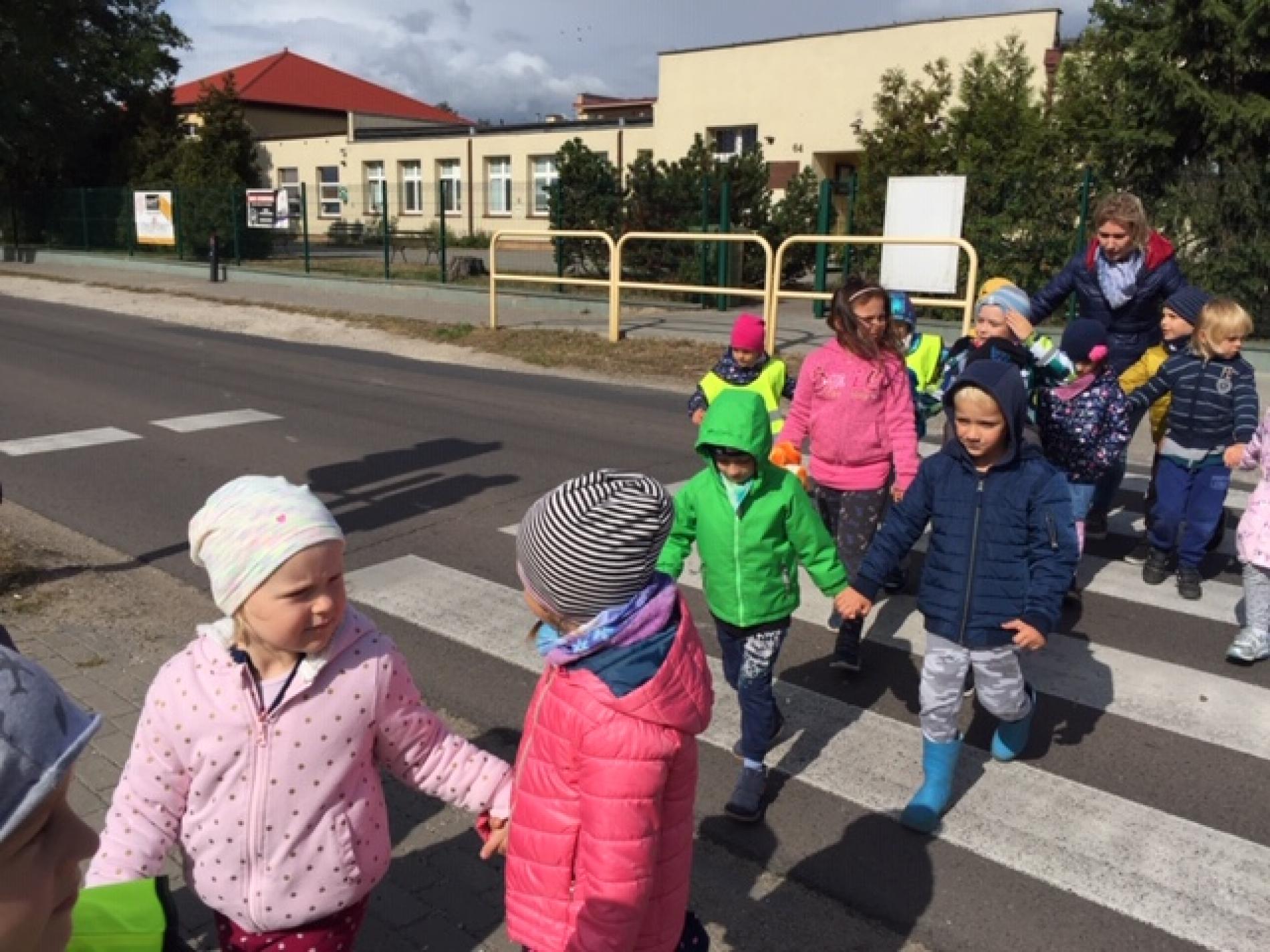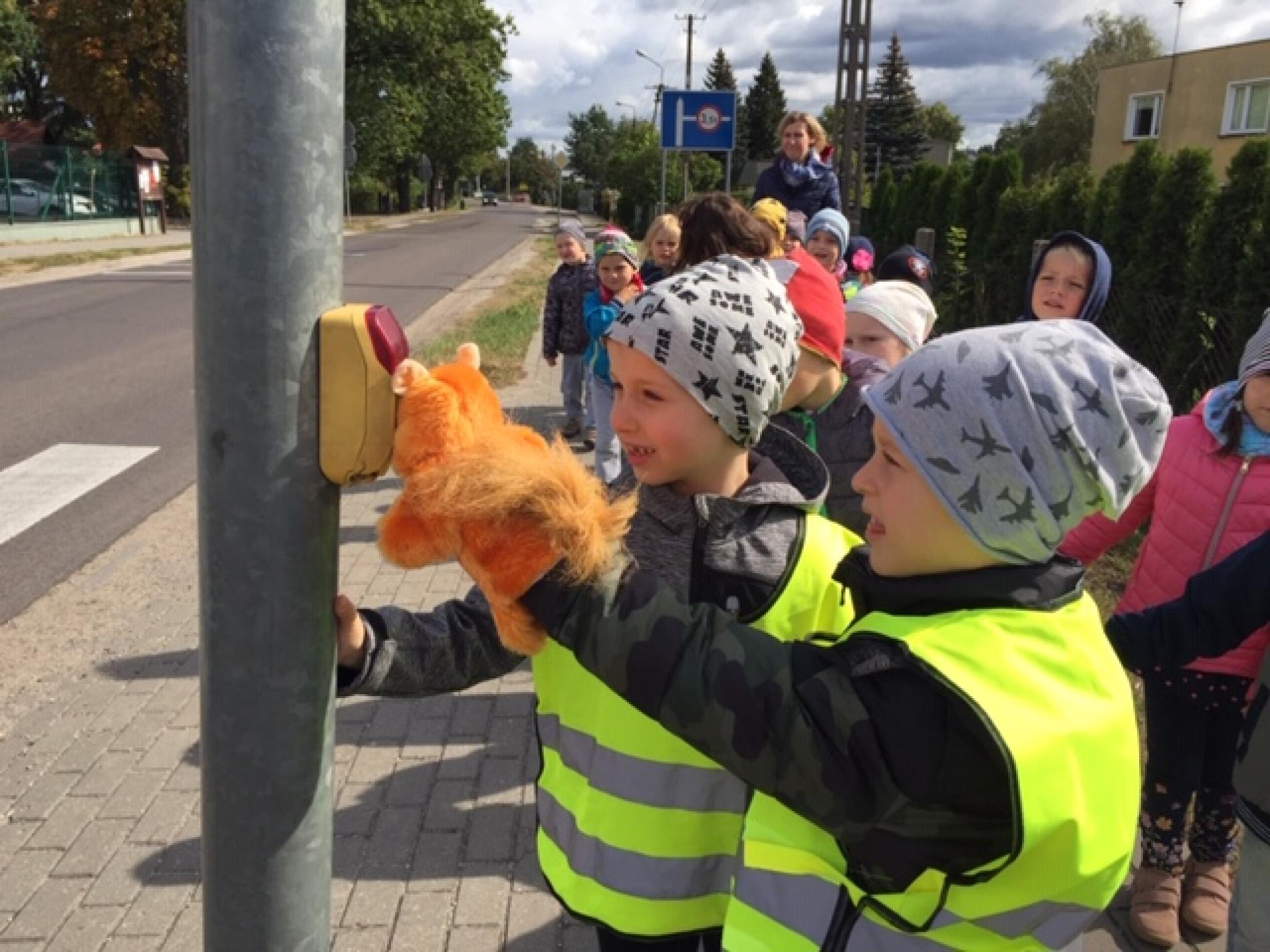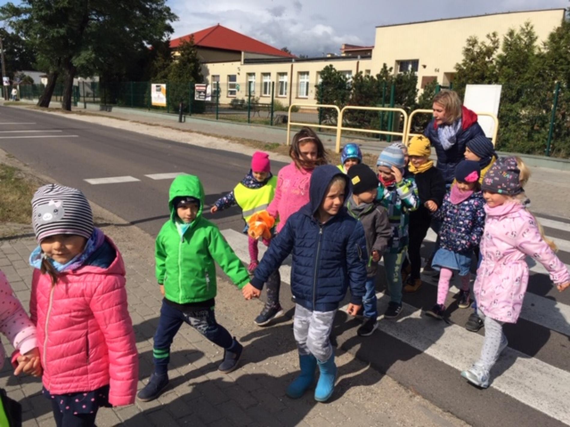 Na pierwszy spacer na przejście dla pieszych zabraliśmy ze sobą Pelagię. Dzieci sprawdzały w praktyce wiedzę zdobytą na zajęciach o ruchu drogowym.