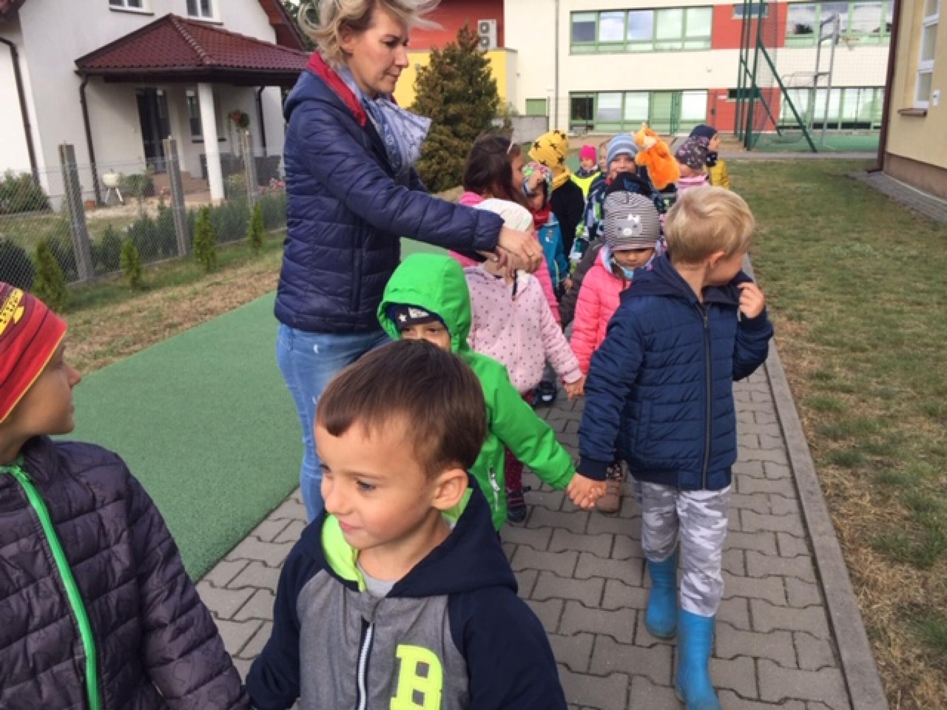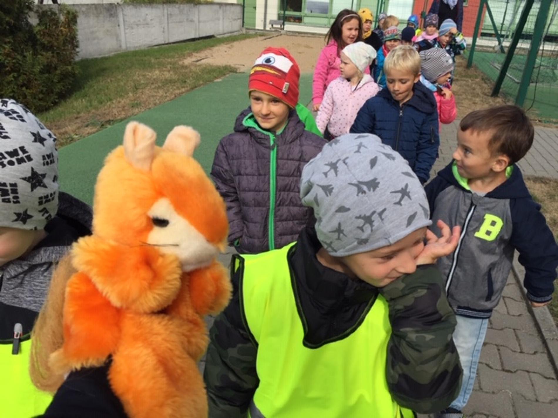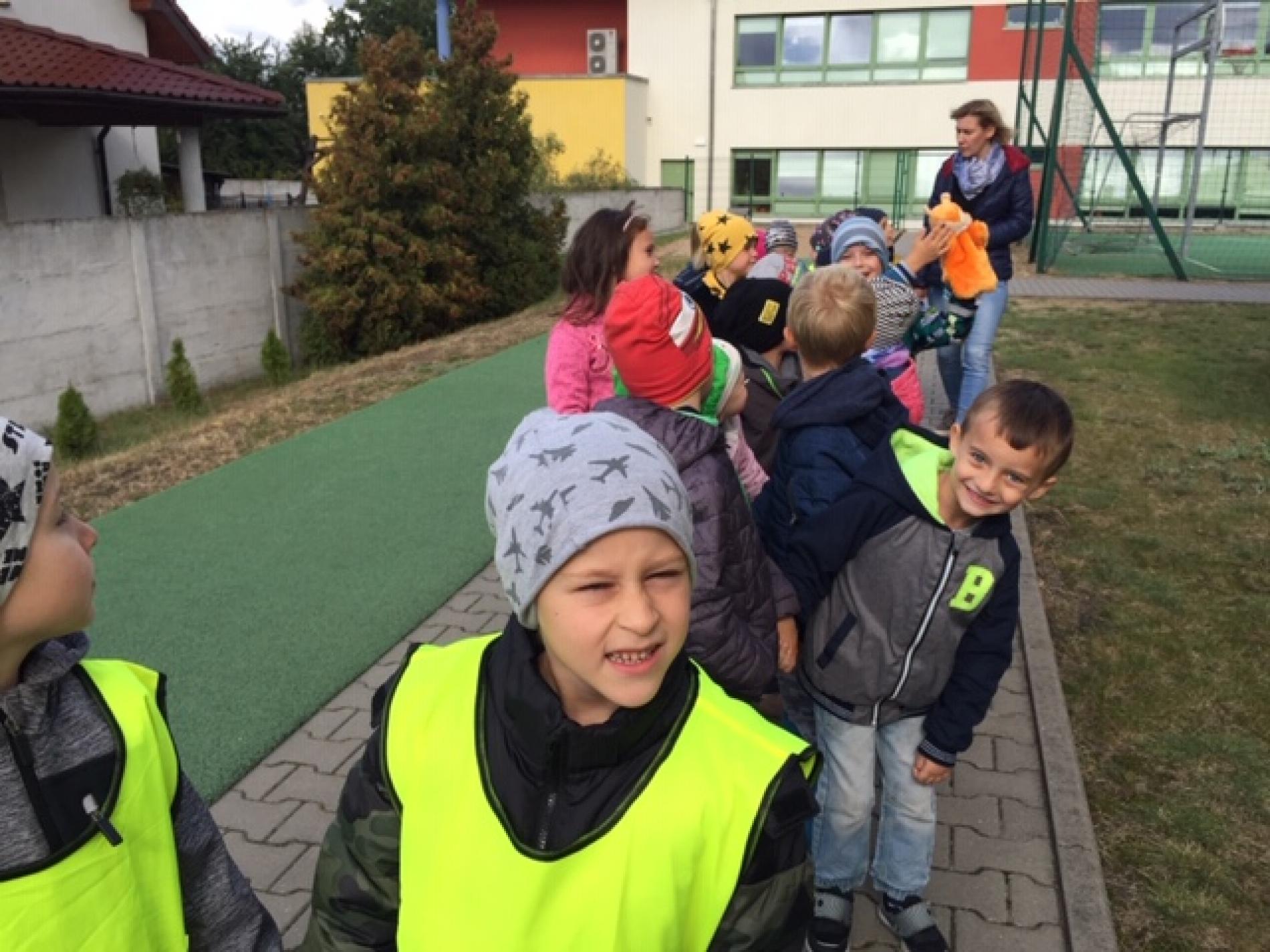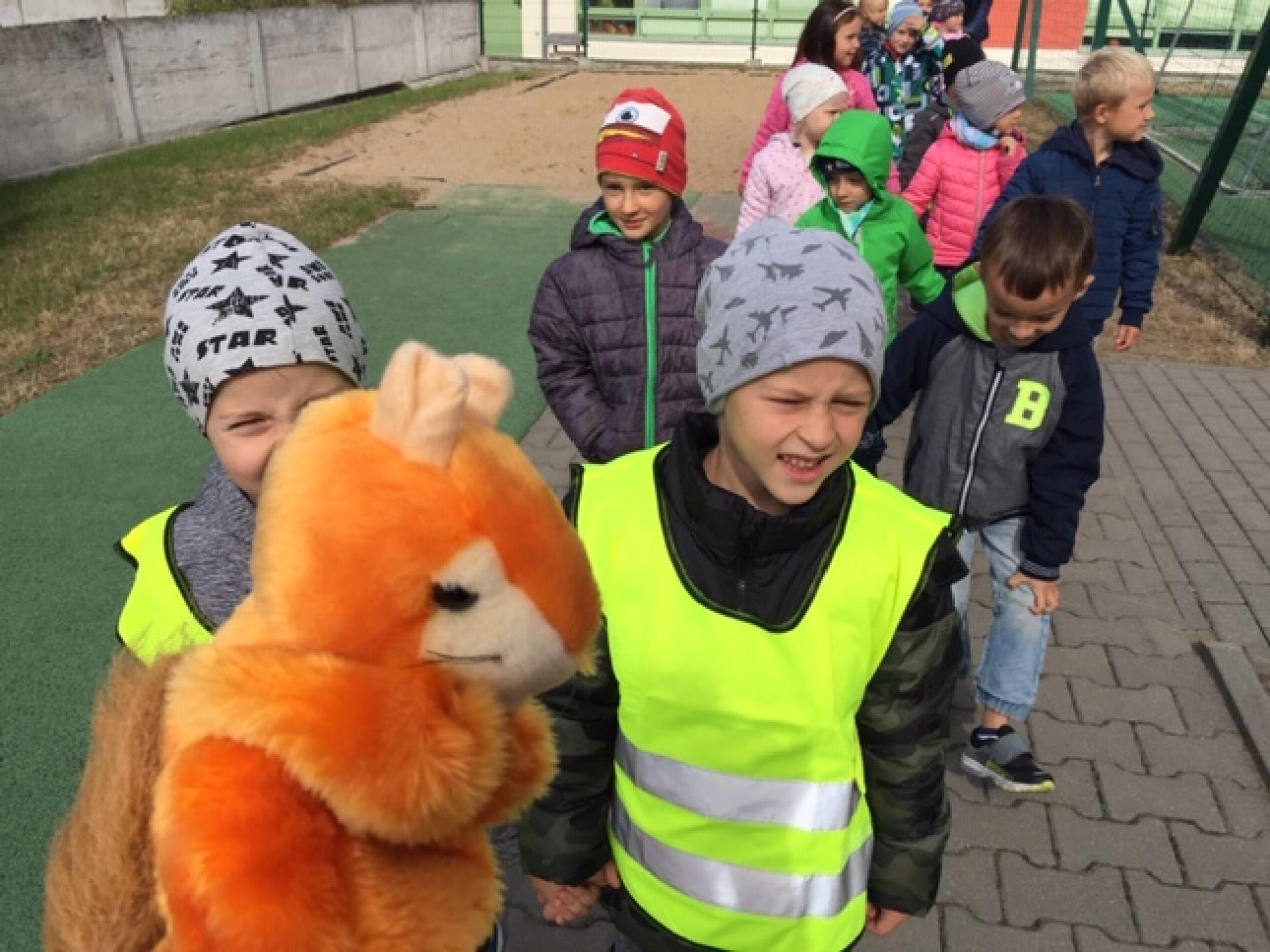 Na pierwszy spacer na przejście dla pieszych zabraliśmy ze sobą Pelagię. Dzieci sprawdzały w praktyce wiedzę zdobytą na zajęciach o ruchu drogowym.