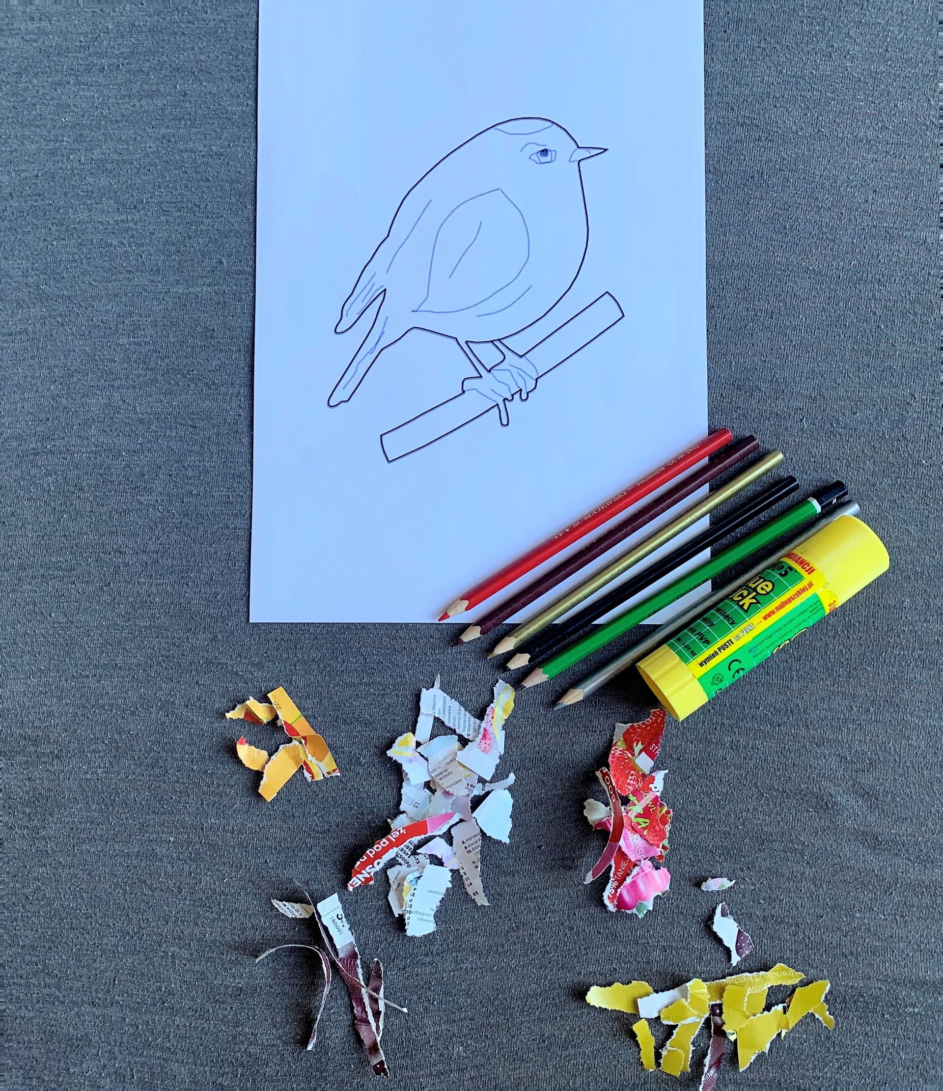 Przygotujcie: kartkę papieru, kredki, klej, kawałki gazet.