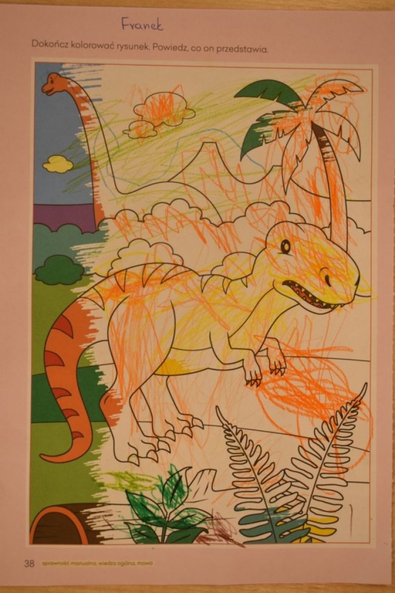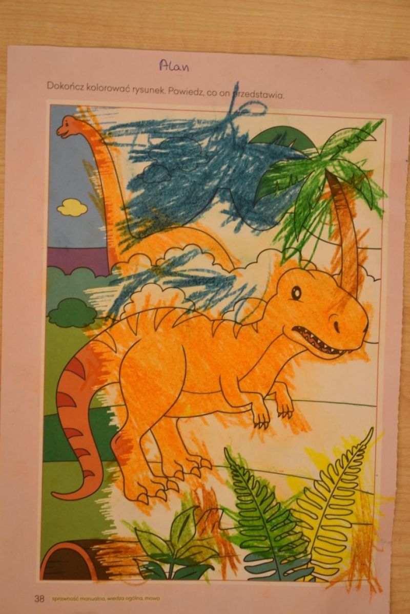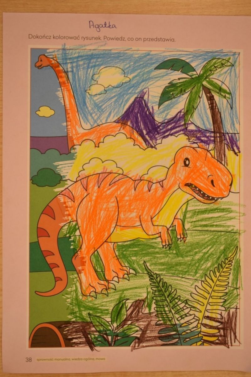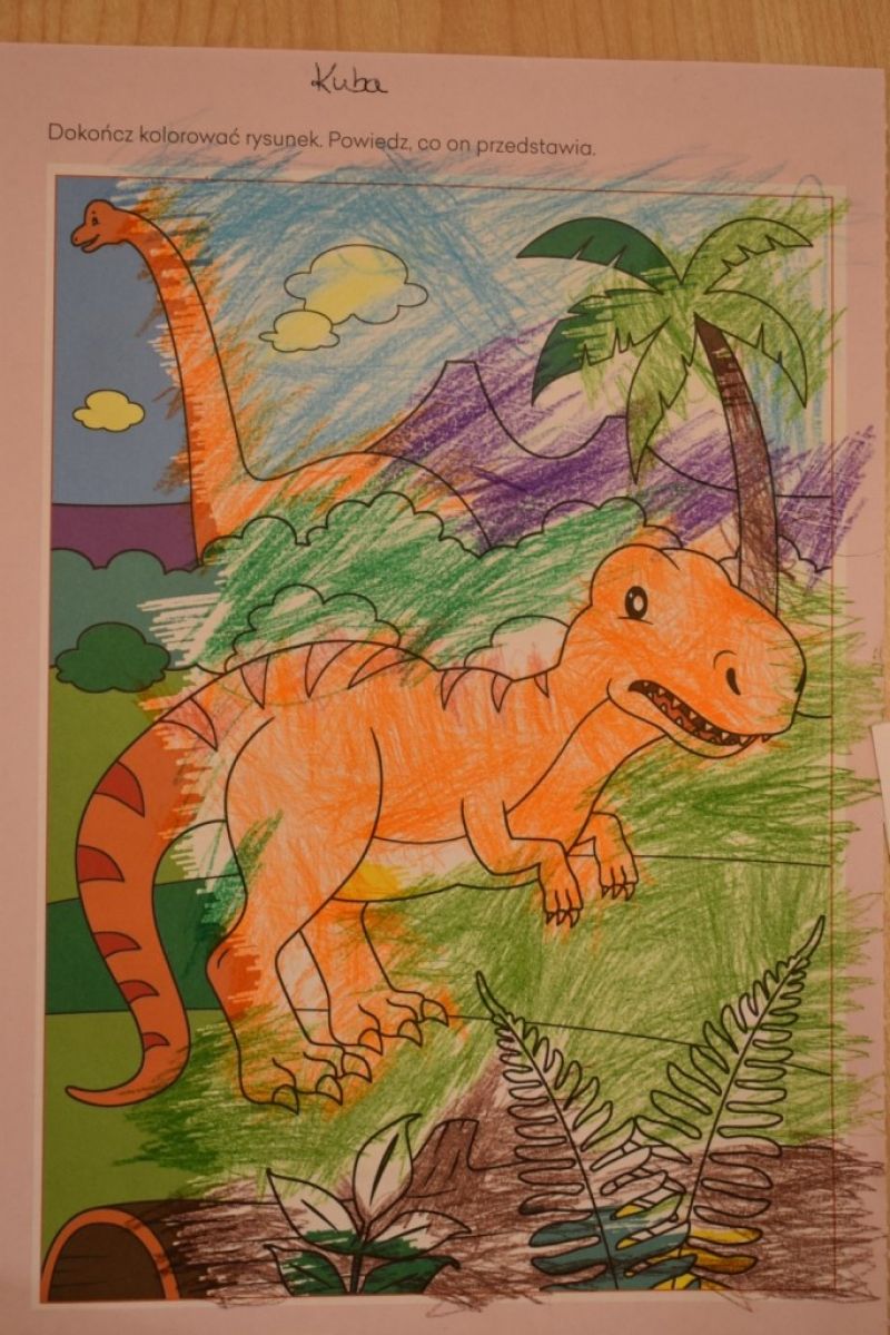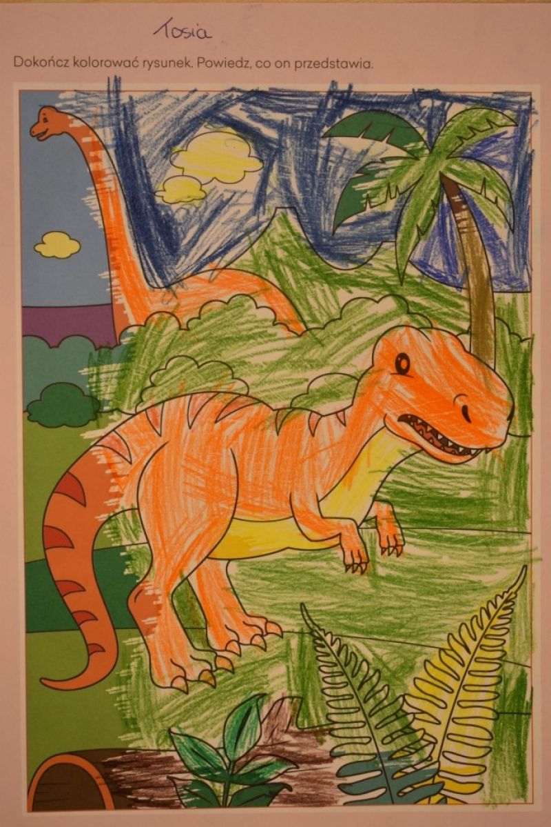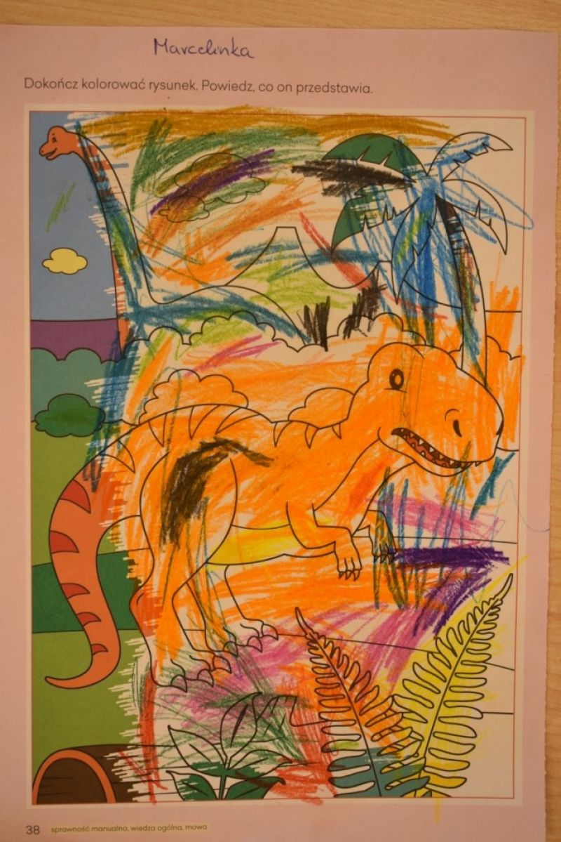 Dzisiaj wykonaliśmy piękne prace "Nasze dinozaury", utrwaliliśmy kolory i uczyliśmy się prawidłowo trzymać kredkę. Podczas wykonania prac śpiewaliśmy nową piosenkę "Smoko Loko".