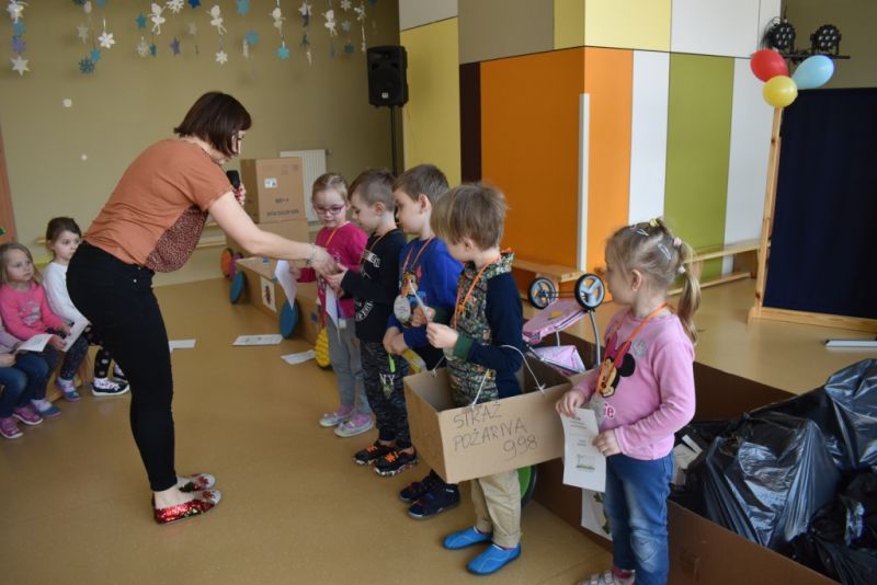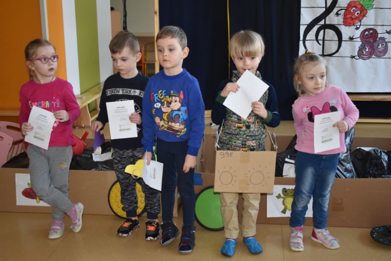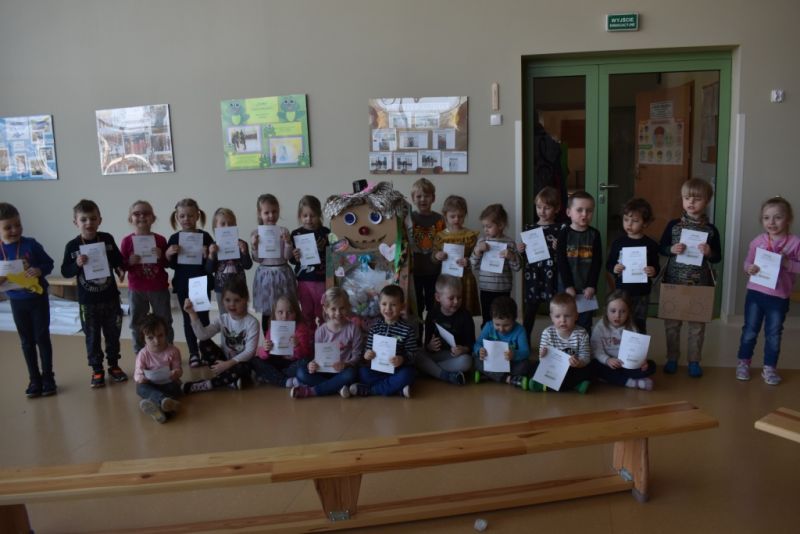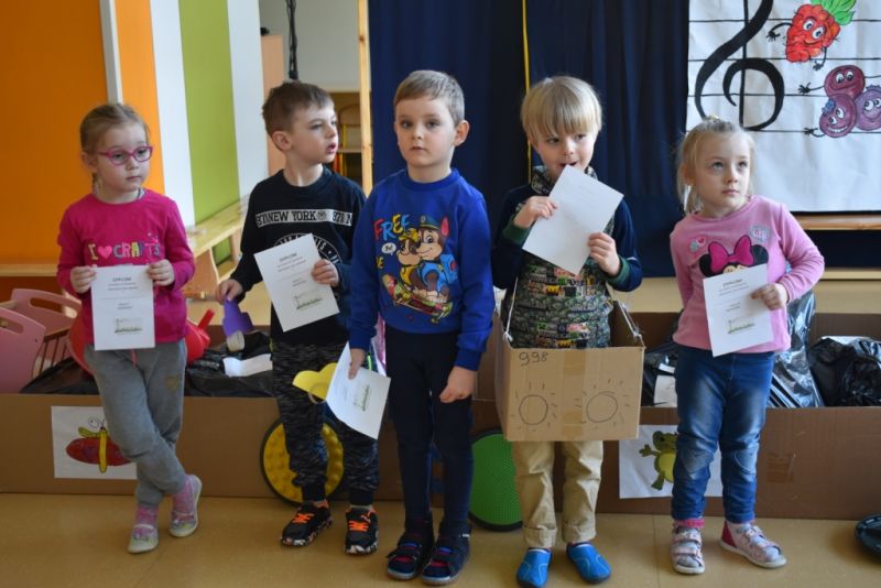 Dzisiaj zakończyliśmy trwający dwa tygodnie projekt "Przedszkole bez zabawek". Dwa tygodnie tworzyliśmy wspólnie z paniami zabawki z odpadów. Powstały piękne dzieła, a dzieci wykazały się dużą kreatywnością. Na zakończenie wszystkie dzieci otrzymały dyplomy, a najbardziej kreatywne osoby (w naszej grupie Antoś K., Gabryś, Gabrysia, Olivia oraz Kajtek) otrzymały medale.