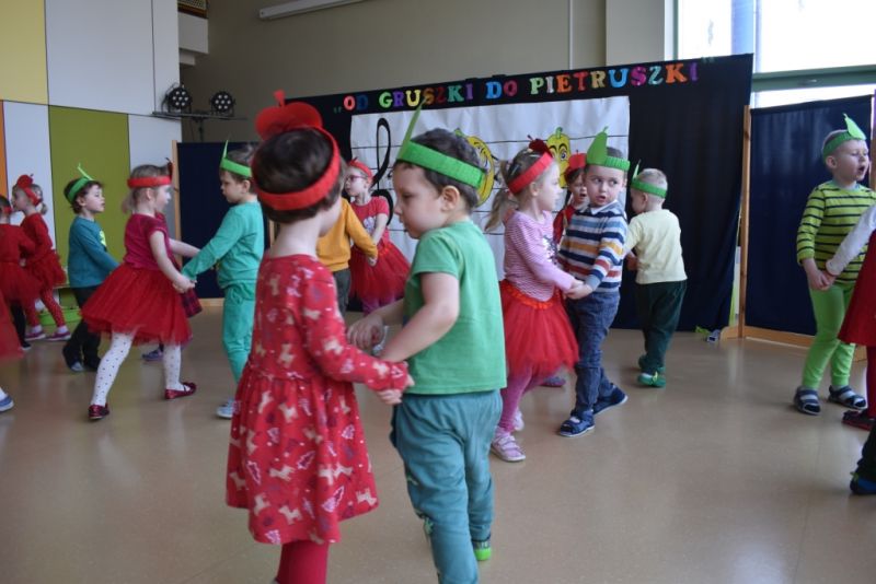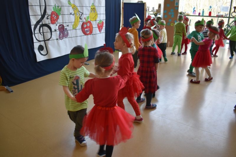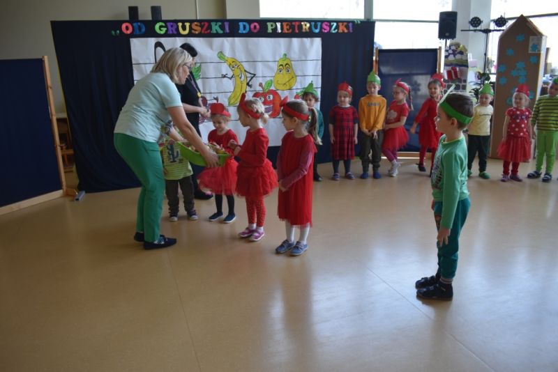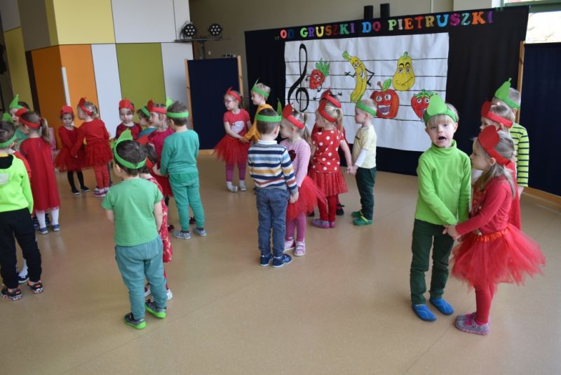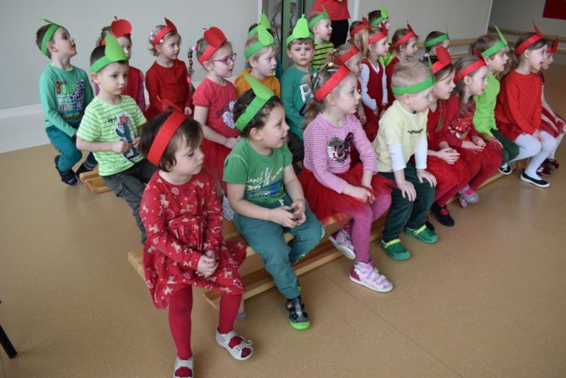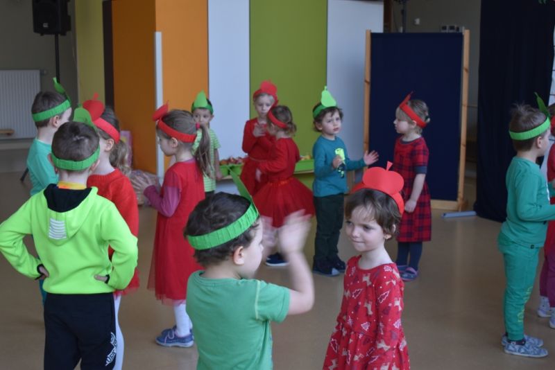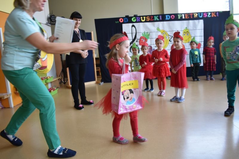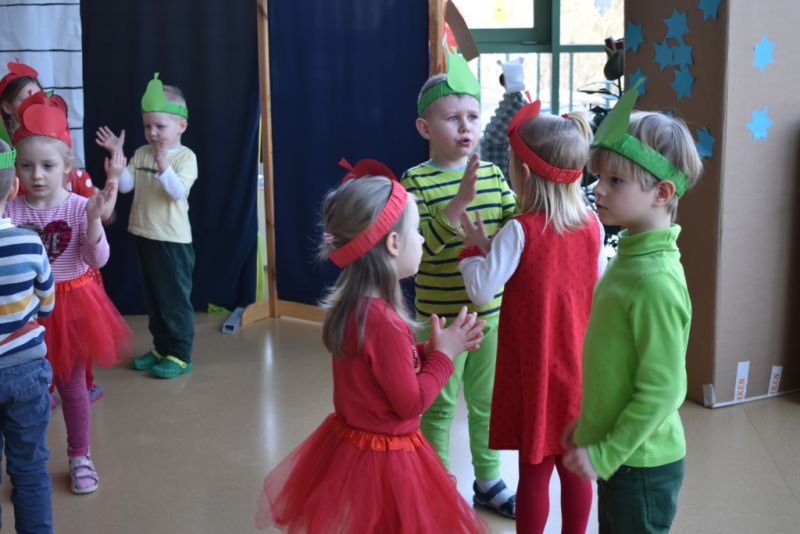 Dzisiaj w naszym przedszkolu odbył się Przedszkolny Przegląd Piosenki "Od gruszki do pietruszki". Dzieci z naszej grupy zaprezentowały w piękny sposób piosenkę "Małe, czerwone jabłuszko". Zostały nagrodzone przez publiczność wielkimi brawami. Otrzymaliśmy dyplom, medal oraz pyszne jabłuszka za udział w przeglądzie.