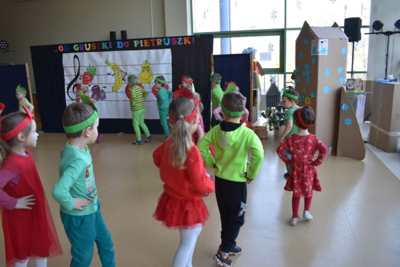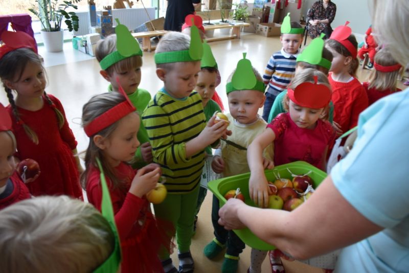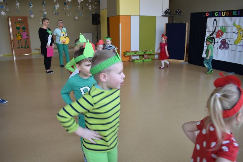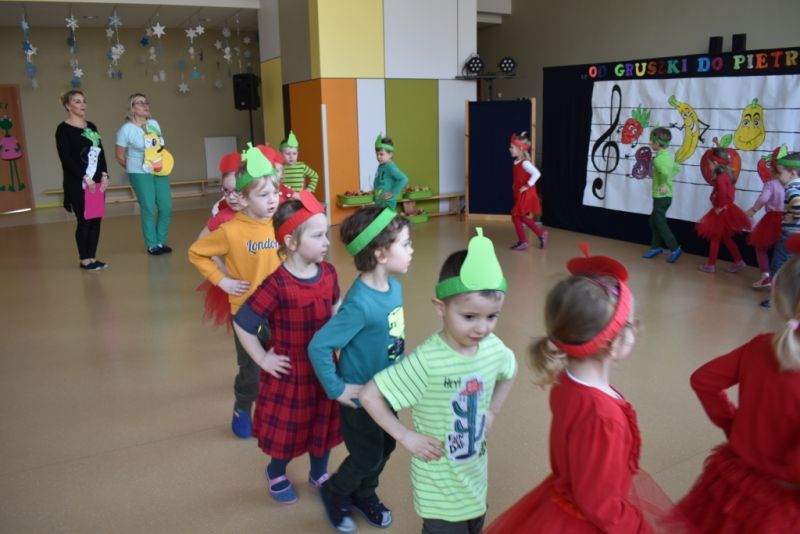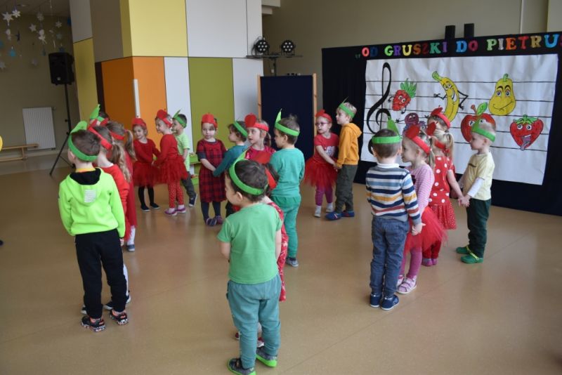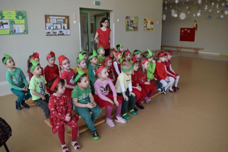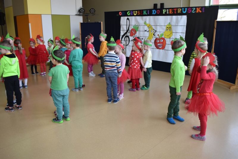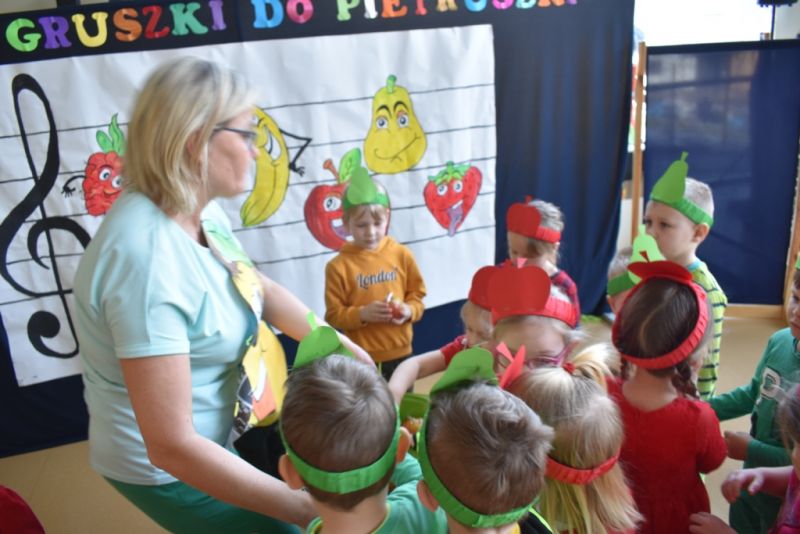 Dzisiaj w naszym przedszkolu odbył się Przedszkolny Przegląd Piosenki "Od gruszki do pietruszki". Dzieci z naszej grupy zaprezentowały w piękny sposób piosenkę "Małe, czerwone jabłuszko". Zostały nagrodzone przez publiczność wielkimi brawami. Otrzymaliśmy dyplom, medal oraz pyszne jabłuszka za udział w przeglądzie.