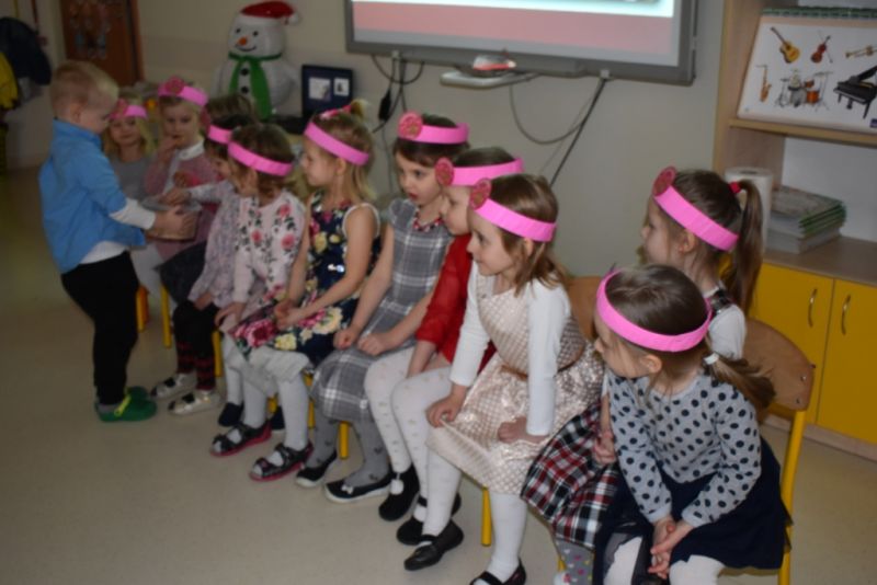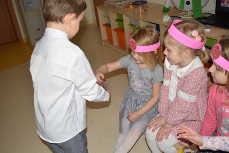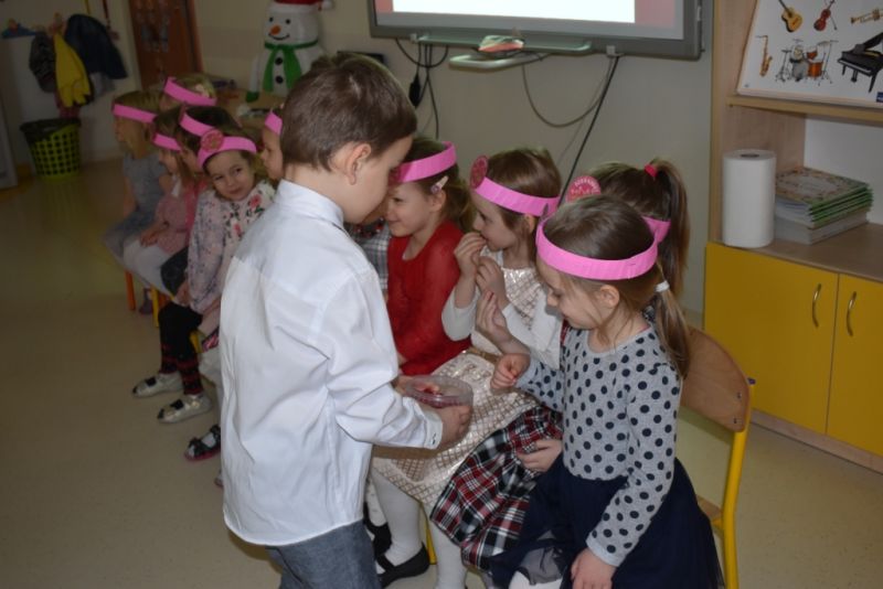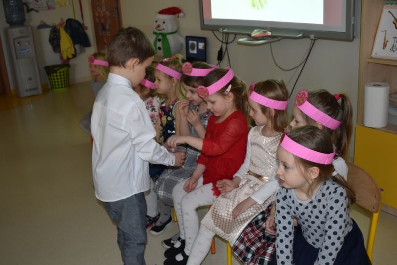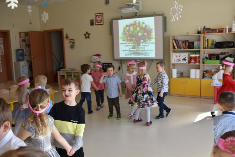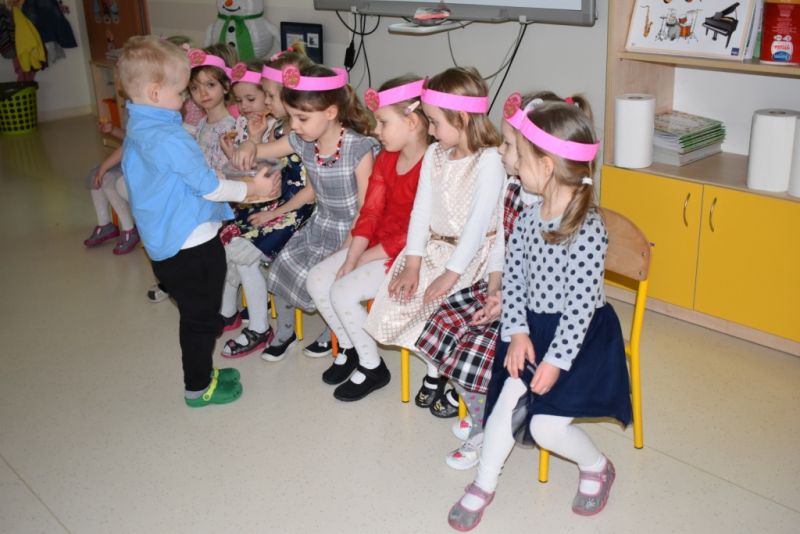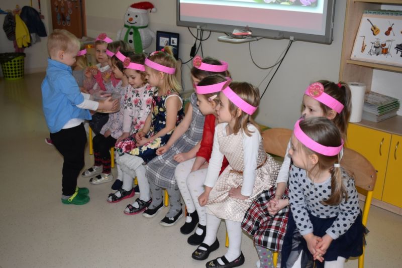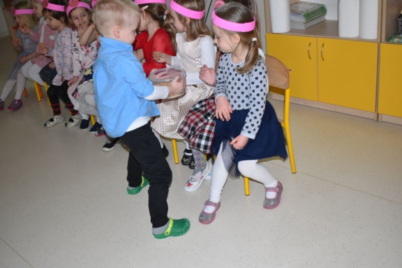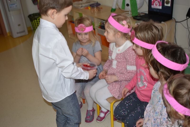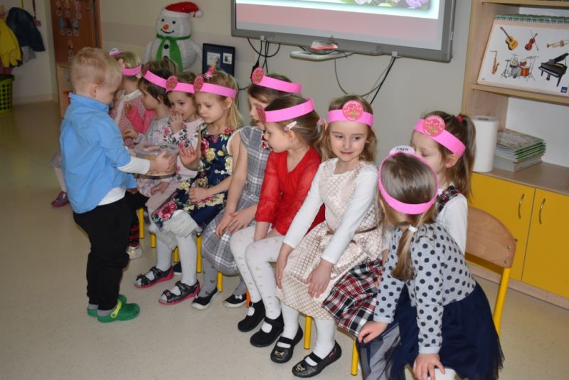 Dzisiaj w naszej grupie świętowaliśmy Dzień Kobiet. Chłopcy zaśpiewali dziewczykom sto lat, złożyli życzenia, wręczyli upominki, a na koniec odbyła się wspólna zabawa taneczna. Do domu prezenty zabrały dziewczynki oraz duże piłki chłopcy. Nasi "mali mężczyźni" wręczyli wszystkim paniom w przedszkolu pyszne czekoladki i złożyli życzenia.