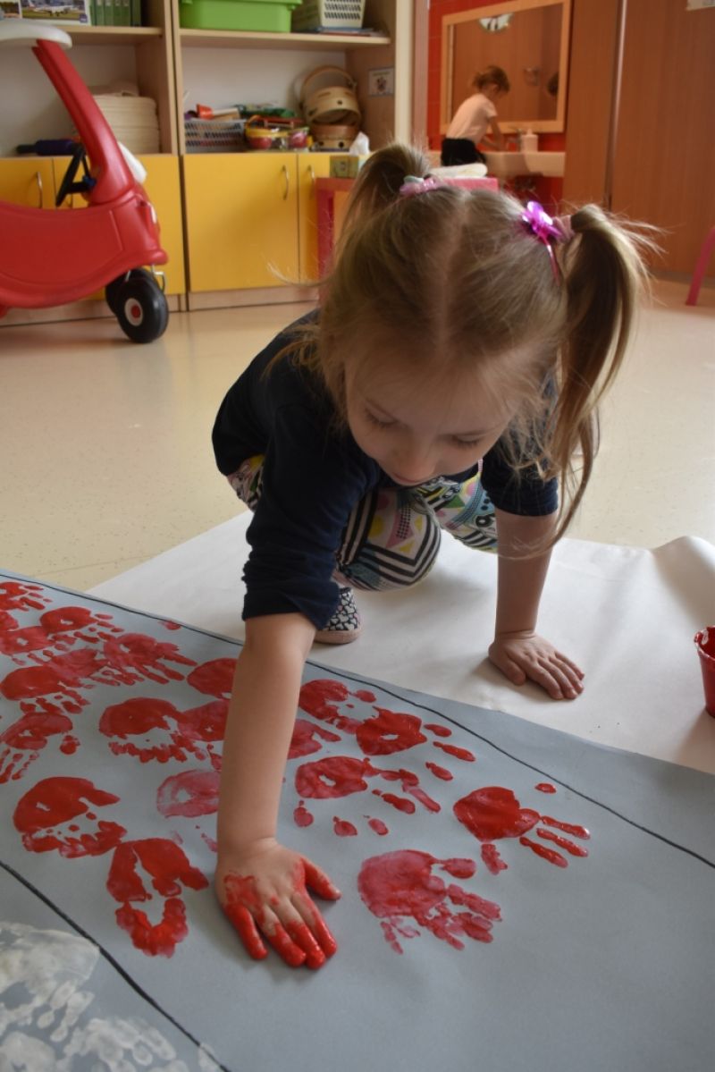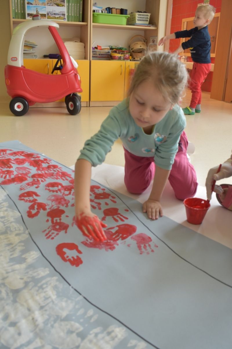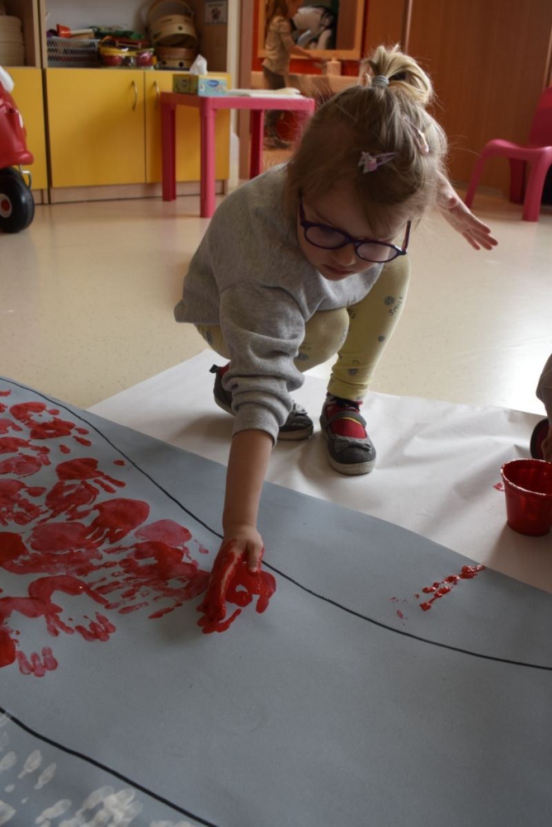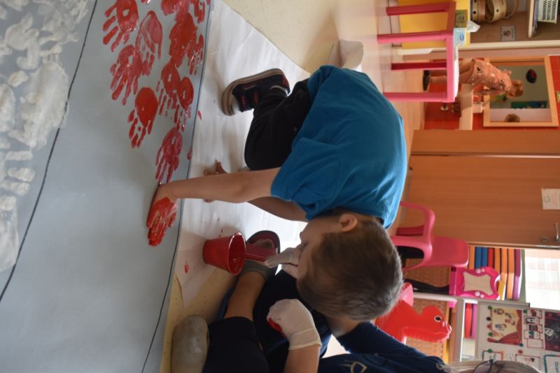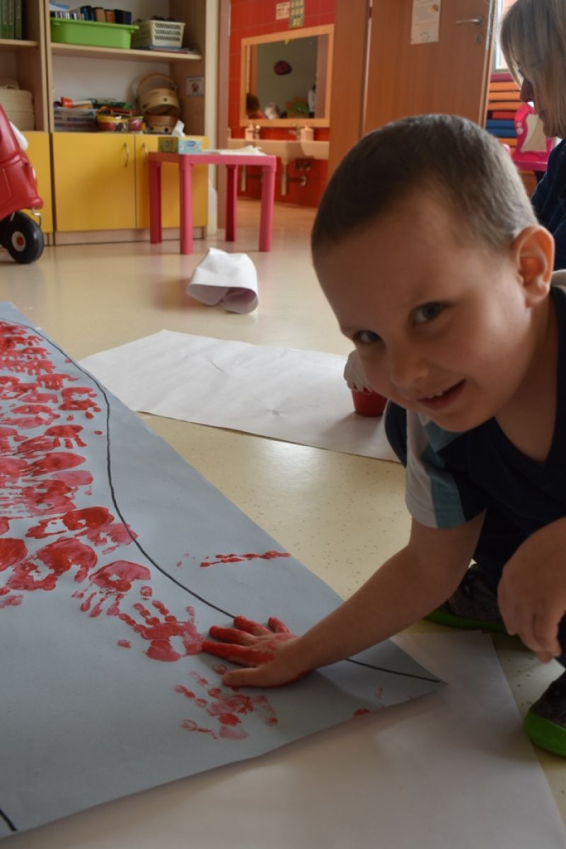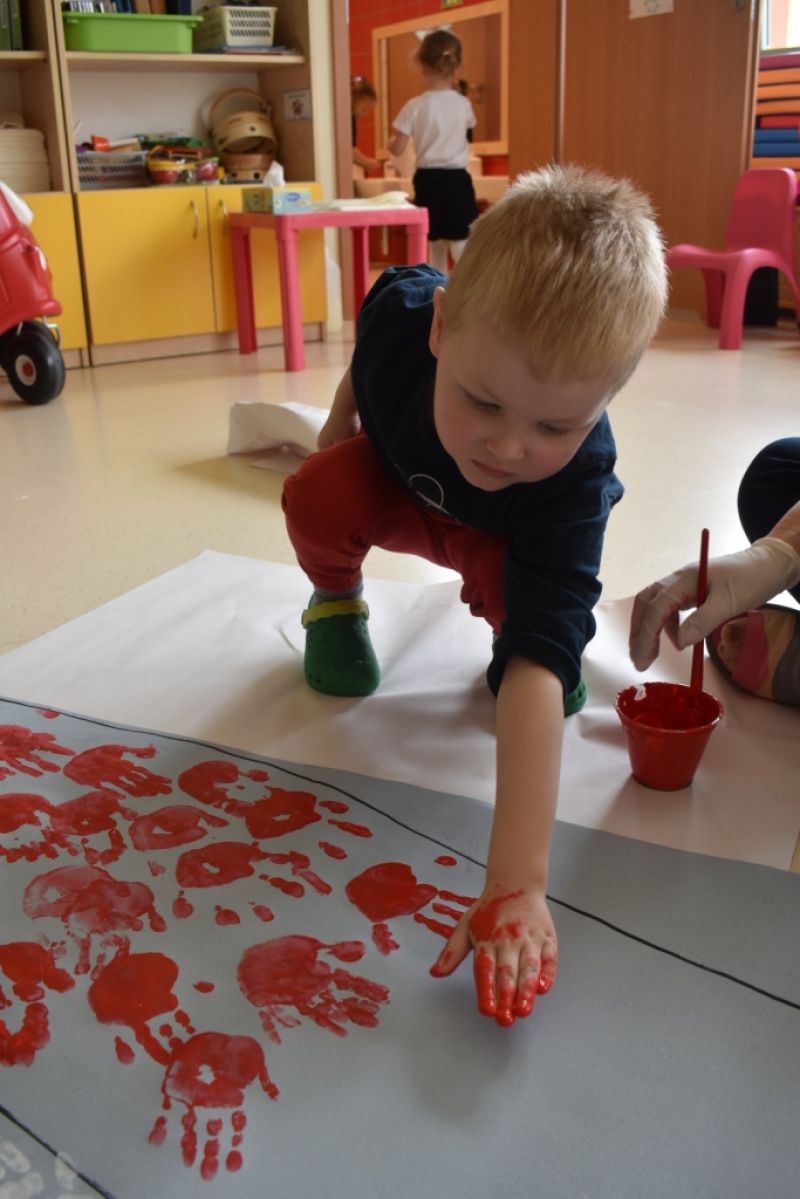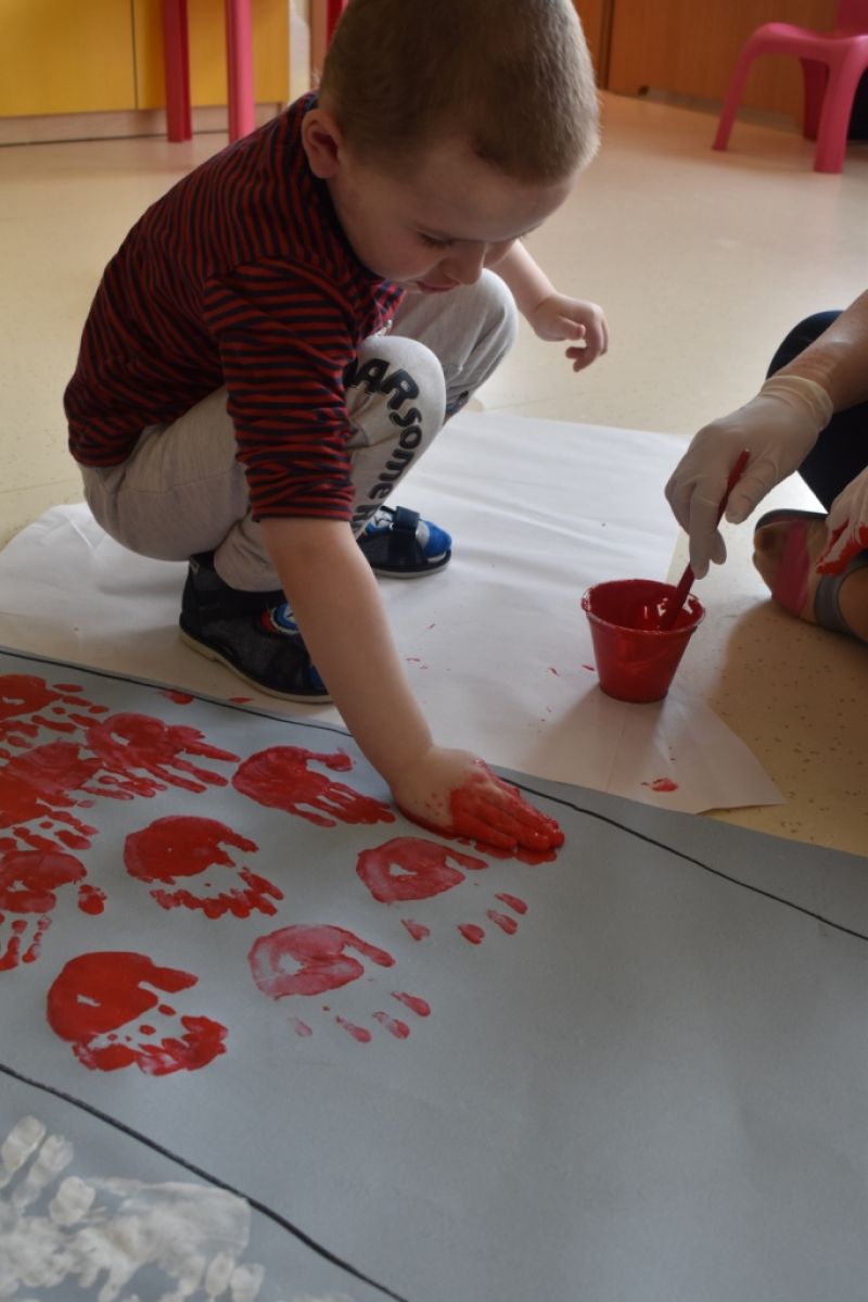 Dzisiaj wykonaliśmy pracę grupową na dużym arkuszu papieru- flagę Polski. Do pracy wykorzystaliśmy farby w kolorze biało- czerwonym oraz nasze czarodziejskie rączki.