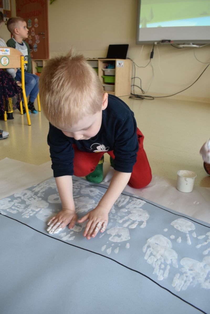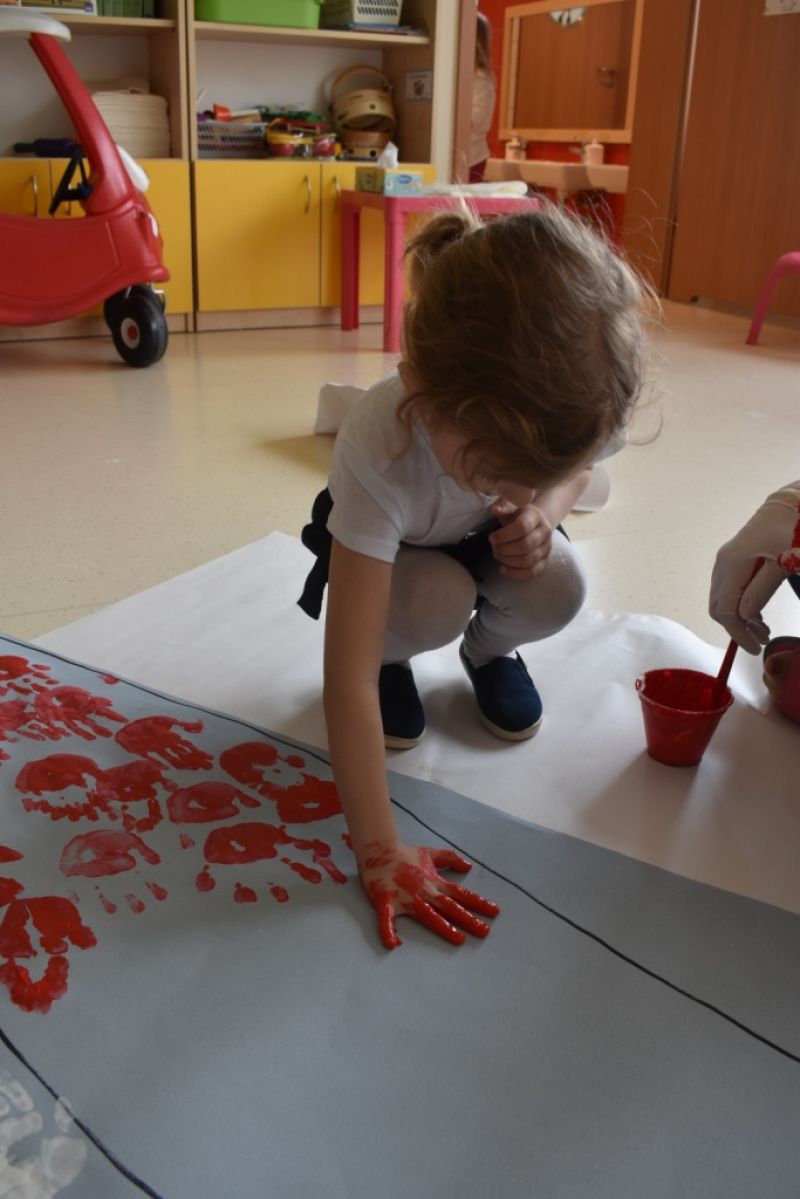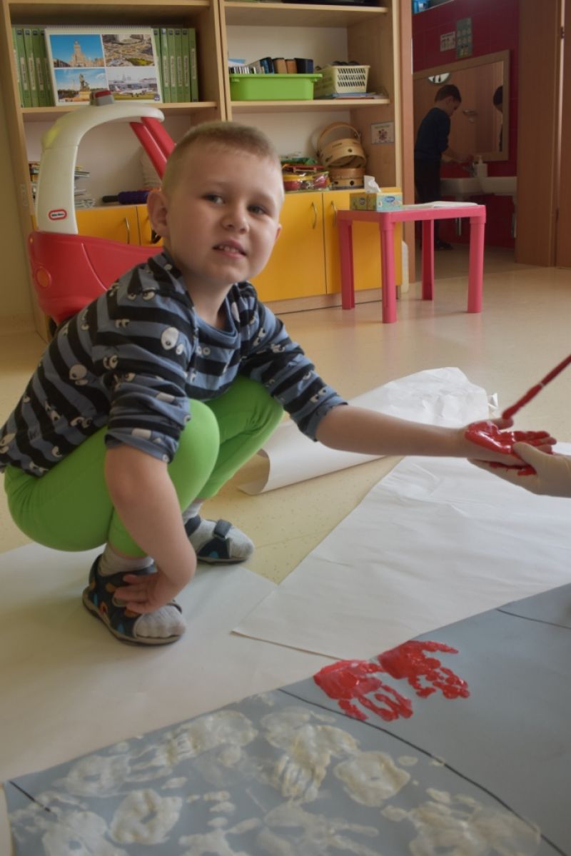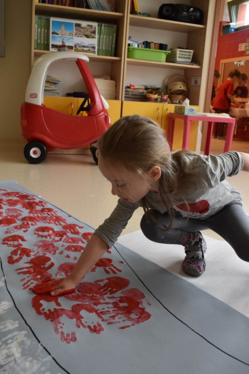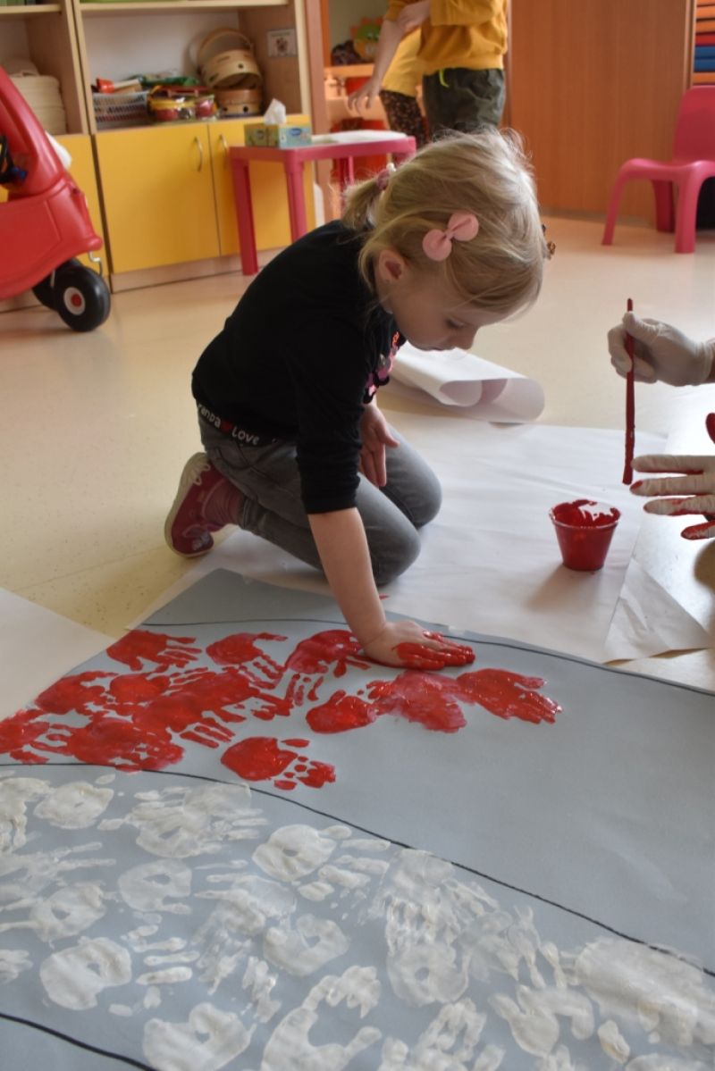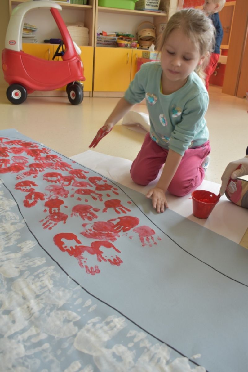Dzisiaj wykonaliśmy pracę grupową na dużym arkuszu papieru- flagę Polski. Do pracy wykorzystaliśmy farby w kolorze biało- czerwonym oraz nasze czarodziejskie rączki.