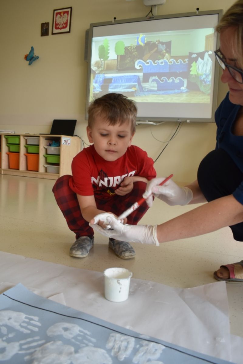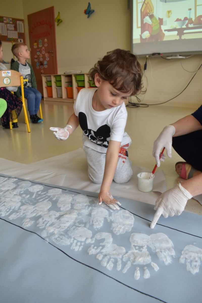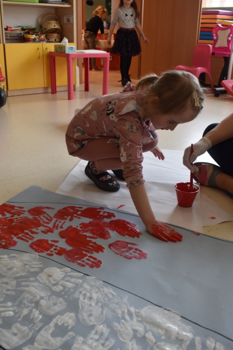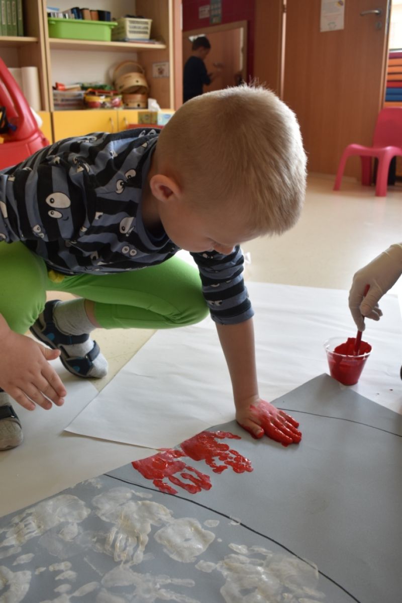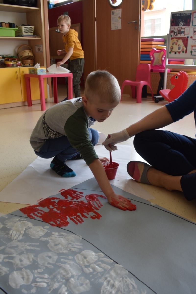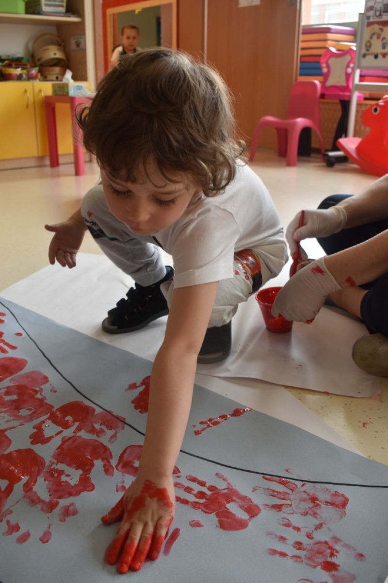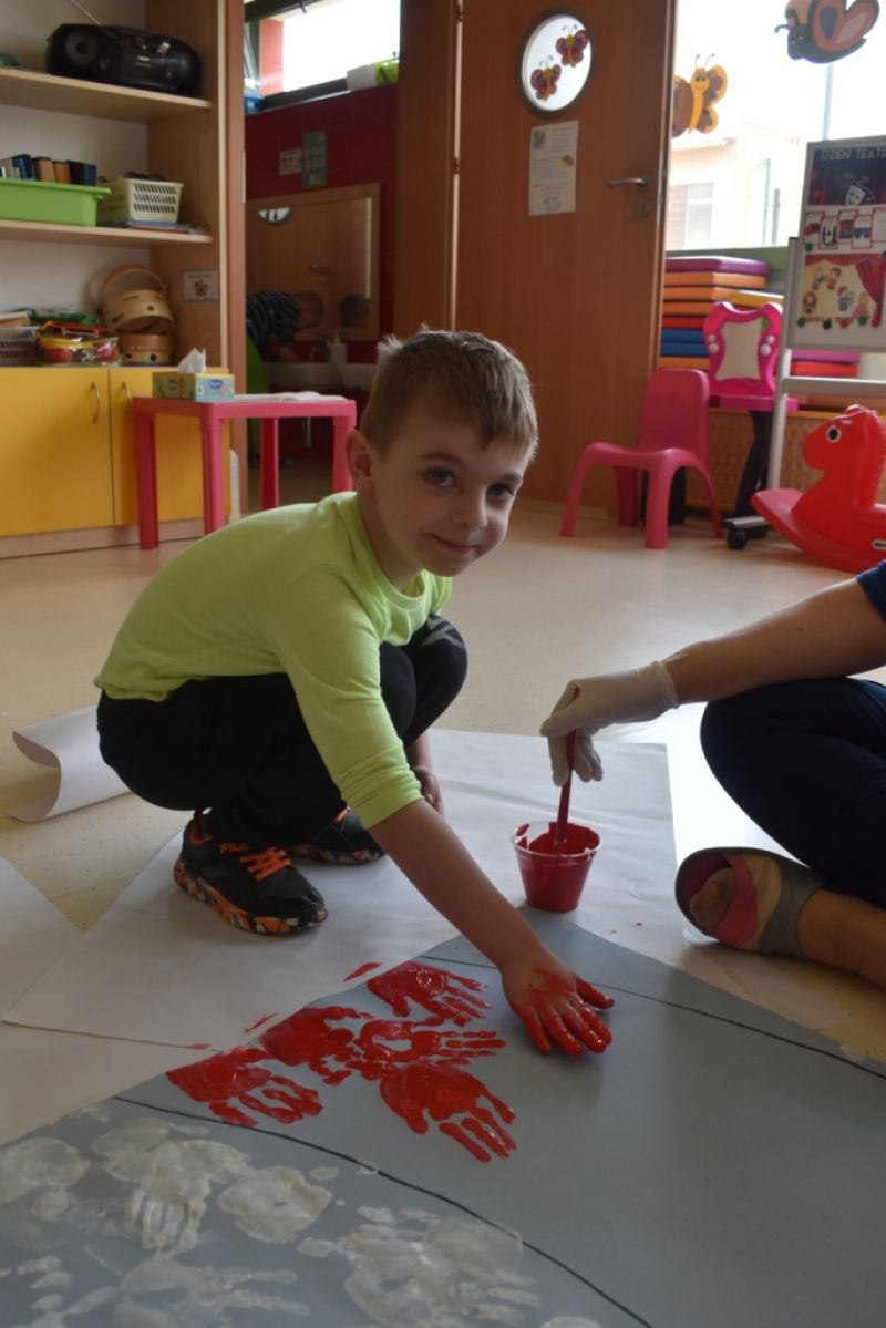 Dzisiaj wykonaliśmy pracę grupową na dużym arkuszu papieru- flagę Polski. Do pracy wykorzystaliśmy farby w kolorze biało- czerwonym oraz nasze czarodziejskie rączki.