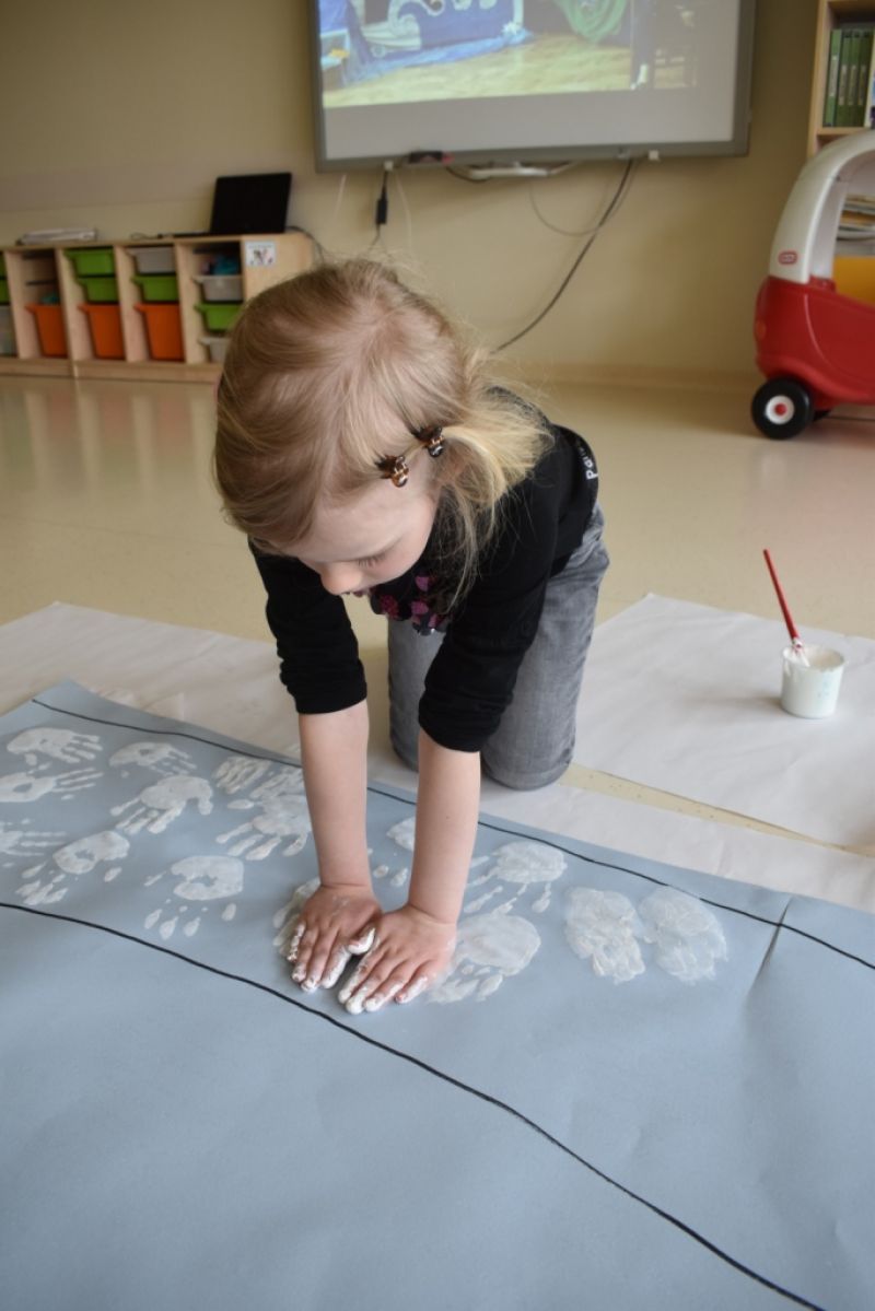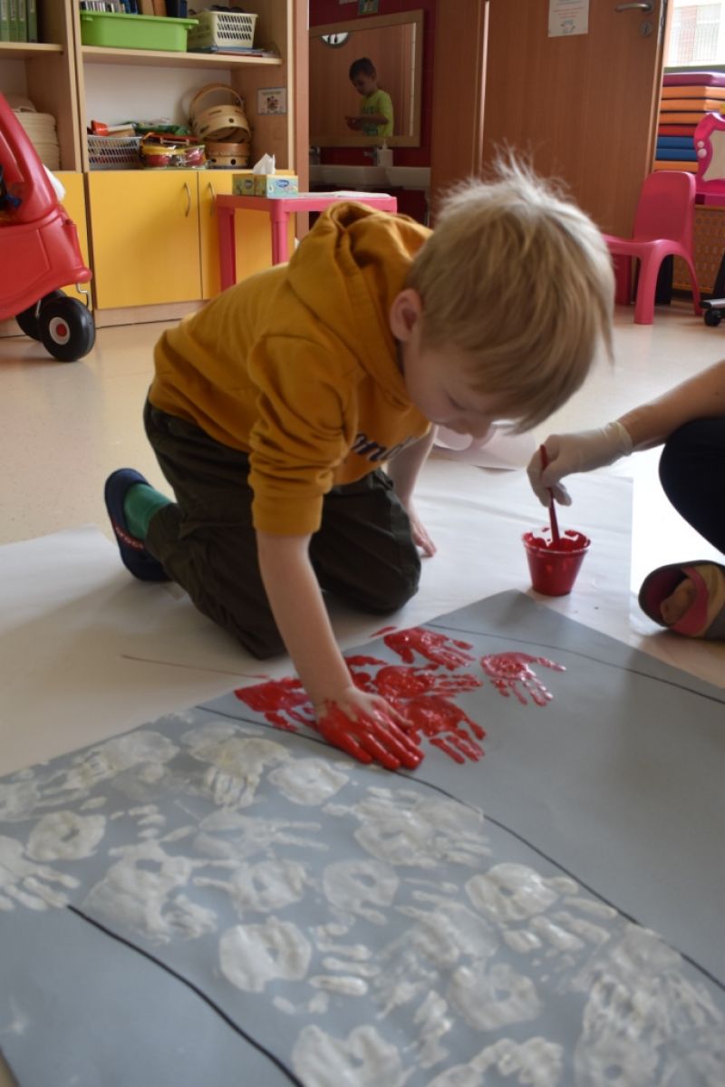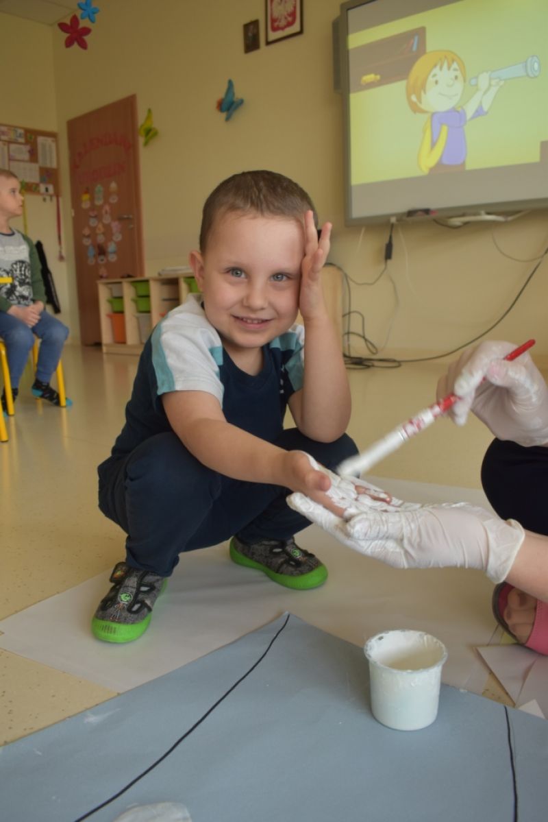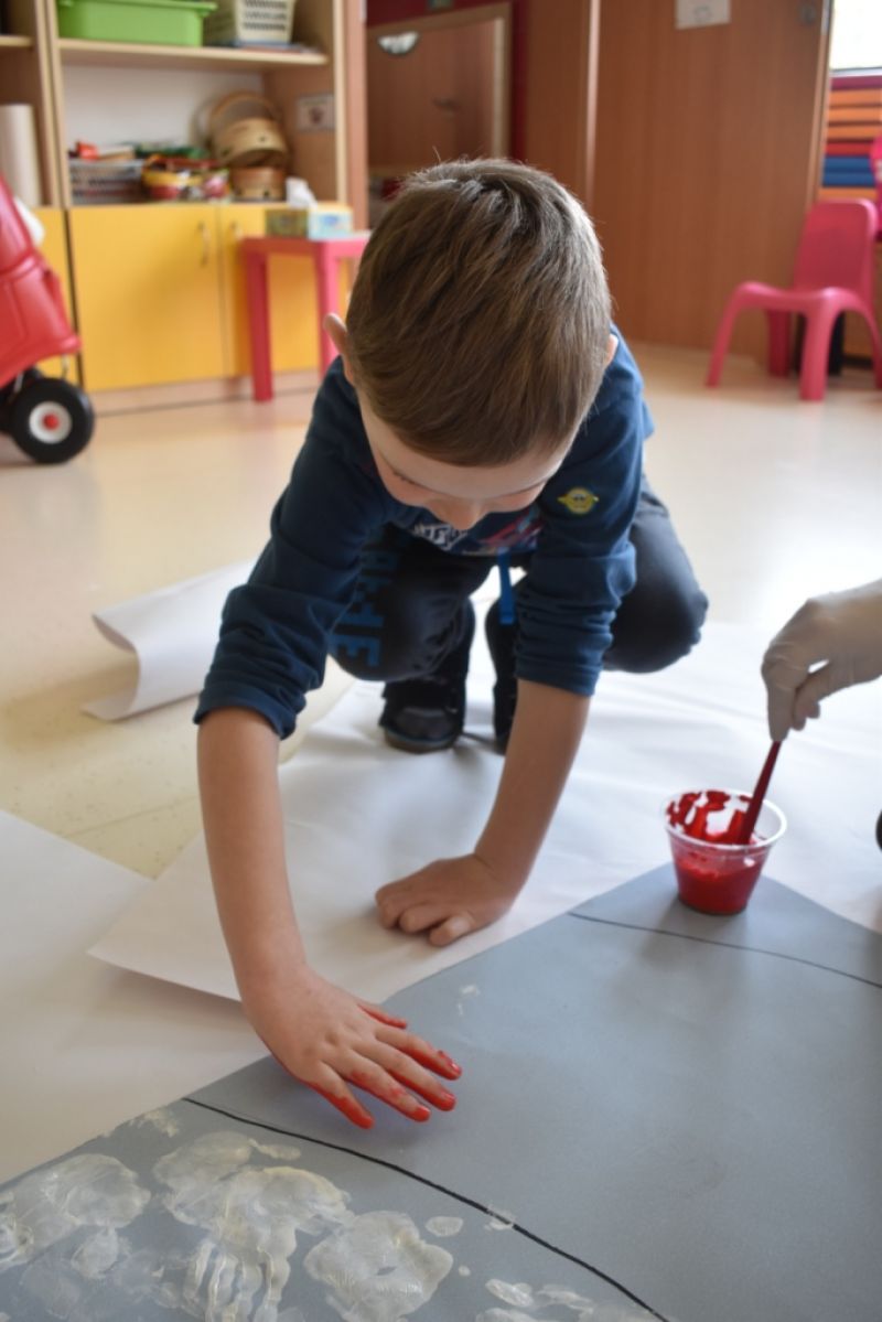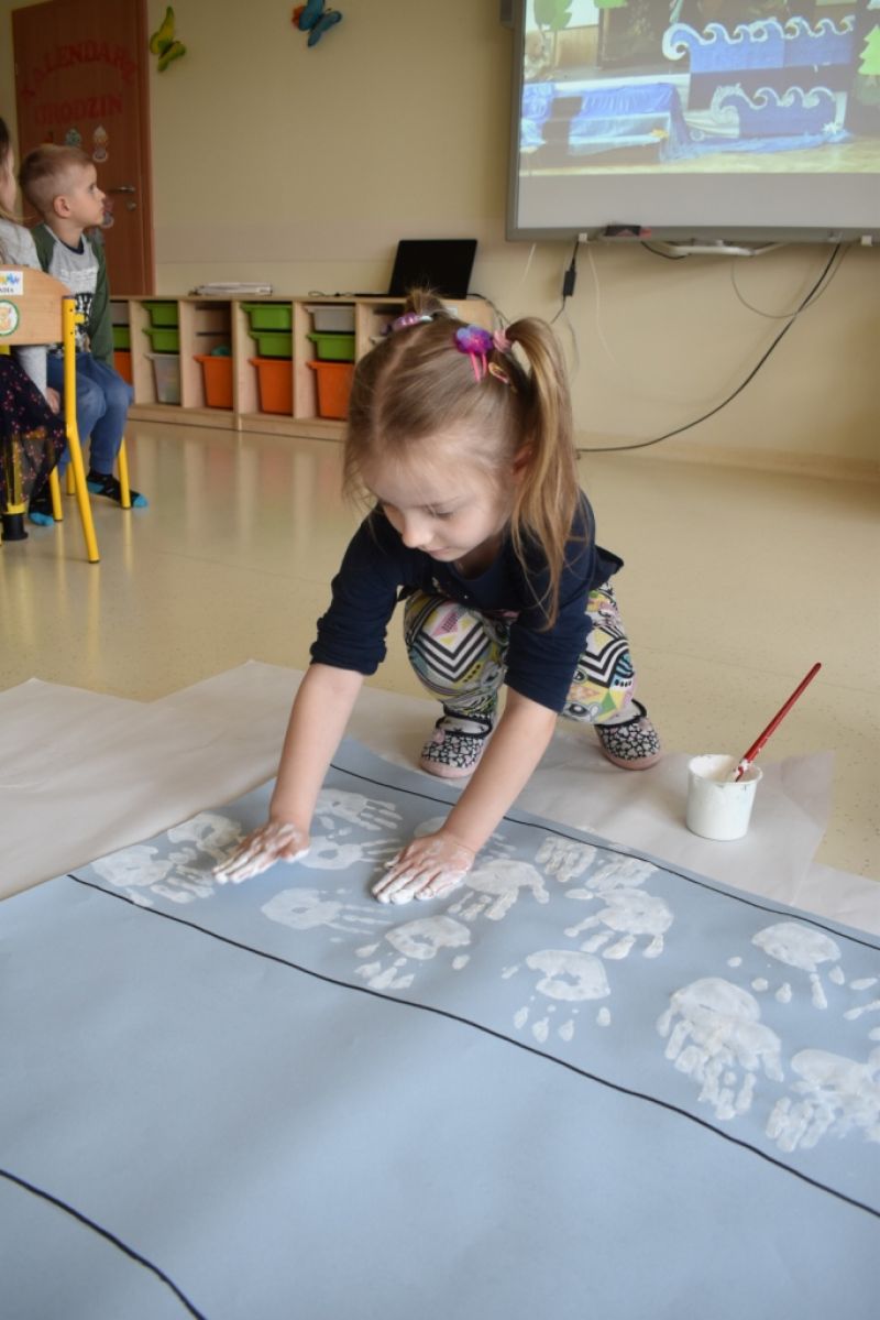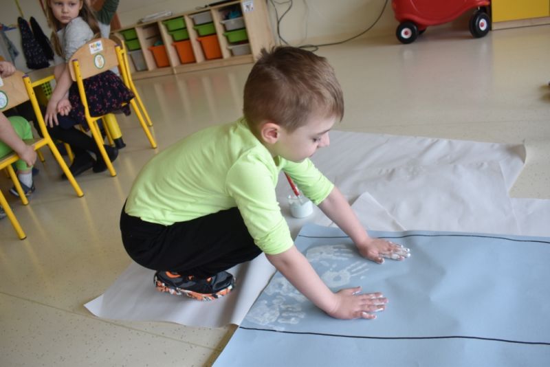 Dzisiaj wykonaliśmy pracę grupową na dużym arkuszu papieru- flagę Polski. Do pracy wykorzystaliśmy farby w kolorze biało- czerwonym oraz nasze czarodziejskie rączki.