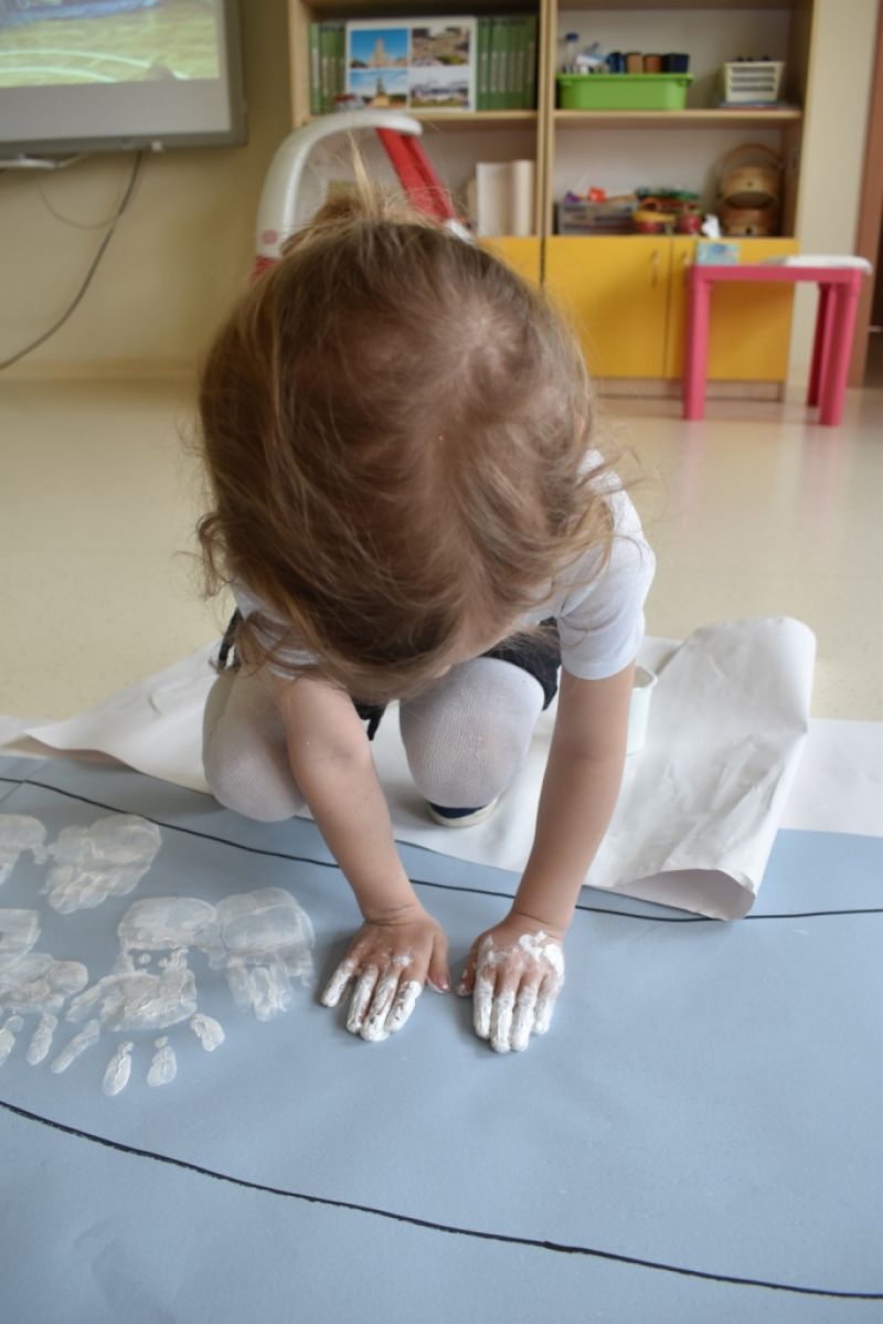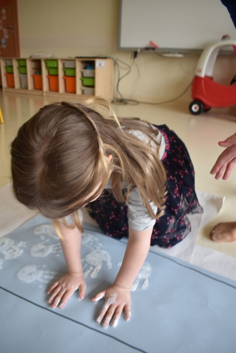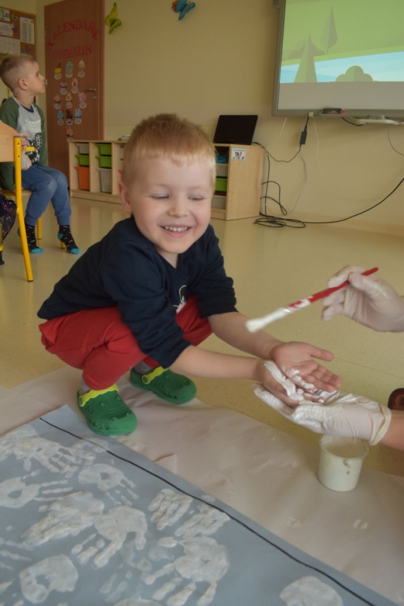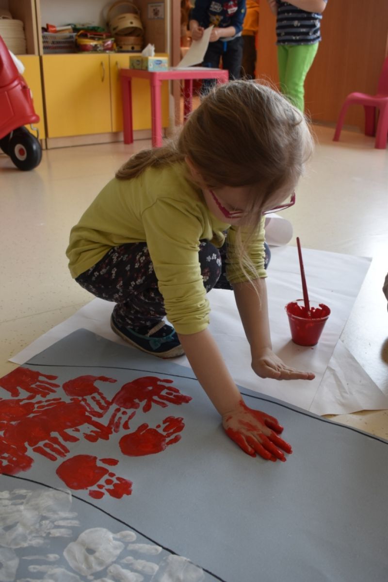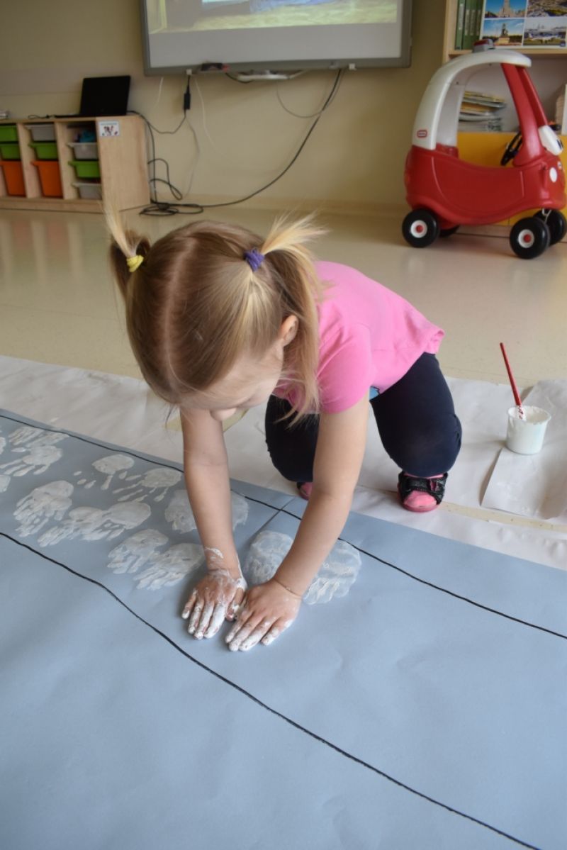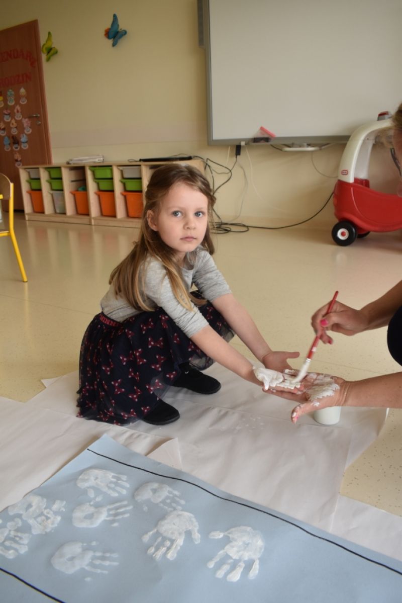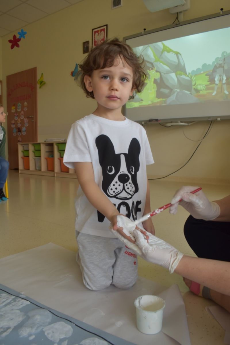 Dzisiaj wykonaliśmy pracę grupową na dużym arkuszu papieru- flagę Polski. Do pracy wykorzystaliśmy farby w kolorze biało- czerwonym oraz nasze czarodziejskie rączki.