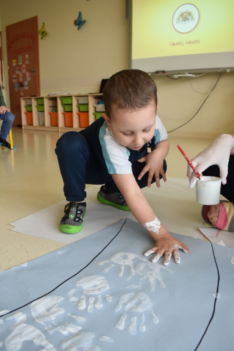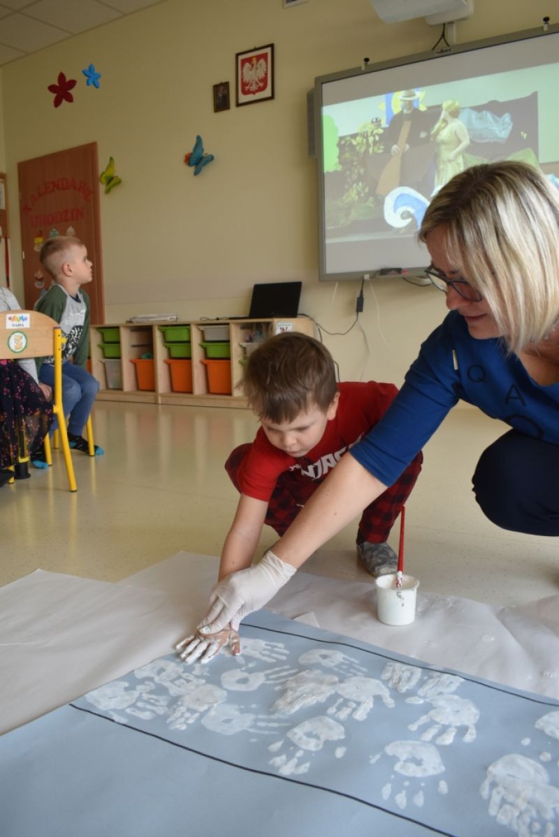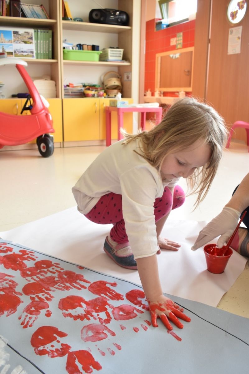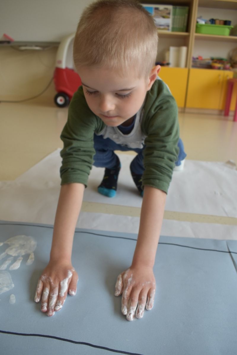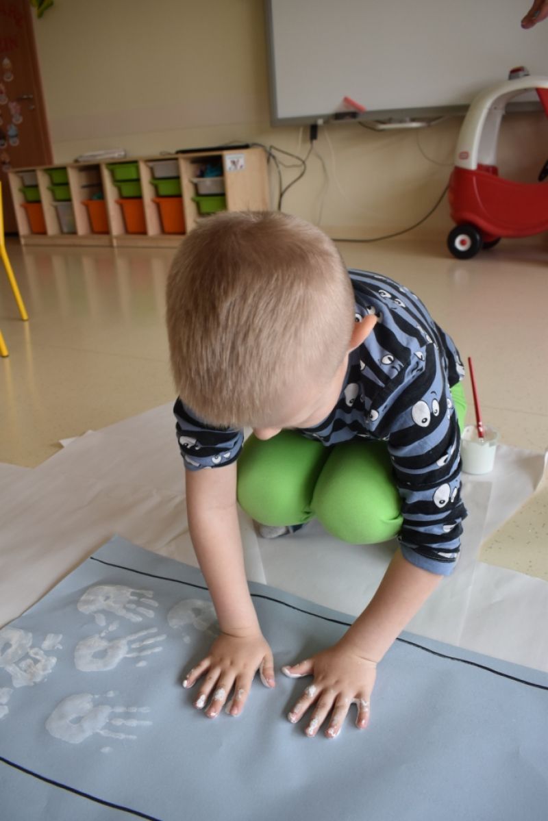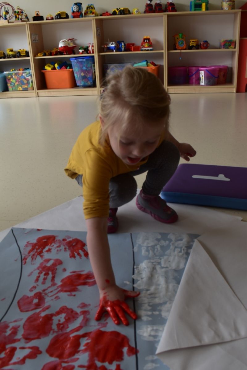 Dzisiaj wykonaliśmy pracę grupową na dużym arkuszu papieru- flagę Polski. Do pracy wykorzystaliśmy farby w kolorze biało- czerwonym oraz nasze czarodziejskie rączki.