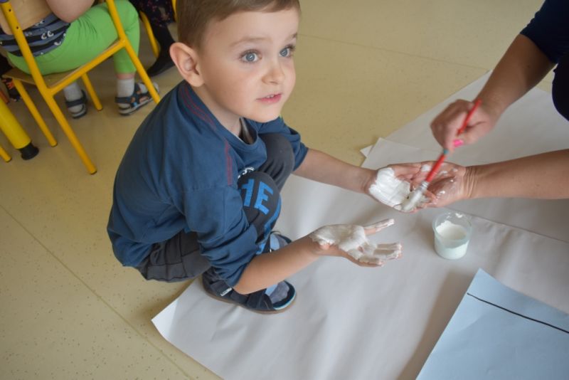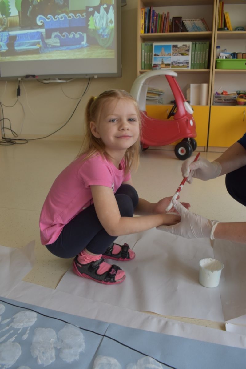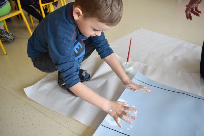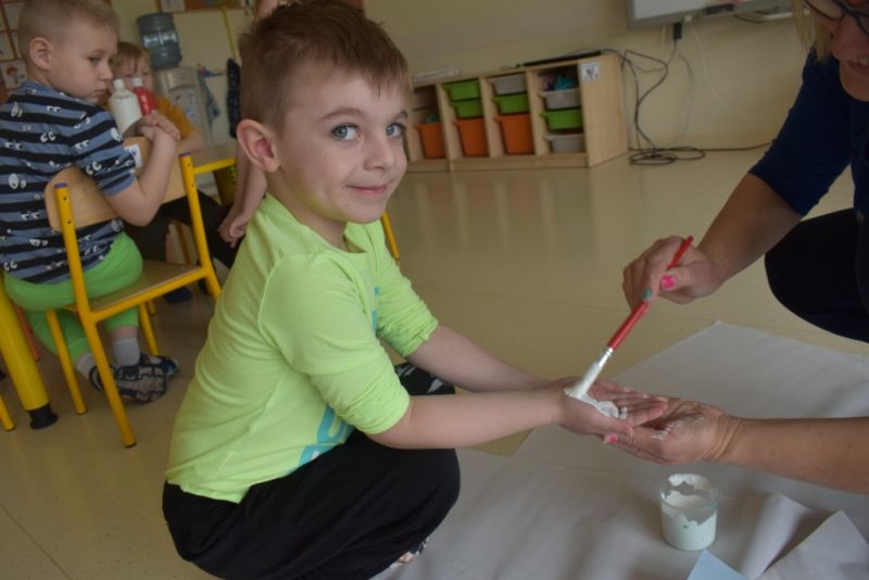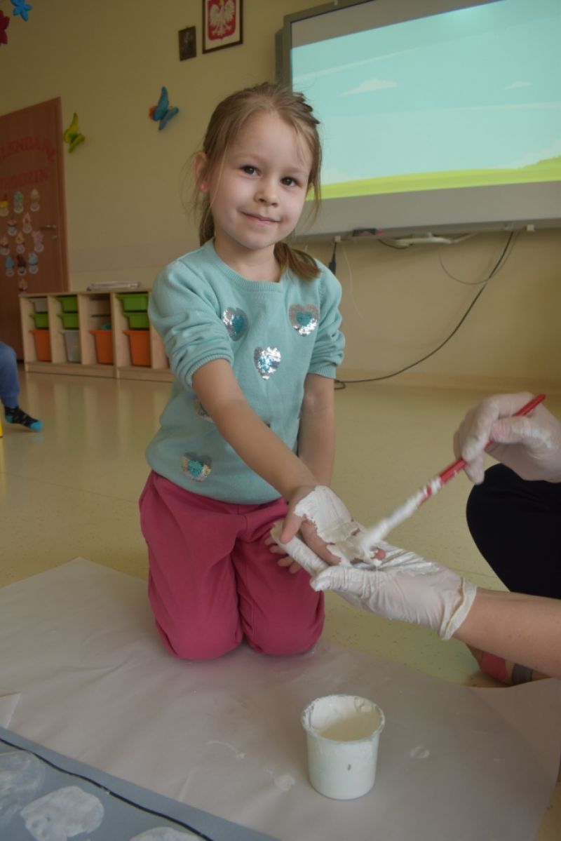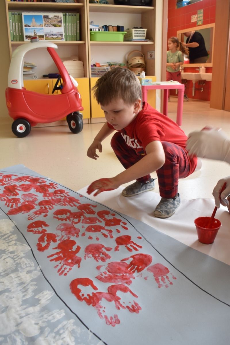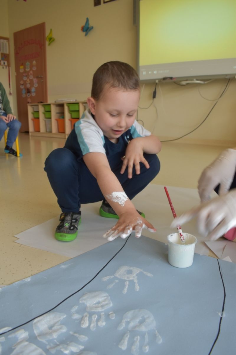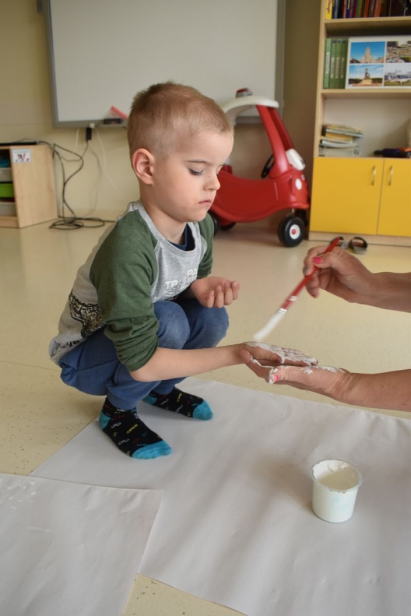 Dzisiaj wykonaliśmy pracę grupową na dużym arkuszu papieru- flagę Polski. Do pracy wykorzystaliśmy farby w kolorze biało- czerwonym oraz nasze czarodziejskie rączki.