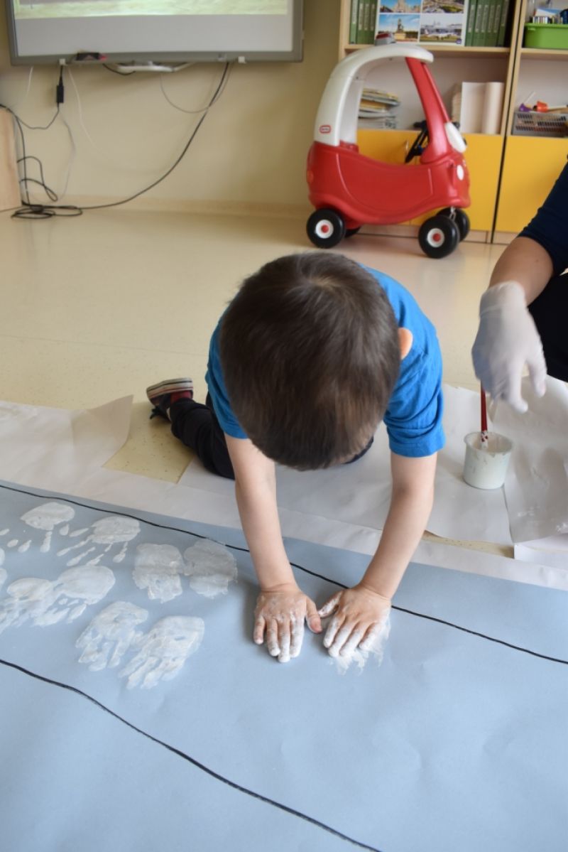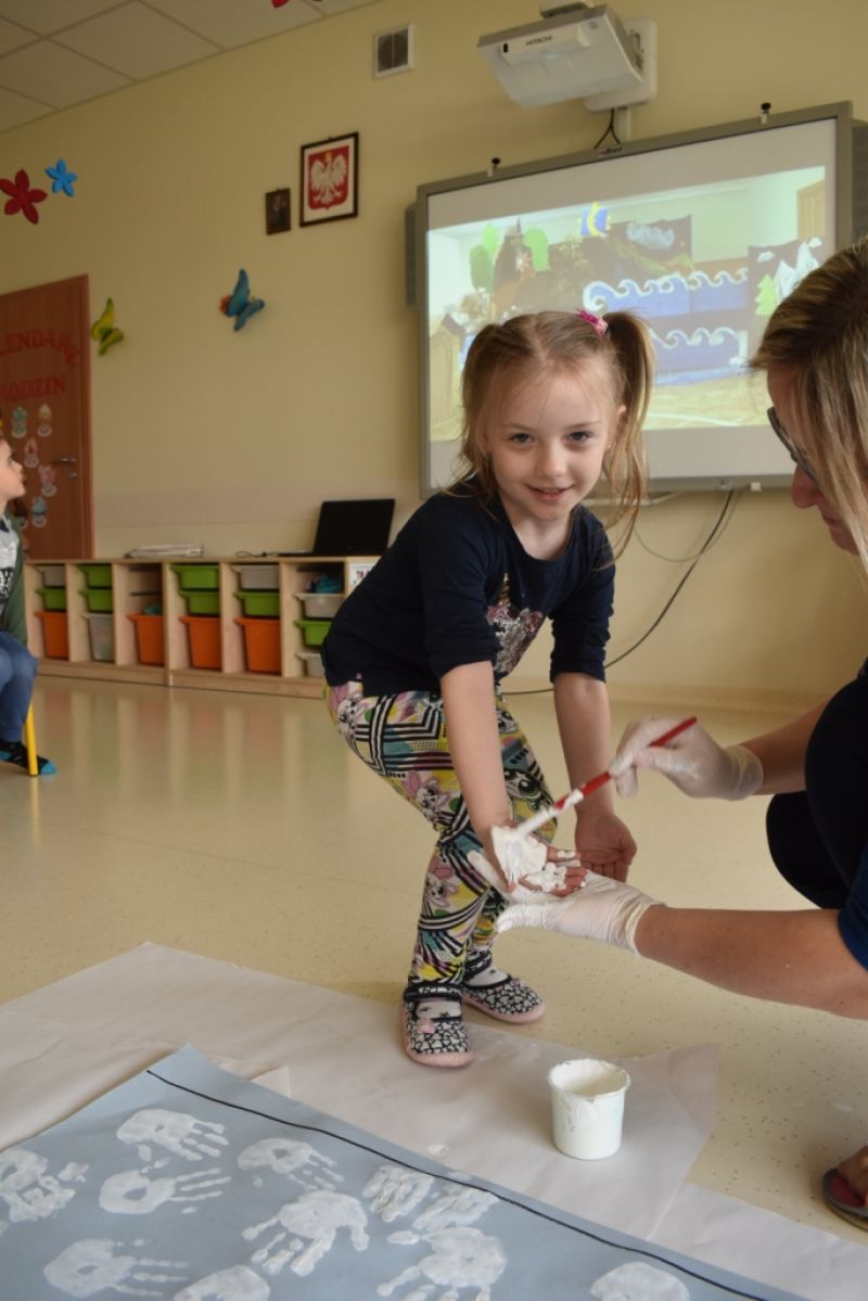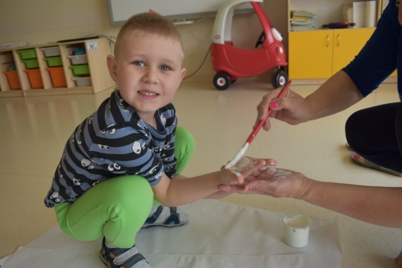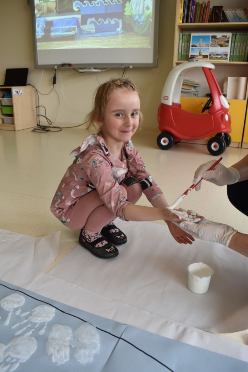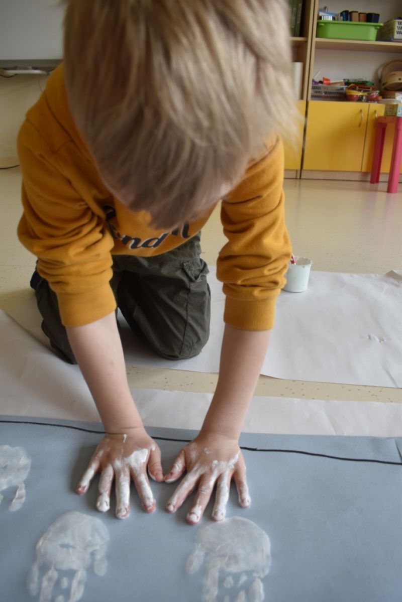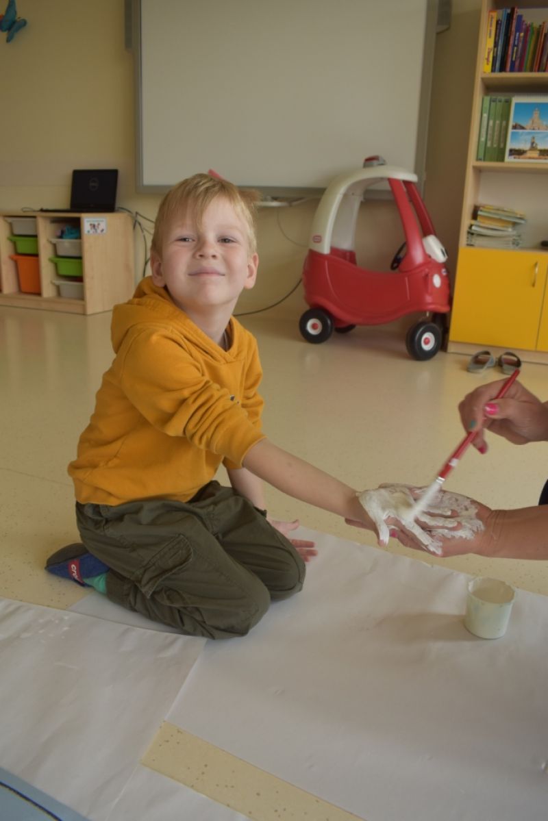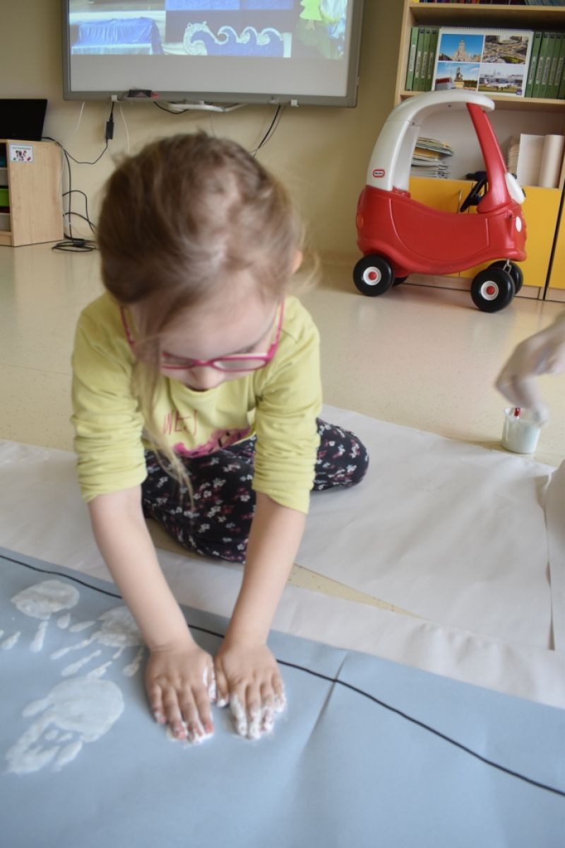 Dzisiaj wykonaliśmy pracę grupową na dużym arkuszu papieru- flagę Polski. Do pracy wykorzystaliśmy farby w kolorze biało- czerwonym oraz nasze czarodziejskie rączki.