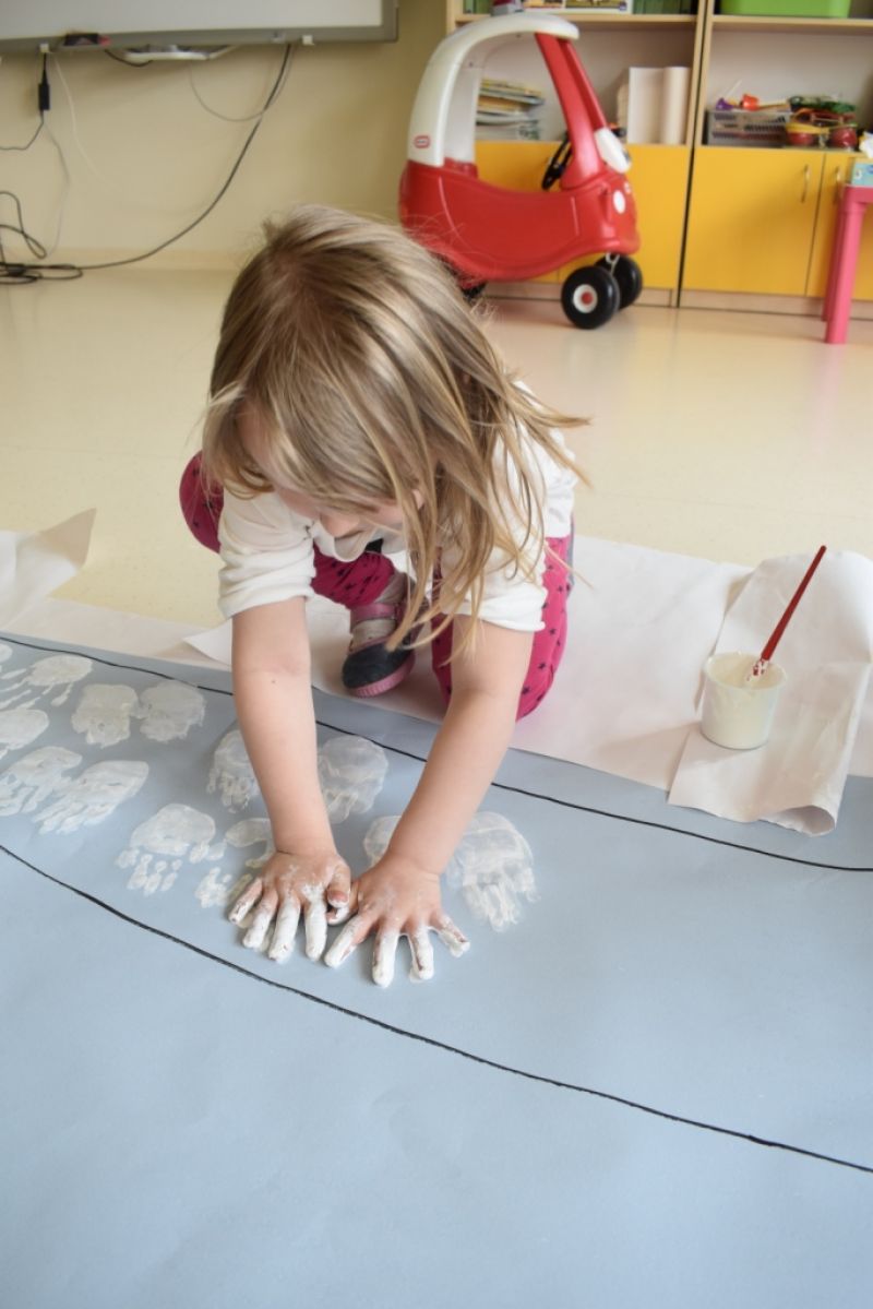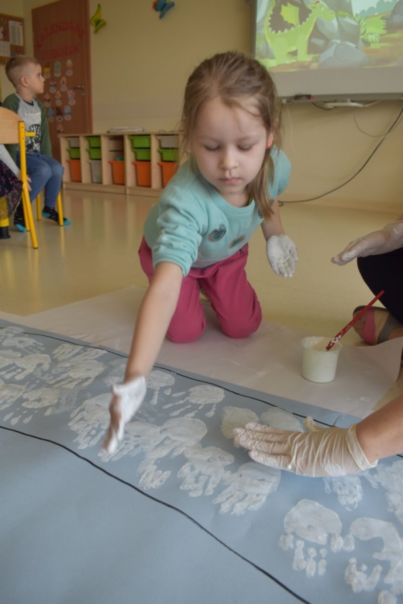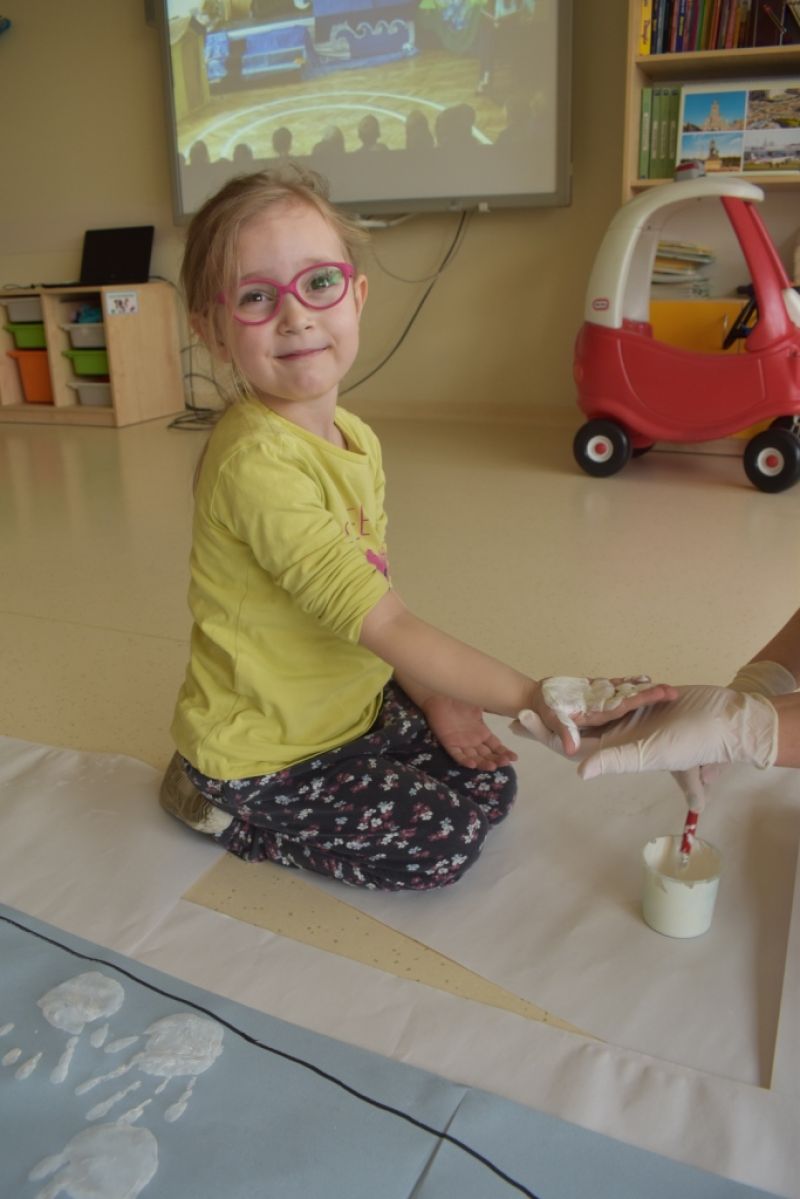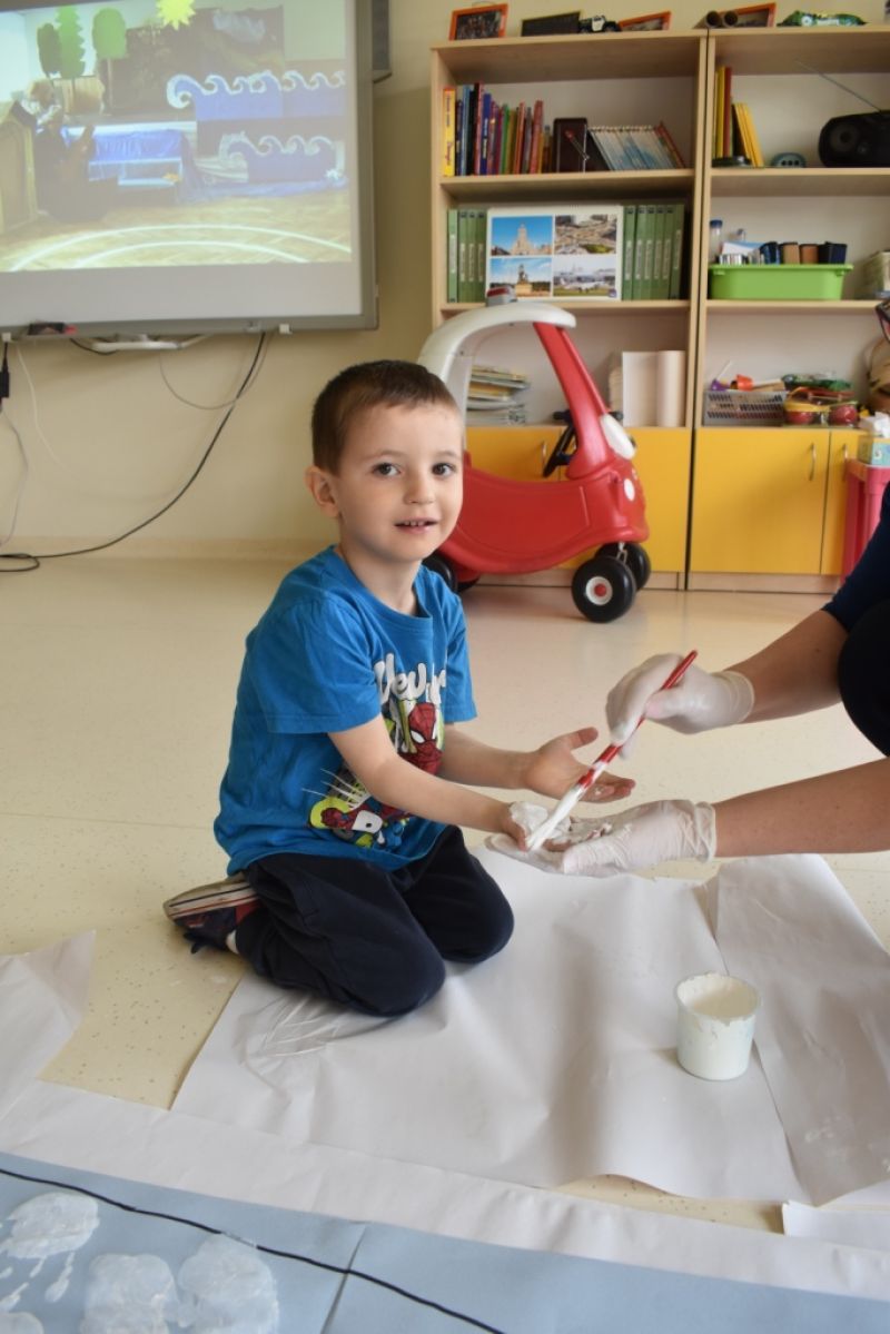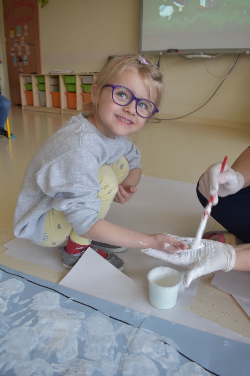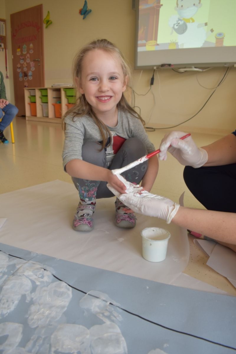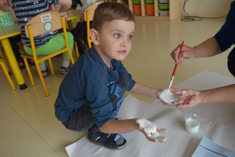 Dzisiaj wykonaliśmy pracę grupową na dużym arkuszu papieru- flagę Polski. Do pracy wykorzystaliśmy farby w kolorze biało- czerwonym oraz nasze czarodziejskie rączki.