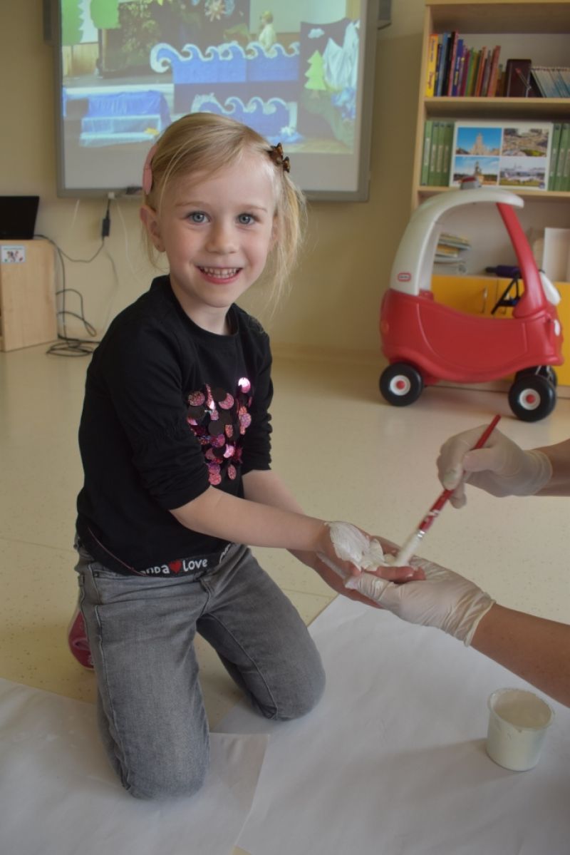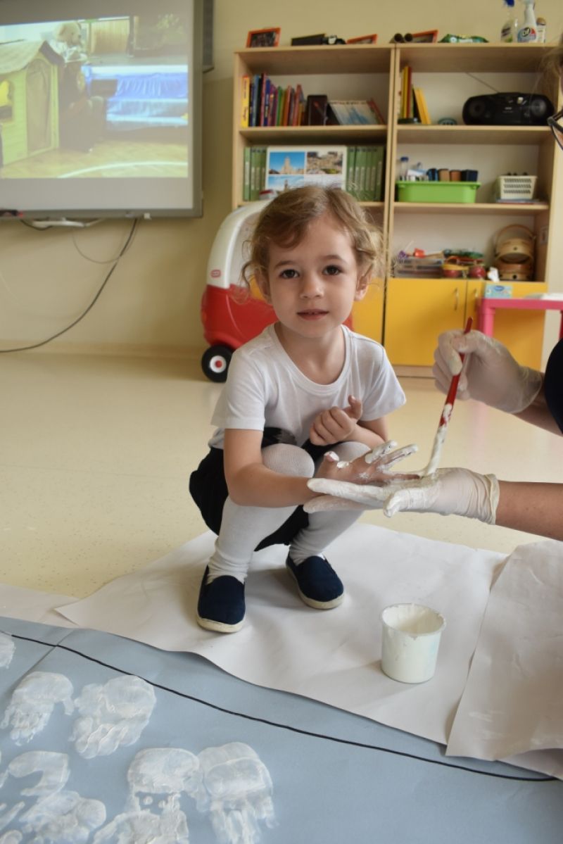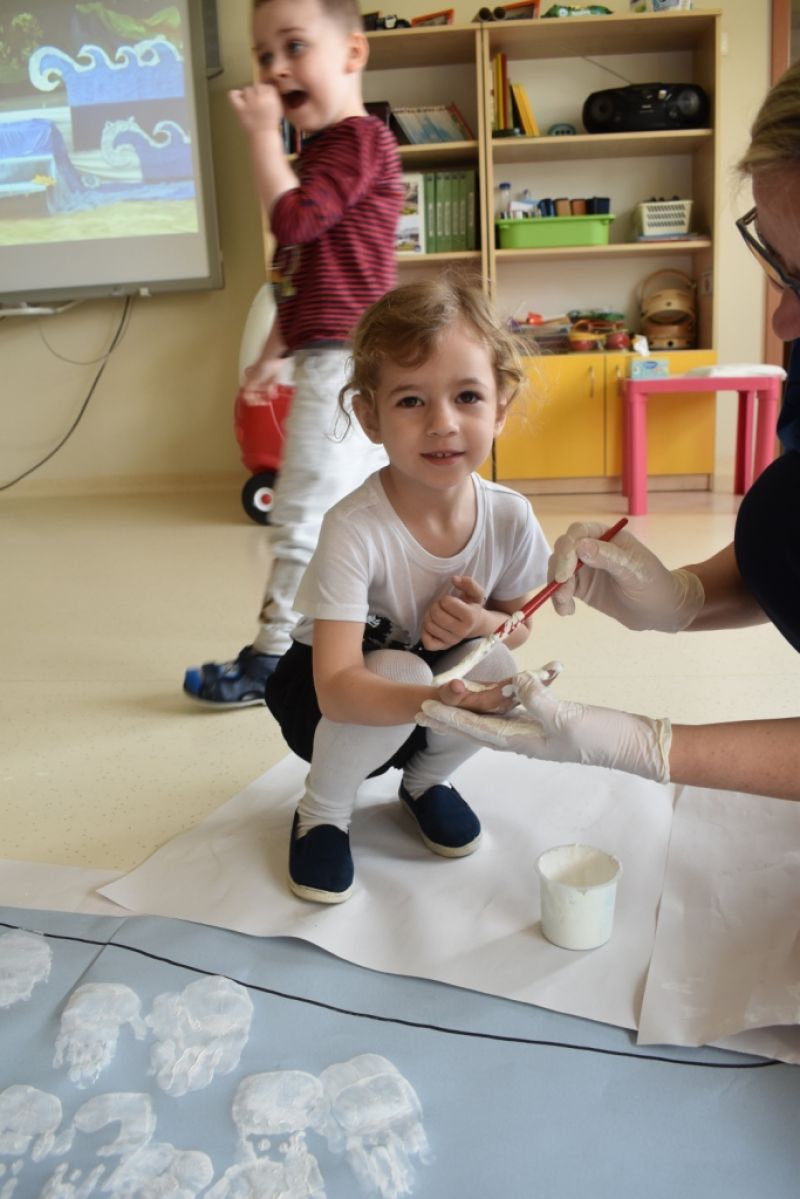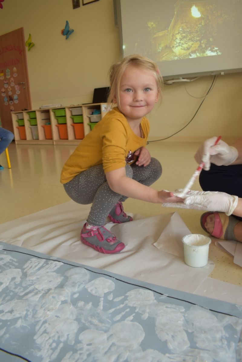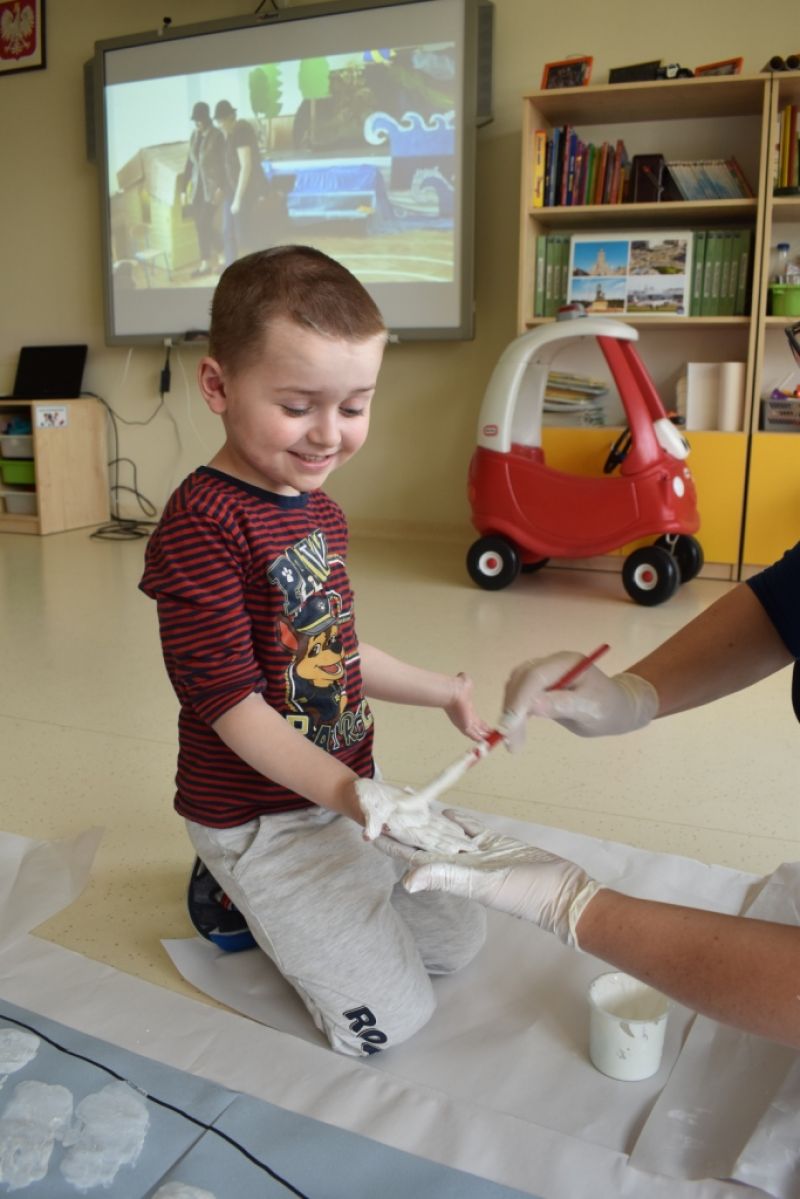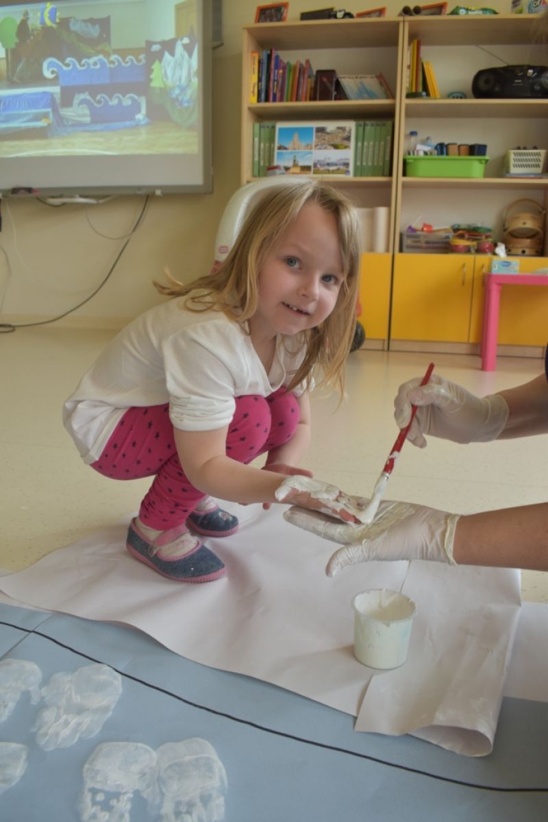 Dzisiaj wykonaliśmy pracę grupową na dużym arkuszu papieru- flagę Polski. Do pracy wykorzystaliśmy farby w kolorze biało- czerwonym oraz nasze czarodziejskie rączki.