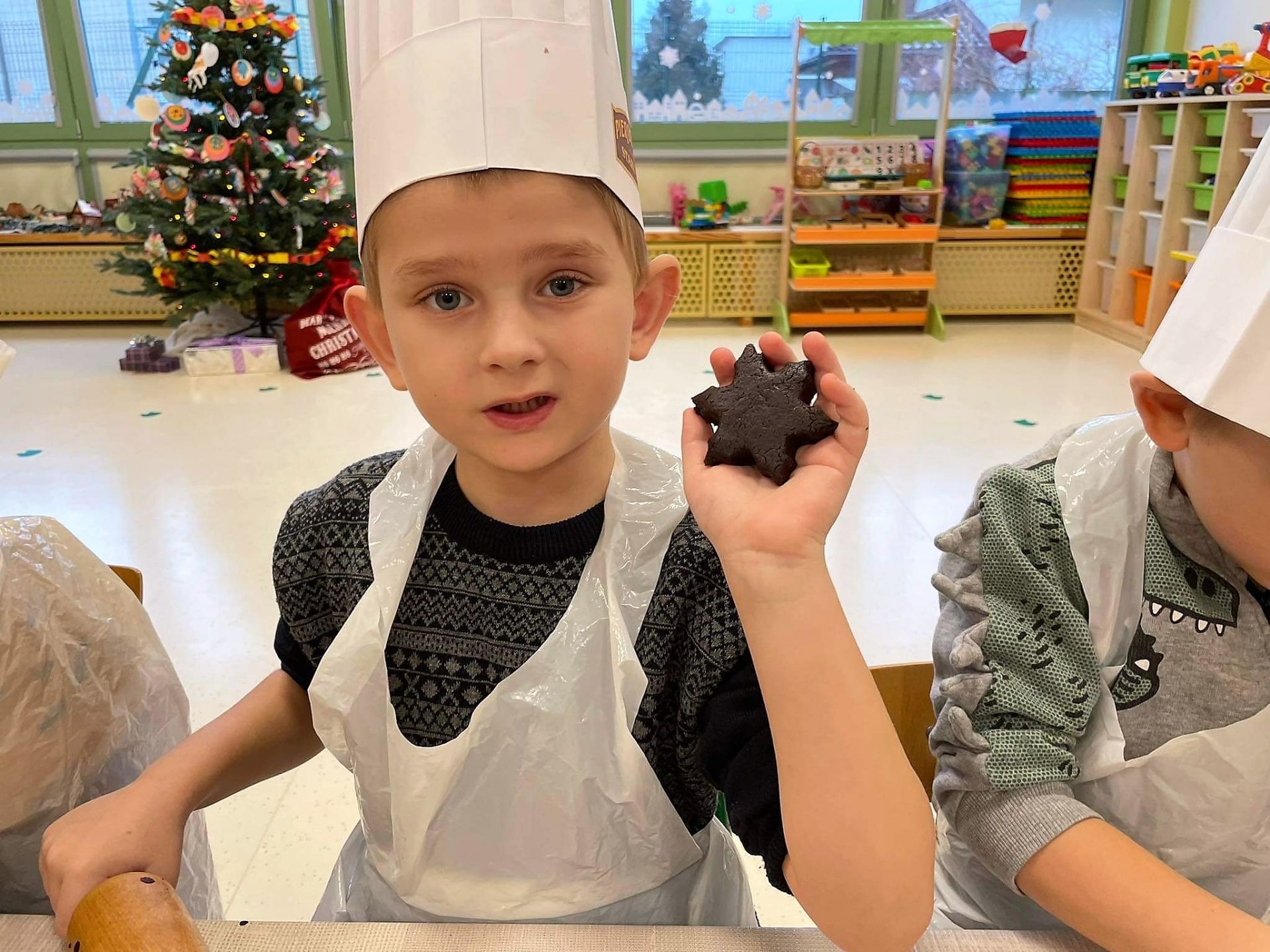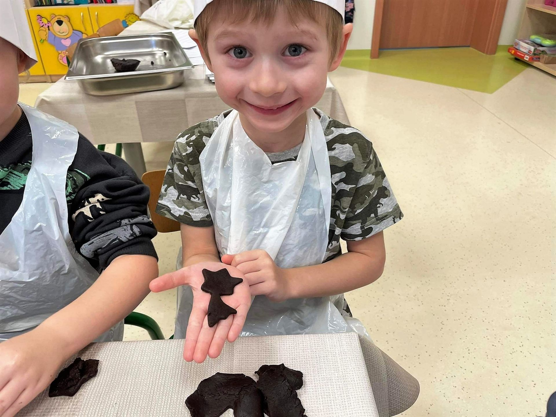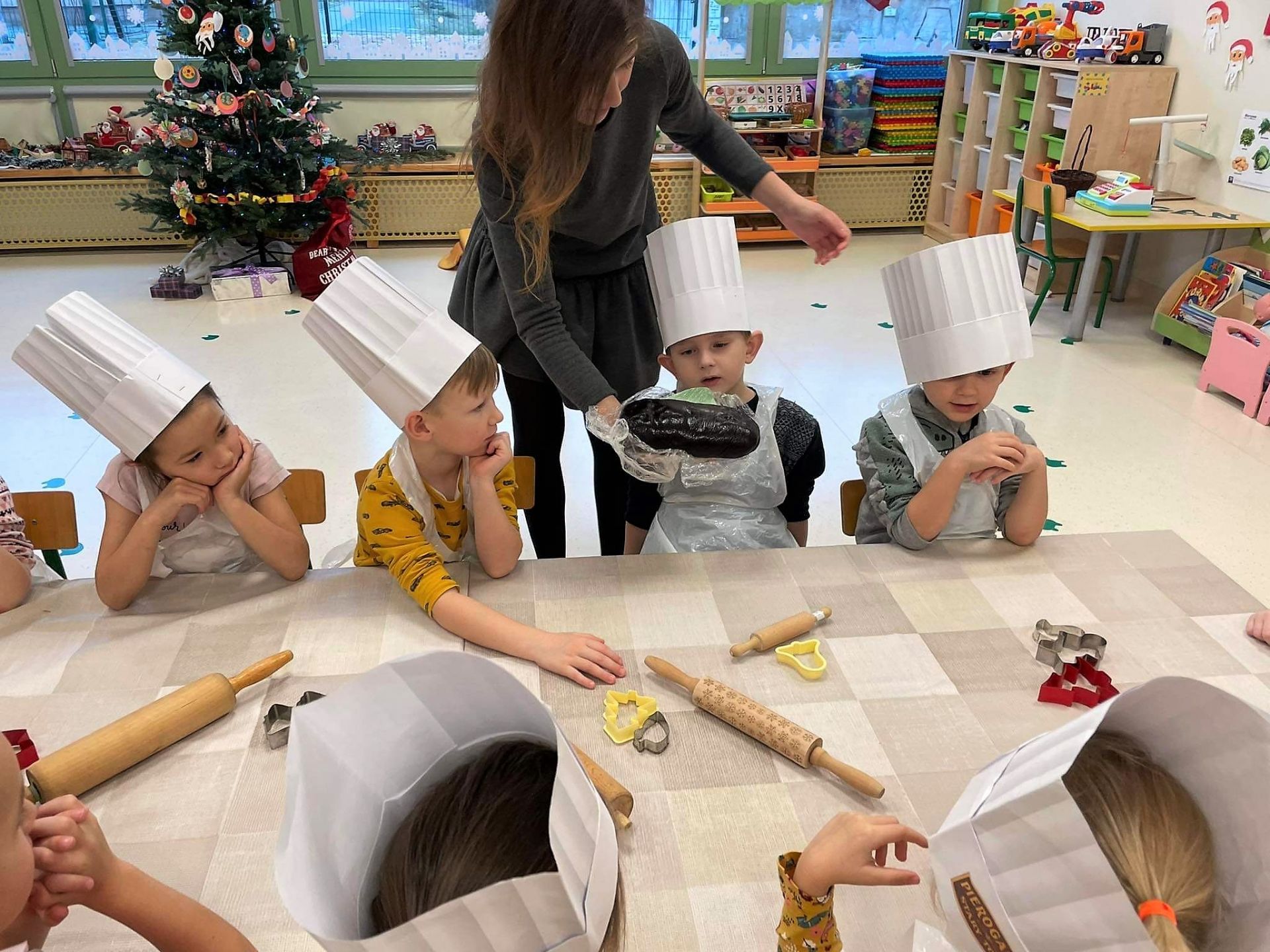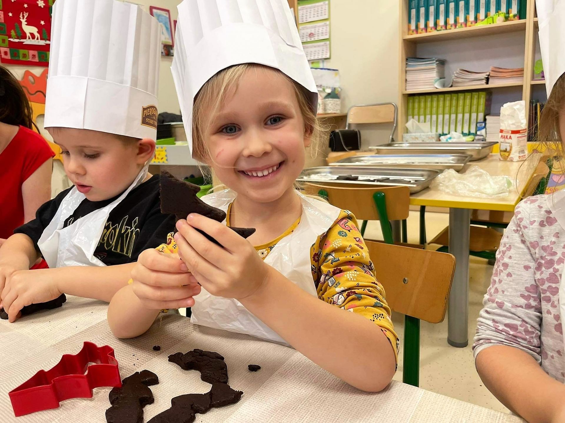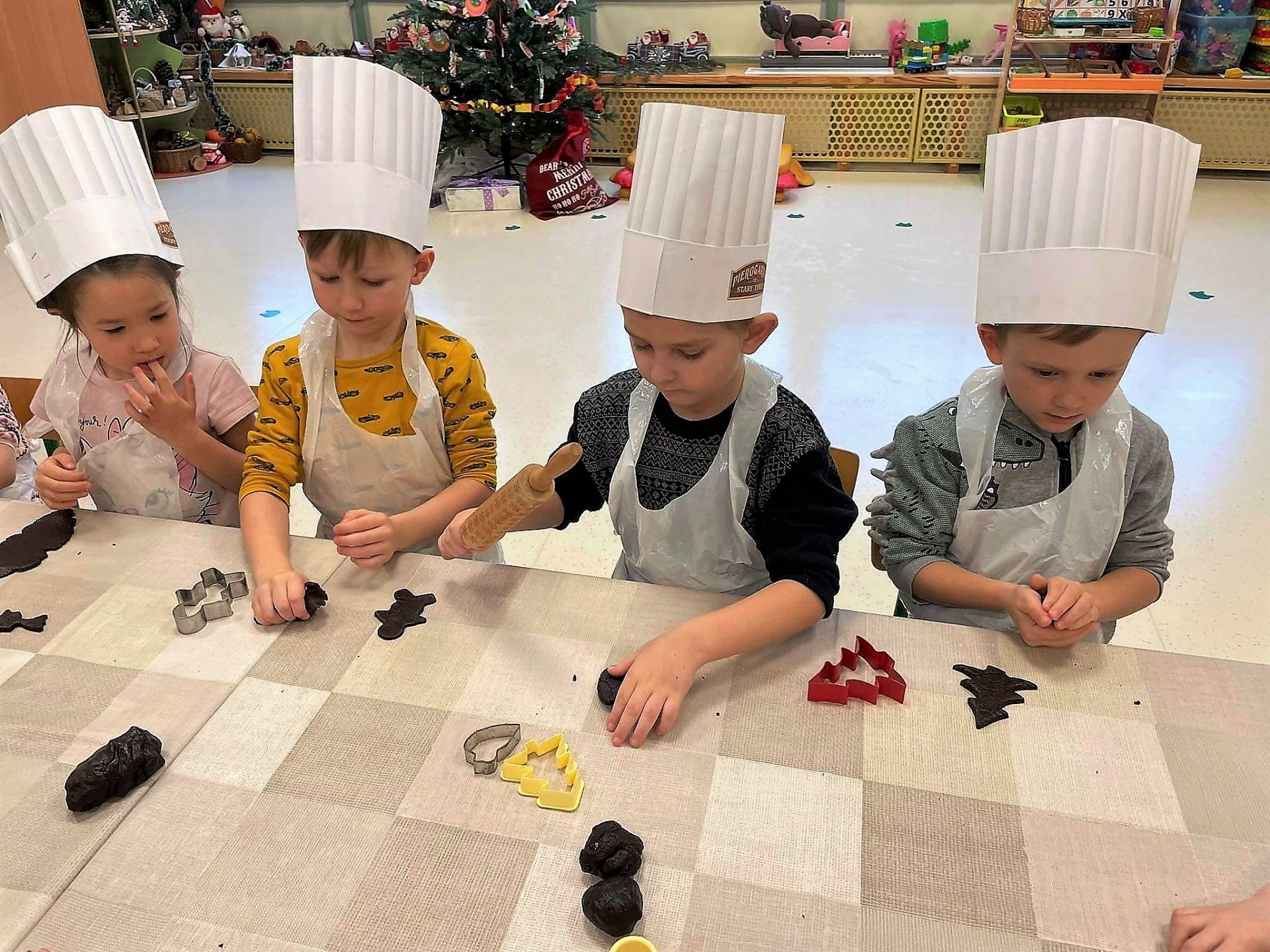 Dzień 15 grudnia 2021 r. był dla nas szczególnie pracowity. Wspólnie piekliśmy świąteczne pierniczki. Żabki z ogromnym zapałem i zaangażowaniem zabrały się do pracy – wałkowały ciasto, wykrawały ciasteczka. Efektem naszej pracy były blaszki pełne pierniczków, które zanieśliśmy do kuchni. Tu pod czujnym okiem Pani Agnieszki pierniki nabierały koloru, piekąc się w piekarniku.