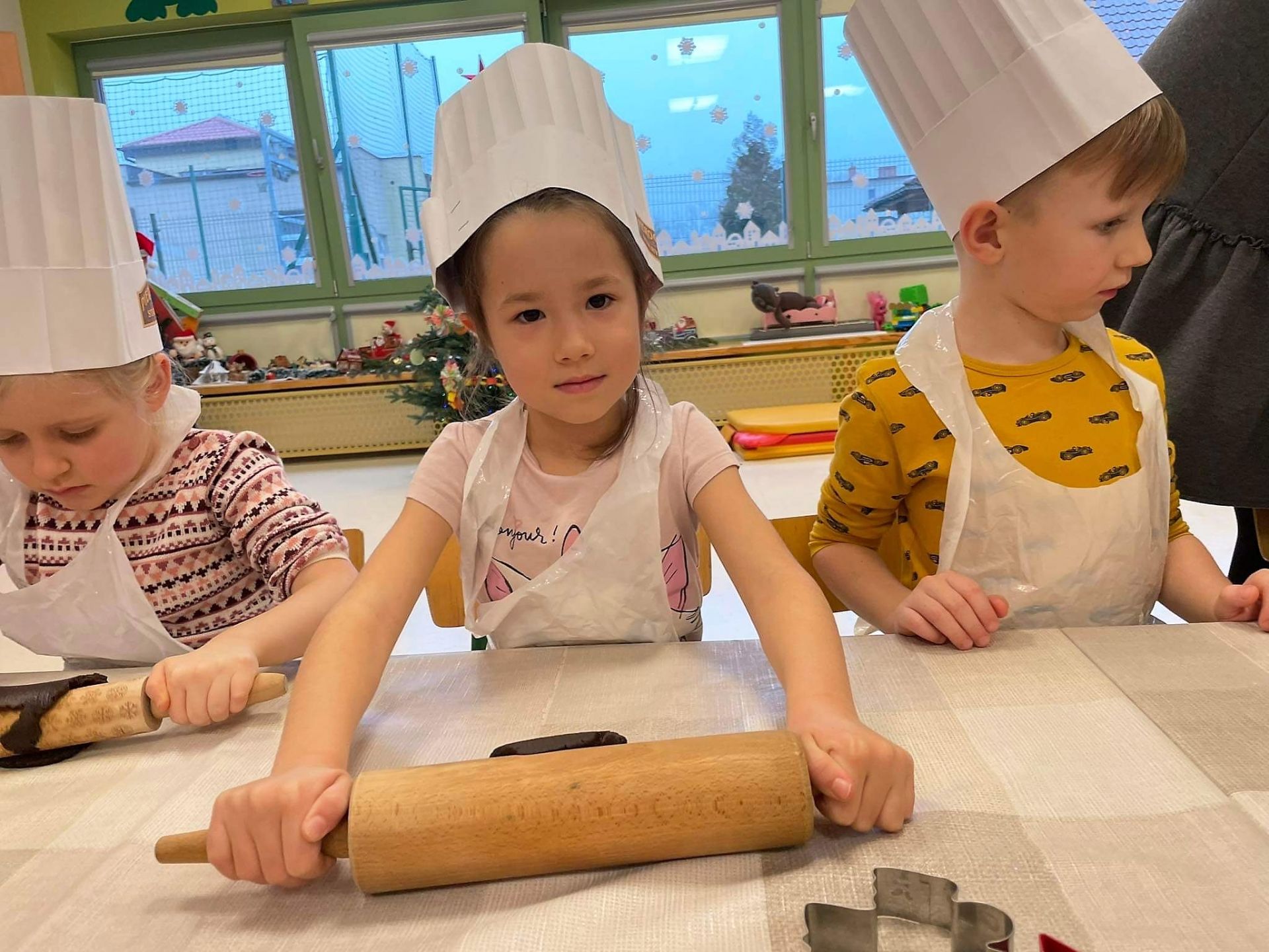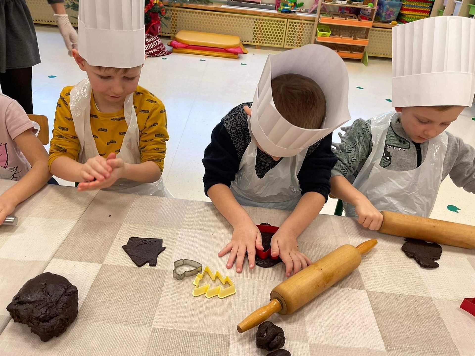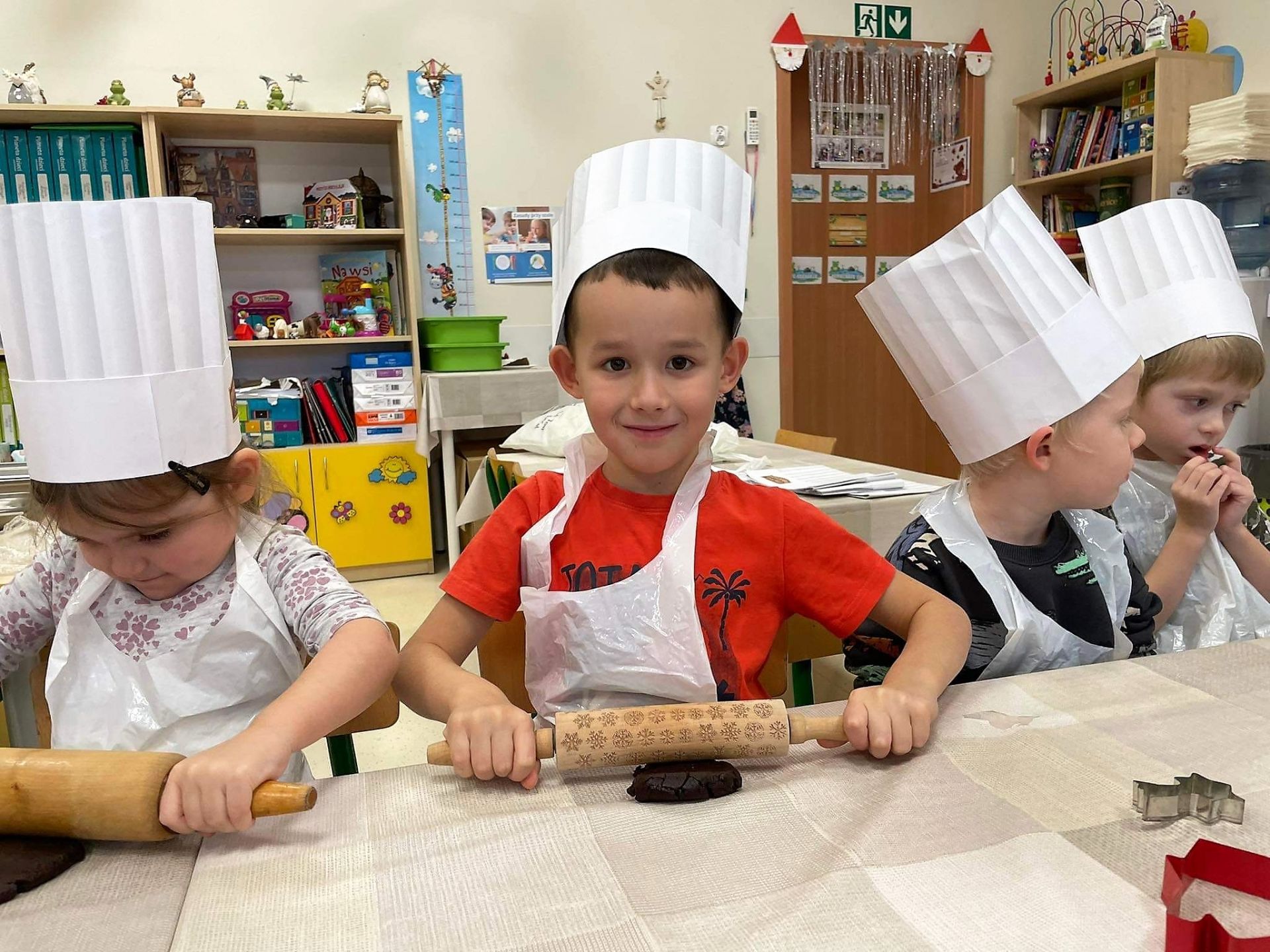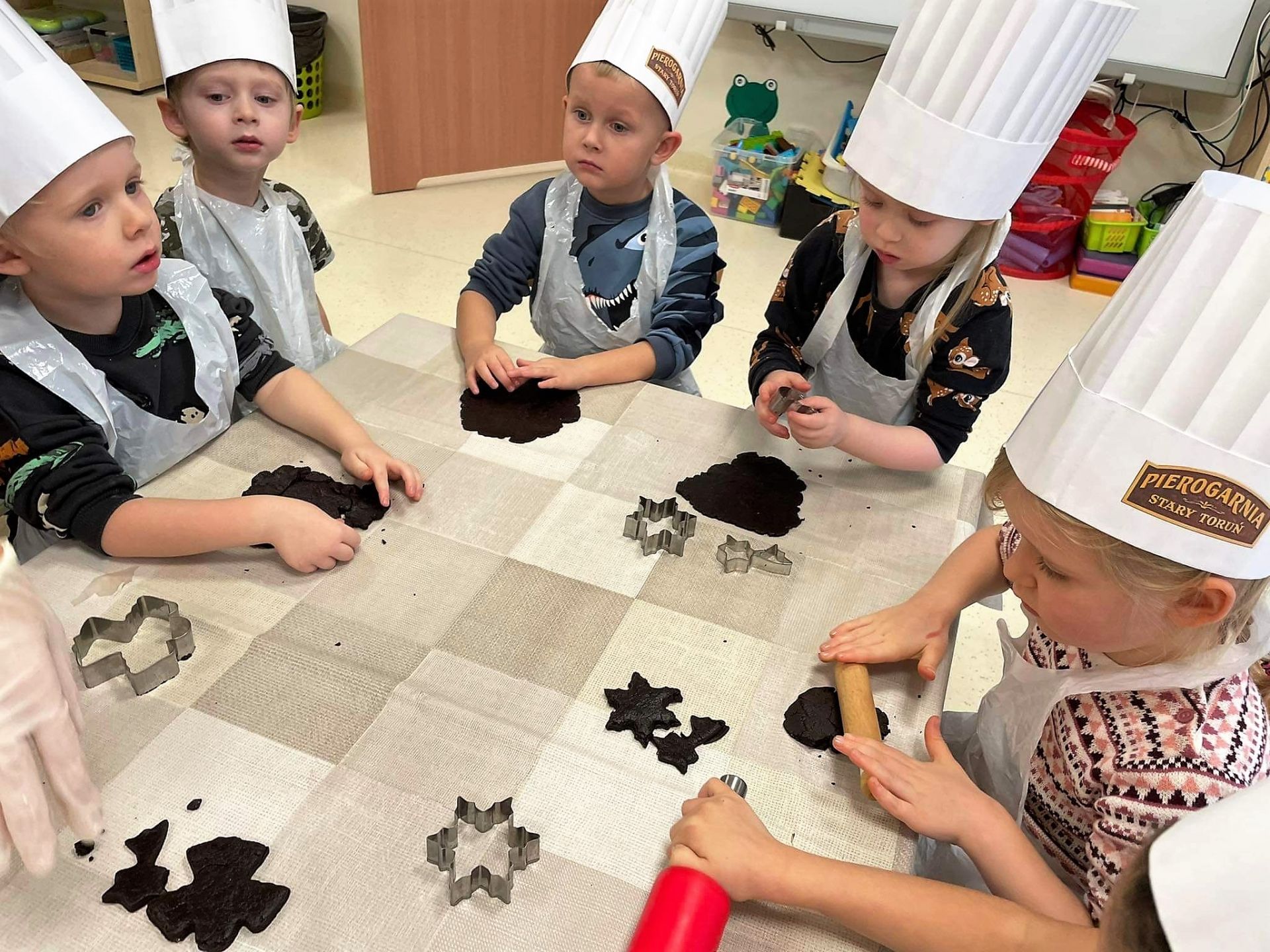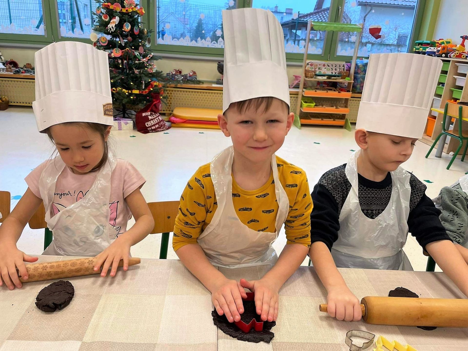Dzień 15 grudnia 2021 r. był dla nas szczególnie pracowity. Wspólnie piekliśmy świąteczne pierniczki. Żabki z ogromnym zapałem i zaangażowaniem zabrały się do pracy – wałkowały ciasto, wykrawały ciasteczka. Efektem naszej pracy były blaszki pełne pierniczków, które zanieśliśmy do kuchni. Tu pod czujnym okiem Pani Agnieszki pierniki nabierały koloru, piekąc się w piekarniku.