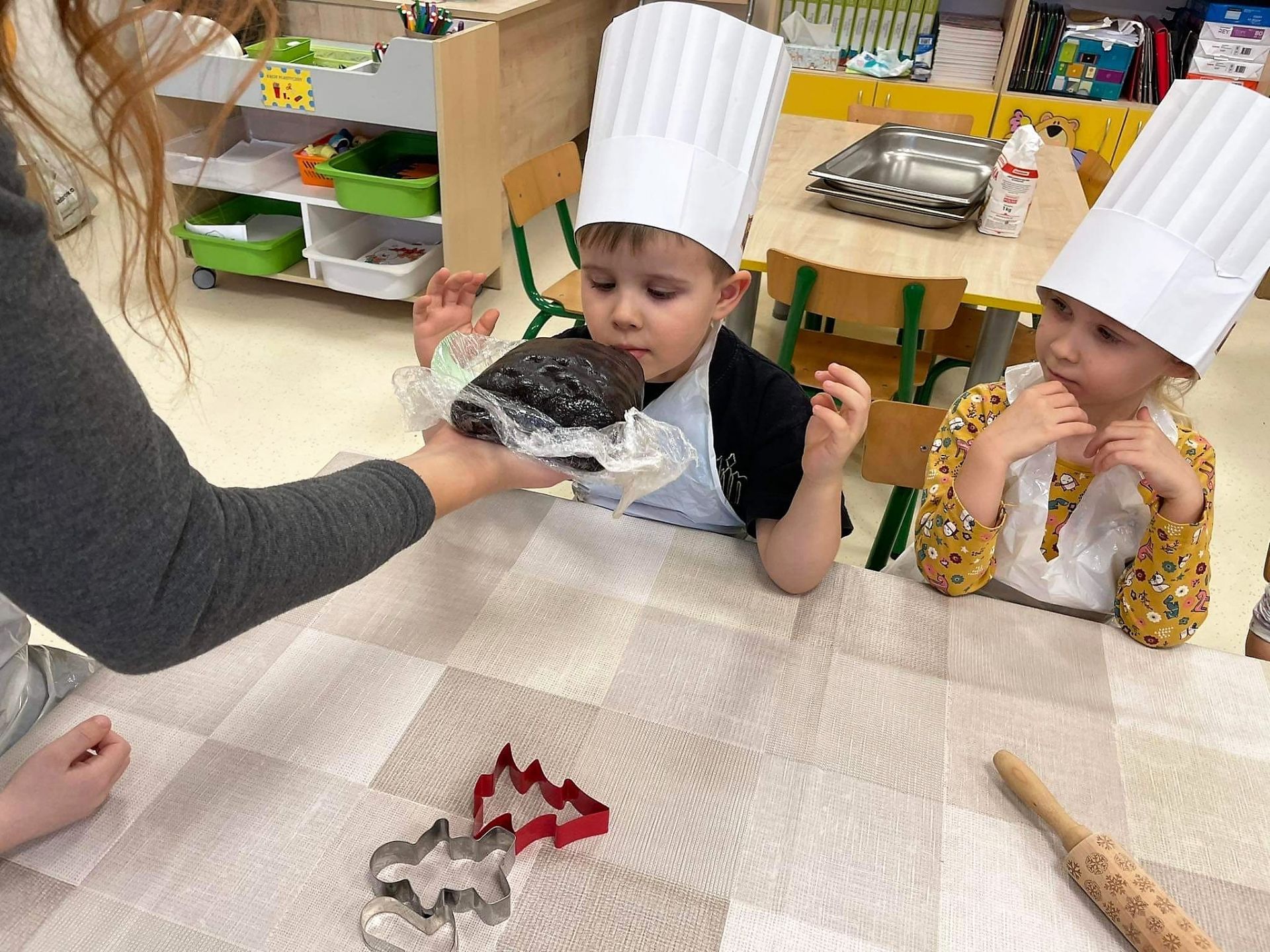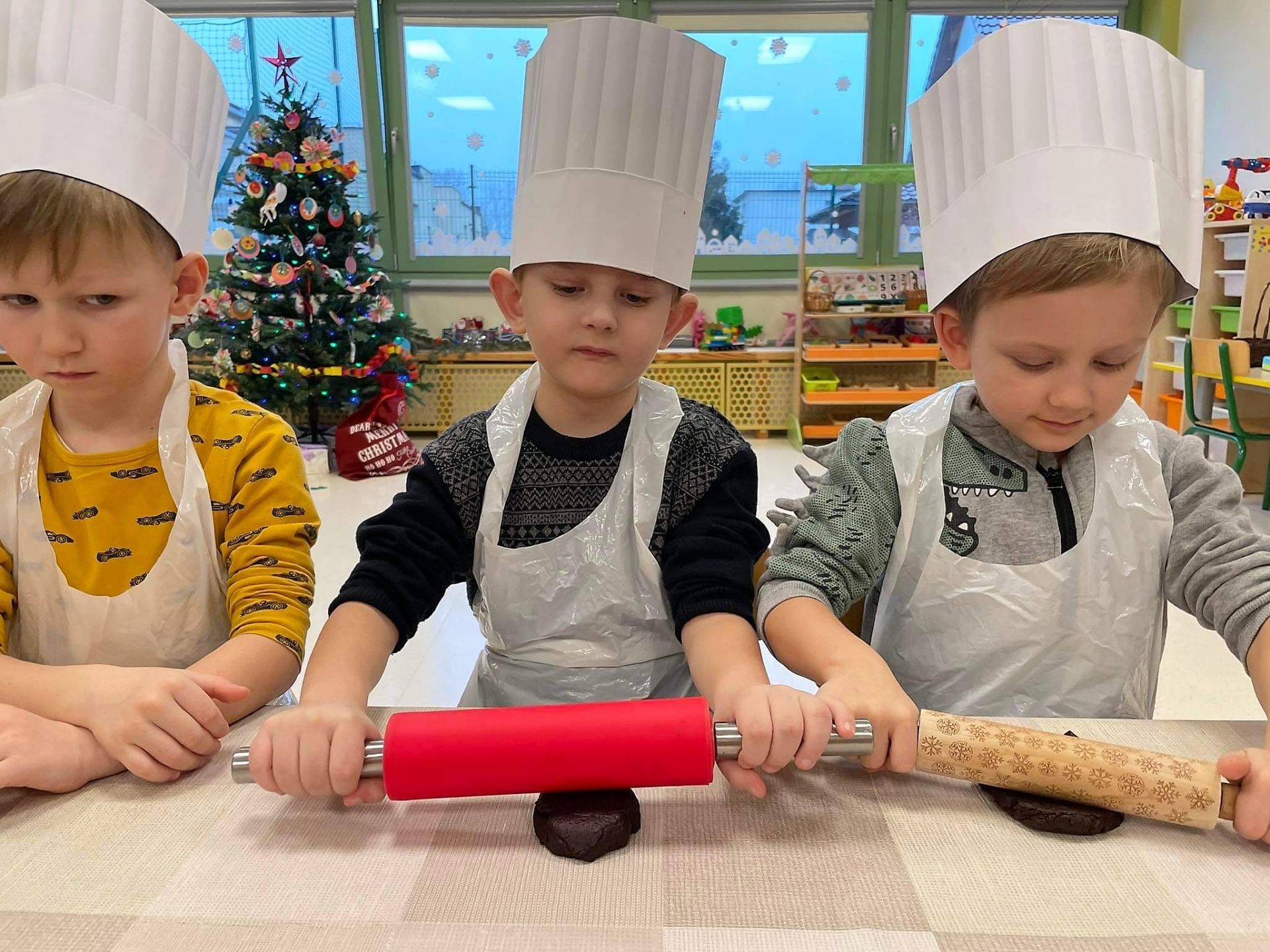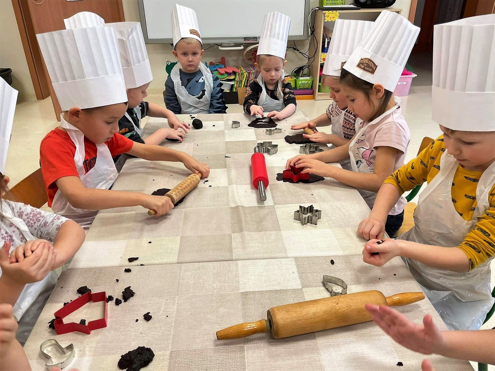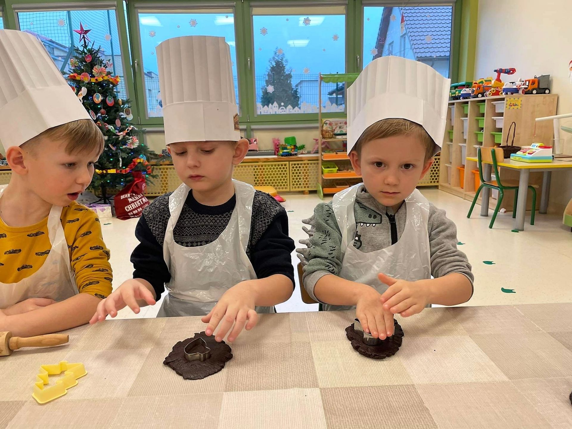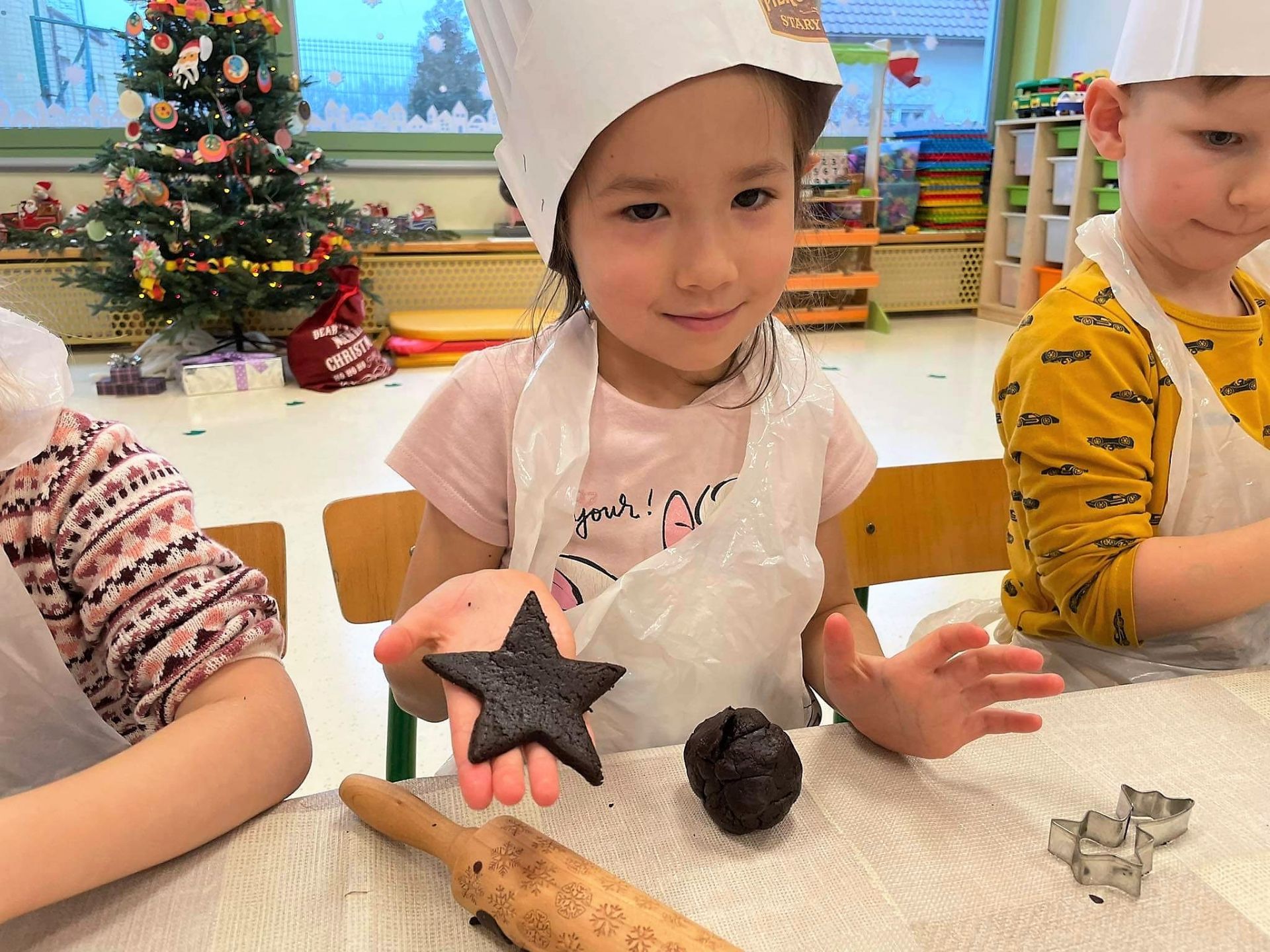 Dzień 15 grudnia 2021 r. był dla nas szczególnie pracowity. Wspólnie piekliśmy świąteczne pierniczki. Żabki z ogromnym zapałem i zaangażowaniem zabrały się do pracy – wałkowały ciasto, wykrawały ciasteczka. Efektem naszej pracy były blaszki pełne pierniczków, które zanieśliśmy do kuchni. Tu pod czujnym okiem Pani Agnieszki pierniki nabierały koloru, piekąc się w piekarniku.