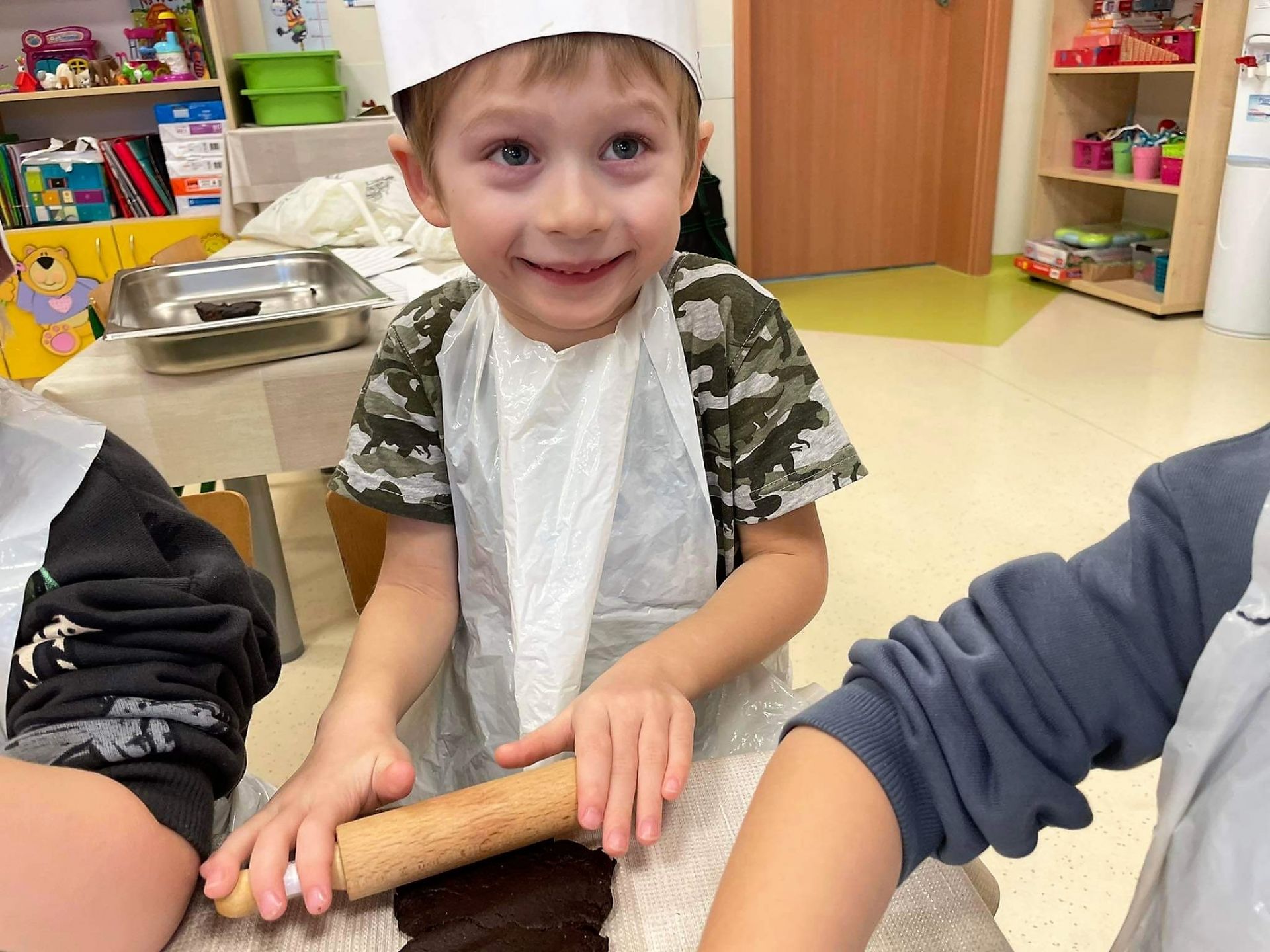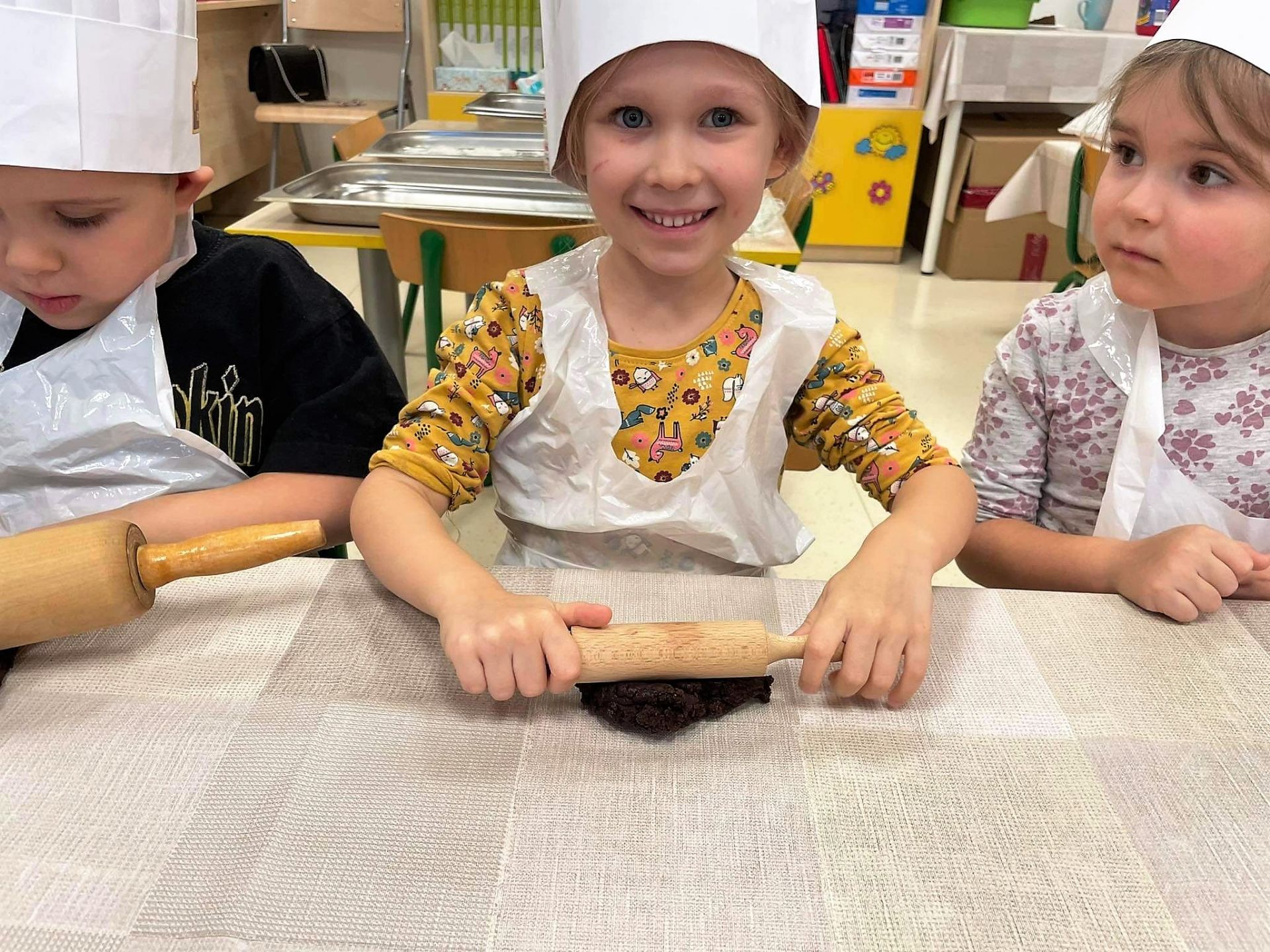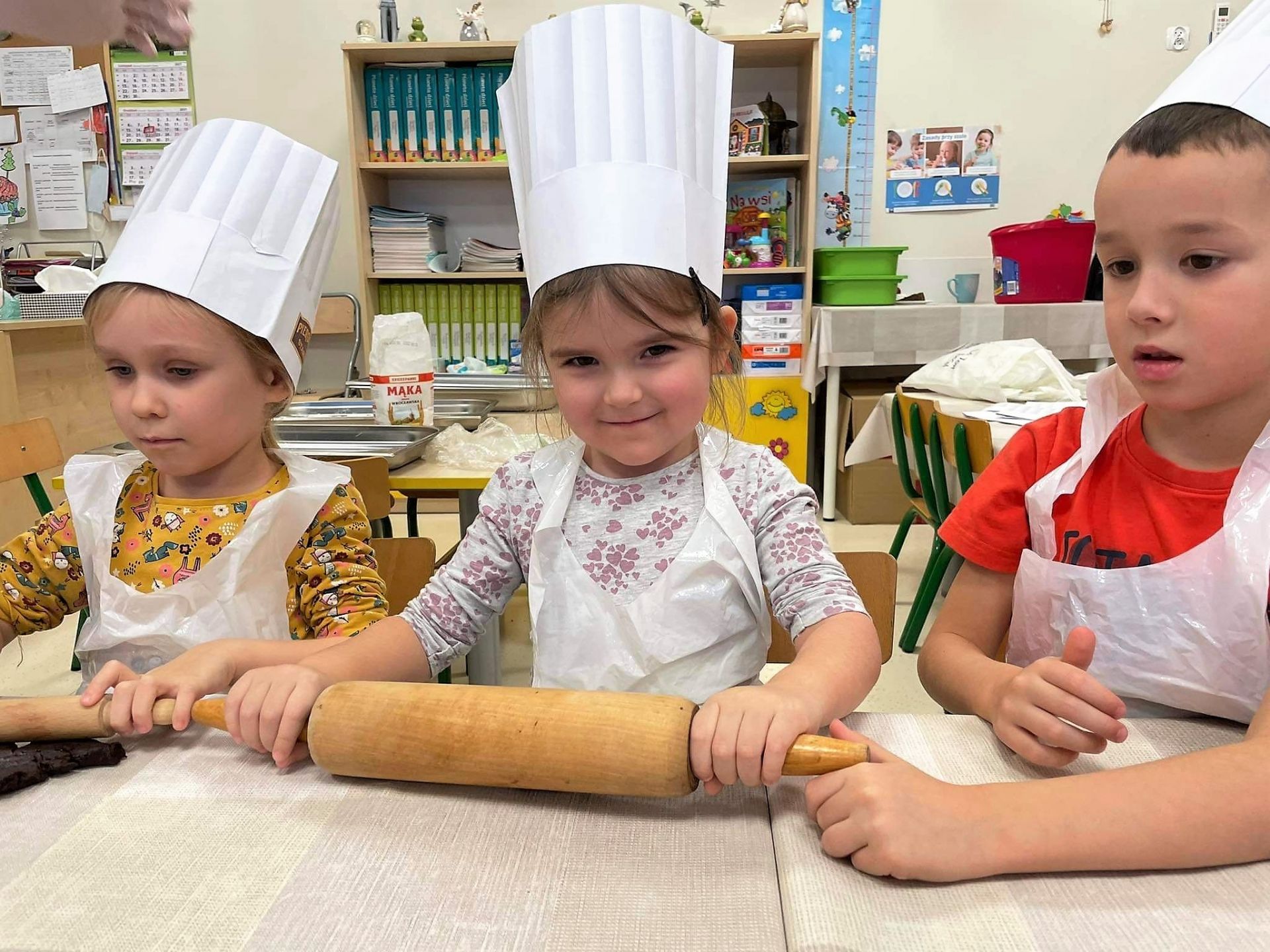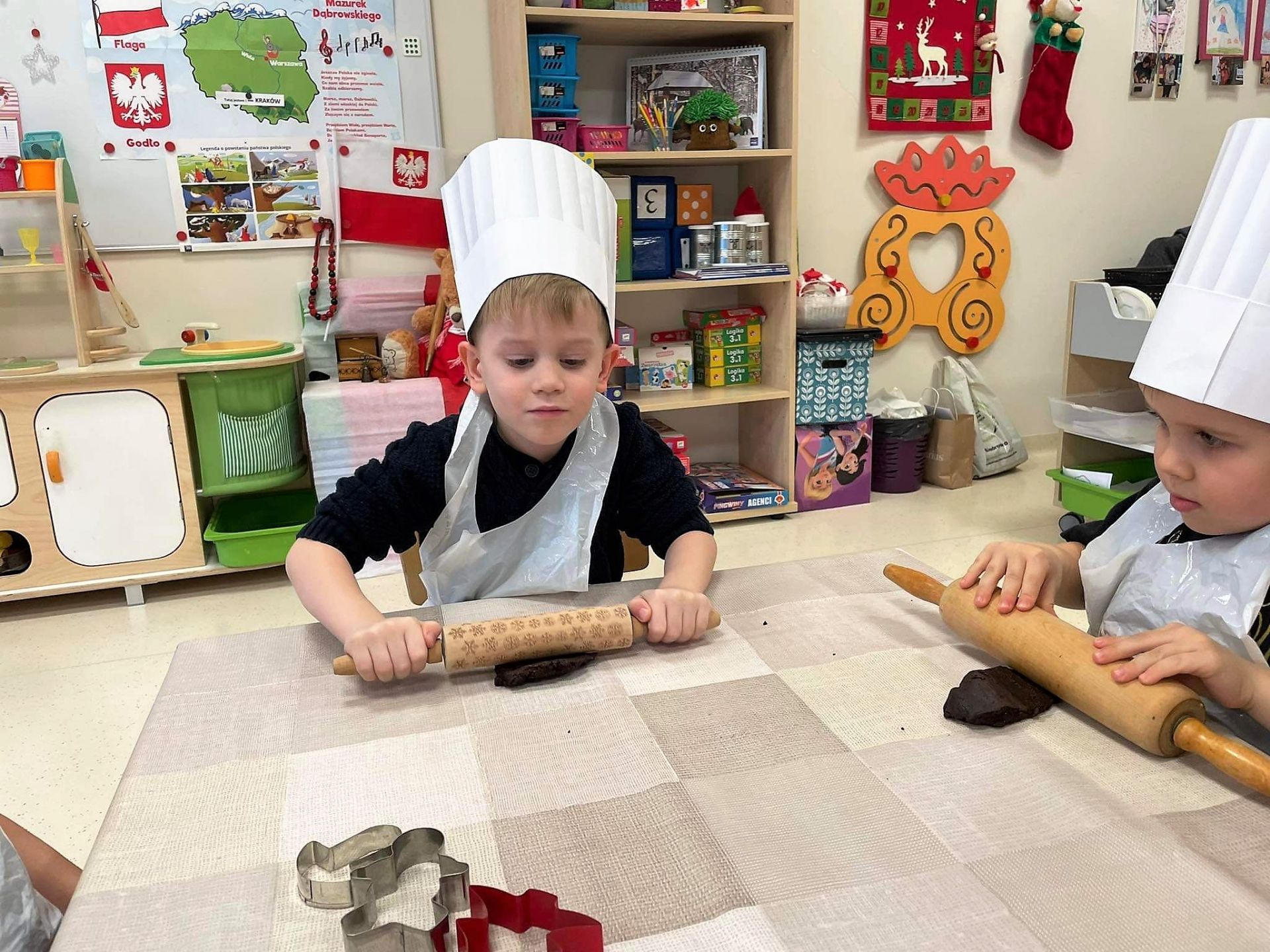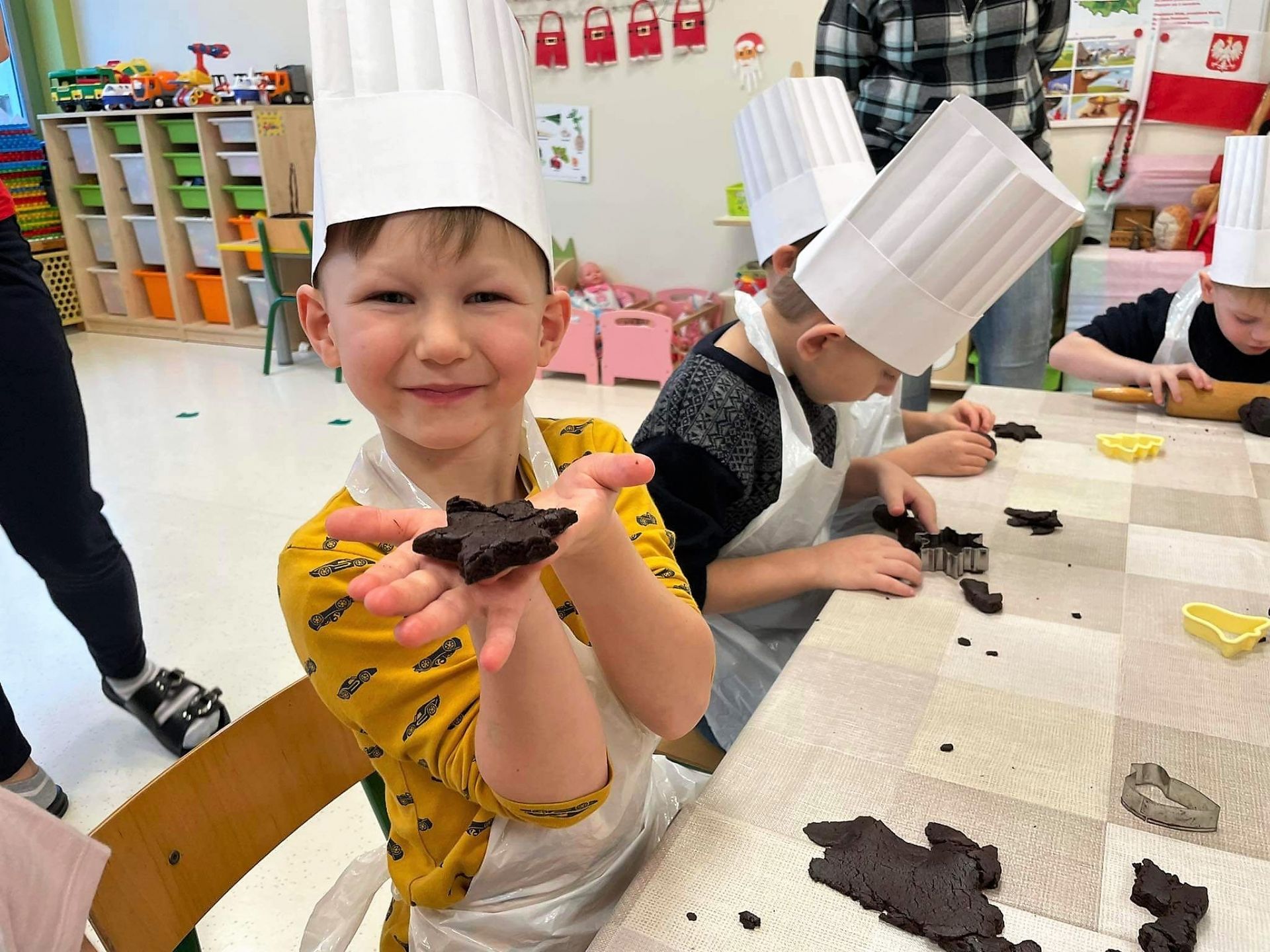 Dzień 15 grudnia 2021 r. był dla nas szczególnie pracowity. Wspólnie piekliśmy świąteczne pierniczki. Żabki z ogromnym zapałem i zaangażowaniem zabrały się do pracy – wałkowały ciasto, wykrawały ciasteczka. Efektem naszej pracy były blaszki pełne pierniczków, które zanieśliśmy do kuchni. Tu pod czujnym okiem Pani Agnieszki pierniki nabierały koloru, piekąc się w piekarniku.