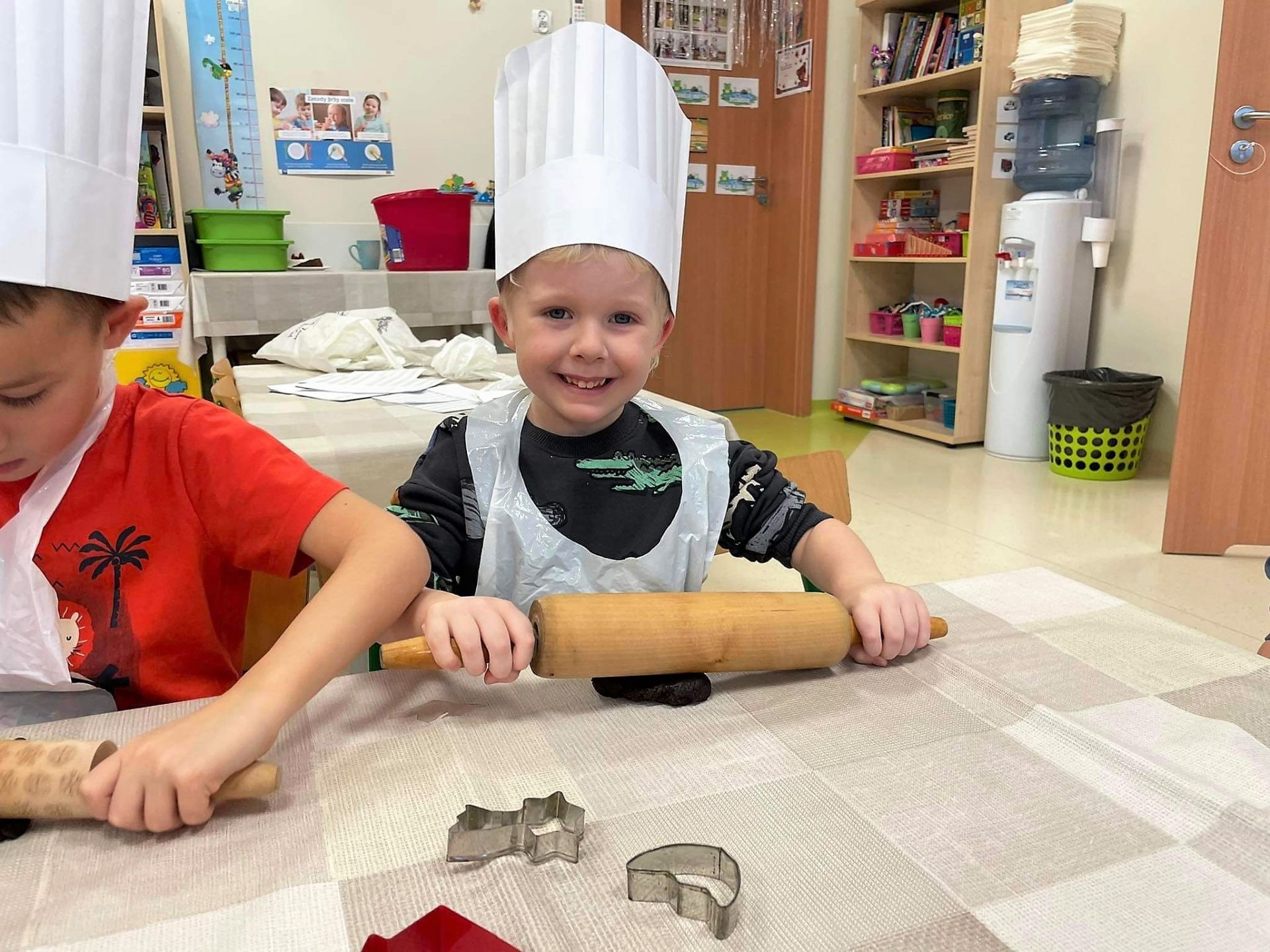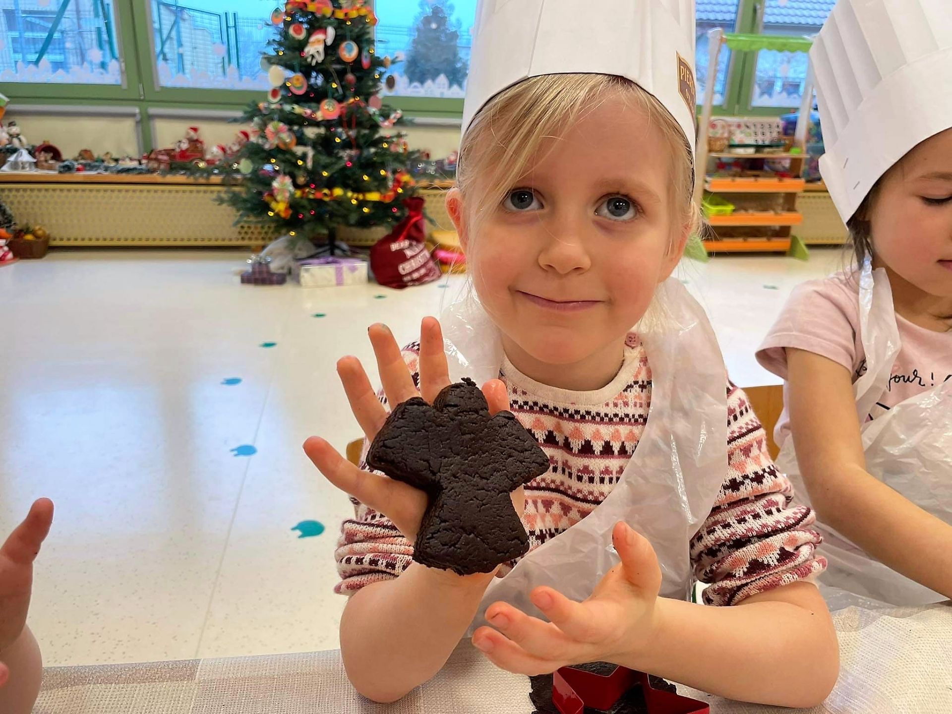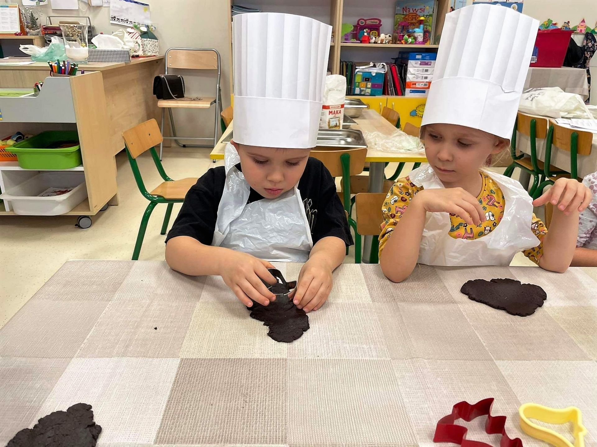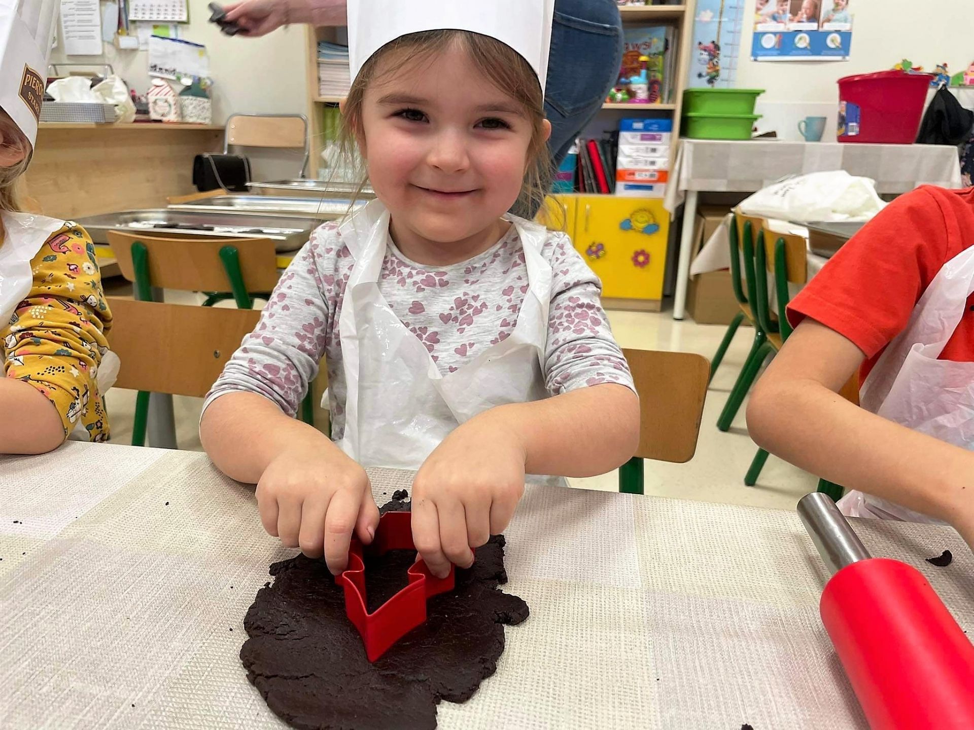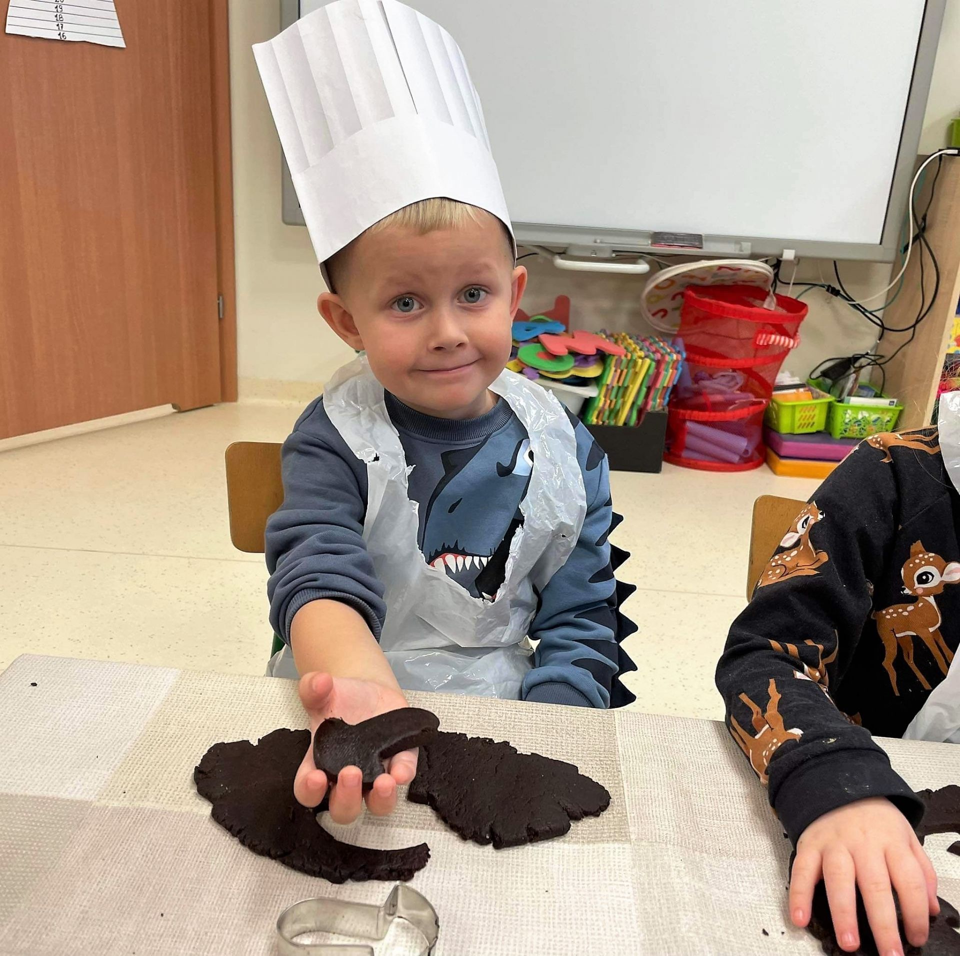 Dzień 15 grudnia 2021 r. był dla nas szczególnie pracowity. Wspólnie piekliśmy świąteczne pierniczki. Żabki z ogromnym zapałem i zaangażowaniem zabrały się do pracy – wałkowały ciasto, wykrawały ciasteczka. Efektem naszej pracy były blaszki pełne pierniczków, które zanieśliśmy do kuchni. Tu pod czujnym okiem Pani Agnieszki pierniki nabierały koloru, piekąc się w piekarniku.