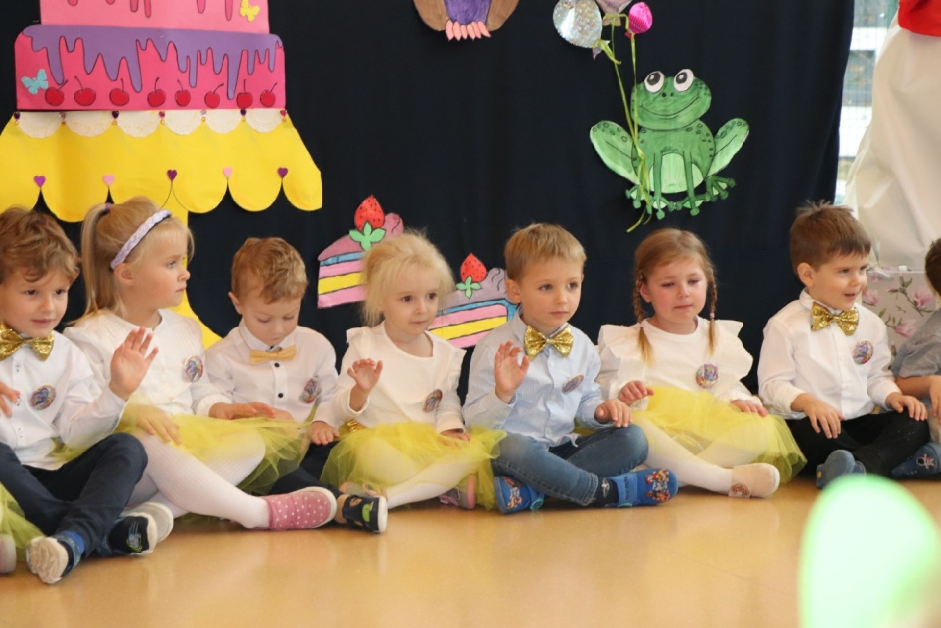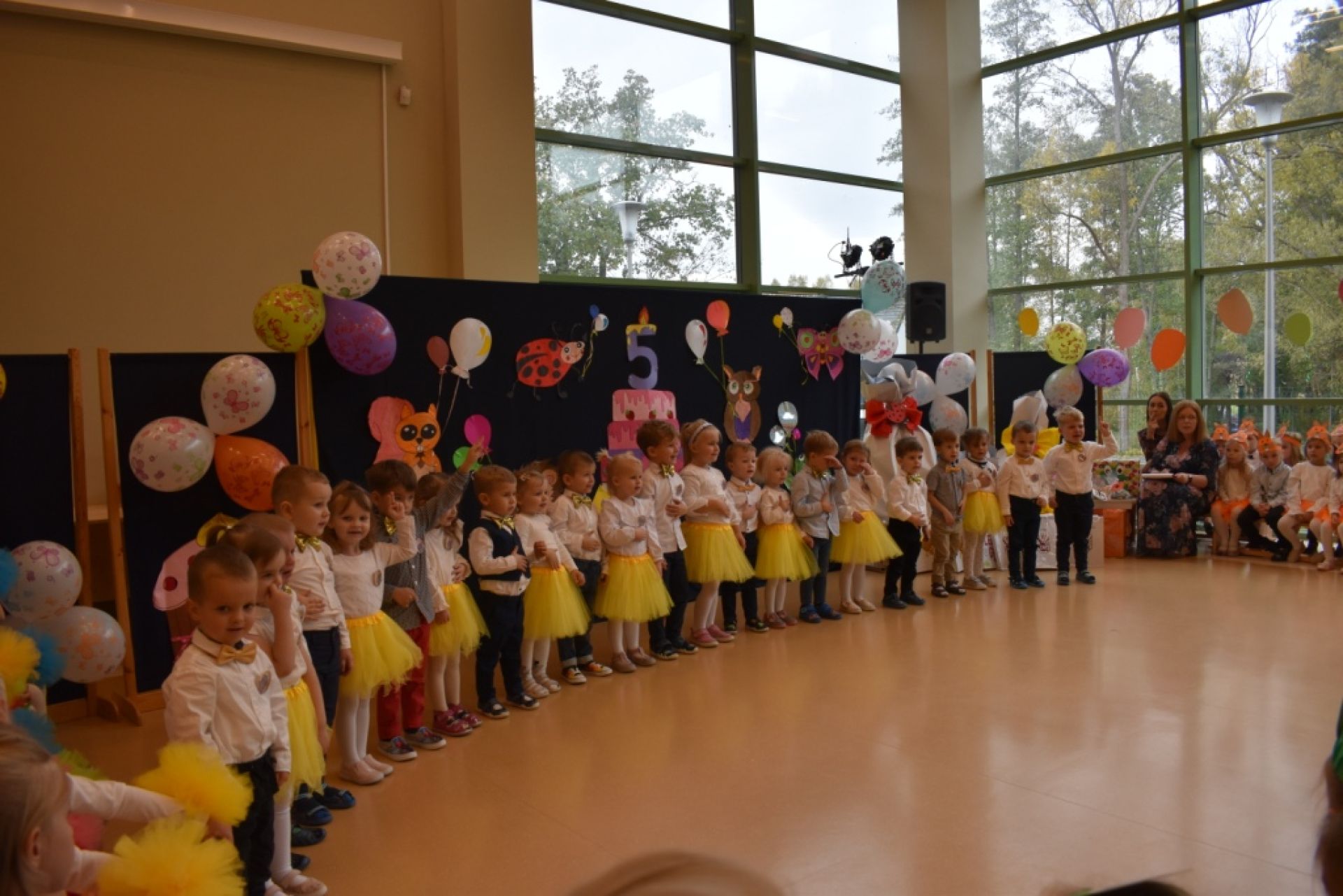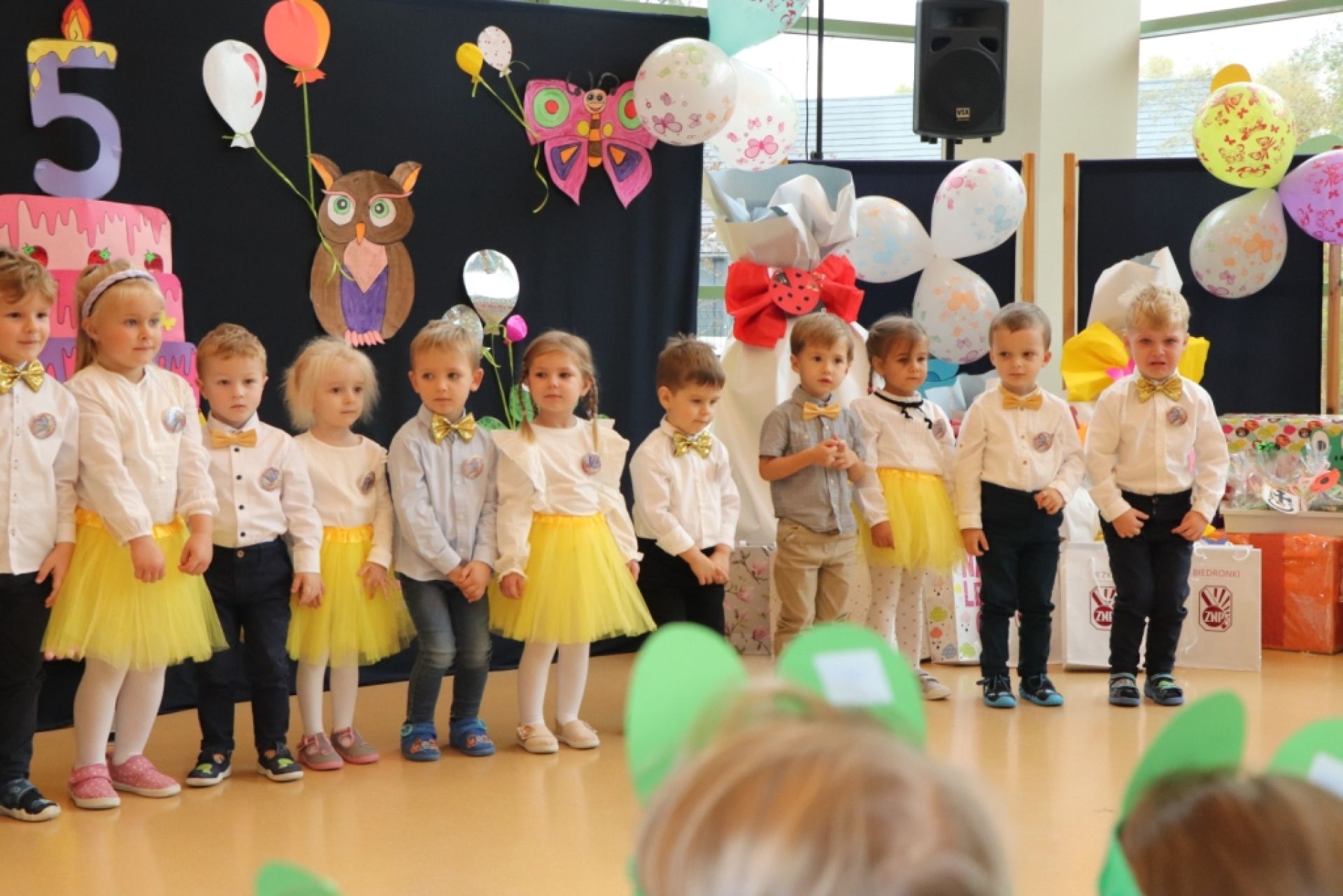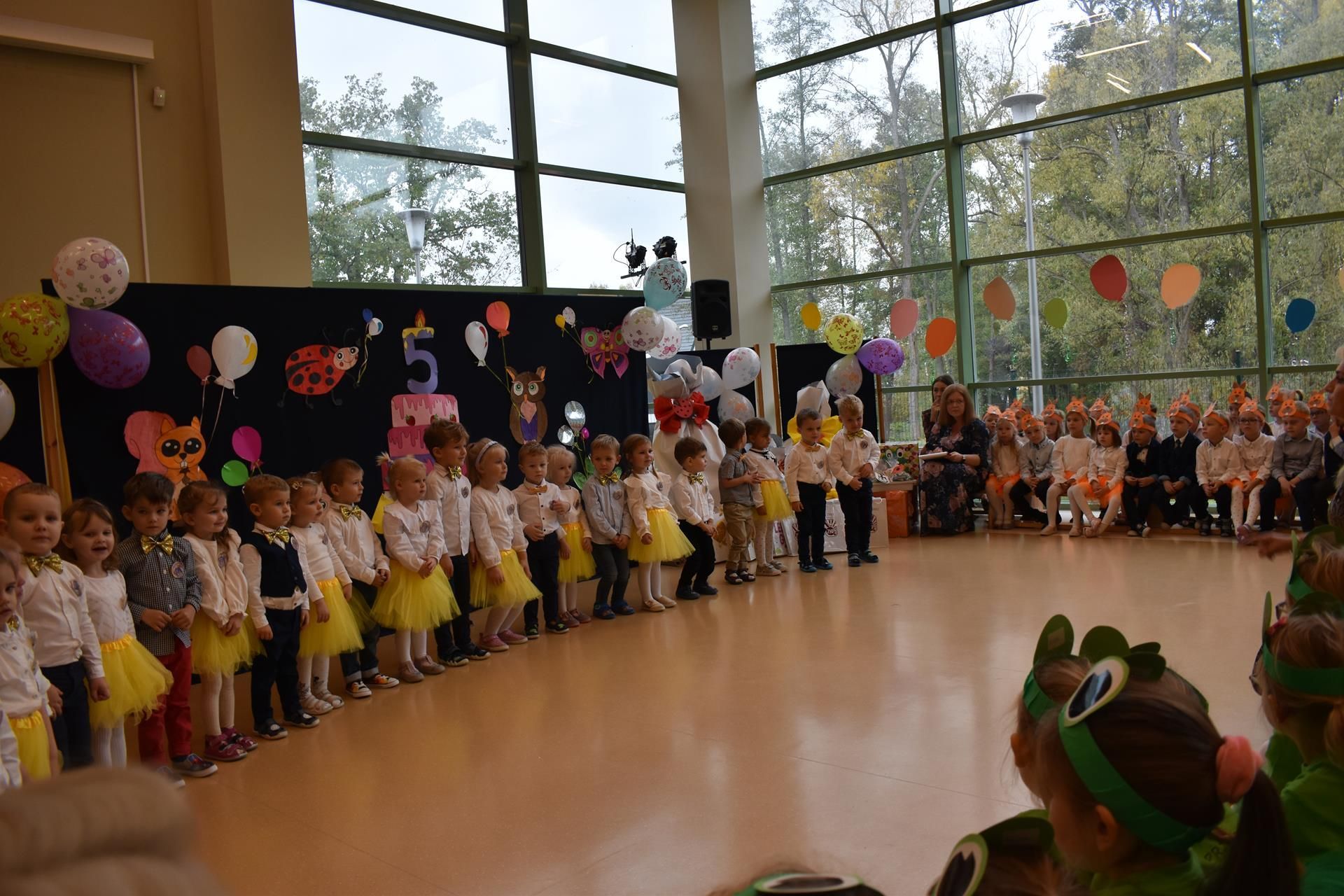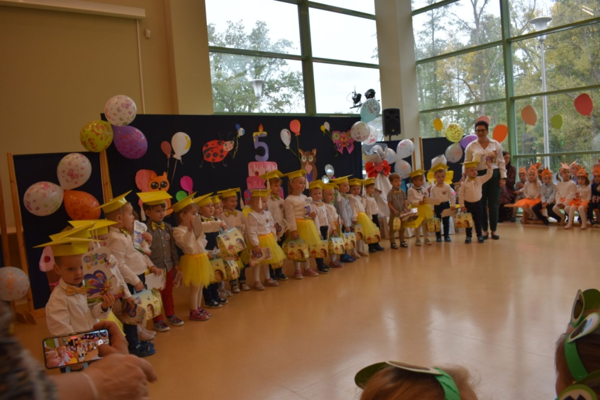 Dnia 21 października 2022 r. świętowaliśmy Piąte urodziny naszego przedszkola. Przybyli do nas wspaniali goście i rodzice najmłodszych przedszkolaków. Z tej okazji wszystkie grupy zaprezentowały swoje umiejętności wokalno-taneczne. Tego właśnie dnia odbyło się również pasowanie na przedszkolaka Biedronek oraz Motylków. Maluszki zaprezentowały swoje umiejętności – dając tym samym dowód, jak dużo już potrafią. Po części artystycznej, dzieci obiecały: zgodnie bawić się w przedszkolu, przychodzić każdego dnia z uśmiechem, słuchać pani i pomagać kolegom, być dzielnym przedszkolakiem. Następnie pani dyrektor Barbara Mrugalska dokonała uroczystego pasowania każdego dziecka na przedszkolaka. Na pamiątkę tego ważnego wydarzenia każdy przedszkolak otrzymał dyplom pasowania, medal z symbolem Zucha Przedszkolaka oraz mały słodki upominek. Był również ogromny tort dla wszystkich gości i dzieci oraz prezenty dla każdej z grup. Wszystkim gościom towarzyszył na twarzy uśmiech, chociaż w niejednym oku pojawiły się łzy wzruszenia.