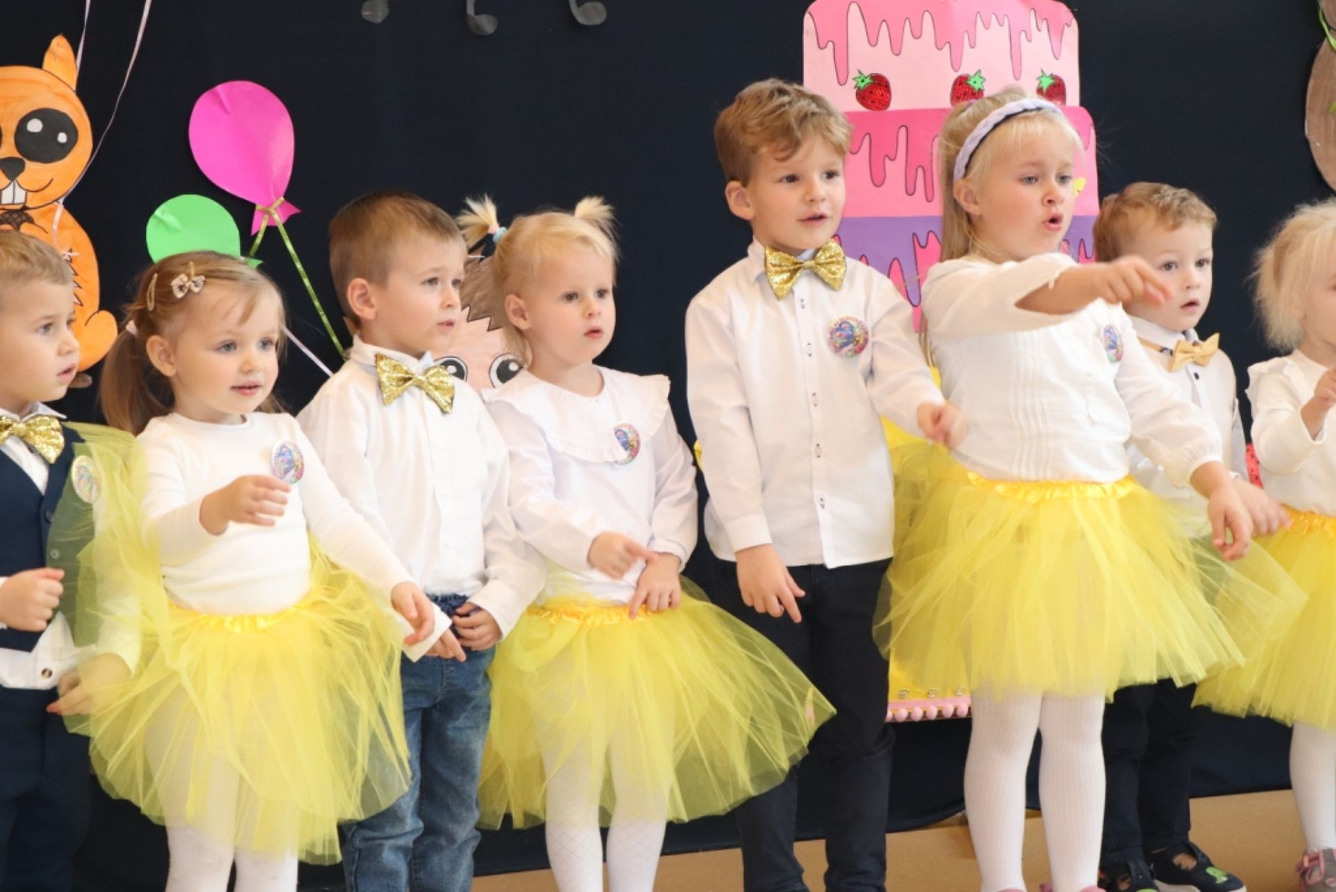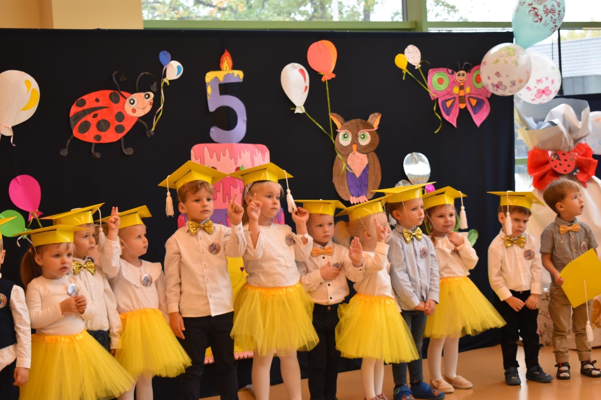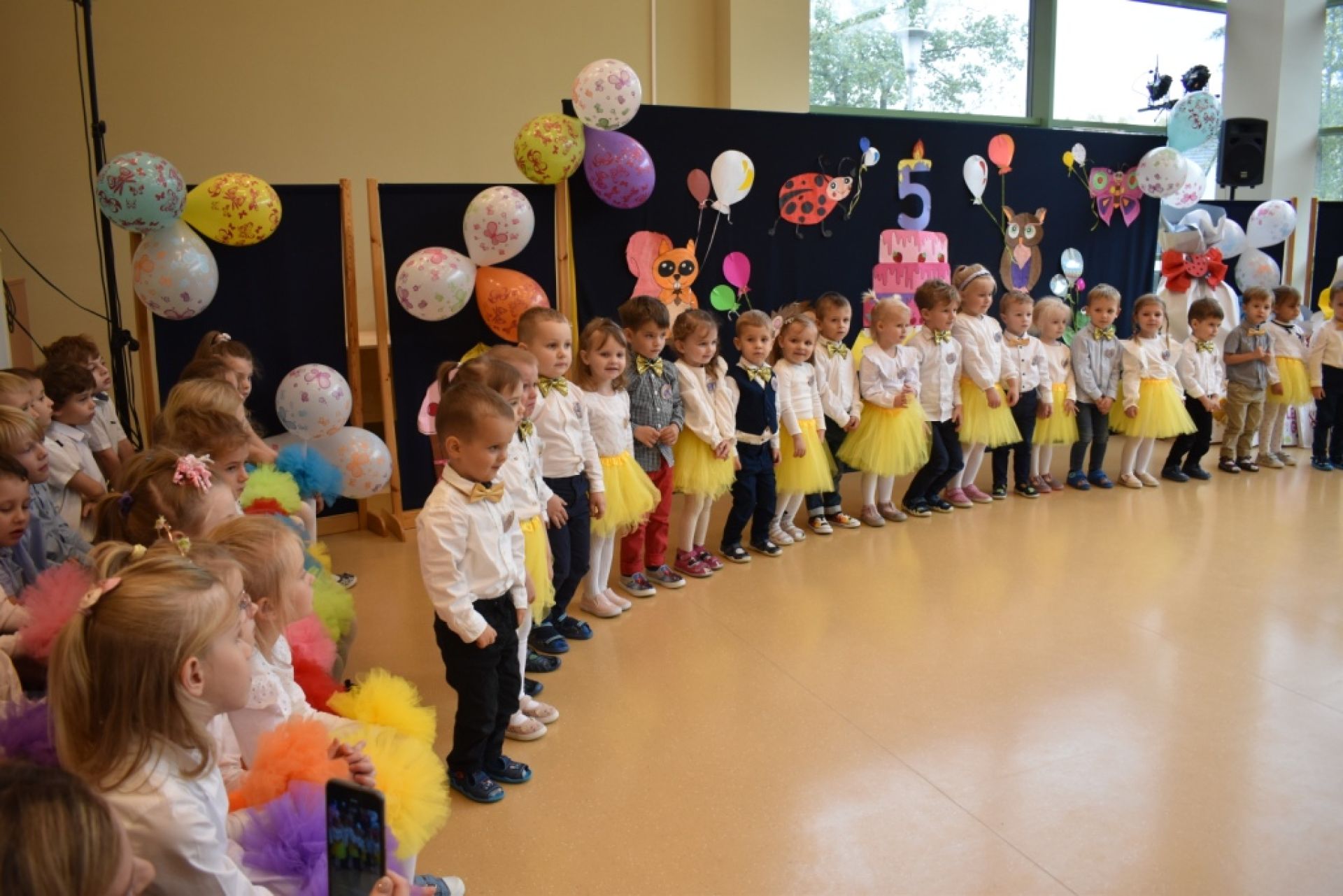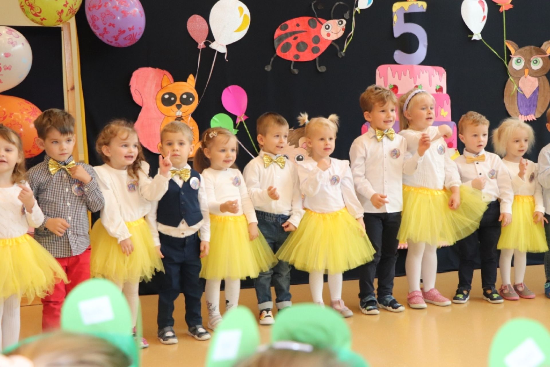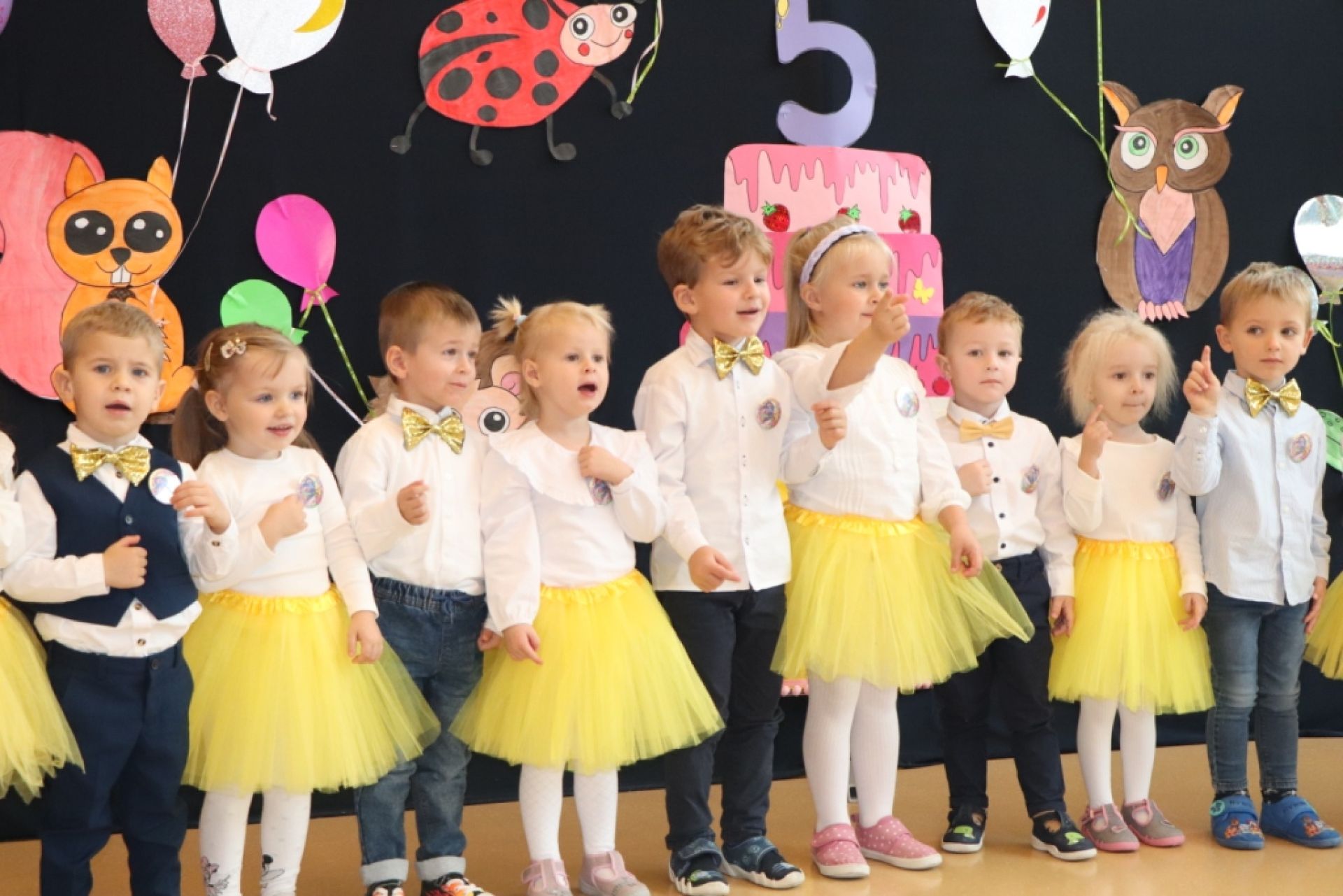 Dnia 21 października 2022 r. świętowaliśmy Piąte urodziny naszego przedszkola. Przybyli do nas wspaniali goście i rodzice najmłodszych przedszkolaków. Z tej okazji wszystkie grupy zaprezentowały swoje umiejętności wokalno-taneczne. Tego właśnie dnia odbyło się również pasowanie na przedszkolaka Biedronek oraz Motylków. Maluszki zaprezentowały swoje umiejętności – dając tym samym dowód, jak dużo już potrafią. Po części artystycznej, dzieci obiecały: zgodnie bawić się w przedszkolu, przychodzić każdego dnia z uśmiechem, słuchać pani i pomagać kolegom, być dzielnym przedszkolakiem. Następnie pani dyrektor Barbara Mrugalska dokonała uroczystego pasowania każdego dziecka na przedszkolaka. Na pamiątkę tego ważnego wydarzenia każdy przedszkolak otrzymał dyplom pasowania, medal z symbolem Zucha Przedszkolaka oraz mały słodki upominek. Był również ogromny tort dla wszystkich gości i dzieci oraz prezenty dla każdej z grup. Wszystkim gościom towarzyszył na twarzy uśmiech, chociaż w niejednym oku pojawiły się łzy wzruszenia.