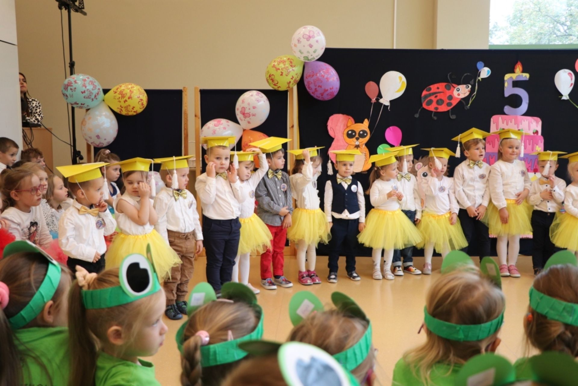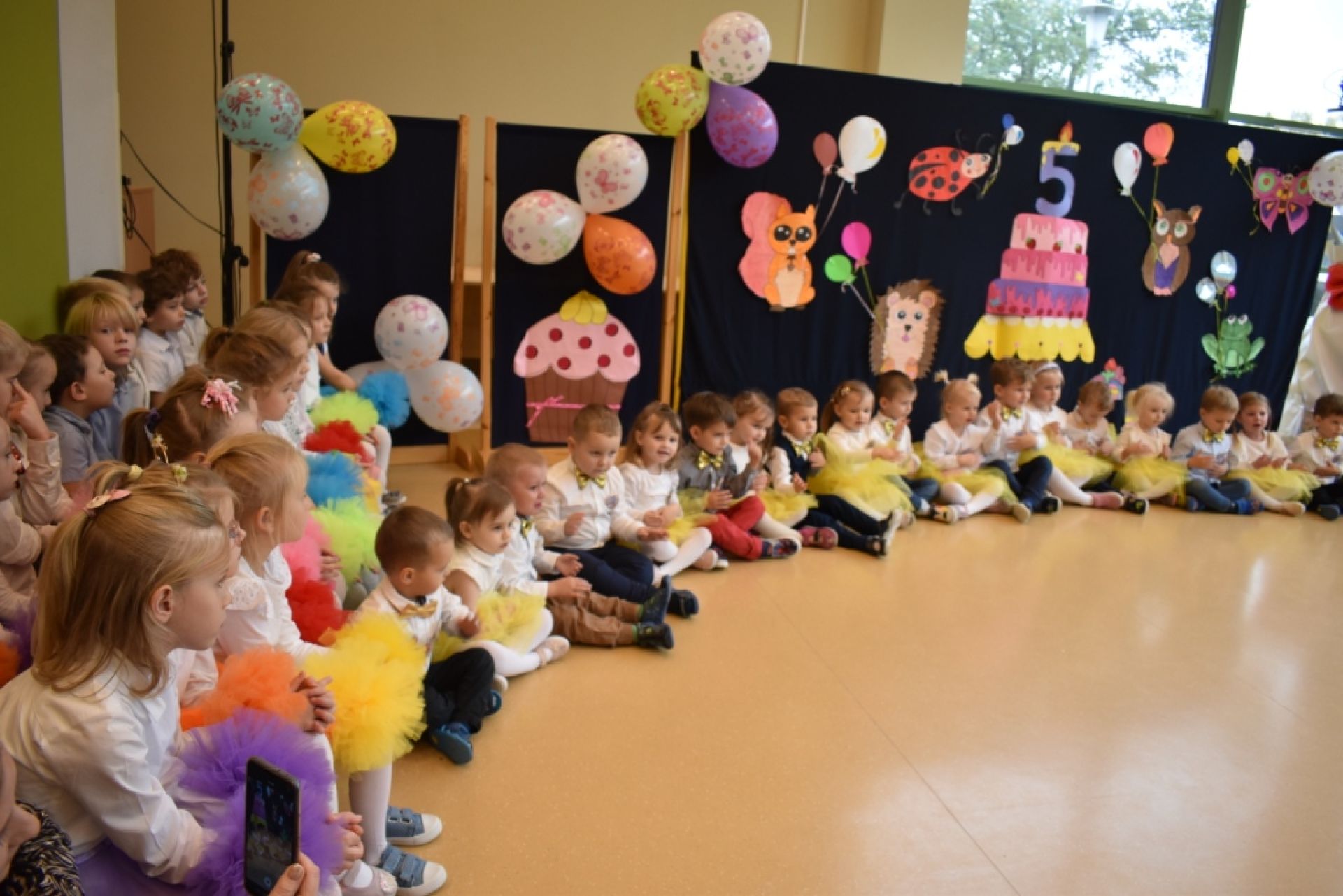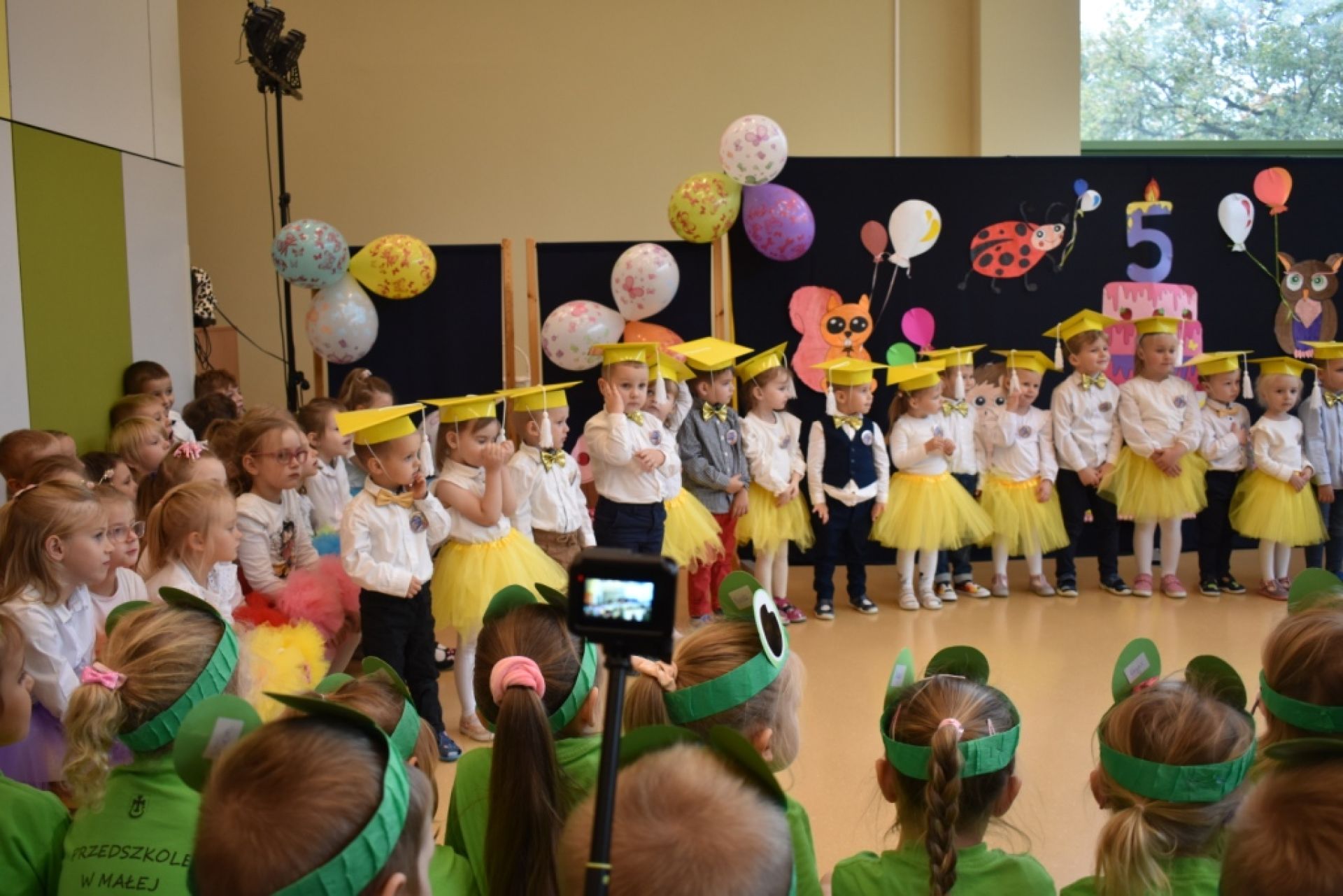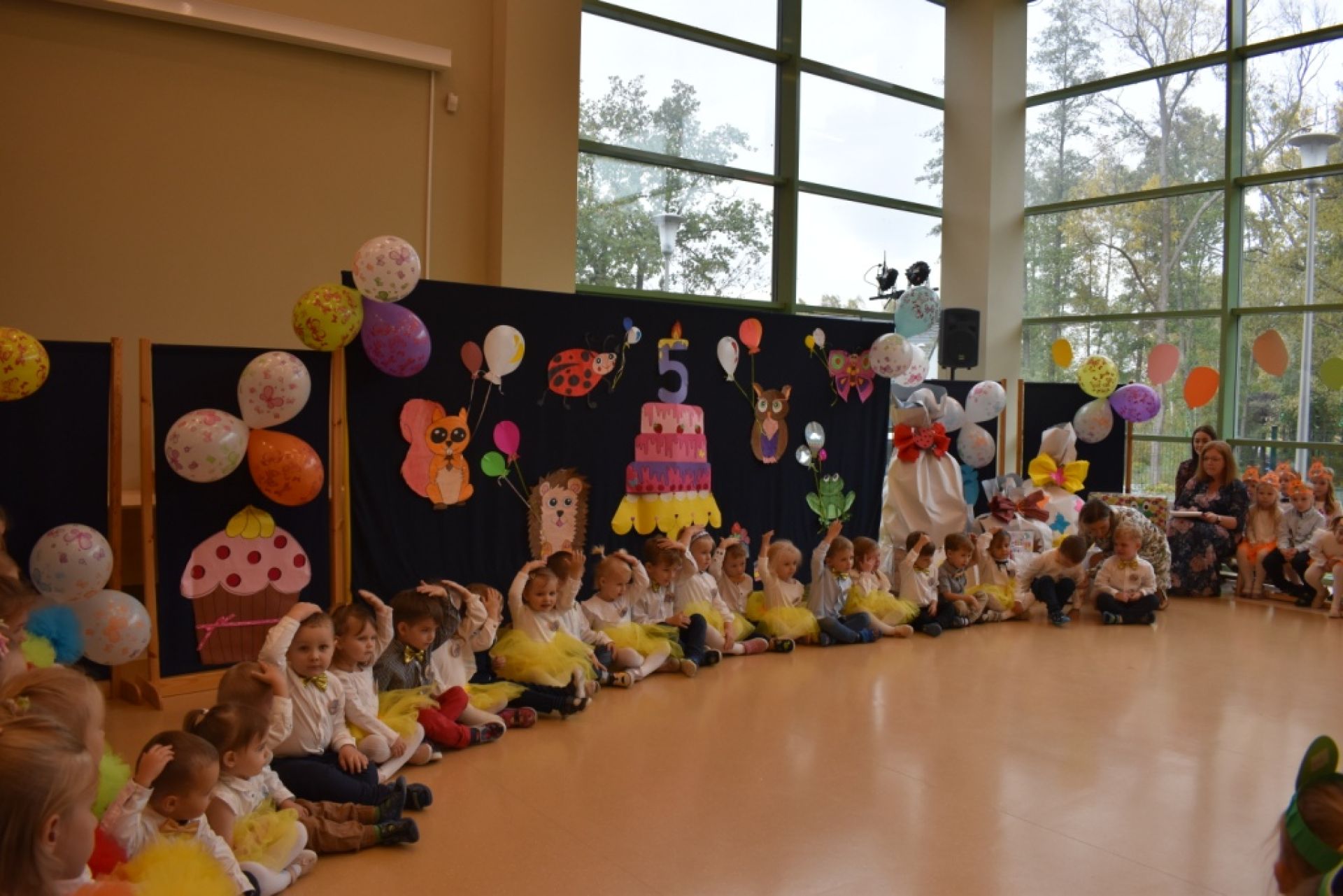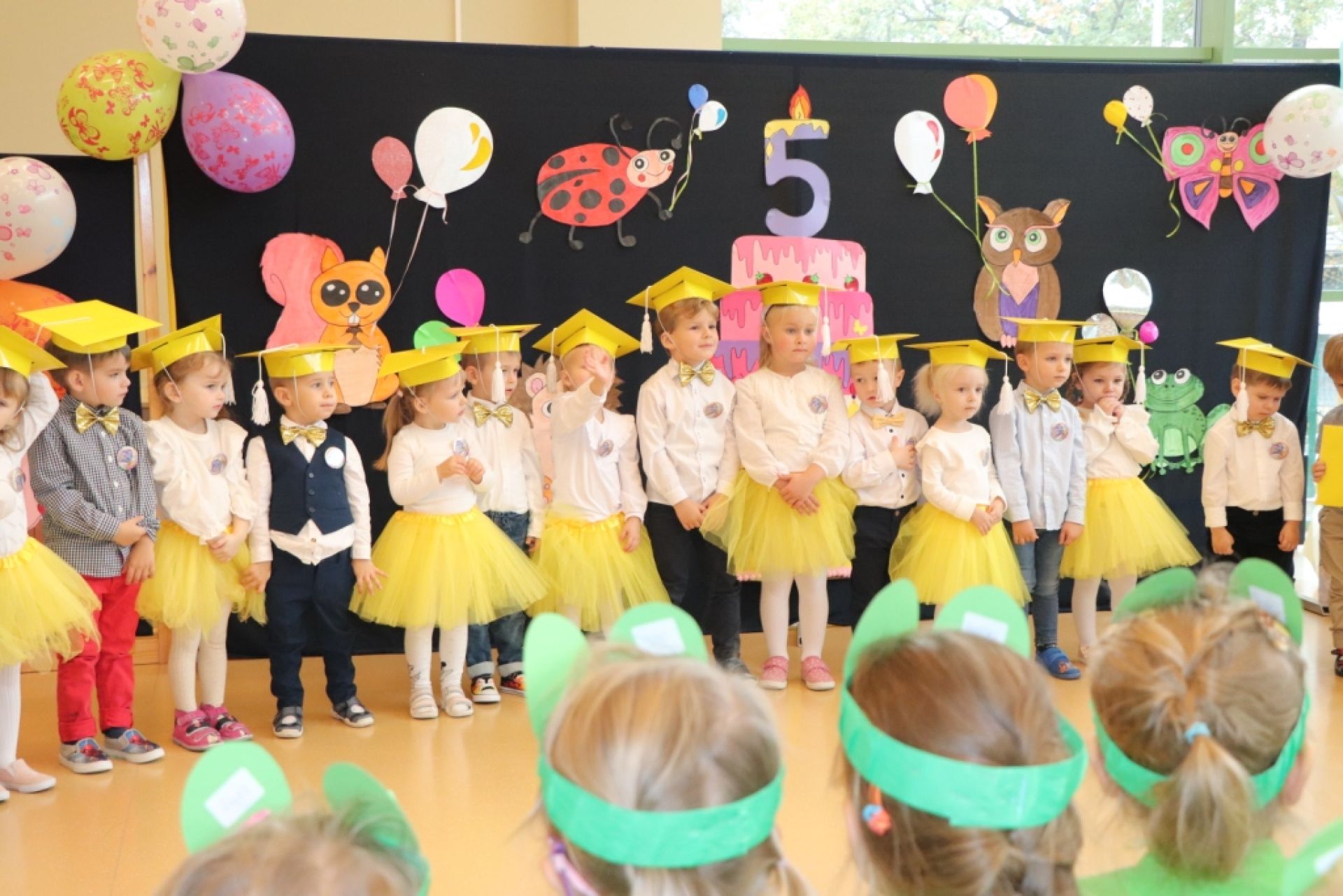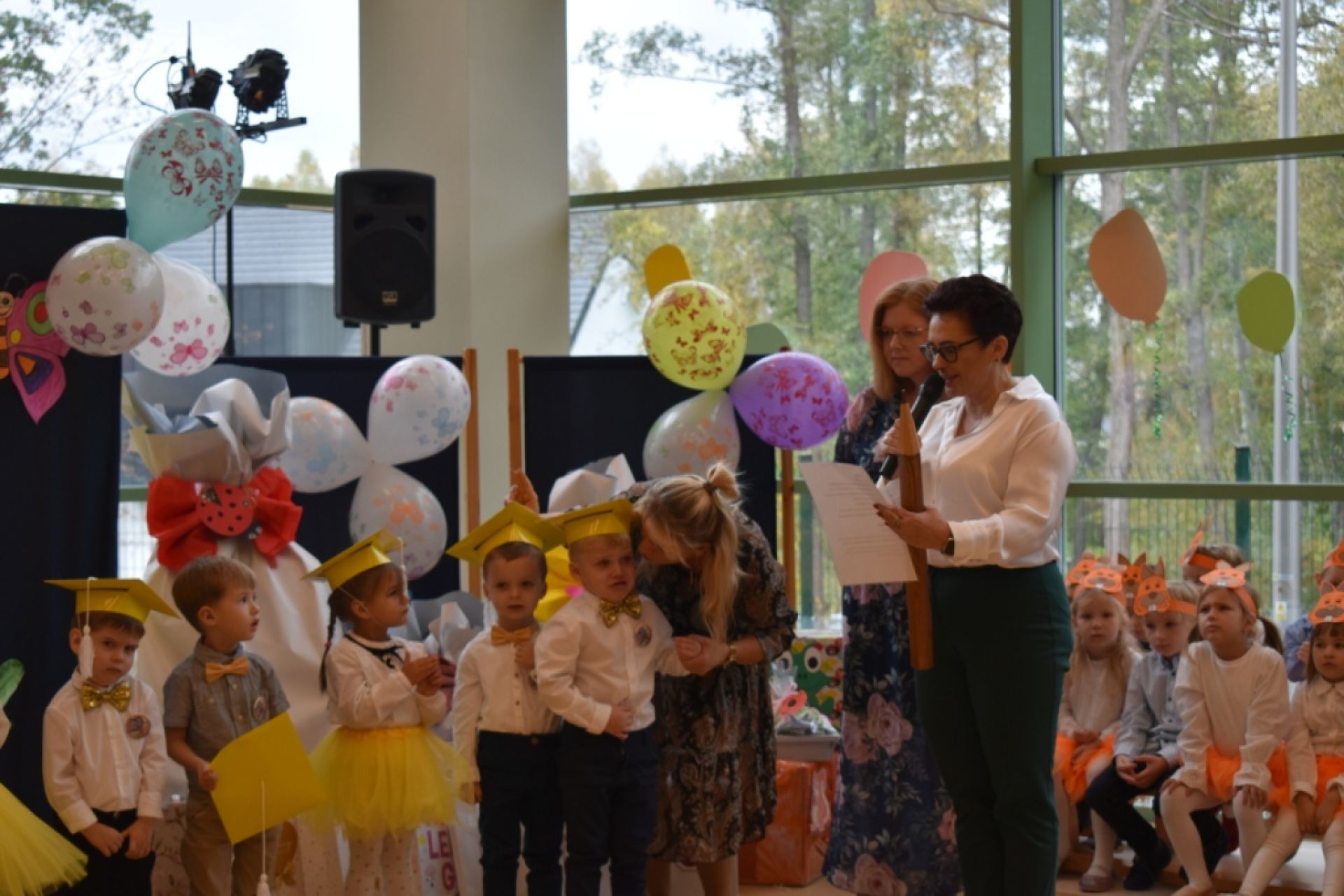 Dnia 21 października 2022 r. świętowaliśmy Piąte urodziny naszego przedszkola. Przybyli do nas wspaniali goście i rodzice najmłodszych przedszkolaków. Z tej okazji wszystkie grupy zaprezentowały swoje umiejętności wokalno-taneczne. Tego właśnie dnia odbyło się również pasowanie na przedszkolaka Biedronek oraz Motylków. Maluszki zaprezentowały swoje umiejętności – dając tym samym dowód, jak dużo już potrafią. Po części artystycznej, dzieci obiecały: zgodnie bawić się w przedszkolu, przychodzić każdego dnia z uśmiechem, słuchać pani i pomagać kolegom, być dzielnym przedszkolakiem. Następnie pani dyrektor Barbara Mrugalska dokonała uroczystego pasowania każdego dziecka na przedszkolaka. Na pamiątkę tego ważnego wydarzenia każdy przedszkolak otrzymał dyplom pasowania, medal z symbolem Zucha Przedszkolaka oraz mały słodki upominek. Był również ogromny tort dla wszystkich gości i dzieci oraz prezenty dla każdej z grup. Wszystkim gościom towarzyszył na twarzy uśmiech, chociaż w niejednym oku pojawiły się łzy wzruszenia.